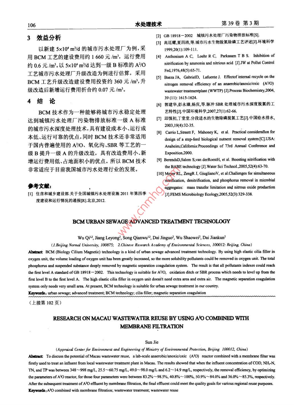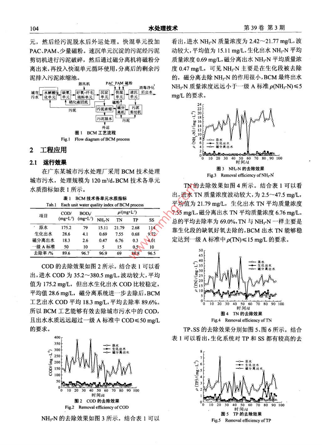 第39卷第3期水處理技術VoL39 No.32013年3月TECHNOLOGY OF WATER TREATMENTMar.2013103BCM城市污水深度處理技術吳琪…2,江樂勇’,宋乾武12,代晉國2,武少偉2,戴建坤2(1北京師范大學,100875;2中國環(huán)境科學研究院,100012:北京)嬃:BCM( Biology cilium magnetic)技術是一種城市污水深度處理技術,該技術通過在好氧單元增加高彈性纖毛填料大幅提高了妤氧單元的容積負荷,從而提高去除溶解性污染物的能力。通過磁分禹混凝系統(tǒng),達到深度去除總磷和懸浮物的效果,從而保證所有污染物指標均能穩(wěn)定達到城鎮(zhèn)污水處理廠污染物排放標準GBI8918-2002中的一級A標準。該技術非常適用于A3O、氧化溝、SBR等工藝的一級B提升一級A的升級改造,其好氧池內(nèi)的高彈性纖毛填料無需新增占地面積,無需增加曝氣量,磁分離混凝系統(tǒng)占地面積很小.BCM技術非常適應于目前我國城市污水處理行業(yè)的發(fā)展關詞:城市污水;深度處理;BCM技術;纖毛填料;磁分離混凝中圖分類號:X703.1;X7993文獻標識碼:A文章蜻號:10007702013)03-0103004截至2011年底,全國設市城市、縣累計建成城等操作復雜;纖維轉盤濾布濾池需要承擔一級B處鎮(zhèn)污水處理廠3135座,污水處理能力達到136×10理到一級A的全部污染負荷,由于負荷高,濾布很m/d,比2010年底增加處理能力約1.1×107m列d。全容易滋生生物膜,進而造成濾布堵塞,化學反沖洗難國正在建設的城鎮(zhèn)污水處理項目達1360個,總設以長期、穩(wěn)定起到預期效果;混凝過濾容易堵塞,對計能力約29×10m}。這些污水廠的處理標準大溶解性有機物去除效果差。(3)MBR工藝工程投資部分都按城鎮(zhèn)污水處理廠污染物排放標準(GB大,運行成本高,膜清洗過程復雜,脫氮效果不理想18918-2002)四中的一級B標準進行設計、施工和1BCM工藝原理及流程運行。但是,隨著我國水環(huán)境污染和水資源短缺問題的日益嚴重,北京、上海、深圳等城市都陸續(xù)開始執(zhí)針對現(xiàn)有技術中存在的不足,BCM( Biology行一級A標準或類似一級A的地方標準,要求新建 ilium magnetic)技術通過在好氧池內(nèi)安裝高彈性城市污水廠要達到一級A標準,原有城市污水廠也纖毛填料大幅提高好氧池的容積負荷,從而提高了要通過改造逐步達到一級A標準。一級A標準開始生化系統(tǒng)對溶解性污染物的去除能力。磁分離混凝在越來越多的地方逐漸取代一級B標準。系統(tǒng)通過在常規(guī)混凝沉淀中增加了磁粉,并使混凝我國現(xiàn)有技術中,能夠穩(wěn)定達到一級A標準的產(chǎn)生的絮體與磁粉有效結合,從而大大加快了絮體工藝主要有:(1)低負荷的A30氧化溝和SBR工的沉降速度,達到深度去除總磷和懸浮物的效果。藝包括低負荷沉淀單元。(2)在生化處理之后增加BCM技術是中國環(huán)境科學研究院自主開發(fā)的一套混凝過濾單元,如曝氣生物濾池、纖維轉盤濾布濾完整的城市污水處理工藝池混凝過濾等。(3)膜生物反應器(MBR)工藝BCM工藝的流程如圖1所示圖中經(jīng)格柵和沉但是,上述工藝存在以下問題:(1)低負荷的A3O、砂池處理后的城市污水,依次經(jīng)過水解酸化單元、缺氧化溝和SBR工藝,造成池容增大,能耗增高,工程氧單元、好氧+纖毛填料單元沉淀單元快混單元、投資加大;運行成本提高;低負荷的沉淀單元由于采速沉單元,然后消毒凈化后出水。好氧+纖毛填料單用自然沉降,仍不能保證SS質(zhì)量濃度穩(wěn)定小于10元硝化液回流至缺氧單元入口。沉淀單元污泥回流mgL。(2)曝氣生物濾池建設成本高氣、水反沖洗至水解酸化單元入口,多余的污泥排至污泥濃縮單收稿日期:20120921基金項目:國家“十一五”重大科技專項課題(20082X07211-006-02)作者簡介:吳琪(1980-),男博士,研究方向為水污染控制技術;聯(lián)系電話:186101122 E-mail: gerry wuqi@163om水處理技術第39卷第3期元,然后經(jīng)污泥脫水后外運處理??旎靻卧都涌闯?進水NH-N質(zhì)量濃度為242~21.77mg/L,波PAC、PAM、少量磁粉。速沉單元沉淀的污泥經(jīng)污泥動較大,平均值為15.1mgL,生化出水NH-N平均剪切機進行污泥破碎,然后通過磁分離機將磁粉分質(zhì)量濃度069mg/L,磁分離出水NH-N平均質(zhì)量濃離出來再投入快混單元循環(huán)使用,分離后的剩余污度047mg,可見NHxN主要是在生化段被去除泥排入污泥濃縮池。的,磁分離去除NHx-N的作用很小,BCM最終出水鼓風機PAM磁粉城市水解酸獻氧好氧毛沉??旎焖俪罫后出水消毒凈化NH-N質(zhì)量濃度遠遠小于一級A標準p(NHN)≤mgL的要求「硝化液回流離機剪切機污泥水泥AMMAA圖1BCM工藝流程ig. 1 Flow diagram of BCM processC原水2工程應用so a.drroeoneod△Ame607080.90I0021運行效果在廣東某城市污水處理廠采用BCM技術處理圖3NH-N的去除效果Fig3 Removal efficiency of NH-N城市污水,處理規(guī)模為120m/d,BCM技術各單元水質(zhì)指標如表1所示。TN的去除效果如圖4所示。結合表1可以看表lBCM技術各單元水質(zhì)指標出,進水TN質(zhì)量濃度波動較大,為25~475mgLTab. 1 Each unit water quality index of BCM process平均值為21.79mg/L,生化出水TN平均質(zhì)量濃度COD/ BODp/(mgL")項目(mgL)(mgL) NHrN TN TP755mg/L,磁分離出水TN平均質(zhì)量濃度676mgL總的平均去除率為690%,TN與NH1N一樣主要是原水175279151121.7926814靠生化段的缺氧好氧去除的BCM出水TN能夠穩(wěn)生化出水28.6410697550.68972磁分離出水18.3260.476760.3401定達到級A標準中p(TN≤15mgL的要求級A標準501010去除率%89696.796969888965COD的去除效果如圖
