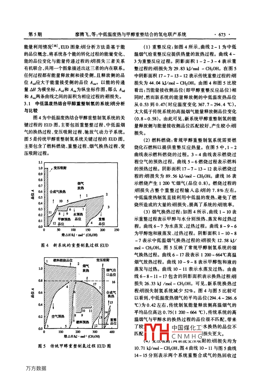第24卷第5期熱能動(dòng)力工程Vol 24. No. 52009年9月JOURNAL OF ENGINEERING FOR THERMAL ENERGY AND POWER文章編號(hào):l001-200200)0中低溫廢熱與甲醇重整結(jié)合的氫電聯(lián)產(chǎn)系統(tǒng)廖騰飛,洪慧2,劉柏謙1(1.北京科技大學(xué)機(jī)械工程學(xué)院,北京10083;2.中國(guó)科學(xué)院工程熱物理研究所,北京100190)摘要:提出了燒結(jié)機(jī)煙氣中低溫廢熱與甲醇蒸汽重整制氫焓值約占總廢熱焓值的1/3,有巨大的利用潛力。整合的新方法,模擬建立了中低溫廢熱結(jié)合甲醇重整制氡的針對(duì)傳統(tǒng)制氫能耗大和冶金工業(yè)200~500℃系統(tǒng)。基于能的品位概念,采用ED圖像煙分析方法,揭示中低溫廢熱利用難的問(wèn)題本研究提出燒結(jié)機(jī)煙氣低品位的中低溫廢熱特化為南品位化學(xué)能的能量轉(zhuǎn)換特性;中低溫廢熱和甲醇蒸汽重整反應(yīng)整合的新型制氫系統(tǒng)。利用EUD圖像娳分析法,闡明新系統(tǒng)相對(duì)傳88%,比傳統(tǒng)甲醇制氳系統(tǒng)約高12個(gè)首分點(diǎn),甲醇燃料節(jié)統(tǒng)甲醇制氫系統(tǒng)姐效率高的特性,揭示中低溫廢熱能率23.7%。另外,初步靜態(tài)經(jīng)濟(jì)性分析表明:新系統(tǒng)可使提升到高品位化學(xué)能的能量轉(zhuǎn)化特征,分析中低溫氫氣生產(chǎn)成本約為1.5元灬m,遠(yuǎn)低于電解水制威本(5廢熱品位提升的變化規(guī)律,初步評(píng)價(jià)新系統(tǒng)靜態(tài)制元/m3)。當(dāng)甲醇原料威本價(jià)格保持在一定的價(jià)格范圍內(nèi),其氫成本。制成本可以與傳純天然氣制氫成本1.2元/m3相竟?fàn)?。本研究為冶金工業(yè)同時(shí)解決中低溫廢熱利用和制氬能耗高1中低溫廢熱結(jié)合甲醇汽重整制氫系統(tǒng)的難題提供了一個(gè)新途徑。關(guān)鍵詞:中低溫廢熱;甲醇蒸汽重整制氫;EUD圖像1.1新系統(tǒng)的流程概述中低溫廢熱結(jié)合甲醇制氫新型系統(tǒng)流程主要由分析預(yù)熱重整過(guò)程變壓吸附分離過(guò)程和馳放氣動(dòng)力子中圖分類(lèi)號(hào):TK91文獻(xiàn)標(biāo)識(shí)碼:A系統(tǒng)構(gòu)成,如圖1所示。引言1.1.1預(yù)熱重整以寶鋼燒結(jié)廠一號(hào)燒結(jié)機(jī)為例,以367.7℃燒目前傳統(tǒng)制氫方法主要是電解水制氫和礦物結(jié)機(jī)尾部煙氣為熱源,首先給重整反應(yīng)器提供需要燃料制氫山,電解水制氫不僅能耗大,而且成本高,的反應(yīng)熱,然后出口煙氣給水蒸氣過(guò)熱器蒸發(fā)器中標(biāo)況下每立方米氫氣的能耗高達(dá)55kWh電能制供熱,最后煙氣給甲醇蒸汽過(guò)熱器、甲醇蒸汽發(fā)生器氫成本高達(dá)55元。由于礦物燃料制氫需要消耗石供熱,出口煙氣進(jìn)入煙道油、天然氣和煤等化石燃料燃燒為制氫反應(yīng)提供需甲醇、無(wú)離子水(甲醇水摩爾比1:1.5)經(jīng)過(guò)預(yù)要的反應(yīng)熱因此化石燃料的直接燃燒不可避免地?zé)?、蒸發(fā)過(guò)熱后進(jìn)入重整器反應(yīng)生成合成氣,合成造成巨大化學(xué)能損失,同時(shí)又帶來(lái)大量的CO2等溫氣余熱回收后進(jìn)入變壓吸附器。室氣體排放,產(chǎn)生嚴(yán)重環(huán)境污染(2)。對(duì)于目前傳統(tǒng)1.,1.2變壓吸附過(guò)程制氫存在的能耗和環(huán)境的問(wèn)題,國(guó)內(nèi)外都提出了很合成氣先通過(guò)冷卻分離出未反應(yīng)的甲醇、無(wú)離多新型的制氫方法3-1l子水然后在40℃,2MPa的條件下進(jìn)入變壓吸附目前冶金行業(yè)廢熱豐富然而500℃以上的高器,分離出氫氣溫廢氣余熱的熱利用效率較高,而400~500℃中低1.1.3馳放氣動(dòng)力子系統(tǒng)溫廢氣余熱的回收利用率較低2。對(duì)于300℃以變壓吸附分離出的馳放氣作為氣體燃料燃?xì)廨喯碌牡蜏責(zé)煔庥酂岣亲鳛閺U氣廢熱被浪費(fèi)。以燒機(jī)燃料如圖1所示:馳放氣經(jīng)過(guò)壓縮機(jī)壓縮后,與結(jié)工序?yàn)槔?燒結(jié)工序中的余熱大約有50%熱量回?zé)峥諝饣旌线M(jìn)人燃燒室燃燒,進(jìn)人透平做功,出口廢熱形式被排入大氣。在冶金工業(yè)中像這樣200煙氣40℃的中低溫廢熱占總余熱的2/3以上,其熱中國(guó)煤化工CNMHG收稿日期:2008-01-28;修訂日期:2008-12-0基金項(xiàng)目:國(guó)家自然科學(xué)基金委員會(huì)青年基金資助項(xiàng)目50500作者簡(jiǎn)介:溶騰飛(1985-),男湖北荊人,北京科技大學(xué)碩士研究生第5期廖騰飛,等:中低溫廢熱與甲醇重整結(jié)合的氫電聯(lián)產(chǎn)系統(tǒng)671·134℃鴝和水氣飽和甲醇蒸汽燒結(jié)機(jī)尾部煙氣21381741℃過(guò)熱水蒸氣|飽和178.2844℃合成氣回收甲醇541kmh25℃離子水水24529kmol/h675 mol/h40℃2x器「馳放氣11:10Pa氫氣1187kmoh進(jìn)人表鍋?zhàn)o(hù)產(chǎn)生汽入口溫度1130℃壓縮空氣〔燒)一□煙氣出口溫度蒸汽產(chǎn)品中低溫?zé)煔鈭D1中低溫廢熱的甲醇重整制氬流程無(wú)離子水儲(chǔ)罐變壓吸附劑高純氫根據(jù)吸附壓力與馳放氣壓力的關(guān)系B,設(shè)定氫氣的回收率為90%。燃?xì)廨啓C(jī)選取ABB公司生產(chǎn)的型號(hào)為 Tempest機(jī)型燃?xì)廨啓C(jī)采用回?zé)嵫h(huán)。衰1中低溫廢熱結(jié)合甲醇重整制氫主要單元模擬參數(shù)與結(jié)果變壓吸附主要流程項(xiàng)目數(shù)數(shù)據(jù)高速燃燒器預(yù)熱重整過(guò)程合成氣甲醇重整吸熱重整溫度/℃重整壓力/Pa甲醇轉(zhuǎn)化率圖2傳統(tǒng)甲醇制氫流程飽和水蒸發(fā)溫度