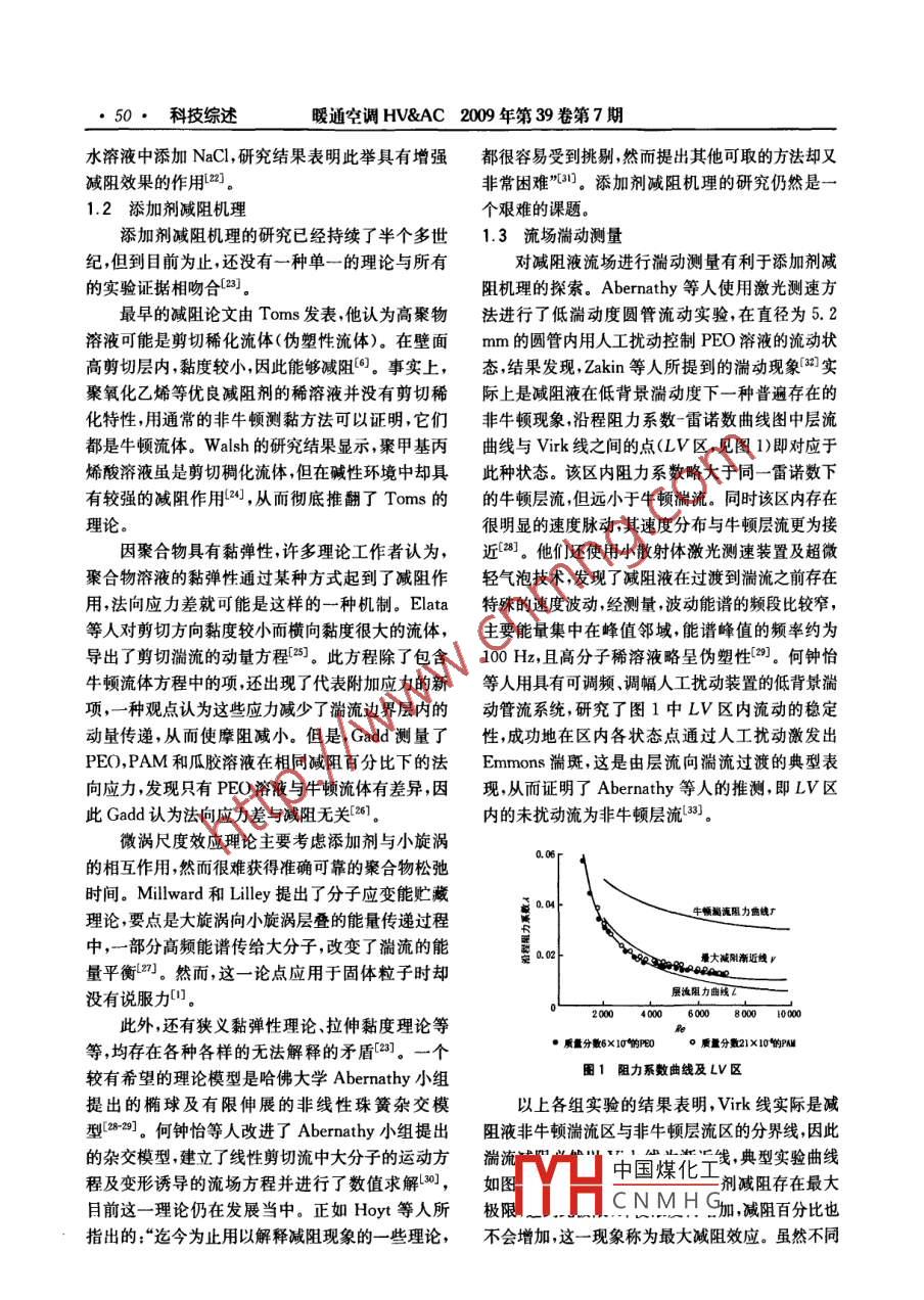 ●48●科技綜述暖通空調(diào)HV&AC 2009 年第39卷第7期添加劑減阻及其在供熱系統(tǒng)中的應(yīng)用哈爾濱工業(yè)大學(xué)朱蒙生* 鄒平華 蔡偉華^摘要簡要介紹了添加劑減阻的國內(nèi)外研究概況,詳細(xì)介紹了減阻劑的特性、減阻機(jī)理、流場湍動(dòng)測量,減阻效果對傳熱的影響及添加劑減阻在集中供熱系統(tǒng)中的應(yīng)用。關(guān)鍵詞減阻特性機(jī)理傳熱供熱系統(tǒng)Application of additive drag reduction to heating systemsBy Zhu Mengsheng*,Zou Pinghuo ond Col WerhuoAbstract Gives a brief presentation of the rescarch status at home and abroad of drag reduction byadditives and a detailed description of the characteristics, drag reduction mechanism, measurement of flowfield turbulent motion, influence of drag reduction cffcct on heat transfer and the application of dragreduction by additives to central heating systems.Keywords drag reduction, characteristic, mechanism, heat transfer, heating system★Harbin Institute of Technology, Harbin, China0引言應(yīng)用作簡要介紹。添加劑減阻是指在液體中加入少量的高分子1國內(nèi)外研究概況聚合物或表面活性劑以大幅度減小其湍流摩阻的在添加劑減阻研究領(lǐng)域,具有代表性的成果是方法。該方法具有減阻劑投放量少、減阻效率高等1948年第- -屆國際流變學(xué)會(huì)議上Toms發(fā)表的第優(yōu)點(diǎn),對于節(jié)能或提高水中物體的運(yùn)動(dòng)速度具有重一篇減阻論文,該文指出以少量的聚甲基丙烯酸甲大意義。在20世紀(jì)50年代及60年代初期,減阻酯(PMMA)溶于氯苯,沿程阻力可降低50%61。研究多局限于流變學(xué)及石油化工領(lǐng)域,60年代中此后,這種高分子減阻現(xiàn)象被稱為Toms效應(yīng)。期以后,添加劑減阻開始引起流體力學(xué)研究者的注Fabula等人發(fā)現(xiàn)質(zhì)量分?jǐn)?shù)約為5X10-6~10X意,研究工作更加廣泛地開展起來[”。目前減阻劑10-的PEO(聚氧化乙烯)水溶液與純水相比最大已應(yīng)用于水下武器發(fā)射、原油管道輸送、泄洪、消防減阻率可達(dá)80%[7。Oliver 等人利用超大分子量等領(lǐng)域,在原油管道輸送領(lǐng)域,近20多年來先后研聚丙烯酰胺E-10和MG-200 作減阻劑,在1X制出了聚氯乙烯、乙烯丙烯共聚物.聚甲基丙烯酸10- °質(zhì)量分?jǐn)?shù)下達(dá)到了80%的最大減阻率[8,充等一系列油溶性減阻劑[2]。1979 年美國某公司生分證明了減阻劑的減阻高效性。減阻率又可稱為產(chǎn)的CDR減阻劑開始應(yīng)用于橫貫阿拉斯加的原油減阻百分比,計(jì)算式為輸送管道中,取得了良好的節(jié)能效果[3]。80年代末至90年代中期在國外出現(xiàn)了將減阻劑應(yīng)用在區(qū)★朱蒙生,男,1963年9月生,博士研究生,博士,副教授域供熱系統(tǒng)中的實(shí)驗(yàn),取得了良好的節(jié)能和環(huán)保綜150090哈爾濱T業(yè)大學(xué)市政環(huán)境工程學(xué)院合效益"。近幾十年,我國城市集中供熱與空調(diào)系(0451) 82307642E- mail:zmszkg@sina. com統(tǒng)發(fā)展迅速,其輸配管網(wǎng)中水泵的能耗占總能耗的S 150001 哈爾濱工業(yè)大學(xué)能源科學(xué)與工程學(xué)院比例較大,若能在集中供熱與空調(diào)水系統(tǒng)中應(yīng)用減中國煤化工阻劑,節(jié)能環(huán)保效果將會(huì)十分顯著[]。本文擬對添收YHCNMHG加劑減阻的國內(nèi)外研究概況以及在供熱工程中的二次修回:2009-06-05暖通空調(diào)HV&AC 2009 年第39卷第7期科技綜述●49●e=f二f x 100%(1)械剪切作用下,其棒狀結(jié)構(gòu)即使會(huì)暫時(shí)斷裂,但是經(jīng)過泵之后(機(jī)械剪切消失),又可恢復(fù)為原來的棒式中E 為減阻百分比;f為加人減阻劑前流體的狀結(jié)構(gòu),仍具有較好的減阻效果[5-1]。范寧摩阻系數(shù);f'為加入減阻劑后同- -雷諾數(shù)下流減阻劑的減阻效果還受以下幾個(gè)因素的影響:體的范寧摩阻系數(shù)。1)減陰流體溶液的濃度。Virk認(rèn)為減阻劑1974年召開了第一次國際減阻會(huì)議,早期的的濃度影響管道內(nèi)流動(dòng)的彈性底層的厚度,濃度越主要研究成果由White 和Virk等人進(jìn)行了總大,彈性底層越厚,減阻效果越好0。最近對PAM結(jié)).9。國內(nèi)的研究起步于上個(gè)世紀(jì)70年代,大多和CTAC水溶液進(jìn)行的減阻實(shí)驗(yàn)研究表明,在相以實(shí)驗(yàn)研究為主,最早發(fā)表在公開刊物上的研究成同溫度和雷諾數(shù)下,減阻效果隨著溶液濃度的增加果見文獻(xiàn)[10]。國內(nèi)外有關(guān)添加劑減阻的研究主而變好;但是當(dāng)濃度增加到一定程度后,減阻效果要體現(xiàn)在減阻劑的特性、減阻機(jī)理、實(shí)驗(yàn)研究及工開始變差,這說明減阻流體存在一個(gè)最佳濃.程應(yīng)用等方面。度[13.18]。1.1 減阻劑特性2)減阻流體溶液的溫度。減阻劑都有其自身目前,已發(fā)現(xiàn)的減阻劑種類很多,但能用于集的適用溫度范圍,也就是說都存在著臨界溫度,并中供熱系統(tǒng)的減阻劑只有兩類:第1類為高分子聚且在適用溫度范圍內(nèi)隨著溫度升高減阻效果變差,合物,例如PEO, PAM(聚丙烯酰胺)等人工合成聚一旦溫度超過臨界溫度,即會(huì)出現(xiàn)減阻完全失效的合物;第2類為表面活性劑,分為非離子、陽離子、現(xiàn)象。最近對PAM水溶液的減阻實(shí)驗(yàn)研究表明,陰離子和兩性表面活性劑,例如CTAC(十六烷基在相同濃度和雷諾數(shù)下,減阻效果隨肴溶液溫度的三甲基氯化銨)陽