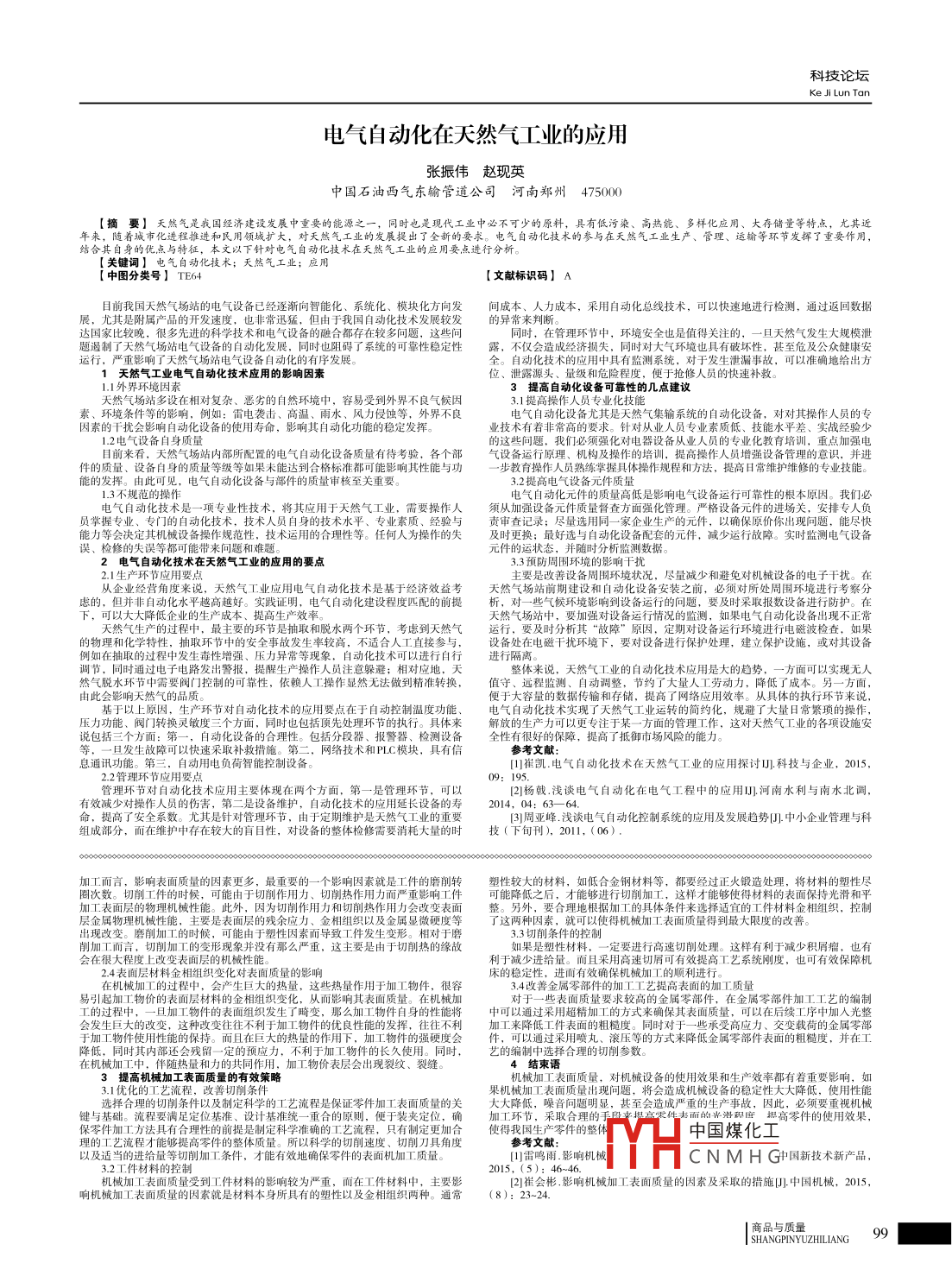 科技論壇電氣自動(dòng)化在天然氣工業(yè)的應(yīng)用張振偉趙現(xiàn)英中國石油西氣東輸管道公司河南鄭州475000【摘要】天然氣是我囯經(jīng)濟(jì)建設(shè)發(fā)展中重要的能源之一,同時(shí)也是現(xiàn)代工業(yè)中必不可少的原料,具有低污染、高熱能、多樣化應(yīng)用、大存儲(chǔ)量等特點(diǎn),尤其近年來,隨著城市化進(jìn)程推進(jìn)和民用領(lǐng)城擴(kuò)大,對(duì)天然氣工業(yè)的發(fā)展提岀了全新的要求。電氣自動(dòng)化技術(shù)的參與在天然氣工業(yè)生產(chǎn)、管理、運(yùn)翰等環(huán)節(jié)發(fā)揮了重要作用結(jié)合其自身的優(yōu)點(diǎn)與特征,本文以下針對(duì)電氣自動(dòng)化技術(shù)在天然氣工業(yè)的應(yīng)用要點(diǎn)進(jìn)行分析。【關(guān)鍵詞】電氣自動(dòng)化技術(shù);天然氣工業(yè);應(yīng)用【中圖分類號(hào)】TE64【文獻(xiàn)標(biāo)識(shí)碼】A日前我國天然氣場站的電氣設(shè)備已經(jīng)逐漸向智能化、系統(tǒng)化、模塊化方向發(fā)間成本、人力成本,采用自動(dòng)化總線技術(shù),可以快速地進(jìn)行檢測,通過返回?cái)?shù)據(jù)達(dá)國家比較晚,很多先進(jìn)的科學(xué)技術(shù)和電氣設(shè)備的融合都存在較多問題,這些問同時(shí),在管理環(huán)節(jié)中,環(huán)境安全也是值得關(guān)注的,一旦天然氣發(fā)生大規(guī)模泄題遏制了天然氣場站電氣設(shè)備的自動(dòng)化發(fā)展,同時(shí)也阻礙了系統(tǒng)的可靠性穩(wěn)定性露,不僅會(huì)造成經(jīng)濟(jì)損失,同時(shí)對(duì)大氣環(huán)境也具有破壞性,甚至危及公眾健康安運(yùn)行,嚴(yán)重影響了天然氣場站電氣設(shè)備自動(dòng)化的有序發(fā)展全。自動(dòng)化技術(shù)的應(yīng)用中具有監(jiān)測系統(tǒng),對(duì)于發(fā)生泄漏事故,可以準(zhǔn)確地給出方1天然氣工業(yè)電氣自動(dòng)化技術(shù)應(yīng)用的影響因素位、泄露源頭、量級(jí)和危險(xiǎn)程度,便于搶修人員的快速補(bǔ)救。3提高自動(dòng)化設(shè)備可靠性的幾點(diǎn)建議天然氣場站多設(shè)在相對(duì)復(fù)雜、惡劣的自然環(huán)境中,容易受到外界不良?xì)夂蛞?.1提高操作人員專業(yè)化技能素、環(huán)境條件等的影響,例如:雷電襲擊、高溫、雨水、風(fēng)力侵蝕等,外界不良?xì)庾詣?dòng)化設(shè)備尤其是天然氣集輸系統(tǒng)的自動(dòng)化設(shè)備,對(duì)對(duì)其操作人員的專因素的干擾會(huì)影響自動(dòng)化設(shè)備的使用壽命,影響其自動(dòng)化功能的穩(wěn)定發(fā)揮。業(yè)技術(shù)有著非常高的要求。針對(duì)從業(yè)人員專業(yè)素質(zhì)低、技能水平差、實(shí)戰(zhàn)經(jīng)驗(yàn)少12電氣設(shè)備自身質(zhì)量的這些問題,我們必須強(qiáng)化對(duì)電器設(shè)備從業(yè)人員的專業(yè)化教育培訓(xùn),重點(diǎn)加強(qiáng)電目前來看,天然氣場站內(nèi)部所配置的電氣自動(dòng)化設(shè)備質(zhì)量有待考驗(yàn),各個(gè)部氣設(shè)備運(yùn)行原理、機(jī)構(gòu)及操作的培訓(xùn),提高操作人員增強(qiáng)設(shè)備管理的意識(shí),并進(jìn)件的質(zhì)量、設(shè)備自身的質(zhì)量等級(jí)等如果未能達(dá)到合格標(biāo)準(zhǔn)都可能影響其性能與功一步教育操作人員熟練掌握具體操作規(guī)程和方法,提高日常維護(hù)維修的專業(yè)技能。能的發(fā)揮。由此可見,電氣自動(dòng)化設(shè)備與部件的質(zhì)量審核至關(guān)重要3.2提高電氣設(shè)備元件質(zhì)13不規(guī)范的電氣自動(dòng)化元件的質(zhì)量高低是影響電氣設(shè)備運(yùn)行可靠性的根本原因。我們必電氣自動(dòng)化技術(shù)是一項(xiàng)專業(yè)性技術(shù)用于天然氣工業(yè),需要操作人須從加強(qiáng)設(shè)備元件質(zhì)量督查方面強(qiáng)化管理。嚴(yán)格設(shè)備元件的進(jìn)場關(guān),安排專人負(fù)員掌握專業(yè)、專門的自動(dòng)化技術(shù),技術(shù)人的技術(shù)水平、專業(yè)素質(zhì)、經(jīng)驗(yàn)與責(zé)審查記錄;盡量選用同一家企業(yè)生產(chǎn)的元件,以確保原價(jià)你出現(xiàn)問題,能盡快J等會(huì)決定其機(jī)械設(shè)備操作規(guī)范性,技理性等。任何人為操作的失及時(shí)更換;最好選與自動(dòng)化設(shè)備配套的元件,減少運(yùn)行故障。實(shí)時(shí)監(jiān)測電氣設(shè)備誤、檢修的失誤等都可能帶來問題和難元件的運(yùn)狀態(tài),并隨時(shí)分析監(jiān)測數(shù)據(jù)2電氣自動(dòng)化技術(shù)在天然氣工業(yè)的應(yīng)用的要點(diǎn)3.3預(yù)防周圍環(huán)境的影響干擾主要是改善設(shè)備周圍環(huán)境狀況,盡量減少和避免對(duì)機(jī)械設(shè)備的電子干擾從企業(yè)經(jīng)營角度來說,天然氣工業(yè)應(yīng)用電氣自動(dòng)化技術(shù)是基于經(jīng)濟(jì)效益考天然氣場站前期建設(shè)和自動(dòng)化設(shè)備安裝之前,必須對(duì)所處周圍環(huán)境進(jìn)行考察分慮的,但并非自動(dòng)化水平越高越好。實(shí)踐證明,電氣自動(dòng)化建設(shè)程度匹配的前提析,對(duì)一些氣候環(huán)境影響到設(shè)備運(yùn)行的問題,要及時(shí)采取報(bào)數(shù)設(shè)備進(jìn)行防護(hù)。在下,可以大大降低企業(yè)的生產(chǎn)成本、提高生產(chǎn)效率天然氣場
