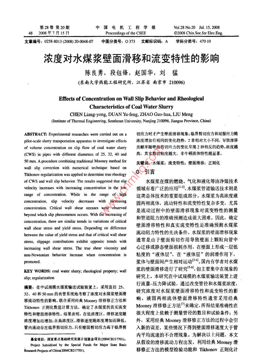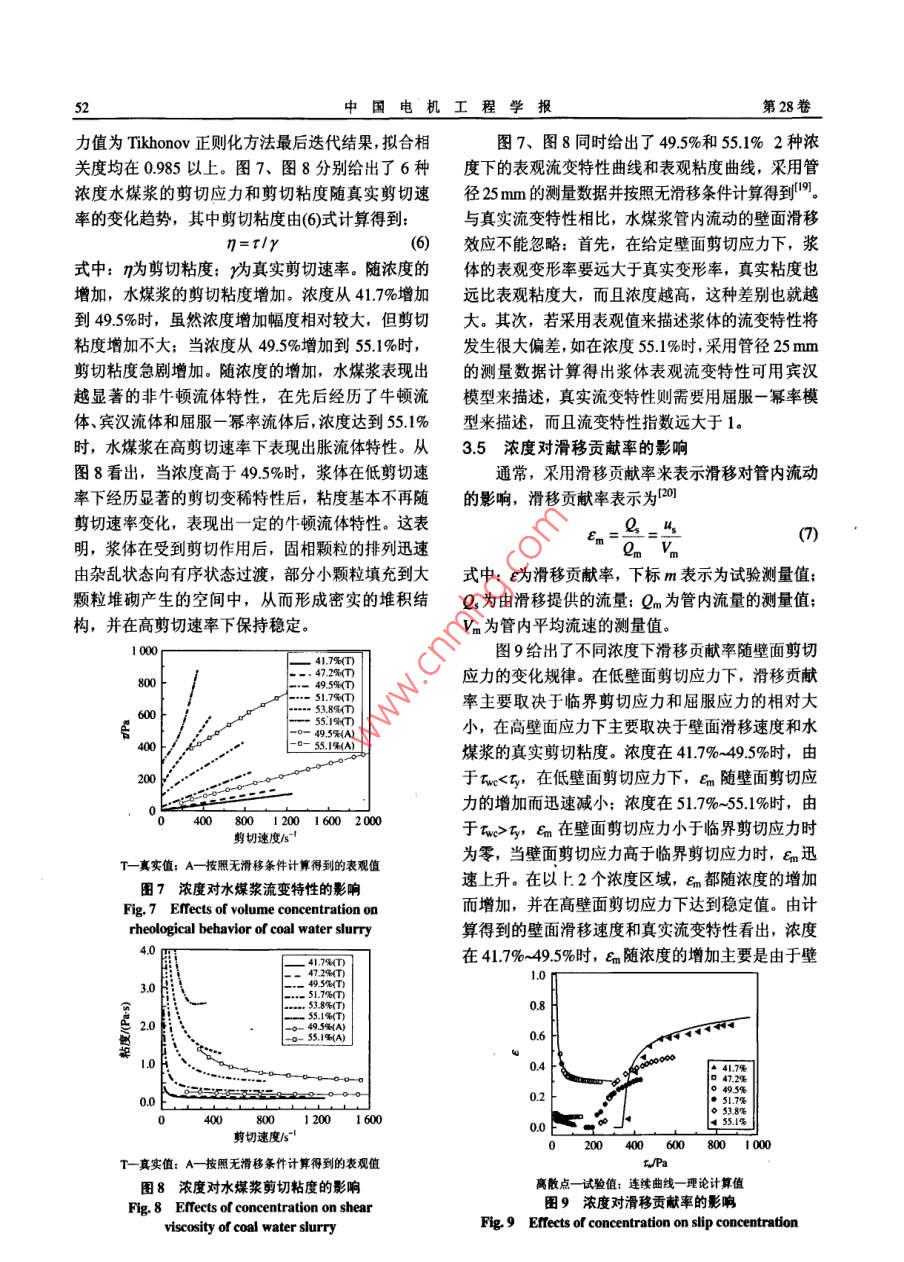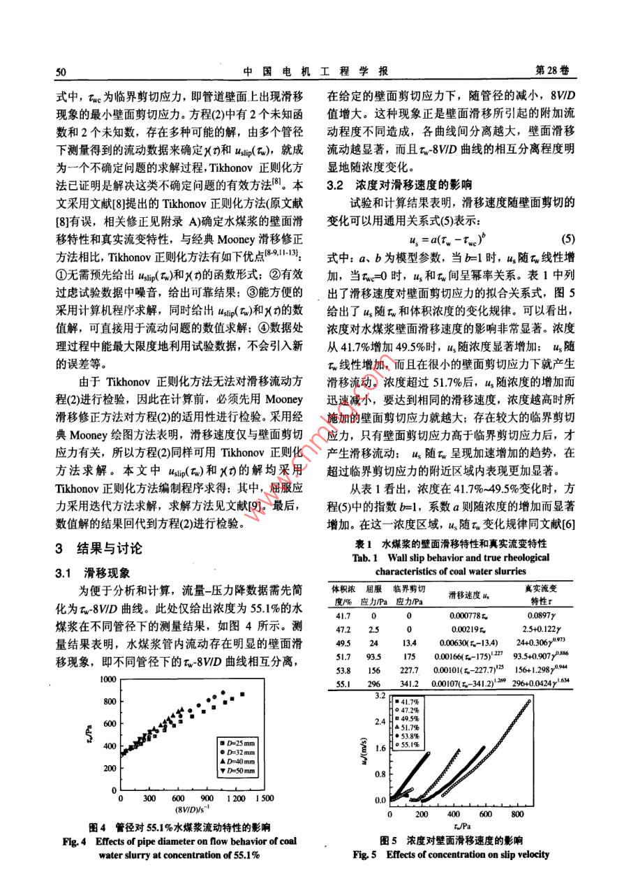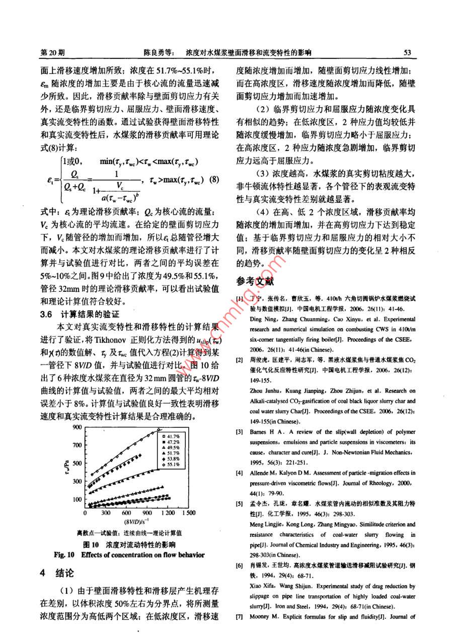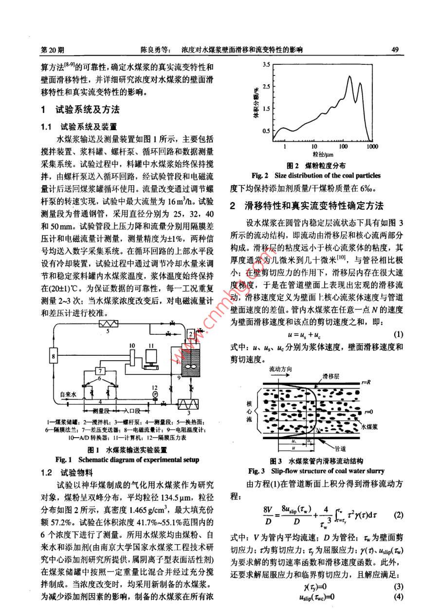 第28卷第20期中國(guó)電機(jī)工程學(xué)報(bào)Vol.28No.20Jul.15,200848200年7月15日 Proceedings of the CsEE""2 08 Chin. Soc. for Elec E"文章編號(hào):02588013(2008)20004807中圖分類號(hào):0373文獻(xiàn)標(biāo)識(shí)碼:A學(xué)科分類號(hào):47010濃度對(duì)水煤漿壁面滑移和流變特性的影響陳良勇,段鈺鋒,趙國(guó)華,劉猛(東南大學(xué)熱能工程研究所,江蘇省南京市210096)Effects of Concentration on Wall Slip Behavior and RheologicalCharacteristics of Coal Water SlurryCHEN Liang-yong, DUAN Yu-feng, ZHAO Guo-hua, LIU Meng( Institute of Thermal Engineering, Southeast University, Nanjing 210096, Jiangsu Province, China)ABSTRACT: Experimental researches were carried out on a切應(yīng)力時(shí)才產(chǎn)生壁面滑移現(xiàn)象;臨界剪切應(yīng)力和屈服應(yīng)力隨pilot-scale slumy transportation apparatus to investigate effects濃度增加有相同的變化趨勢(shì),2者相對(duì)大小不同,導(dǎo)致滑移of volume concentration on slip flow of coal water slurry貢獻(xiàn)率隨壁面剪切應(yīng)力的變化呈現(xiàn)2種相反的趨勢(shì)濃度越(CWS) in pipes with different diameters of25,32,40and高,真實(shí)剪切粘度越大,非牛頓流體特性越顯著50 mm. a procedure combining traditional Mooney method for關(guān)鍵詞:水煤漿;流變特性;壁面滑移;正則化wall slip correction with numerical technique based onTikhonov regularization was applied to determine true rheology 0 3IEof CwS and wall slip behavior. The results suggested that slip水煤漿在煤的燃燒、氣化和液化等潔凈煤技術(shù)velocity increases with increasing concentration in the low領(lǐng)域有著廣泛的應(yīng)用2,水煤漿管道輸送技術(shù)則是range of concentration. While in the range of high這類總體技術(shù)的重要組成部分。水煤漿為高濃度液concentration, slip velocity decreases with increasing固兩相流體,流動(dòng)特性和流變特性復(fù)雜多變,尤其concentration. Critical wall shear stresses were observed是流動(dòng)過程中的壁面滑移現(xiàn)象對(duì)流變特性的測(cè)量beyond which slip phenomenon occurs. With the increasing o和管道阻力的準(zhǔn)確預(yù)測(cè)造成很大困難。因此,確定concentration there are similar trends in variations of criticalwall shear stress and yield stress. Depending on difference壁面滑移特性和真實(shí)流變特性是準(zhǔn)確預(yù)測(cè)水煤漿between the value of yield stress and that of critical wall shear流動(dòng)阻力特性的先決條件。水煤漿的壁面滑移現(xiàn)象sres. slippage contributions exhibit opposite trends with通常是由于壁面剪切作用導(dǎo)致壁面上顆粒向管中increasing wall shear stress. The true shear viscosity and心遷移或靜態(tài)壁面損耗作用,在壁面上形成一層低non-Newtonian behavior increase when concentration is粘度的“液體層”,在“液體層”的潤(rùn)滑作用下,漿體與壁面間產(chǎn)生相對(duì)運(yùn)動(dòng)4國(guó)內(nèi)有學(xué)者對(duì)水煤KEY WORDS: coal water slurry; rheological propert;wal漿的壁面滑移進(jìn)行了研究,但主要集中在現(xiàn)象的slip; regularization研究上。本研究在中試規(guī)模的水煤漿輸送裝置上進(jìn)摘要:在中試規(guī)模水煤漿輸送試驗(yàn)裝置上,采用直徑25、行流量壓力降試驗(yàn),通過改變管徑和水煤漿濃度32、4和50mm的直管系統(tǒng)地考察了濃度對(duì)水煤漿壁面滑研究濃度對(duì)水煤漿壁面滑移特性和流變特性的影移流動(dòng)特性的影響聯(lián)合采用經(jīng)典Mmry滑移修正方法和響。液固兩相流體壁面滑移特性通常采用經(jīng)典Tikhonov正則化數(shù)值計(jì)算方法,確定了水煤漿的真實(shí)流變 Mooney滑移修正方法米確定,所得結(jié)果準(zhǔn)確性在特性和壁面滑移特性。結(jié)果表明,在低濃度區(qū),滑移速度隨很大程度上依賴于測(cè)量管徑的數(shù)目和試驗(yàn)條件;另濃度增加而增加;在高濃度區(qū)滑移速度隨濃度增加而降低。外,采用經(jīng)典 Mooney滑移修正方法的過程中會(huì)引管內(nèi)流動(dòng)存在臨界剪切應(yīng)力只有壁面剪切應(yīng)力高于臨界剪入新的誤差,某些情況下得到壁面滑移速度大于管基金項(xiàng)目:國(guó)家重點(diǎn)基礎(chǔ)研究發(fā)展計(jì)劃基金項(xiàng)目(2004CB217701),內(nèi)平均流速的不合理現(xiàn)象。為解決以上問題,本文oject Subsidized by the Special Funds for Major State B從假設(shè)的滑移流動(dòng)方程出發(fā),利用經(jīng)典Mooney滑esearch Projects of China(2004CB2177o1)移修正方法的模型檢驗(yàn)功能和 Tikhonov正則化計(jì)20期陳良勇等:濃度對(duì)水煤漿壁面滑移和流變特性的影響算方法8的可靠性,確定水煤漿的真實(shí)流變特性和壁面滑移特性,并詳細(xì)研究濃度對(duì)水煤漿的壁面滑移特性和真實(shí)流變特性的影響1試驗(yàn)系統(tǒng)及方法1.1試驗(yàn)系統(tǒng)及裝置水煤漿輸送及測(cè)量裝置如圖1所示,主要包括攪拌裝置、漿料罐、螺桿泵、循環(huán)回路和數(shù)據(jù)測(cè)量采集系統(tǒng)。試驗(yàn)過程中,料罐中水煤漿始終保持?jǐn)噲D2煤粉粒度分拌,由螺桿泵送入循環(huán)回路,經(jīng)試驗(yàn)管段和電磁流Fig. 2 Size distribution of the coal particles量計(jì)后送冋煤漿罐循環(huán)使用。流量改變通過調(diào)節(jié)螺度下均保持添加劑質(zhì)量/煤粉質(zhì)量在6‰。桿泵的轉(zhuǎn)速實(shí)現(xiàn),試驗(yàn)中最大流量為16m3/。試驗(yàn)2滑移特性和真實(shí)流變特性確定方法測(cè)量段為普