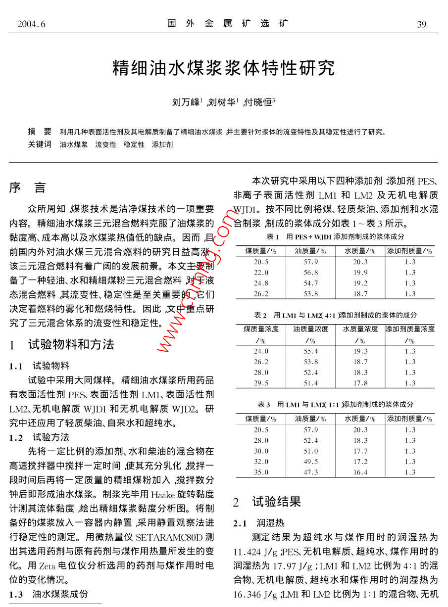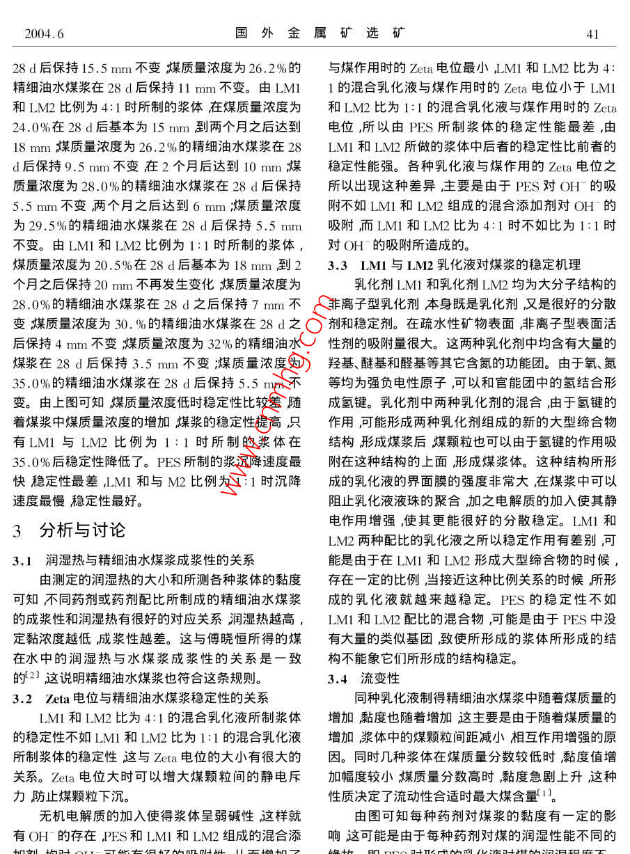 2004.6國外金屬礦選礦精細油水煤漿漿體特性研究劉萬峰劉樹華↓付曉恒3摘要利用幾種表面活性劑及其電解質制備了精細油水煤漿并主要針對漿體的流變特性及其穩(wěn)定性進行了研究。關鍵詞油水煤漿流變性穩(wěn)定性添加劑序言本次研究中采用以下四種添加劑添加劑PES非離子表面活性劑LMI和LM2及無機電解質眾所周知煤漿技術是潔凈煤技術的一項重要wDl。按不同比例將煤、輕質柴油、添加劑和水混內容。精細油水煤漿三元混合燃料克服了油煤漿的合制漿制成的漿體成分如表1~表3所示。黏度高、成本高以及水煤漿熱值低的缺點。因而目表1用PFS+wJD1添加劑制成的漿體成分前國內外對油水煤三元混合燃料的研究日益高漲煤質量/%油質量/%水質量/%添加劑質量/%該三元混合燃料有著廣闊的發(fā)展前景。本文主要制20.520.31.3備了一種輕油、水和精細煤粉三元混合燃料對于液1,319.21.3態(tài)混合燃料其流變性、穩(wěn)定性是至關重要的,它們18.71,3決定著燃料的霧化和燃燒特性。因此文中重點研表2用LM與LMx4:添加劑制成的漿體的成分究了三元混合體系的流變性和穩(wěn)定性。煤質量濃度油質量濃度水質量濃度添加劑質量濃度1試驗物料和方法/%24,01.1試驗物料.253.828,0l8.3試驗中采用大同煤樣。精細油水煤漿所用藥品有表面活性劑PES表面活性劑LM1、表面活性劑LM2、無機電解質WJD1和無機電解質WJD2。研表3用IMI1與IMx1:1加劑制成的漿體成分究中還應用了輕質柴油、自來水和超純水煤質量/%油質量/%水質量/%添加劑質量/%1.2試驗方法28.018.31.3先將一定比例的添加劑、水和柴油的混合物在17.7高速攪拌器中攪拌一定時間使其充分乳化攪拌一17.247.316.4段時間后再將一定質量的精細煤粉加入攪拌數分鐘后即形成油水煤漿。制漿完畢用Hake旋轉黏度計測其流體黏度繪出精細煤漿黏度分析圖。將制2試驗結果備好的煤漿放入一容器內靜置采用靜置觀察法進2.1潤濕熱行穩(wěn)定性的測定。用微熱量儀 SETARAMC8OD測測定結果為超純水與煤作用時的潤濕熱為出其選用藥劑與原有藥劑與煤作用熱量所發(fā)生的變11.424J/gPES無機電解質、超純水、煤作用時的化。用Zeta電位儀分析選用的藥劑與煤作用時電潤濕熱為17.97J/g;LMl和LM2比例為4:1的混位的變化情況。合物、無機電解質、超純水和煤作用時的潤濕熱為1.3油水煤漿成份16.346J/gM1和IM比例為1:1的混合物無機國外金屬礦選礦2004.6電解質超純水和煤作用時的潤濕熱為15.790J/g2,4漿體的穩(wěn)定性由此可以看出超純水與煤作用時的潤濕熱最本試驗對使用PES或LM1和LM2(LM1l和小LM1和LM2比例為1:1的混合物、無機電解LM2用量比例為4:1和1:1時)無機電解質做添質、超純水和煤作用時的潤濕熱稍大LM1和LM2加劑時所制的漿體采用的是靜觀察法進行漿體穩(wěn)比例為4:1的混合物、無機電解質、超純水和煤作用定性測定的并根據所測數據作圖結果如圖2圖3時的潤濕熱適中PES無機電解質、超純水煤作用和圖4時的潤濕熱最大2.2Teta電位20.5%測定結果為PES無機電解質WJDl煤和超純一—20%水作用的Zeta電位為-49.7mVLM和LM2混一248%合物LM1:LM2=4:1)無機電解質wI1煤和超純水的作用的Zeta電位為-58.8mV:LM1和LM2一262%的混合LM1:LM2=1:1)無機電解質wJDl煤和超純水作用的Zeta電位為-67.6mV。時間由此可以看出用PES時Zeta電位絕對值最圖2不同濃度漿體隨時間的穩(wěn)定性(PES)小M1和LM2比為4:1時zeta電位絕對值適中;LM1和LM2比為1:1時Zeta電位絕對值最大2.3漿體黏度6420240926.2%在剪切速率為100s-1時不同漿體的黏度測定結果如圖1所示。295%一LM(4:1)圖3不同濃度漿體隨時間的穩(wěn)定性LMI:LM2=4:1)LM(:1)煤量百分含量隔%一320%圖1煤漿黏度隨煤量百分含量的變化由圖1可知用PS作添加劑所制的漿體比4205%LMI和LM所制的漿體在同樣煤質量濃度下黏度偏高在同樣油質量濃度下黏度也偏高。在同樣藥劑的條件下隨著煤的質量濃度的增大漿體的黏度增大。在同樣的黏度條件下添加劑PES和無機電時間l解質wJD所制的精細油水煤漿中煤的質量濃度最圖4不同濃度漿體隨穩(wěn)定性LM:LM2=1:1低添加劑LM1和LM2比例為4:1時與無機電解由以上圖可知每種濃度的精細油水煤漿隨著質所制的精細油水煤漿中煤的質量濃度次之添加時間的增長清澈層的高度變大但都在28d后基劑LM1和LM比例為1:1時煤的質量濃度最高。本保持清澈層高度不變。由PES所制的漿體在煤幾種漿體都是在煤質量分數較低時,黏度值增加幅質量濃度為20.5%在28d后基本為19.5mm煤質度較小煤質量分數高時黏度急劇上升這與水煤量濃度為2%的精細油水煤漿在28d后保持162004.6國外金屬礦選礦4128d后保持15.5mm不變煤質量濃度為26.2%的與煤作用時的Zeta電位最小,LM和LM2比為4精細油水煤漿在28d后保持11mm不變。由LM11的混合乳化液與煤作用時的Zeta電位小于LMI和LM2比例為4:1時所制的漿體在煤質量濃度為和LM2比為1:1的混合乳化液與煤作用時的Zeta24.0%在28d后基本為15mm到兩個月之后達到電位,所以由PES所制漿體的穩(wěn)定性能最差,由l8mm煤質量濃度為26.2%旳精細油水煤漿在28LM和LM所做的漿體中后者的穩(wěn)定性比前者的d后保持9.5mm不變在2個月后達到10mm煤穩(wěn)定性能強。各種乳化液與煤作用的zeta電位之質量濃度為28.0%的精細油水煤漿在28d后保持所以出現這種差異主要是由于PES對OH的吸5.5mm不變兩個月之后達到6mm;煤質量濃度附不如LM和LM2組成的混合添加劑對OH的為29.5%的精細油水