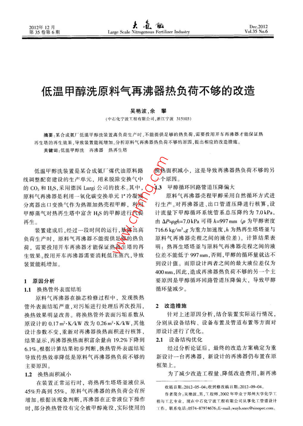 低溫甲醇洗原料氣再沸器熱負荷不夠的改造