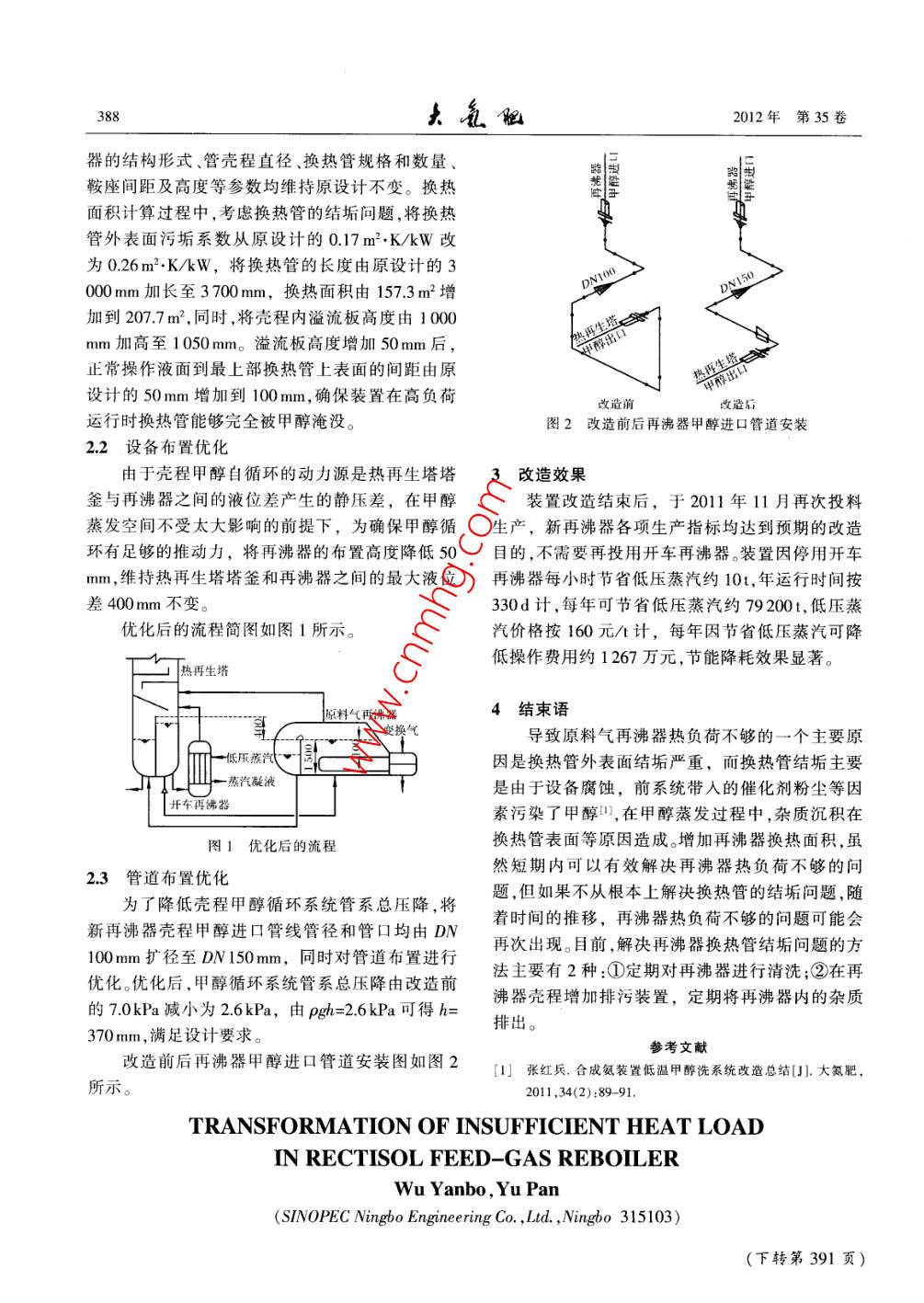 2012年12月Dec 2012第35卷第6期Large Scale Nitrogenous Fertilizer IndustryVol 35 No 6低溫甲醇洗原料氣再沸器熱負荷不夠的改造吳艷波,余攀(中石化寧波工程有限公司,浙江寧波315103)摘要:某合成氨廠低溫甲醇洗裝置高負荷生產(chǎn)時,不能提供足夠的熱負荷,需要投用開車再沸器才能保證熱再生塔的再生效果,導致裝置能耗增加分析原料氣再沸器熱負荷不夠的原因,提出相應的改造措施。關鍵詞:低溫甲醇洗再沸器熱再生塔低溫甲醇洗裝置是某合成氨廠煤代油原料路換熱面積減小,這是導致再沸器熱負荷不夠的另線調(diào)整配套建設的生產(chǎn)單元,用來脫除變換氣中個原因。的CO2和HS,采用德國Lurg公司的技術其中,1.3甲醇循環(huán)回路管道壓降偏大原料氣再沸器是利用一氧化碳變換單元1°冷凝液原料氣再沸器殼程甲醇采用自然循環(huán)方式進分離器出口變換氣作為熱源加熱殼程甲醇,利用行生產(chǎn)。對再沸器進、出口管道壓降進行核算,設甲醇蒸氣對熱再生塔中富含HS的甲醇進行汽提計流量下甲醇循環(huán)系統(tǒng)管系總壓降約為7.0kPa再生。由△P→gh=7.0kPa可得h=997mm(p為甲醇密度裝置建成后,經(jīng)過一段時間的運行,暴露出高16.6kg/m2,g為重力加速度,h為熱再生塔塔釜與負荷生產(chǎn)時,原料氣再沸器不能提供足夠的熱負原料氣再沸器殼程之間的液位差)。計算結(jié)果表荷,需要投用開車再沸器才能保證熱再生塔的再明:熱再生塔塔釜與原料氣再沸器殼程之間的液生效果。投用開車再沸器需要消耗低壓蒸汽,導致位差不能低于997mm,否則,甲醇的循環(huán)量就達不裝置能耗增加。到設計值。而原設計兩者之間的最大液位差僅為400mm,因此,造成再沸器熱負荷不夠的另一個主1原因分析要原因是甲醇循環(huán)回路管道壓降偏大,導致甲醇1.1換熱管外表面結(jié)垢循環(huán)量減少。原料氣再沸器在抽芯檢修過程中,發(fā)現(xiàn)換熱管外表面結(jié)垢嚴重,對污垢進行處理后再次投用,2改造措施換熱效果明顯改善。將換熱管外表面污垢系數(shù)從針對上述原因分析,結(jié)合裝置實際運行情況原設計的0.17m2K/kW改為0.26m2·KkW,其他分別從設備結(jié)構(gòu)、設備布置及管道布置等方面對設計參數(shù)不變,重新對再沸器換熱面積進行核算,原設計進行了優(yōu)化。結(jié)果顯示,再沸器換熱面積富余量由19%下降到2.1設備結(jié)構(gòu)優(yōu)化6.1%。根據(jù)計算結(jié)果初步判斷,換熱管外表面結(jié)垢經(jīng)過分析論證后,最終的改造方案確定為重導致傳熱效率降低是原料氣再沸器熱負荷不夠的新設計一臺再沸器,新設計的再沸器仍布置在原主要原因??蚣苌?。1.2換熱面積減小為了減少改造工程量、降低改造費用,新再沸在裝置正常運行時,將熱再生塔塔釜液位從45%升高到55%,原料氣再沸器的熱負荷會有所收稿日期:2012-05-04;收到修改稿日期:2012-09-04。作者簡介:吳艷波,男,T程師,2002年畢業(yè)于鄭州大學化學工增加。根據(jù)該現(xiàn)象判斷,再沸器在正常液位下操作程與T藝專業(yè),現(xiàn)在中石化寧波T程有限公司從事化工管道設計時,部分換熱管沒有完全被甲醇淹沒,實際使用的T作。聯(lián)系電話:057487974676:E-mil:wuyispec@sinopec.com3882012年第35卷器的結(jié)構(gòu)形式、管殼程直徑、換熱管規(guī)格和數(shù)量、鞍座間距及高度等參數(shù)均維持原設計不變。換熱面積計算過程中,考慮換熱管的結(jié)垢問題,將換熱管外表面污垢系數(shù)從原設計的017m2K/kW改為0.26m2K/kW,將換熱管的長度由原設計的3000mm加長至3700mm,換熱面積由1573m2增加到207.7m2,同時,將殼程內(nèi)溢流板高度由1000mm加高至1050mm。溢流板高度增加50mm后,正常操作液面到最上部換熱管上表面的間距由原設計的50mm增加到100mm,確保裝置在高負荷改造前改造后運行時換熱管能夠完全被甲醇淹沒。圖2改造前后再沸器甲醇進口管道安裝22設備布置優(yōu)化由于殼程甲醇自循環(huán)的動力源是熱再生塔塔3改造效果釜與再沸器之間的液位差產(chǎn)生的靜壓差,在甲醇裝置改造結(jié)束后,于2011年11月再次投料蒸發(fā)空間不受太大影響的前提下,為確保甲醇循生產(chǎn),新再沸器各項生產(chǎn)指標均達到預期的改造環(huán)有足夠的推動力,將再沸器的布置高度降低50目的,不需要再投用開車再沸器。裝置因停用開車mm,維持熱再生塔塔釜和再沸器之間的最大液位再沸器每小時節(jié)省低壓蒸汽約10t,年運行時間按差400mm不變。330d計,每年可節(jié)省低壓蒸汽約79200t,低壓蒸優(yōu)化后的流程簡圖如圖1所示。汽價格按160元∧t計,每年因節(jié)省低壓蒸汽可降低操作費用約1267萬元,節(jié)能降耗效果顯著。熱再生塔原料氣再沸器4結(jié)束語換氣導致原料氣再沸器熱負荷不夠的一個主要原氐壓蒸因是換熱管外表面結(jié)垢嚴重,而換熱管結(jié)垢主要一蒸汽凝液是由于設備腐蝕,前系統(tǒng)帶入的催化劑粉塵等因F車再沸器素污染了甲醇口,在甲醇蒸發(fā)過程中,雜質(zhì)沉積在圖1優(yōu)化后的流程換熱管表面等原因造成。增加再沸器換熱面積,雖2.3管道布置優(yōu)化然短期內(nèi)可以有效解決再沸器熱負荷不夠的問為了降低殼程甲醇循環(huán)系統(tǒng)管系總壓降,將題,但如果不從根本上解決換熱管的結(jié)垢問題,隨新再沸器殼程甲醇進口管線管徑和管口均由D著時間的推移,再沸器熱負荷不夠的問題可能會100mm擴