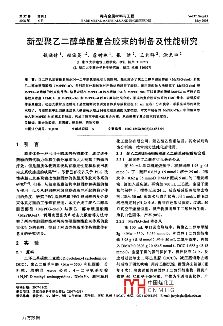 第37卷增刊2稀有金屬材料與工程VoL37, Suppl.22008年5月RARE METAL MATERIALS AND ENGINEERINGMay 2008新型聚乙二醇單酯復合膠束的制備及性能研究錢曉倩',賴俊英1,2, 詹樹林',張潔”, 王利群2,涂克華2(1.浙江大學建筑工程學院,浙江杭州310027)(2.浙江大學高分子科學研究所,浙江杭州310027)摘要: 以二環(huán)已基碳酰亞胺N,N-二甲基氨基吡啶為偶聯(lián)劑,酯化縮合了聚乙二醇單膽固醇酯(MePEG-chol) 和聚乙二醇單硬脂酸酯(MePEG-st), 并利用紅外和核磁對產(chǎn)物結構進行了表征。采用表面張力法研究了MePEG-chol和MePEG-st溶液的膠束化行為。結果表明在MePEG-st的水溶液中加入MePEG -chol可以顯著地降低MePEG-st溶液的臨界膠柬濃度(CMC).當MePEG-cho!和MePEG-st以0.2摩爾比混合時,形成的復合膠束體系的CMC最小,表明膠束體系最穩(wěn)定。動態(tài)光散射及透射電子顯微鏡測試表明復合體系形成粒徑在10 nm左右,分布狹窄,形貌呈球形的微膠東粒子。與細胞膜中膽固醇通過嵌入磷脂疏水層達到穩(wěn)定細胞膜的現(xiàn)象類似,本文中制備的MePEG-Chol 中的膽固醇嵌入到MePEG-St的疏水脂肪層,構成了膠束中疏水的復合內(nèi)核,從而提高了復合膠束的穩(wěn)定性。關鍵詞:聚合物膠束,膽固醇,硬脂酸,藥物控釋中圈法分類號: TQ420文獻標識碼: A文章編號: 1002-185X(2008)S2-655-04化工股份有限公司,經(jīng)乙酸乙酯重結晶.其余試劑均1引言為分析純,按常規(guī)方法純化后使用。脂質體是一種已用于臨床的藥物載體,通過改變2.2聚乙二醇膽固醇 酯和聚乙二醇單硬脂酸脂合成藥物的藥代動力學和生物分布率而大大提高了藥物的2.2.1 膽固醇丁二酸酐衍生物的合成療效。但是脂質體載藥系統(tǒng)具有穩(wěn)定性差和易被網(wǎng)狀在50 mL單口圓底燒瓶中,將膽固醇1.95 g (5內(nèi)皮系統(tǒng)捕捉的缺陷(1.2]。盡管已有很多關于PEG改mmol)、丁二酸酐0.625g (5 mmol)溶于25 mL二嚅性磷脂以及寡聚糖改性膽固醇的仿脂質體膠束體系的烷中,0.62 g (5 mmol) DMAP配成5 mL的二囈烷溶研究[-0,但是,從細胞脂膜結構中膽固醇和磷脂的相液,滴加入反應液,再滴加700 μL三乙胺,室溫千燥互作用,以及從膽固醇對細胞膜磷脂層所起的穩(wěn)定作氮氣保護下,攪拌反應24 h.反應后減壓蒸發(fā)除去溶用的角度,研究PEG-脂肪酸和PEG-膽固醇的復合膠劑,加入30 mL蒸餾水形成乳狀液,用1 mol/L的HCI束體系方面的工作鮮有報道。本文合成了聚乙二醇單溶液滴定到pH為5~6,得到白色絮狀沉淀,過濾。50膽固醇酯(MePEG-chol) 與聚乙二醇單硬脂酸酯C真空干燥至恒重。得產(chǎn)物膽固醇丁二酸酐衍生物,(MePEG-st),利用表面張力和動態(tài)光散射等方法考為乳白色固體,產(chǎn)率90%。察了兩親性膽固醇酯對兩親性硬脂酸酯膠東體系的膠2.2.2 MePEG-chol 的合成束化行為的影響,得到了對該類仿脂質體藥物載體有在100 mL單口圓底燒瓶中,將聚乙二醇單甲醚意義的研究結果。3g (Mw= 550, 5.454 mmol)、 膽固醇丁二酸酐衍生物3.98g (8.18 mmol)溶于50 mL二氯甲烷中,再加.2實驗入DMAP 0.0803 g (0.6545 mmol). DCC 1.688 g(8.182.1 原料mmol)。室溫干燥的氮氣保護下,攪拌反應24 h.反二環(huán)己基碳酰二亞胺( Dicyclohexyl carbodimide,應后過濾除去二環(huán)己基脲(DCU),減壓蒸餾除去溶DCC)、聚乙二醇單甲醚(Mw=550)和膽固醇,分劑后溶于四氫呋喃,用冷乙醚沉淀,靜置棄去清液(重析純,均購自Acros 公司。4-二甲氨基吡啶復4次),除去過量的膽固醇丁二酸酐衍生物,得到產(chǎn)(N,N'-Dimetbyl aminopyridine, DMAP), 湖南海利物在60 C真空干燥恒重.產(chǎn)物為半透明膏狀體,產(chǎn)中國煤化工收稿日期: 2007-11-22基金項目:國家自然科學基金資助(20474055)YHCNMH G通訊作者:賴俊英,女,博士,浙江大學建筑工程學院,浙江杭州310027,電話: 0571-87951397, E-mail: junyinglai@zju.edu.cn●656●稀有金屬材料與工程第37卷率70%。2.2.3 MePEG-st 的合成在50mL圓底燒瓶中,將硬脂酸0.568g(2mmol),DMAP聚乙二醇單甲醚1.210g (2.2 mmol)溶于30 mL二氯甲烷中,在依次加入DMAP0.0245 g (0.2 mmol),DCC,DMAPDCC0.4539 g (2.2 mmol)。在氮氣保護、攪拌、30 C(MePEG- chol)下反應36 h后,過濾去沉淀DCU,減壓蒸去溶劑,再將其溶于乙酸乙酯,用300 g/L的NaCl水溶液重復MePEG-0H+CH;(CH2)16CO0H DMAP CH:(CH2)6COOPEGMe(MePEG-st)萃取多次,洗去殘留的聚乙二醇單甲醚,加入無水MgSO4后,再減壓蒸去溶劑乙酸乙酯,40 C真空干圖1 MePEG-chol 和MePEG-st的合成路線燥24h.得白色固體產(chǎn)物。Fig.1 The synthetic routes of MePEG-chol and MePEG-st2.3 膠束溶液的制備先將樣品溶于四氫呋喃,在劇烈攪拌下滴入蒸餾不同,羰基出現(xiàn)兩個峰,化學位移分別位171.85 和水中,滴完后再攪拌48 h揮發(fā)四氫呋喃。用該方法配172.59。H-NMR譜圖中重要的質子化學位移歸屬為:制濃度為5 mg/mL溶液,其它濃度的溶液通過稀釋法85.35 (m,膽固醇C(6)-H), 4.24 (m,膽固醇C(3)配制。-H), 4.23 (t, PEG CH(a)2, 2H), 3.78~3.42 (PEG2.4 表面張力的測定CH(b)2, (4n-4)H), 3.34 (s, PEG- 0CH(C)3, 3H),水為二重蒸餾的去離子水。樣品池的溫度由恒溫2.64 (t,丁二酸酐H(d), 4H), 2.35 (m,膽固醇C(4)系統(tǒng)控制,控溫精度為+0.1 C.每個樣品在樣品池靜- H2, 2H), 1.99~0.64 (膽固醇上其它的H, 41H).置30 min后測定。產(chǎn)物MePEG-st紅外光譜中,單甲醚聚乙二醇的2.5 粒徑測定.羥基吸收峰消失,1730.5 cm^' 處吸收峰為生成的酯鍵樣品溶液濃度為0.1 mg/mL,經(jīng)0.45 μm的微孔膜特征吸收峰。過濾后注入樣品池,樣品測定時散射角固定在90%.3.2兩親性聚合物混合