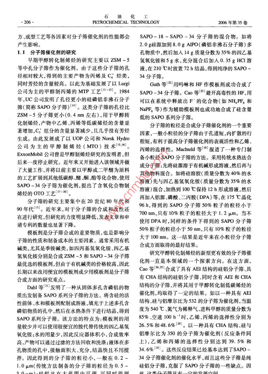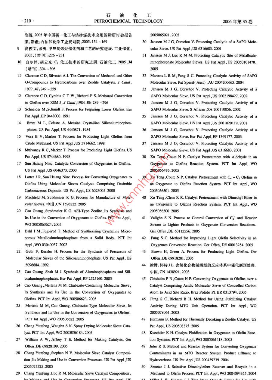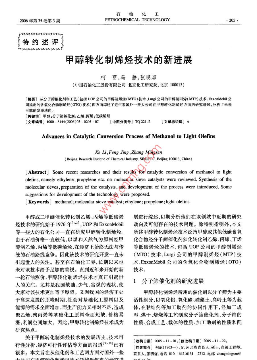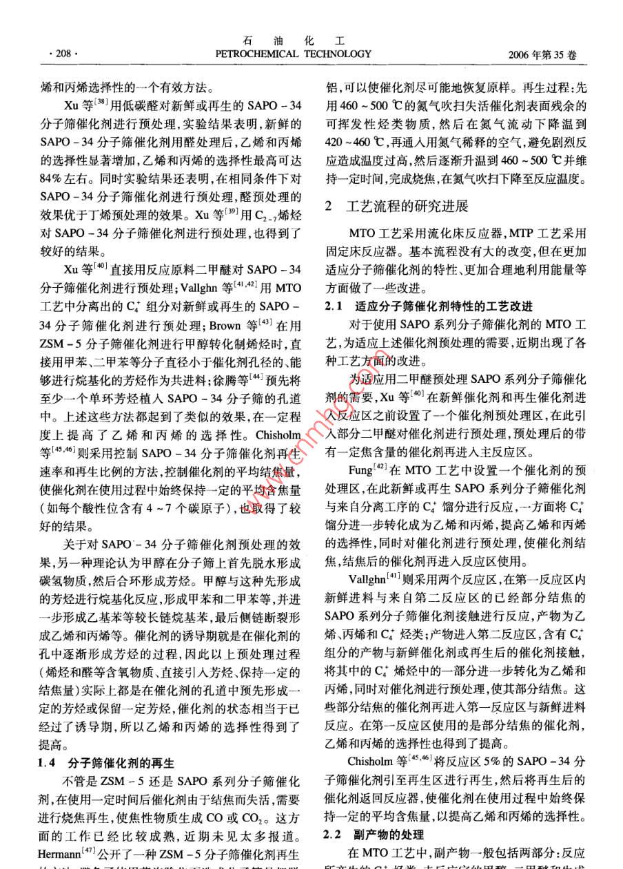 石油化工2006年第35卷第3期PETROCHEMICAL TECHNOLOGY.205.特約述評甲醇轉化制烯烴技術的新進展柯麗,馮靜,張明森(中國石油化工股份有限公司北京化工研究院,北京100013)[摘要]從分子篩催化劑和工藝(包括UOP公司的甲醇制烯烴( MTO)技術、Lurgi公司的甲醇制丙燦( MTP)技術ExxonMobil公司提出的含氧化合物制烯烴(OTO)技術)兩方面綜述了近年來國外- - 些大公司在甲醇轉化制烯烴方面的研究進展,分析了未來可能的發(fā)展動向。[關鍵詞]甲醇;分子篩催化劑;乙烯;丙烯;低碳烯烴[文章編號] 1000 -8144(2006)03 -0205 -07[中圖分類號] TQ 221.2[文獻標識碼] AAdvances in Catalytic Conversion Process of Methanol to Light OlefinsKe Li,Feng Jing ,Zhang Mingsen( Bejjig Research Institute of Chemical Industry, SINOPEC, Beijing 1003 ,China)[ Abstract ] Some recent researches and their results for catalytic conversion of methanol to lightolefins , namely ethylene , propylene etc. on molecular sieve catalysts were reviewed. Synthesis of themolecular sieves , preparation of the catalysts , and development of the process were introduced. Somesuggestions for development of the technology were proposed.[ Keywords ] methanol ; molecular sieve catalyst;ethylene ; propylene ; light olefins甲醇或二甲醚催化轉化制乙烯、丙烯等低碳烯展進行綜述,以期分析他們在該領域中近期的研究烴技術的研究始于1976年[1,21 ,UOP和ExxonMobil動向及可能存在的技術問題。除特別指明外,本文等一些大的石化公司一直在研究甲醇轉化制烯烴。所述甲醇轉化制烯烴技術泛指甲醇或其他低碳含氧由于石油價格--直較低,以煤和天然氣為原料經甲化合物經分子篩催化劑催化轉化制乙烯、丙烯、丁烯醇制乙烯、丙烯等低碳烯烴,在經濟上始終無法與傳等低碳烯烴的技術,包括UOP公司的甲醇制烯烴統(tǒng)的石油路線競爭。因此該技術的研究開發(fā)- -直未(MTO)技術、Lurgi公司的甲醇制烯烴(MTP)技引起世人的關注。甚至在石油化工界,長期以來也術、ExxonMobil公司的含氧化合物制烯烴(0TO)未對該技術給予足夠的重視。直到近年來開始的新技術。-輪石油漲價,甲醇轉化制烯烴技術才真正引起世1分 子篩催化劑的研究進展人的關注。尤其是我國缺油、少氣、富煤的現狀,使大家對該技術更加寄厚望。又因我國的經濟正處甲醇轉化制烯烴所用的催化劑以分子篩為主要于高速發(fā)展的頂峰時期,社會對基礎化工原料以及活性組分,以氧化鋁、氧化硅、硅藻土、高嶺土等為載能源的需求全面增加,而生產能力又相對不足,造成體,在黏結劑等加工助劑的協同作用下,經加工成聚乙烯、聚丙烯等基礎化工原料全面短缺,價格暴型、烘干、焙燒等工藝制成分子篩催化劑,分子篩的漲,利潤空間加大。因此,甲醇轉化制烯烴技術成為性質、合成工藝、載體的性質、加工助劑的性質和配研究熱點。關于甲醇轉化制烯烴技術的發(fā)展歷史、技術可[收藊日期] 2005-11 -01;[修改稿日期] 2005-11-22。行性分析、經濟可行性評估等方面的報道[3-10)已有[作者簡介]柯麗(1963- -) ,女,河北省青縣人,碩士,高級工程師。很多。本文旨在從催化劑和工藝兩方面對國外- -些聯系人:張明森,電話010 - 64216131 - 2712.電郵zhangmingsen@大公司在甲醇轉化制烯烴技術領域近年來的研究進brici. ac. cn。石由七L●206●PETROCHEMICAL TECHNOLOGY2006年第35卷方、成型工藝等各因素對分子篩催化劑的性能都會SAPO-18 ~ SAPO-34分子篩的混合物。如將.產生影響。2.0 g硅源加到8.0g AIPO(磷鋁非沸石分子篩)多1.1分 子篩催化劑的研究孔物質中,然后加入14 g質量分數為35%的四乙基早期甲醇轉化制烯烴的研究主要以ZSM -5氫氧化銨和5g水,充分混合后加入0.35g HCI溶等中孔分子篩作為催化劑。由于這些分子篩的孔液,在210 C時放置72 h結晶,得到純凈的SAPO -徑相對較大,得到的主要產物為丙烯及C;烴類,34分子篩。同時芳烴的含量較高。以此為基礎發(fā)展了以LurgiGuth等[2]用嗎啉和HF作模板劑成功合成了公司為主的甲醇制丙烯的MTP工藝-13]。1984SAPO -34分子篩。Cao等[2)]避開高毒性的HF,用年,UC公司發(fā)明了孔徑更小的硅磷鋁非沸石分子可以在系統(tǒng)中釋放出F~的化合物(如NH,PF。和篩(簡稱SAPO分子篩)[4]。這類分子篩的孔徑比NaPF等)作為輔助模板劑也成功地合成了硅含量ZSM-5分子篩更小(0.4 nm左右),用于甲醇轉低的SAPO系列分子篩?;葡N,產物中乙烯、丙烯等低碳烯烴的含量顯分子篩的粒徑是合成分子篩催化劑的一個重要著增加,Cξ組分的含量顯著減少,且?guī)缀鯖]有芳烴因素,一般小粒徑的分子篩由于孔道短,內擴散的行生成。由此發(fā)展成了以UOP公司和Norsk Hydro程短,有利于提高分子篩催化劑的表觀活性和乙烯、公司為主的甲醇制烯烴(MTO)技術[19,16)。丙烯的選擇性。Machteld 等(1] 報道了一種專門制ExxonMobil公司曾是甲醇制烯烴研究的發(fā)明者,但備小粒徑SAPO分子篩的方法。采用傳統(tǒng)水熱法合后來一度停止研究。近年來又開始進人該領域并做成分子篩:先將硅源溶于有機堿形成溶液,然后再與了大量工作,,并將以前主要以甲醇或二甲醚為原料其他物料混合。如將硅溶膠(質量分數為40%的水的工藝擴展到其他低碳醇、醚、酮、酯等化合物,使用溶液)先與四憶基氫氧化銨(質量分數為35%的水SAPO -34分子篩為催化劑,提出了含氧化合物制溶液)混合,加熱到100 C保持12 h形成溶液,然后烯烴的OTO工藝[17-20]。分子篩的研究主要集中在20世紀80年代和再加入鋁源磷酸、二丙胺(DPA)等,在175 