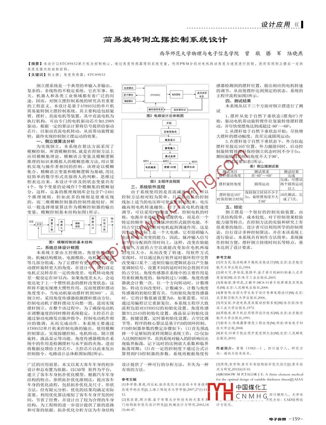 設(shè)計(jì)應(yīng)用《.簡(jiǎn)易旋轉(zhuǎn)倒立擺控制系統(tǒng)設(shè)計(jì)西華師范大學(xué)物理與電子信息學(xué)院曾敬滕軍陸曉燕[摘要]本設(shè)計(jì)以STC89S52單片機(jī)為控制核心,通過(guò)角度傳感器得到系統(tǒng)變量,利用PWM分別對(duì)電機(jī)轉(zhuǎn)動(dòng)角度與速度進(jìn)行控制,進(jìn)而實(shí)現(xiàn)倒立擺在一定的角度范圍內(nèi)的旋轉(zhuǎn)控制。[關(guān)鍵詞]倒立擺;角度傳感器; STC89S52倒立擺系統(tǒng)是一-個(gè)典型的單輸入多輸出、感器檢測(cè)到的擺桿位置,做出相應(yīng)的電機(jī)轉(zhuǎn)速?gòu)?fù)雜的、非線性的不穩(wěn)定系統(tǒng)。它在軍事、航的調(diào)節(jié),從而使擺桿達(dá)到預(yù)定的狀態(tài)。系統(tǒng)的、機(jī)器人和各類(lèi)工業(yè)領(lǐng)域都有著廣泛的用srce9s52。電機(jī)驅(qū)動(dòng)主程序流程如圖3所示。四、測(cè)試結(jié)果的工程意義。本設(shè)計(jì)是基于AT89S52的單片機(jī)本系統(tǒng)從以下三個(gè)方面對(duì)倒立擺進(jìn)行了測(cè)簡(jiǎn)易旋轉(zhuǎn)倒立擺控制系統(tǒng)。其主要構(gòu)造包括旋編碼培測(cè)角度+臂、擺桿、直流電機(jī)等裝置。其中直流電機(jī)為圖2電路設(shè)計(jì)總體框圖1.擺桿從處于自然下垂?fàn)顟B(tài)(擺角0°)開(kāi)執(zhí)行機(jī)構(gòu),可由專(zhuān)門(mén)的電機(jī)驅(qū)動(dòng)芯片如L298N始,驅(qū)動(dòng)電機(jī)帶動(dòng)旋轉(zhuǎn)臂作往復(fù)旋轉(zhuǎn)使擺桿擺L 開(kāi)始驅(qū)動(dòng)。根據(jù)-定的算法計(jì)算將信號(hào)提供給驅(qū)動(dòng)動(dòng),并盡快使擺角達(dá)到或超過(guò)60°~ +60*;芯片,以驅(qū)動(dòng)直流電機(jī)轉(zhuǎn)動(dòng),從而帶動(dòng)旋臂旋系院物始化2. 從擺桿處于自然下垂?fàn)顟B(tài)開(kāi)始,盡快增轉(zhuǎn),最終實(shí)現(xiàn)控制倒立擺運(yùn)動(dòng)的效果。被晶顯示大擺桿的擺動(dòng)幅度,真至完成圓周運(yùn)動(dòng): 8。I、倒立接算法分析擺桿至接近165"位置,外力撤除同時(shí),啟動(dòng)控.鍵盤(pán)輸入模糊控制。所謂模糊控制。就是在控制方法上制施車(chē)壁體理?xiàng)U保持倒?fàn)钐珪r(shí)間不小平5S.應(yīng)用模糊集理論、模糊語(yǔ)言變量及模糊邏輯「 噴式選擇推理的知識(shí)來(lái)模擬人的模糊思維方法,用計(jì)算EYs測(cè)試結(jié)果如表1所示機(jī)實(shí)現(xiàn)與操作者相同的控制。該理論以模糊電機(jī)減速撐臂>80度1「團(tuán)周運(yùn)動(dòng)1測(cè)試結(jié)果如表1倒立擺測(cè)試表集合、模糊語(yǔ)言變量和模糊邏輯為基礎(chǔ),用比測(cè)試項(xiàng)且測(cè)試要求測(cè)試結(jié)果口較簡(jiǎn)單的數(shù)學(xué)形式直接將人的判斷、思維過(guò)擺桿擺動(dòng)角度在-60°~+60完成,可擺動(dòng)程表達(dá)出來(lái)。本設(shè)計(jì)中涉及的狀態(tài)變量共有圖3主程序流程圖擺桿旋轉(zhuǎn)角度圓周運(yùn)動(dòng)兩個(gè)圓周運(yùn)動(dòng)4個(gè),每個(gè)變量的論域作7個(gè)模糊集的模糊劃三、系統(tǒng)軟件流程分,這樣,完備的推理規(guī)則庫(kù)會(huì)包含7=2401由于系統(tǒng)使用的是直流減速電機(jī),所以「 保持倒立時(shí)間不少于個(gè)推理規(guī)則,但如此多的規(guī)則是很難實(shí)現(xiàn)控制方法相對(duì)較為簡(jiǎn)單,只需給電機(jī)的控制擺桿接近165°5s, 旋轉(zhuǎn)臂角度不大10次測(cè)試,完時(shí)保持倒立時(shí)間成了7次。的,而二維模糊控制器的控制性能較好,所線加上適當(dāng)?shù)碾妷杭纯墒闺姍C(jī)轉(zhuǎn)動(dòng)起來(lái),電壓于90° .以一般選擇增量算法作為模糊控制器的輸出越高則電機(jī)轉(zhuǎn)速越快。對(duì)于直流電機(jī)的速度五、結(jié)論變量,模糊控制基本結(jié)構(gòu)如圖1所示。調(diào)節(jié),可以采用PWM調(diào)速方法??刂齐姍C(jī)的時(shí)倒立擺是一個(gè)很好的控制實(shí)驗(yàn)裝置,由候,電源并非連續(xù)的向電源供電,而是在一于其結(jié)構(gòu)簡(jiǎn)單、成本較低、對(duì)于控制效果檢驗(yàn)特定的頻率下以方波脈沖的形式提供電能。能力強(qiáng)等特點(diǎn),在控制方法的實(shí)驗(yàn)和研究上有同占空比的方波能對(duì)電機(jī)起到調(diào)速作用。這是很 重要的地位。設(shè)計(jì)者可以利用所學(xué)的控制理因?yàn)殡姍C(jī)實(shí)際上是一個(gè)大電感,它有阻礙輸入論,自行設(shè)計(jì)多種控制算法,并在本該系統(tǒng).上電流和電壓突變的能力。因此,脈沖輸入信號(hào)進(jìn)行驗(yàn)證。 本系統(tǒng)具有制作方法簡(jiǎn)單,系統(tǒng)操圖1模糊控制的基本結(jié)構(gòu)被平均分配到作用時(shí)間上,這樣,改變?cè)谑寄茏骺刂品?便,擺桿倒立持續(xù)時(shí)間長(zhǎng)等特點(diǎn),基二、系統(tǒng)總體設(shè)計(jì)框圖端輸入方波的占空比就能改變加在電機(jī)兩端本達(dá)到了設(shè)計(jì)要求。本系統(tǒng)主要由主控模塊、角度傳感器模的電壓大小, 從而改變了轉(zhuǎn)速。用軟件方式塊、機(jī)械結(jié)構(gòu)模塊、電源模塊、電機(jī)驅(qū)動(dòng)模塊實(shí)現(xiàn)時(shí),可以通過(guò)執(zhí)行軟件延時(shí)循環(huán)程序交替參考文獻(xiàn)等幾部分組成。為了讓擺桿有更大的慣性,帶改變端 口某個(gè)二進(jìn)制位輸出邏輯狀態(tài)以產(chǎn)生脈(川何為民 低功耗單片