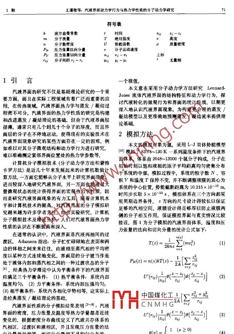 第22卷第l期工程熱物理學(xué)報Vol 22. No. 12001年1月JOURNAL OF ENGINEERING THERMOPHYSICS汽液界面動力學(xué)行為與熱力學(xué)性質(zhì)的分子動力學(xué)研究王遵敬陳民過增元(清華大學(xué)工程力學(xué)系,北京100084)摘要本文采用分子動力學(xué)方法研究了熱平衡條件下的汽液界面的動力學(xué)行為和熱力學(xué)性質(zhì),統(tǒng)計獲得了界面區(qū)的密度、壓力張量及溫度的分布,并且從分子層次觀察分析了界面結(jié)構(gòu)和動力學(xué)特性,研究表明汽液界面是一個隨時間起伏漲落的曲面,界面層的分子并不是處于液相和蒸汽相之間的一種過渡狀態(tài)從汽相到液相密度的連續(xù)變化是長時間的統(tǒng)計結(jié)果,汽液過渡區(qū)的厚度與汽液界面區(qū)的密度漲落的范圍是一致的.對于平衡條件下的汽液界面,由于汽液相變的影響,在緊貼界面處存在一個分子平均動能非平衡分布的區(qū)域,此非平衡區(qū)城的存在與汽液兩相的宏觀熱平衡并不矛盾,但可能對蒸發(fā)/凝結(jié)流率的估計有不可忽略的影響詞汽液界面;動力學(xué)行為;熱力學(xué)性質(zhì);分子動力學(xué)分類號:TK12A文獻標(biāo)識碼:A文章編號:0253-231X(2001)01007004MOLECULAR DYNAMICS STUDY ON THEDYNAMIC BEHABIORS AND THERMODYNAMIC PROPERTIES OF THEIQUID-VAPOR INTERFACEWANG Zun-Jing CHEN Min GUO Zeng-YuanDepartment of Engineering Mechanics, Tsinghua University, Beijing 100084, China)Abstract Dynamic behaviors and thermodynamic properties of liquid-vapor interface at equilibriumare studied with molecular dynamics simulations. The density, the pressure tensor, and the tempeature profiles are obtained. Meanwhile, the structure and the dynamic behavior of the interface areanalyzed from the molecular level. The simulations show that, for the liquid-vapor coexistent systemthere is a local thermal non-equilibrium area close to the liquid surface because of the liquid-vaporphase change, while thermal equilibrium condition is attained outside the interface more than severalmolecules,diameters. In addition, simulation and experiment show that the liquid-vapor interface isa wavy surface undulating with time, and the change of the local density from the liquid to the vaporis abrupt, the continuous density profiles are only statistical results. The thermal non-equilibriumdistribution through the interface region is caused by the energy transport between the liquid andthe vapor phase. For the reason of the small size of the non-uniform temperature area, the existenceof the local non-equilibrium area does not confict with the macroscopic thermal equilibrium theoryHowever, the thermal non-equilibrium distrib中國煤化工 vapor phase change andhave eHect on the estimation of evaporation/CNMHGKey words liquid-vapor interface; dynamic benavior; chiermuuynauut properties; molecular dynamics收稿日期:2000-1-07;修訂日期:2000-11-14基金項目:國家自然科學(xué)基金資助項目(No59876016);清華大學(xué)基礎(chǔ)研究基金資助項目(NoC1990389國家高技術(shù)航天領(lǐng)域基金卡者稠介望數(shù)54支,古林松取人博士研究生,主要從事傳熱傳質(zhì)現(xiàn)象的分子動力學(xué)研究1期王遵敬等:汽液界面動力學(xué)行為與熱力學(xué)性質(zhì)的分子動力學(xué)研究71符號表h玻爾茲曼常數(shù)m分子質(zhì)量T絕對溫度高度n分子數(shù)密度U勢能函數(shù)質(zhì)量密度PN壓力張量法向分量u分子運動速度Pr壓力張量切向分量ri分子間距r;-r;個極值汽液界面的研究不僅是基礎(chǔ)理論研究的一個重本文意在采用分子動力學(xué)方法研究 Lennard要方面,而且在實際工程領(lǐng)域有著廣泛而重要的應(yīng)Jones流體汽液界面的結(jié)構(gòu)特征和動力學(xué)行為,探用.在傳熱領(lǐng)域,汽液界面熱力學(xué)與蒸發(fā)/凝結(jié)過討汽液轉(zhuǎn)化的微觀行為和界面的統(tǒng)計性質(zhì),以期更程密不可分.汽液界面的熱力學(xué)性質(zhì)的研究是構(gòu)建深入地認識汽液界面現(xiàn)象,為構(gòu)建更合理的蒸發(fā)/和改進蒸發(fā)/凝結(jié)理論的基礎(chǔ)。但由于汽液界面層凝結(jié)模型以及更準(zhǔn)確地預(yù)測蒸發(fā)/凝結(jié)流率提供理很薄,通常只有幾個到幾十個分子的厚度,而且界論基礎(chǔ)面層的分子在不停地運動,使得現(xiàn)有的實驗技術(shù)在2模擬方法汽液界面現(xiàn)象研究的某些方面存在一定的困難,例本文的模擬對象為氬,采用LJ雙體勢能模型如難以對其分子微觀結(jié)構(gòu)和動力學(xué)行為進行研究,[o模擬了8378~130K一系列溫度條件下的汽液界難以準(zhǔn)確測定緊鄰界面位置處的熱力學(xué)參數(shù)等面體系。體系由2048~13500個氤分子構(gòu)成,分子在計算機分子模擬技術(shù)(分子動力學(xué)方法和蒙特初始時刻以飽和液相的原子平均距離均勻密集分布卡羅方法)是近幾十年來發(fā)展起來的計算機數(shù)值計于系統(tǒng)的中部.模擬過程中,系統(tǒng)的粒子數(shù)N、容算方法,一方面它能夠從分子水平上研究界面現(xiàn)象進而較深入地研究汽液界面,另一方面也能通過大積v和溫度T保持不變,并不斷調(diào)整液膜的質(zhì)心為系統(tǒng)的中心位置.勢能截斷距離為10.215×10-10m量微觀狀態(tài)的統(tǒng)計獲得界面的宏觀熱力學(xué)性質(zhì),因時間步長取5×10~15s.模擬體系在三個方向都采而是研究汽液界面現(xiàn)象的有力工具。隨著計算機水平和計算機技術(shù)的提高,對汽液界面的分子模擬研用周期邊界條件。z方向的尺寸設(shè)計得較長以保證究越來越為許