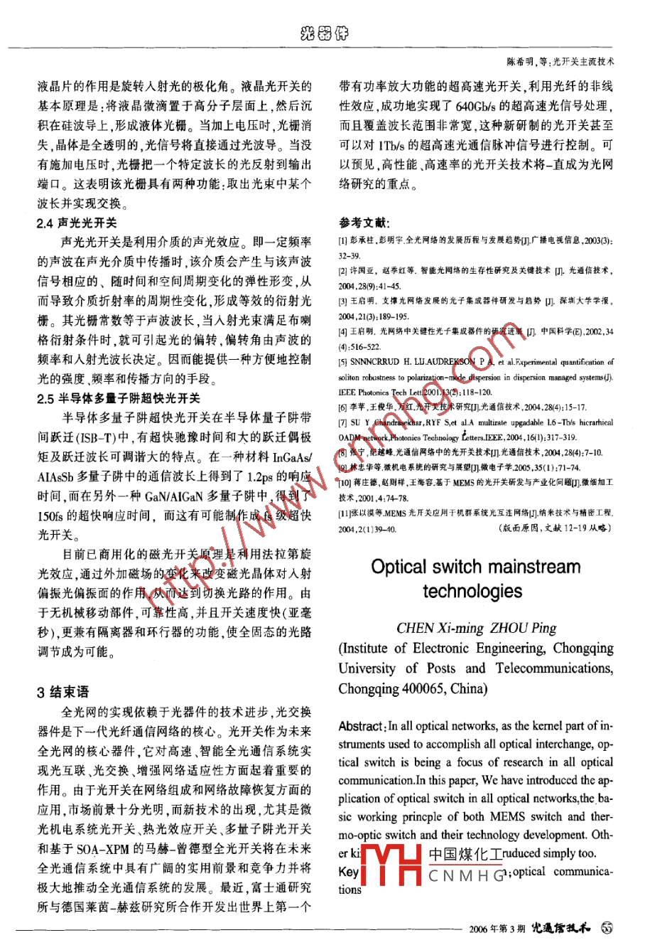 光器件中文核心期刊光開關(guān)主流技術(shù)陳希明,周平(重慶郵電學(xué)院光電工程學(xué)院,重慶400065)摘要:光開關(guān)是光網(wǎng)絡(luò)中完成全光交換的核心器件,關(guān)主要采用硅微加工技術(shù)將開關(guān)集成在單片硅基底它的研究日益成為全光通信領(lǐng)域關(guān)注的焦點(diǎn)。文章重上并能構(gòu)成大規(guī)模矩陣陣列。另外,此類開關(guān)批量生點(diǎn)介紹了光開關(guān)在全光網(wǎng)絡(luò)中的應(yīng)用、MEMS光開關(guān)和.產(chǎn)時(shí)成本較低,在開關(guān)損耗、串?dāng)_消光比、開關(guān)尺寸熱光開關(guān)的基本工作原理及兩種光開關(guān)技術(shù)的進(jìn)展,等性能方面優(yōu)勢明顯,是光開關(guān)的較佳選擇。并就其他光開關(guān)作了簡要介紹。2.1微電子機(jī)械系統(tǒng)(MEMS -micro- electro-me-關(guān)鍵詞:全光網(wǎng)絡(luò);光開關(guān);光通信chanical- systems)中圉分類號(hào):TN929.11文獻(xiàn)標(biāo)志碼:AMEMS是通過微制造技術(shù)將微型機(jī)械元件、微型傳感器、微型執(zhí)行器和信號(hào)處理及控制電路等在普通1前言硅基底上集成。我國的MEMS研究始于1989年,經(jīng)過全光網(wǎng)絡(luò)是指上、下載的業(yè)務(wù)信號(hào)及交換過程均十幾年的發(fā)展,在多種微型傳感器、微執(zhí)行器和若干以光波的形式進(jìn)行,沒有任何的光電及電光轉(zhuǎn)換,全微系統(tǒng)樣機(jī)等方面已有一定的基礎(chǔ)和技術(shù)儲(chǔ)備,開發(fā)部過程都在光域范圍內(nèi)完成1.2。光開關(guān)是按一定要求出了若干小批量、多品種、高質(zhì)量的MEMS器件和系將一個(gè)光通道的光信號(hào)轉(zhuǎn)換到另一個(gè)光通道的器件。統(tǒng),目前已廣泛應(yīng)用于工業(yè)領(lǐng)域!。而MEMS光開關(guān)是光開關(guān)可使光路之間進(jìn)行直接交換,是光網(wǎng)絡(luò)中完成基于半導(dǎo)體微細(xì)加工技術(shù)構(gòu)筑在半導(dǎo)體基片上的微全光交換的核心器件,隨著全光網(wǎng)絡(luò)市場的擴(kuò)大,光鏡陣列,即將電、機(jī)械和光集成為一塊芯片 ,能透明地開關(guān)的研究8益成為全光通信領(lǐng)域關(guān)注的焦點(diǎn)。在全傳送不同速率、不同協(xié)議的業(yè)務(wù)。目前已成為一種最光網(wǎng)絡(luò)中,光開關(guān)可實(shí)現(xiàn)在全光層的路由選擇、波長流行的光開關(guān)制作技術(shù)。其基本原理通過靜電力或電選擇、光交叉連接以及自愈保護(hù)等重要功能,因此光開磁力的作用,使可以活動(dòng)的微鏡產(chǎn)生升降、旋轉(zhuǎn)或移關(guān)是全光通信許多設(shè)備中的關(guān)鍵光器件,其響應(yīng)速動(dòng),從而改變輸人光的傳播方向以實(shí)現(xiàn)光路通斷的功度、串音、插人損耗等性能將直接影響全光通信的質(zhì)能,使任一輸人和輸出端口相連接,且1個(gè)輸出端口量(0。其中光交叉連接設(shè)備(0XC)和光分插復(fù)用設(shè)備在同一時(shí)間只能和1個(gè)輸人端口相連接。與現(xiàn)有的基(OADM)可以說是全光網(wǎng)的核心四。而光開關(guān)和光開關(guān)于光波導(dǎo)技術(shù)的光開關(guān)相比,MEMS光開關(guān)具有低串陣列恰恰是0XC和0ADM的核心技術(shù)。研制全光的音、低插損的優(yōu)點(diǎn)成為全光網(wǎng)絡(luò)中的關(guān)鍵光器件。同交叉連接0XC和分插復(fù)用0ADM設(shè)備,成為建設(shè)大時(shí)它既有機(jī)械光開關(guān)和波導(dǎo)光開關(guān)的優(yōu)點(diǎn),又克服了容量通信干線網(wǎng)絡(luò)十分重要的-環(huán)。光機(jī)械開關(guān)難以集成和擴(kuò)展性差等缺點(diǎn)10-3),它結(jié)構(gòu)全光網(wǎng)絡(luò)中應(yīng)用的光開關(guān)應(yīng)具有快的響應(yīng)速度、緊湊、重量輕,且擴(kuò)展性較好。MEMS光開關(guān)的特性可低的插人損耗、低通道串音、對(duì)偏振不敏感、可集成性概括為1416:低插入損耗;低串?dāng)_;與波長、速率、調(diào)制和可擴(kuò)展性、低成本、低功耗、熱穩(wěn)定性好等特性168。方式無關(guān);功耗低;堅(jiān)固、壽命長;可集成擴(kuò)展成大規(guī)模光開關(guān)矩陣;適中的響應(yīng)速度(開關(guān)時(shí)間從100ns~2光開關(guān)在全光網(wǎng)絡(luò)中的應(yīng)用10ms)。在光交叉連接及需要支持大容最交換的系統(tǒng)當(dāng)前業(yè)已成熟的、且已實(shí)現(xiàn)商品化的微電子機(jī)械中,基于MEMS技術(shù)的解決方案已是主流。光開關(guān)和熱光開關(guān),集中了機(jī)械式光開關(guān)和波導(dǎo)光開MEMS光開關(guān)可以分為二維和三維光開關(guān)。二維關(guān)的優(yōu)點(diǎn),同時(shí)又克服了它們固有的缺點(diǎn)。此類光開光開關(guān)由一種受靜電控制的二維微小鏡面陣列組成,光束在二維空間傳輸.準(zhǔn)直米束和旋轉(zhuǎn)微鏡構(gòu)成多端收稿日期:2005-09 -26?;痦?xiàng)目:重慶郵電學(xué)院凝聚態(tài)物理碩士點(diǎn)和微電子與固體電子學(xué)博口光f YH中國煤化工陣,光開關(guān)具有MxN士點(diǎn)學(xué)科建設(shè)經(jīng)費(fèi)資助。個(gè)簡CNMHG反射鏡具有兩個(gè)狀態(tài)0.作者簡介:陳希明(1964-).男,重慶市人,副教授.主要從事大學(xué)物理教和1(通和斷),當(dāng)光開關(guān)處于1態(tài)時(shí),反射鏡處于由輸學(xué)與光通信研究。2006年第3期光通償技術(shù)5光器件陳希明,等:光開