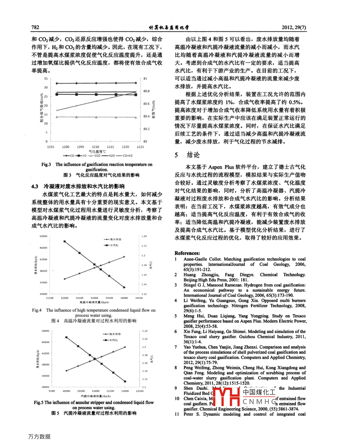 第29卷第7期計(jì)箕蟣易用牝VoL 29. No. 72012年7月28日Computers and Applied ChemistJuly28,2012德士古水煤漿氣化過(guò)程的建模與優(yōu)化分析彭偉鋒,鐘偉民,孔祥東,錢鋒(華東理工大學(xué)化工過(guò)程先進(jìn)控制和優(yōu)化技術(shù)教育部重點(diǎn)實(shí)驗(yàn)室,上海,200237)摘要:根據(jù)德士古水煤漿氣化工藝的操作特性和裝置特點(diǎn),采集實(shí)際工業(yè)運(yùn)行數(shù)據(jù),基于 Aspen Plus軟件平臺(tái),建立了氣化爐和水洗過(guò)程的模型,模擬結(jié)果與實(shí)際生產(chǎn)較吻合。基于所建立的模型,進(jìn)行了水煤漿濃度、氣化反應(yīng)溫度對(duì)氣化結(jié)果的靈敏度分析,并討論了過(guò)程的節(jié)水,分析了高溫汽提冷凝液對(duì)廢水排放與合成氣水汽比的影響。結(jié)果表明:在現(xiàn)有工況下,提高水煤漿濃度和反應(yīng)溫度,有效合成氣收率會(huì)提高;適當(dāng)減少高溫、汽提冷凝液,有利于裝量的廢水排放和提高合成氣水汽比關(guān)鍵詞:德士古;水煤漿氣化; Gibbs自由能;建模與優(yōu)化中圖分類號(hào):TQ0159TP3919;06-39文獻(xiàn)標(biāo)識(shí)碼:A文章編號(hào):100141602012)07-779-7831引言文基于 Aspen Plus軟件平臺(tái),對(duì)原設(shè)計(jì)500噸/天德士古水煤漿氣化反應(yīng)與水洗過(guò)程進(jìn)行了綜合建模,通過(guò)靈敏能源是人類賴以生存及推動(dòng)社會(huì)可持續(xù)發(fā)展的重要度分析考察了水煤漿濃度、氣化反應(yīng)溫度對(duì)整個(gè)氣化系物質(zhì)基礎(chǔ),其中煤是地球上儲(chǔ)藏最豐富的化石燃料中統(tǒng)的影響,以及討論了系統(tǒng)的節(jié)水。國(guó)是世界上煤炭資源較豐富的國(guó)家之一,煤炭?jī)?chǔ)量遠(yuǎn)大于石油和天然氣儲(chǔ)量。2011年煤炭產(chǎn)量達(dá)352億噸,2德士古氣化過(guò)程流程筒述同比增長(zhǎng)87%,居世界首位癟士古水煤漿氣化工藝流程主要包括氣化系統(tǒng)、洗作為一次能源,我國(guó)煤炭直接燃燒約占煤炭總量的80%左右,這樣不僅效率低,而且排放出大量煙塵,滌系統(tǒng)和灰水處理系統(tǒng)。煤漿由煤漿槽經(jīng)煤漿給料泵加氧化硫、氮氧化物等有害氣體,使生態(tài)環(huán)境遑到嚴(yán)重破破壓后與自空分送來(lái)的高壓氧氣按照一定的氧煤比通過(guò)三流式燒嘴進(jìn)入氣化爐,在高溫高壓下反應(yīng)產(chǎn)生合成氣壞。發(fā)展煤氣化技術(shù)是減少環(huán)境污染、實(shí)現(xiàn)煤炭高效潔凈綜合利用的重要措施4。煤中的灰份在高溫下熔融,熔渣與熱合成氣一起離開氣德士古氣化爐是目前最常見的一種氣化爐爐型,是化爐燃燒室,順流向下進(jìn)入氣化爐下段激冷室,被激冷水淬冷后合成氣溫度降低至約223℃。熔渣迅速固化并第二代煤氣化技術(shù)中最成熟、商業(yè)化裝置最多的技術(shù)具有對(duì)煤種適應(yīng)性大、整體熱利用率高、碳的轉(zhuǎn)換率高產(chǎn)生大量蒸汽,被水蒸汽飽和并夾帶少量飛灰的合成氣從激冷室上部出口排出。氣體進(jìn)入文丘里洗滌器與從噴以及產(chǎn)氣品質(zhì)高等優(yōu)點(diǎn)。過(guò)程模擬軟件 Aspen Plus近來(lái)嘴噴出的洗滌水混合后進(jìn)板式碳洗塔,合成氣經(jīng)除塵除被廣泛應(yīng)用于煤氣化的過(guò)程模擬中1。孟輝等基于沫后送至變換工段。由灰水處理來(lái)的高壓灰水及變換工Aspen Plus根據(jù)吉布斯自由能最小化原理建立了 Texaco段送來(lái)的高溫冷凝液和汽提冷凝液作為碳洗塔的洗滌氣化爐模型,研究了水煤漿濃度、氧氣純度等對(duì)氣化爐出口氣體組成和溫度的影響。謝芳等建立了Texa氣水。碳洗塔底排出的黑水經(jīng)流量控制閥排至灰水處理。同時(shí),系統(tǒng)產(chǎn)生的黑水經(jīng)中壓閃蒸器和真空閃蒸器處理,化爐的 Aspen Plus模型,并應(yīng)用 Fortran語(yǔ)言對(duì)非常規(guī)組進(jìn)行部分水的回用分和模型進(jìn)行修正,研究表明(co+H2)含量和氣化爐溫度隨著水煤漿濃度、氧煤比的增加而增加。姚月華等3德士古氣化過(guò)程的建模以 Aspen Plus為模擬工具,對(duì)Shel粉煤氣化爐和德士古水煤漿氣化過(guò)程進(jìn)行了模擬和對(duì)比分析。雖然針對(duì)德士Aspen Plus是世界公認(rèn)的標(biāo)準(zhǔn)大型通用流程模擬軟古氣化爐模型的研究有很多,但是對(duì)于德士古氣化系統(tǒng)件,它具有完善的物性數(shù)據(jù)庫(kù)、熱力學(xué)模型和單元操作包括氣化、水洗、分離)的整體模擬卻并不多見。在模塊,也可以進(jìn)行水煤漿氣化過(guò)程的模擬本文采用我們以前的工作中1,對(duì)工業(yè)多噴嘴水煤漿氣化過(guò)程的實(shí)際水煤漿氣化裝置的工業(yè)運(yùn)行數(shù)據(jù),進(jìn)行了氣化過(guò)程水洗系統(tǒng)進(jìn)行了模擬和優(yōu)化研究,取得了令人滿意的結(jié)的建模。果。為更好地研究整個(gè)德士古氣化系統(tǒng)的運(yùn)行特性,本31組分規(guī)定煤氣化過(guò)程收稿日期:201205-14;修回日期:201206-10基金項(xiàng)目:國(guó)家自然科學(xué)基金項(xiàng)目重點(diǎn)基金U6202);國(guó)家自然科學(xué)基金項(xiàng)目(611748);國(guó)家H牛的復(fù)雜反應(yīng)中國(guó)煤化工CNMHG⊥海市基礎(chǔ)研究重點(diǎn)項(xiàng)目10JC1403500和上海市重點(diǎn)學(xué)科建設(shè)項(xiàng)(B504)資作者簡(jiǎn)介:彭偉鋒(1987-),男,碩士生,主要研究方向?yàn)榛み^(guò)程建