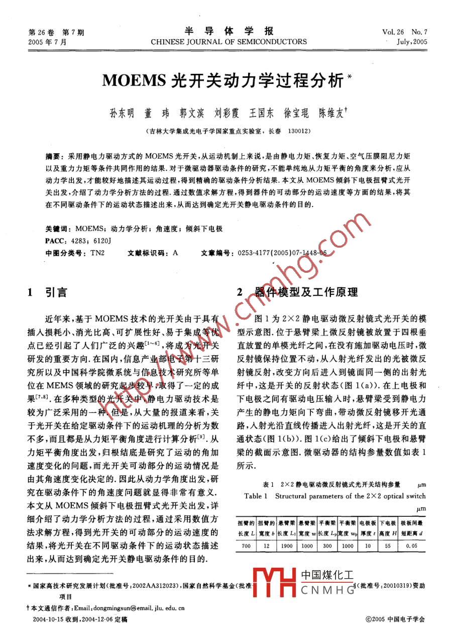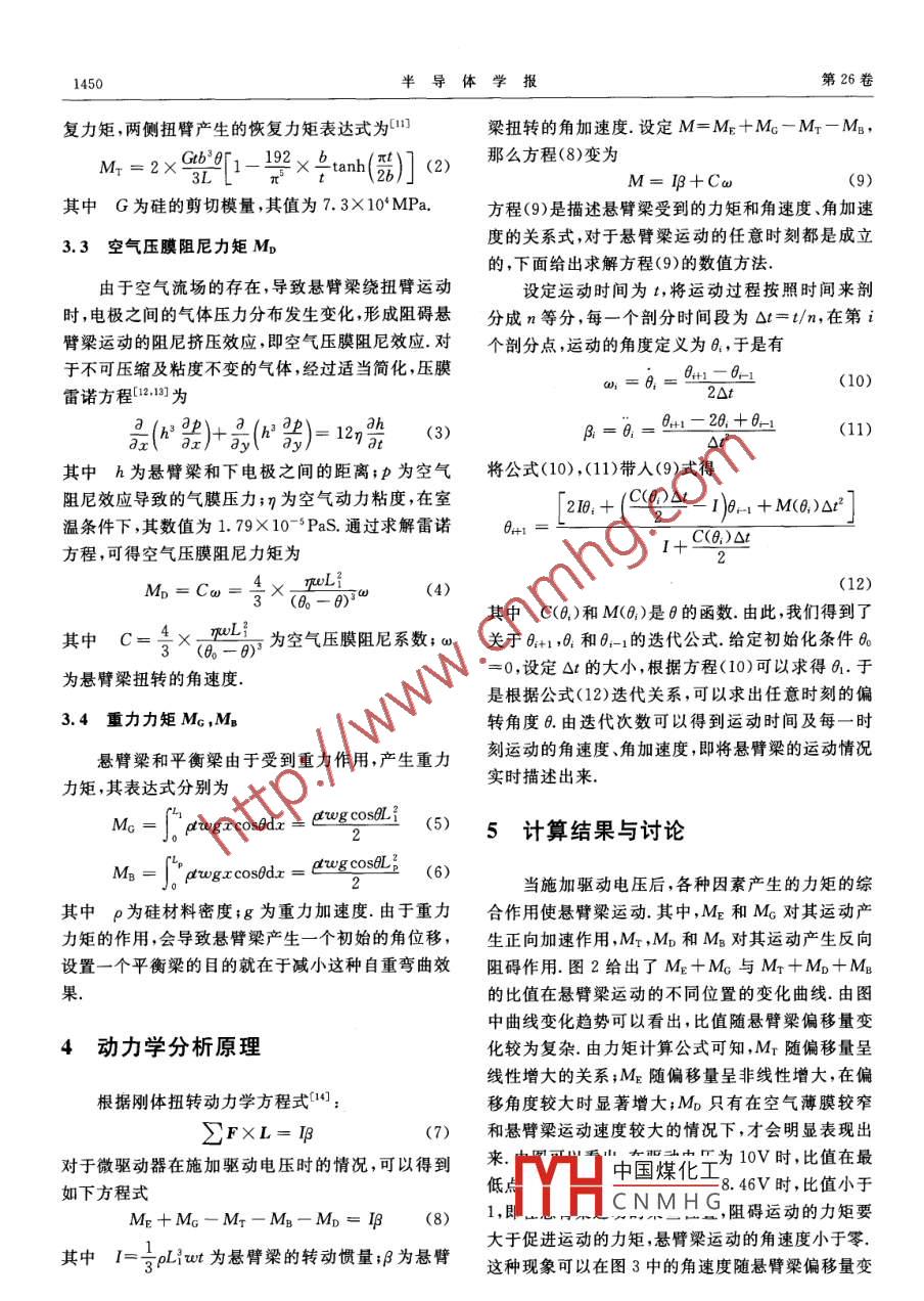 第26卷第7期半導(dǎo)體學(xué)報Vol 26 No. 72005年7月CHINESE JOURNAL OF SEMICONDUCTORSJuly, 2005MOEMS光開關(guān)動力學(xué)過程分析孫東明董瑋郭文濱劉彩霞王國東徐寶琨陳維友′(吉林大學(xué)集成光電子學(xué)國家重點實驗室,長春130012)摘要:采用靜電力驅(qū)動方式的 MOEMS光開關(guān),從運動機制上來說,是由靜電力矩、恢復(fù)力矩、空氣壓膜阻尼力矩以及重力力矩等條件共同作用的結(jié)果.對于微驅(qū)動器驅(qū)動條件的研究,不能單純地從力矩平衡的角度來分析,應(yīng)從動力學(xué)出發(fā),才能較好地描述其運動過程,得到精確的驅(qū)動條件分析結(jié)果本文從 MOEMS傾斜下電極扭臂式光開關(guān)出發(fā),介紹了動力學(xué)分析方法的過程.通過數(shù)值求解方程,得到器件的可動部分的運動速度等方面的結(jié)果,將其在不同驅(qū)動條件下的運動狀態(tài)描述出來,從而達(dá)到確定光開關(guān)靜電驅(qū)動條件的目的關(guān)鍵詞: MOEMS;動力學(xué)分析;角速度;傾斜下電極PACC:4283;6120J中圖分類號:TN2文獻(xiàn)標(biāo)識碼:A文章編號:0253-4177(2005)07-1448-061引言2器件模型及工作原理近年來,基于 MOEMS技術(shù)的光開關(guān)由于具有圖1為2×2靜電驅(qū)動微反射鏡式光開關(guān)的模插入損耗小、消光比髙、可擴展性好、易于集成等優(yōu)型示意圖.位于懸臂梁上微反射鏡被放置于四根垂點已經(jīng)引起了人們廣泛的興趣~6,將成為光開關(guān)直放置的單模光纖之間,在沒有施加驅(qū)動電壓時,微研發(fā)的重要方向.在國內(nèi),信息產(chǎn)業(yè)部電子第十三研反射鏡保持位置不動,從入射光纖發(fā)出的光被微反究所以及中國科學(xué)院微系統(tǒng)與信息技術(shù)研究所等單射鏡反射,改變方向后進(jìn)入到鏡面同一側(cè)的出射光位在MEMS領(lǐng)域的研究起步較早,取得了一定的成纖中,這是開關(guān)的反射狀態(tài)(圖1(a)在上電極和果(.在多種類型的光開關(guān)中,靜電力驅(qū)動技術(shù)是下電極之間有驅(qū)動電壓輸入時,懸臂梁受到靜電力較為廣泛采用的一種.但是,從大量的報道來看,關(guān)產(chǎn)生的靜電力矩向下彎曲,帶動微反射鏡移開光通于光開關(guān)在給定驅(qū)動條件下的運動機理的分析為數(shù)路,入射光沿直線傳播進(jìn)入出射光纖,這是開關(guān)的直不多,而且都是從力矩平衡角度進(jìn)行計算分析.從通狀態(tài)(圖1(b).圖1(c)給出了傾斜下電極和懸臂力矩平衡角度出發(fā),歸根結(jié)底是研究了運動的角加梁的截面示意圖微驅(qū)動器的結(jié)構(gòu)參量數(shù)值如表1速度變化的問題,而光開關(guān)可動部分的運動情況是所示由其角速度變化決定的.因此從動力學(xué)角度出發(fā),研表12×2靜電驅(qū)動微反射鏡式光開關(guān)結(jié)構(gòu)參量究在驅(qū)動條件下的角速度問題就顯得非常有意義Table 1 Structural parameters of the 2X2 optical switch本文從 MOEMS傾斜下電極扭臂式光開關(guān)出發(fā),詳細(xì)介紹了動力學(xué)分析方法的過程,通過采用數(shù)值方臂的扭臂的懸臂果懸臀平衡果平衡果電極板下電極極板間最法求解方程,得到光開關(guān)的可動部分的運動速度的長度寬度b長度L寬度四長度L寬度叫厚度!高度H短距離d結(jié)果將光開關(guān)在不同驅(qū)動條件下的運動狀態(tài)描述7012194101040150出來,從而達(dá)到確定光開關(guān)靜電驅(qū)動條件的目的H中國煤化工國家高技術(shù)研究發(fā)展計劃(批準(zhǔn)號:2002AA312023),國家自然科學(xué)基金(批準(zhǔn)CNMH(批準(zhǔn)號:20010319)資助↑本文通信作者:Email:dongmingsuni@emal.jlu.edu.cn2004-10-15收到,2004-1206定稿⊙2005中國電子學(xué)會第7期孫東明等: MOEMS光開關(guān)動力學(xué)過程分析1449Torsion beam Cantilever beamInsulating layerFiber collimatorMicromirrorLower electrodeTorsion beam Cantilever beamBalance beamactualFiber collimatorMicromirrorLower electrode圖12×2靜電驅(qū)動微反射鏡式光開關(guān)的模型示意圖(a)反射狀態(tài);(b)傳輸狀態(tài);(c)xz平面上的下電極和懸臂梁Fig 1 Sketch diagrams of a 2 X 2 optical switch with electrostatic actuating (a) Reflection state;(b)Transmission state; (c) Lower electrode and cantilever beam in the xz plane3力矩的分析公式2(6-0)L1sin(60-0)在動力學(xué)分析過程中,有四種力矩對懸臂梁的d+ly sin(eo-8運動發(fā)生作用,即靜電力矩M、扭臂的恢復(fù)力矩其中B-、/Mr、上下電極間的空氣壓膜阻尼力矩MD和懸臂(2)為下電極傾斜的角度;0為梁、平衡梁的重力力矩M、M.下面分別給出力矩懸臂梁在施加驅(qū)動電壓后的扭轉(zhuǎn)角度;eo為真空介的表達(dá)式電常護(hù);V為施加的驅(qū)動中國煤化工電壓3.1靜電力矩MECNMHG3.2恢復(fù)力矩Mr在外加驅(qū)動電壓的條件下,懸臂梁受到靜電力矩作用,其表達(dá)式為10于懸臂梁的運動使得扭臂扭轉(zhuǎn)變形,產(chǎn)生恢1450半導(dǎo)體學(xué)報第26卷復(fù)力矩,兩側(cè)扭臂產(chǎn)生的恢復(fù)力矩表達(dá)式為1梁扭轉(zhuǎn)的角加速度.設(shè)定M=M+M-M-MBMr=2×Gibe1-192×ba(2b)(2)那么方程(8)變?yōu)镸=Ip+ Ca其中G為硅的剪切模量,其值為7.3×10MPa.方程(9)是描述懸臂梁受到的力矩和角速度、角加速3.3空氣壓膜阻尼力矩M度的關(guān)系式,對于懸臂梁運動的任意時刻都是成立的,下面給出求解方程(9)的數(shù)值方法由于空氣流場的存在,導(dǎo)致懸臂梁繞扭臂運動設(shè)定運動時間為t,將運動過程
