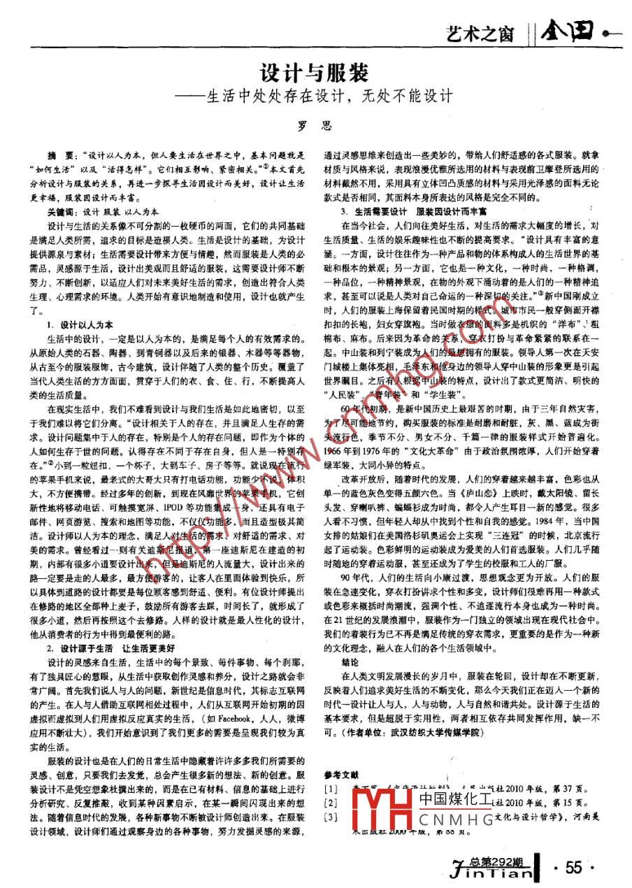 藝術(shù)之窗全田。設(shè)計(jì)與服裝一-生活中處處存在設(shè)計(jì),無(wú)處不能設(shè)計(jì)羅思摘要:“設(shè)計(jì)以人為本,但人要生活在世界之中,基本問(wèn)題就是通過(guò)靈感思維來(lái)創(chuàng)造 出一些美妙的, 帶給人們舒適感的各式服裝。就拿“如何生活”以及“活得怎樣"。它們相互影響、緊密相關(guān)?!彼谋疚氖紫炔馁|(zhì) 與鳳格來(lái)說(shuō),表現(xiàn)浪漫優(yōu)雅所選用的材料與表現(xiàn)前衛(wèi)摩登所選用的分析設(shè)計(jì)與服裝的關(guān)系,再進(jìn)一步探尋生活因設(shè)計(jì)而美好,設(shè)計(jì)讓生活材料截然不用,采用具有立體凹凸質(zhì)感的材料與采用光澤感的面料無(wú)論更幸福,服裝固設(shè)計(jì)而豐富??钍绞欠裣嗤?,其面料本身所表達(dá)的風(fēng)格是完全不同的。關(guān)鍵詞:設(shè)計(jì)服裝以人為本.3. 生活需要設(shè)計(jì) 服裝因設(shè)計(jì)而豐富設(shè)計(jì)與生活的關(guān)系像不可分割的一枚硬幣的兩面,它們的共同基礎(chǔ)在當(dāng)今社會(huì),人們向往美好生活,對(duì)生活的需求大幅度的增長(zhǎng),對(duì)是滿足人類所需,追求的目標(biāo)是造福人類。生活是設(shè)計(jì)的基礎(chǔ),為設(shè)計(jì)生活質(zhì)量、 生活的娛樂(lè)趣味性也不斷的提高要求。" 設(shè)計(jì)具有豐富的意提供源泉與素材;生活需要設(shè)計(jì)帶來(lái)方便與情趣,然而服裝是人類的必涵。一方面,設(shè)計(jì)往往作為-種產(chǎn)品和物的體系構(gòu)成人的生活世界的基需品,靈感源于生活,設(shè)計(jì)出美觀而且舒適的服裝,這需要設(shè)計(jì)師不斷礎(chǔ)和根本的最觀; 另-方面,它也是一種文化,一種時(shí)尚,-種格調(diào),努力、不斷創(chuàng)新,以適應(yīng)人們對(duì)未來(lái)美好生活的需求,創(chuàng)造出符合人類- 種品位,-種精神最觀,在物的外觀下涌動(dòng)著的是人們的一-種精神追生理、心理需求的環(huán)境。人類開(kāi)始有意識(shí)地制造和使用,設(shè)計(jì)也就產(chǎn)生求,甚至可以說(shuō)是人類對(duì)自己命運(yùn)的一種深切的關(guān)注?!盿新中國(guó)剛成立時(shí),人們的服裝上海保留著民國(guó)時(shí)期的樣式。城市市民-般穿側(cè)面開(kāi)襟1.設(shè)計(jì)以人為本扣扣的長(zhǎng)袍,婦女穿旗袍。當(dāng)時(shí)做衣服的面料多是機(jī)織的“洋布”、粗生活中的設(shè)計(jì),一定是以人為本的,是滿足每個(gè)人的有效需求的。棉布、麻布。后來(lái)因?yàn)楦锩年P(guān)系,穿衣打扮與革命緊緊的聯(lián)系在一從原始人類的石器、陶器、到青銅器以及后來(lái)的銀器、木器等等器物,起。 中山裝和列寧裝成為人們的最想擁有的服裝。領(lǐng)導(dǎo)人第-次在天安從古至今的服裝服飾,古今建筑,設(shè)計(jì)伴隨了人類的整個(gè)歷史。覆蓋了門(mén)城樓.上集體亮相,毛澤東和他身邊的領(lǐng)導(dǎo)人穿中山裝的形象更是引起當(dāng)代人類生活的方方面面,貫穿于人們的衣、食、住、行,不斷提高人世界關(guān)目。 之后有人根據(jù)中山裝的特點(diǎn),設(shè)計(jì)出了款式更簡(jiǎn)潔、明快的類的生活質(zhì)量?!叭嗣裱b”.“青年裝"和“學(xué)生裝”。在現(xiàn)實(shí)生活中,我們不難看到設(shè)計(jì)與我們生活是如此地密切,以至60年代初期,是新中國(guó)歷史上最艱苦的時(shí)期,由于三年自然災(zāi)害,于我們難以將它們分離?!霸O(shè)計(jì)相關(guān)于人的存在,并且滿足人生存的需為 了盡可能地節(jié)約,購(gòu)買(mǎi)服裝的標(biāo)準(zhǔn)是耐麝和耐臟,灰、黑、藍(lán)成為街求。設(shè)計(jì)問(wèn)題集中于人的存在,特別是個(gè)人的存在問(wèn)題,即作為個(gè)體的頭流行色,季節(jié)不分、男女不分、千篇一律的服裝樣式開(kāi)始普遍化。人如何生存于世的問(wèn)題。認(rèn)得存在不同于存在自身,但人是一特別存1966年到1976年的“文化大革命”由于政治氛圍濃厚,人們開(kāi)始穿著在?!彼男〉?粒紐扣,一個(gè)杯子,大到車(chē)子、房子等等。就說(shuō)現(xiàn)在流行綠軍裝, 大同小異的特點(diǎn)。的蘋(píng)果手機(jī)來(lái)說(shuō),最老式的大哥大只有打電話功能,功能少不說(shuō),體積改革開(kāi)放后,隨著時(shí)代的發(fā)展,人們的穿著越來(lái)越豐富,色彩也從大,不方便攜帶。經(jīng)過(guò)多年的創(chuàng)新,到現(xiàn)在風(fēng)靡世界的蘋(píng)果手機(jī),它創(chuàng)單- - 的藍(lán)色灰色變得五顏六色。當(dāng)《廬山戀》上映時(shí),戴太陽(yáng)鏡、留長(zhǎng)新性地將移動(dòng)電話、可觸摸寬屏、IPOD 等功能集成一一身,還具有電子頭發(fā)、穿喇叭褲、蝙蝠衫成為時(shí)尚,都令人產(chǎn)生耳目一新的感覺(jué)。很多郵件、網(wǎng)頁(yè)游覽、搜索和地圖等功能,不僅僅功能多,而且造型極其簡(jiǎn)人看不習(xí)慣,但年輕人卻從中找到個(gè)性和自我的感覺(jué)。1984 年,當(dāng)中國(guó)潔。設(shè)計(jì)師以人為本的理念,滿足人對(duì)生活的需求、對(duì)舒適的需求、對(duì)女 排的姑娘們?cè)诿绹?guó)洛杉磯奧運(yùn)會(huì)上實(shí)現(xiàn)“三連冠”的時(shí)候,北京流行美的需求。曾經(jīng)看過(guò)一則有關(guān)迪斯尼報(bào)道,第-座迪斯尼在建造的初起了運(yùn)動(dòng)裝。色彩鮮明的運(yùn)動(dòng)裝成為
