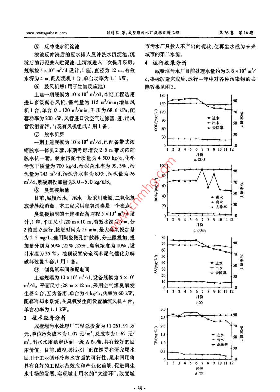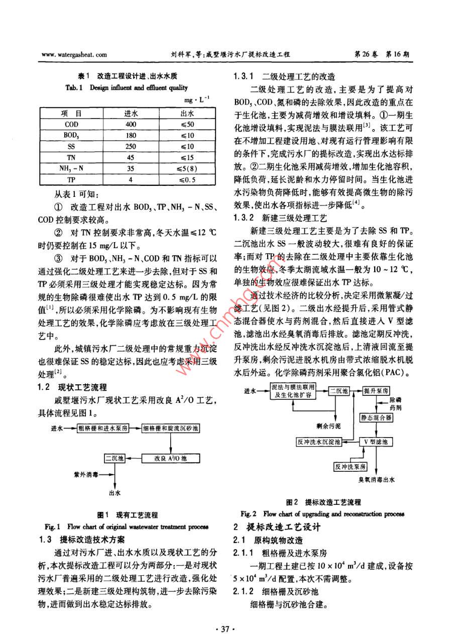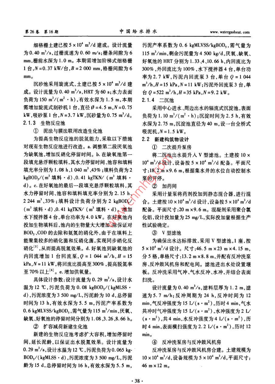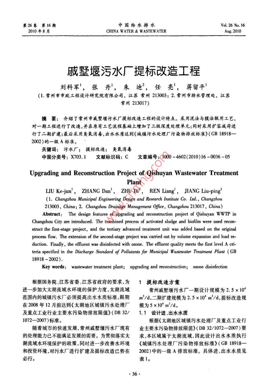 第26卷第16期中國(guó)給水排水Vo.26No.162010年8月CHINA WATER WASTEWATERAug.2010戚墅堰污水廠提標(biāo)改造工程劉科軍,張丹,朱迪2,任亮,蔣留平1(1.常州市市政工程設(shè)計(jì)研究院有限公司,江蘇常州213003;2.常州市排水管理處,江蘇常州213017)摘要:介紹了常州市戚墅堰污水廠提標(biāo)改造工程的設(shè)計(jì)特點(diǎn)。采用泥法與膜法聯(lián)用工藝,對(duì)一期工程進(jìn)行了改造,并在原有工藝流程基礎(chǔ)上增加了三級(jí)深度處理單元;同時(shí)采用擴(kuò)容減荷進(jìn)行了二期擴(kuò)建;最后釆用臭氧消毒,出水水質(zhì)達(dá)到《城鎮(zhèn)污水處理廠污染物排放標(biāo)準(zhǔn)》(GB189182002)的一級(jí)A標(biāo)準(zhǔn)。關(guān)鍵詞:污水廠;提標(biāo)改造;臭氧消毒中圖分類號(hào):X703.1文獻(xiàn)標(biāo)識(shí)碼:C文章編號(hào):1000-4602(2010)16-0036-05Upgrading and reconstruction Project of Qishuyan wastewater TreatmentPlanLIU Ke-jun, ZHANG Dan, ZHU Di, REN Liang, JIANG Liu-ping(1. Changzhou Municipal Engineering Design and Research Institute Co. Ltd, Changzhou213003, China; 2. Changzhou Drainage Management Office, Changzhou 213017, China)Abstract: The design features of upgrading and reconstruction project of Qishuyan WWTP inChangzhou City are introduced. The combined process of activated sludge and biofilm were used recon-struct the first-stage project, and the tertiary advanced treatment unit was added based on the originalprocess flow. The extension of the second-stage project was carried out by volume expansion and load re-duction. Finally, the effluent was disinfected with ozone. The effluent quality meets the first level A cnteria specified in the Discharge Standard of Pollutants for Municipal Wastewater Treatment(GB18918-2002)Key words: wastewater treatment plant; upgrading and reconstruction; ozone disinfection根據(jù)國(guó)務(wù)院江蘇省委江蘇省政府的要求,為1提標(biāo)改造方案進(jìn)一步加大太湖流域水環(huán)境的保護(hù)力度,太湖流域常州戚墅堰污水廠一期設(shè)計(jì)規(guī)模為25×104范圍內(nèi)的城鎮(zhèn)污水廠必須提高出水水質(zhì)標(biāo)準(zhǔn)限期m3/d,二期擴(kuò)建規(guī)模為2.5×104m3/d,提標(biāo)改造規(guī)在2008年12月前達(dá)到《太湖地區(qū)城鎮(zhèn)污水處理廠模為5×104m3/d及重點(diǎn)工業(yè)行業(yè)主要水污染物排放限值》(DB32/1.1設(shè)計(jì)進(jìn)出水水質(zhì)1072-2007)標(biāo)準(zhǔn)。根據(jù)《太湖地區(qū)城鎮(zhèn)污水處理廠及重點(diǎn)工業(yè)行隨著城市的快速發(fā)展,常州戚墅堰污水廠現(xiàn)有業(yè)主要水污染物排放限值》(DB32/1072-2007)要的處理能力已不能滿足發(fā)展的需要。為貫徹落實(shí)太求,本區(qū)域?qū)儆谔饔?因此設(shè)計(jì)出水水質(zhì)執(zhí)行湖流域水環(huán)境保護(hù)的政策,同時(shí)進(jìn)一步改善水環(huán)境《城鎮(zhèn)污水處理廠污染物排放標(biāo)準(zhǔn)》(GB18918和投資環(huán)境對(duì)污水廠進(jìn)行擴(kuò)建及提標(biāo)改造已勢(shì)在2002)中的一級(jí)A排放標(biāo)準(zhǔn)。具體進(jìn)、出水水質(zhì)見表1。www.walergasheat.com劉科軍,等:戚墅堰污水廠提標(biāo)改造工程第26卷第16期表1改造工程設(shè)計(jì)進(jìn)、出水水質(zhì)1.3.1二級(jí)處理工藝的改造ab. 1 Design influent and efluent quality二級(jí)處理工藝的改造,主要是為了提高對(duì)BOD3COD、氮和磷的去除效果,因此改造的重點(diǎn)在進(jìn)水出水于生化池,主要為減荷增效和增設(shè)填料。①一期生50四sCO化池增設(shè)填料,實(shí)現(xiàn)泥法與膜法聯(lián)用。該工藝可在不增加工程建設(shè)用地、對(duì)現(xiàn)有運(yùn)行管理影響有限15的條件下,完成污水廠的提標(biāo)改造,實(shí)現(xiàn)出水達(dá)標(biāo)排NH-N≤5(8)放。②二期生化池釆用減荷增效,增加生化池容積,≤0.5降低負(fù)荷,延長(zhǎng)泥齡和水力停留時(shí)間。當(dāng)生化池進(jìn)從表1可知:水污染物負(fù)荷降低時(shí),能夠有效提高微生物的除污①改造工程對(duì)出水BOD3TP、NH2-N,S、效果使出水各項(xiàng)指標(biāo)進(jìn)一步降低。cOD控制要求較高。1.3.2新建三級(jí)處理工藝②對(duì)TN控制要求非常高,冬天水溫≤12℃新建三級(jí)處理工藝主要是為了去除SS和TP時(shí)仍要控制在15mgL以下。二沉池出水SS一般波動(dòng)較大,很難有良好的保證③對(duì)于BOD3NH2-NCOD和TN指標(biāo)可以率;而對(duì)TP的去除在二級(jí)處理中主要依幕生化池通過強(qiáng)化二級(jí)處理工藝來進(jìn)一步去除但對(duì)于SS和的生物效應(yīng)冬季太湖流域水溫一般為10-12℃,TP必須采用三級(jí)處理才能實(shí)現(xiàn)穩(wěn)定達(dá)標(biāo)。因?yàn)槌为?dú)的生物效應(yīng)很難保證出水TP達(dá)標(biāo)。規(guī)的生物除磷很難使出水TP達(dá)到0.5mg/L的限通過技術(shù)經(jīng)濟(jì)的比較分析決定采用微絮凝/過值,所以必須采用化學(xué)除磷。為不影響現(xiàn)有生物濾工藝(見圖2)。二級(jí)出水經(jīng)提升后采用管式靜處理工藝的效果化學(xué)除磷應(yīng)考慮放在三級(jí)處理工態(tài)混合器使水與藥劑混合然后直接進(jìn)入Ⅴ型濾藝中。池濾池出水經(jīng)臭氧消毒后排放。濾池定期反沖洗此外,城鎮(zhèn)污水廠二級(jí)處理中的常規(guī)重力沉淀反沖洗出水經(jīng)反沖洗水沉淀池后,上清液回流至提也很難保證SS的穩(wěn)定達(dá)標(biāo)因此也應(yīng)考慮采用三級(jí)升泵
