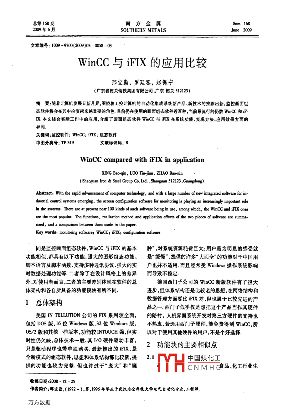 總第168期南方金屬2009年6月SOUTHERN METALS章編號(hào):1009-9700(2009)03-0058-03Wincc與iFX的應(yīng)用比較邢寶勤,羅廷鑒,趙保寧(廣東省韶關(guān)鋼鐵集團(tuán)有限公司廣東韶關(guān)512123)要:隨著計(jì)算機(jī)發(fā)展日新月異圍繞著工控計(jì)算機(jī)的自動(dòng)化集成系統(tǒng)新產(chǎn)品新技術(shù)的推陳出新,監(jiān)控畫面組態(tài)軟件將會(huì)在其中扮演越來越重要的角色目前仍在使用的畫面組態(tài)軟件近百種當(dāng)前最流行的仍數(shù)WnCC和Ⅸ本文結(jié)合實(shí)際工作中的應(yīng)用,介紹了畫面組態(tài)軟件 WinCC與X在系統(tǒng)功能實(shí)現(xiàn)方法、應(yīng)用效果方面的異同關(guān)鍵詞:監(jiān)控軟件; WinCC;iX;組態(tài)軟件中圖分類號(hào):TP319文獻(xiàn)標(biāo)識(shí)碼:BWinCC compared with iFIX in applicationXING Bao-qin, LUO Tin- jian, ZHAO Bao-ninShaoguan Iron Steel Group Co Ltd. Shaoguan 512123, Guangdong)Abstract: With the rapid advancement of computer technology, and with a large number of new integrated software for in-dustrial control systems emerging, the screen configuration software for monitoring is playing an increasingly importantin the systems. There are at present near 100 kinds of such software being in use, among which, theFIX onesare the most popular. The functions, realization method and application effects ofof software are summa.rized, and a comparison between them made in the paper.Key words: monitoring software: WinCC; iFIX; configuration software同是監(jiān)控畫面組態(tài)軟件,WnCC與iFⅨX的基本腫”對(duì)系統(tǒng)資源耗費(fèi)巨大:用戶最為明顯的感受就功能相似都具有以下功能:強(qiáng)大的圖形組態(tài)功能、是“緩慢”提供的許多“大而全”的功能對(duì)于中國(guó)用腳本語言及腳本函數(shù)、支持多種通訊協(xié)議、強(qiáng)大的實(shí)戶也并不適用而且經(jīng)常受 Windows操作系統(tǒng)影響時(shí)數(shù)據(jù)處理功能等.二者除了在設(shè)計(jì)風(fēng)格上的差異而導(dǎo)致不穩(wěn)定外,對(duì)使用者而言,二者的主要差別體現(xiàn)在軟件的總德國(guó)西門子公司的WnCC新版軟件有了很大體架構(gòu)和各自所具備的功能模塊有所不同進(jìn)步,但體系結(jié)構(gòu)還是比較老的思想在網(wǎng)絡(luò)結(jié)構(gòu)和1總體架構(gòu)數(shù)據(jù)管理方面要比證Ⅸ差但也屬于比較先進(jìn)的產(chǎn)品之一西門子似乎僅是想把這個(gè)產(chǎn)品當(dāng)作其硬件美國(guó)Ⅸ TELLUTION公司的FX系列較全面,的陪襯,人機(jī)界面系統(tǒng)開發(fā)對(duì)第三方硬件的支持也包括D0S版,16位 Windows版,32位 Windows版,,不熱衷若選用西門子硬件,能免費(fèi)得到 WinCC,所0S/2版和其他一些版本,功能較 INTOUCH強(qiáng)但實(shí)以對(duì)于使用其他硬件的用戶,不是個(gè)好選擇只是驅(qū)動(dòng)程序也需單獨(dú)購(gòu)買最新推出的,是2功能塊的主要相似點(diǎn)全新模式的組態(tài)軟件,思想和體系結(jié)構(gòu)都比較新提2.1中國(guó)煤化工供的功能也較為完整但也許過于“龐大”和“臃CNMHG食品、化工行業(yè)生收稿日期:2008-12-2作者簡(jiǎn)介:那寶勤,(1972-),男,1996年畢業(yè)于武漢冶金科技大學(xué)電氣自動(dòng)化專業(yè),工程師總第168期邢寶勤等: winCC與證FI的應(yīng)用比較產(chǎn)過程中原料比的自動(dòng)控制問題確定代表生產(chǎn)所WnCC對(duì)過程數(shù)據(jù)管理的一種方式后兩者用來組需各種原料的變量及控制策略所用到的變量,并編態(tài)趨勢(shì)曲線和報(bào)警記錄,FX也具備這兩種功能,輯控制公式由于具體產(chǎn)品的規(guī)格、成分不同,原料但具體的組態(tài)方法不同. User archiv I的特點(diǎn)在于:通的種類和比例也不同在配方編輯器中將每個(gè)系列過在圖形編輯器中使用用戶歸檔表格控件,在運(yùn)行產(chǎn)品的基本配比編輯并保存為主配方稍做修改后時(shí)以表格形式來顯示用戶歸檔的在線數(shù)據(jù),相當(dāng)于再派生出生產(chǎn)具體產(chǎn)品的控制配方控制配方是主一個(gè)關(guān)系型數(shù)據(jù)庫利用系統(tǒng)提供的用戶歸檔函數(shù)配方的生產(chǎn)版本配方軟件包最常用的任務(wù)之一是編寫腳本程序或以實(shí)現(xiàn)對(duì)數(shù)據(jù)的保存、查找刪除上裝和下載配方,上裝配方是將過程值從數(shù)據(jù)庫拷等操作,增強(qiáng)了用戶進(jìn)行數(shù)據(jù)管理的靈活性貝到當(dāng)前配方中,下載是將配方項(xiàng)從當(dāng)前配方傳送25WnCc的 Text Library到數(shù)據(jù)庫中用程序塊或調(diào)度程序就可以實(shí)現(xiàn)在規(guī)通過點(diǎn)擊 WinCC資源管理器中 Text Library,就定的時(shí)間或當(dāng)指定的事件發(fā)生時(shí)自動(dòng)上裝或下載配可以進(jìn)入文本庫編輯器界面在文本庫中,可以為許方也就是控制系統(tǒng)自動(dòng)執(zhí)行配比方案多組態(tài)的文本定義多種語言的輸出文本,在 WinCC22證FX的“數(shù)據(jù)鏈的運(yùn)行方式中,系統(tǒng)根據(jù)“計(jì)算機(jī)屬性”中指定的語FⅨX稱數(shù)據(jù)變量為數(shù)據(jù)塊數(shù)據(jù)庫中的數(shù)據(jù)塊種將消息文本輸出某一種語言格式.因此,利用都執(zhí)行特定的任務(wù).通常將兩個(gè)或更多的塊組合在 WinCC的 Text Library,可以將同一種消息,在不同一起,建立成數(shù)據(jù)鏈每一個(gè)數(shù)據(jù)鏈都是通過從一個(gè)的客戶端以不同的