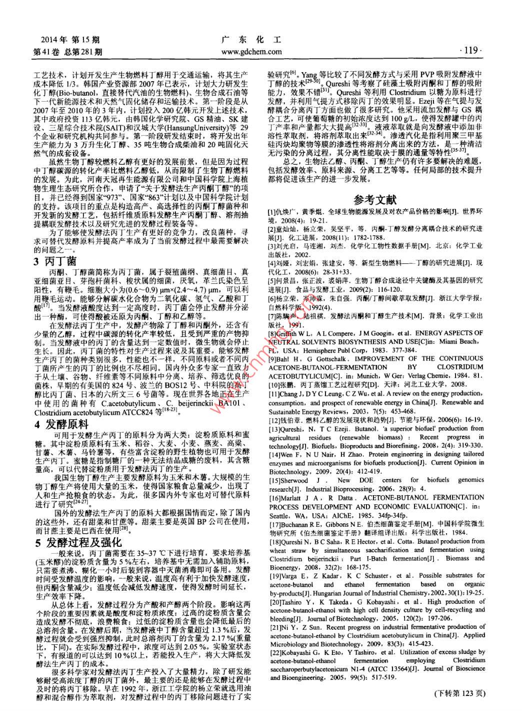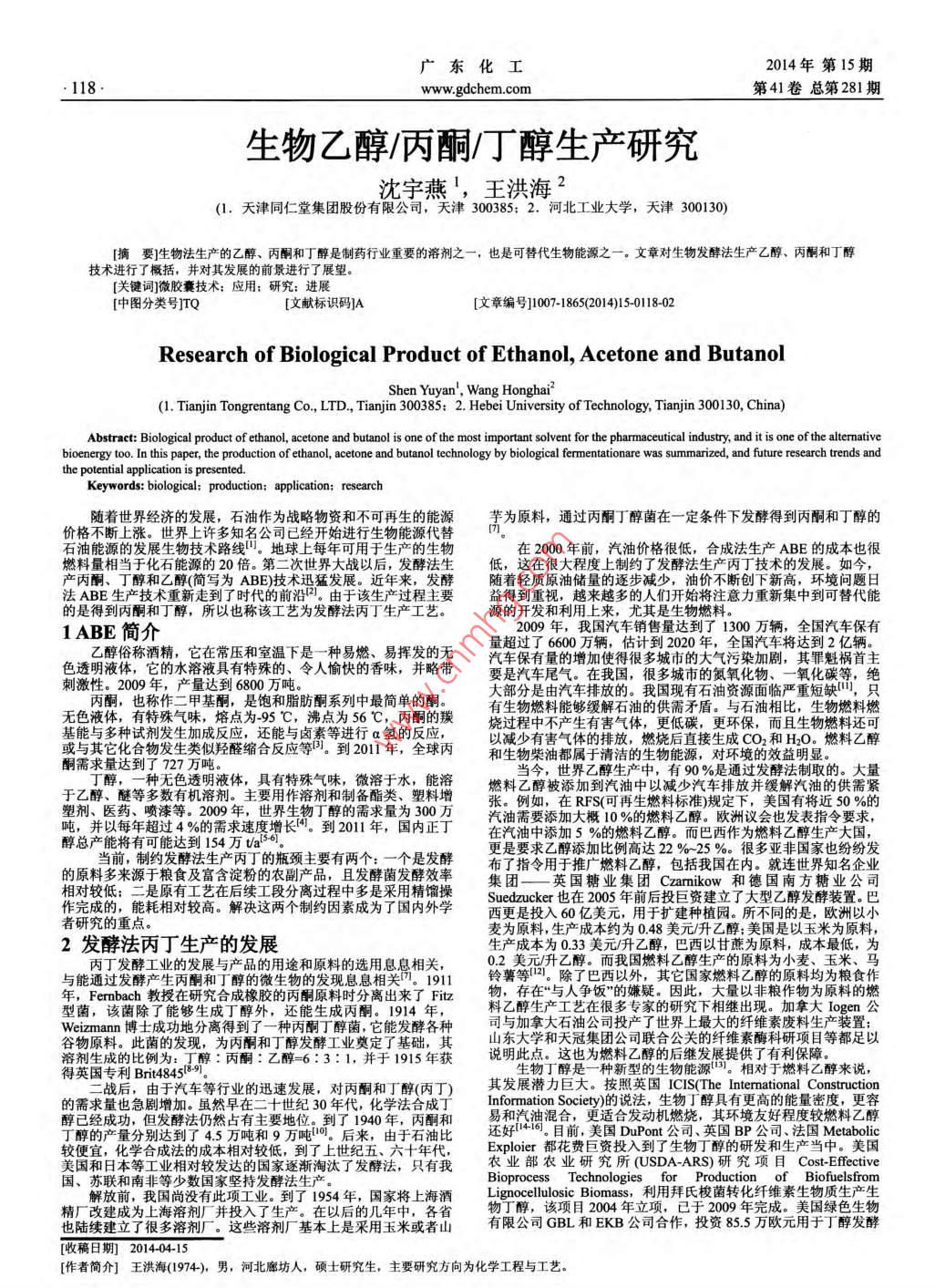 廣東化工2014年第15期l18www.gdchem.com第41卷總第281期生物乙醇/丙酮/醇生產(chǎn)研究沈宇燕,王洪海2(1.天津同仁堂集團(tuán)股份有限公司,天津300385:2.河北工業(yè)大學(xué),天津300130)[摘要]生物法生產(chǎn)的乙醇、丙酮和丁醇是制藥行業(yè)重要的溶劑之一,也是可替代生物能源之一。文章對(duì)生物發(fā)酵法生產(chǎn)乙醇、丙酮和丁醇技術(shù)進(jìn)行了概括,并對(duì)其發(fā)展的前景進(jìn)行了展望。關(guān)鍵詞]微膠囊技術(shù);應(yīng)用:研究;進(jìn)展中圖分類號(hào)TQ[文獻(xiàn)標(biāo)識(shí)碼]A[文章編號(hào)]1007-1865(2014)15011802Research of Biological Product of Ethanol, Acetone and butanolShen Yuyan, Wang Honghai(1. Tianjin Tongrentang Co, LTD, Tianjin 300385: 2. Hebei University of Technology, Tianjin 300130, China)Abstract: Biological product of ethanol, acetone and butanol is one of the most important solvent for the pharmaceutical industry, and it is one of the alternativebioenergy too. In this paper, the production of ethanol, acetone and butanol technology by biological fermentationare was summarized, and future research trends andKeywords: biological: production: application; research隨著世界經(jīng)濟(jì)的發(fā)展,石油作為戰(zhàn)略物資和不可再生的能源芋為原料,通過(guò)丙酮丁醇菌在一定條件下發(fā)酵得到丙酮和丁醇的價(jià)格不斷上漲。世界上許多知名公司己經(jīng)開(kāi)始進(jìn)行生物能源代替石油能源的發(fā)展生物技術(shù)路線山。地球上每年可用于生產(chǎn)的生物在2000年前,汽油價(jià)格很低,合成法生產(chǎn)ABE的成本也很料量相當(dāng)于化石能源的20倍。第二次世界大戰(zhàn)以后,發(fā)酵法生低,這在很大程度上制約了發(fā)酵法生產(chǎn)丙丁技術(shù)的發(fā)展。如今,產(chǎn)丙酮、丁醇和乙醇(簡(jiǎn)寫為ABE)技術(shù)迅猛發(fā)展。近年來(lái),發(fā)酵隨著輕質(zhì)原油儲(chǔ)量的逐步減少,油價(jià)不斷創(chuàng)下新高,環(huán)境問(wèn)題日法ABE生產(chǎn)技術(shù)重新走到了時(shí)代的前沿。由于該生產(chǎn)過(guò)程主要益得到重視,越來(lái)越多的人們開(kāi)始將注意力重新集中到可替代能的是得到丙酮和丁醇,所以也稱該工藝為發(fā)酵法丙丁生產(chǎn)工藝源的開(kāi)發(fā)和利用上來(lái),尤其是生物燃料。1ABE簡(jiǎn)介2009年,我國(guó)汽車銷售量達(dá)到了1300萬(wàn)輛,全國(guó)汽車保有醇俗稱酒精,它在常壓和室溫下是一種易燃、易揮發(fā)的無(wú)色透明液體,它的水溶液具有特殊的、令人愉快的香味,并略帶汽車保有量的增加使得很多城市的大氣污染加劇,其罪魁禍?zhǔn)字鞔碳ば浴?009年,產(chǎn)量達(dá)到6800萬(wàn)噸。要是汽車尾氣。在我國(guó),很多城市的氮氧化物、一氧化碳等,絕無(wú)色液體,有特殊氣味,熔點(diǎn)為95℃,沸點(diǎn)為56℃,丙酮的有生物燃料能夠緩解石油的供需矛盾。與石油相比,生物燃料燃基能與多種試劑發(fā)生加成反應(yīng),還能與鹵素等進(jìn)行a氫的反應(yīng)燒過(guò)程中不產(chǎn)生有害氣體,更低碳,更環(huán)保,而且生物燃料還可減少有害氣體的排放,燃燒后直接生成CO2和H2O。燃料乙醇或與其它化合物發(fā)生類似羥醛縮合反應(yīng)等。到2011年,全球丙和生物柴油都屬于清潔的生物能源,對(duì)環(huán)境的效益明顯丁醇,一種無(wú)色透明液體,具有特殊氣味,微溶于水,能溶燃料乙醇被添加到汽油中以減少汽車排放并緩解汽油的供需緊塑劑、醫(yī)藥、噴漆等。2009年,世界生物丁醇的需求量為300萬(wàn)汽油需要添加大概10%的燃料乙醇。歐洲議會(huì)也發(fā)表指令要求,噸,并以每年超過(guò)4%的需求速度增長(zhǎng)。到2011年,國(guó)內(nèi)正醇總產(chǎn)能將有可能達(dá)到54萬(wàn)ta5在汽油中添加5%的燃料乙醇。而巴西作為燃料乙醇生產(chǎn)大國(guó)更是要求乙醇添加比例高達(dá)22%25%。很多亞非國(guó)家也紛紛發(fā)布了指令用于推廣燃料乙醇,包括我國(guó)在內(nèi)。就連世界知名企業(yè)相對(duì)較低;二是原有工藝在后續(xù)工段分離過(guò)程中多是采用精餾集團(tuán)——英國(guó)糖業(yè)集團(tuán) Czamikow和德國(guó)南方糖業(yè)公司作完成的,能耗相對(duì)較高。解決這兩個(gè)制約因素成為了國(guó)內(nèi)外學(xué)者研究的重點(diǎn)。西更是投入60億美元,用于擴(kuò)建種植園。所不同的是,歐洲以小麥為原料,生產(chǎn)成本約為048美元升乙醇;美國(guó)是以玉米為原料2發(fā)酵法丙丁生產(chǎn)的發(fā)展生產(chǎn)成本為033美元升乙醇,巴西以甘蔗為原料,成本最低,為丙丁發(fā)酵工業(yè)的發(fā)展與產(chǎn)品的用途和原料的選用息息相關(guān)02美元升乙醇。而我國(guó)燃料乙醇生產(chǎn)的原料為小麥、玉米、馬與能通過(guò)發(fā)酵產(chǎn)生丙酮和丁醇的微生物的發(fā)現(xiàn)息息相關(guān)7。1911鈴薯等2。除了巴西以外,其它國(guó)家燃料乙醇的原料均為糧食作年b在究球液橡那的還定度時(shí)分離出來(lái)了年中乙生產(chǎn)上之在很多家的明下出現(xiàn)!加大甲參Weizmann博士成功地分離得到了一種丙酮丁醇菌,它能發(fā)酵各種谷物原料。此菌的發(fā)現(xiàn),為丙酮和丁醇發(fā)酵工業(yè)奠定了基礎(chǔ),山東大學(xué)和天冠集團(tuán)公司聯(lián)合公關(guān)的纖維素酶科研項(xiàng)目等都足以溶劑生成的比例為:丁醇:丙酮:乙醇=6:3:1,并于1915