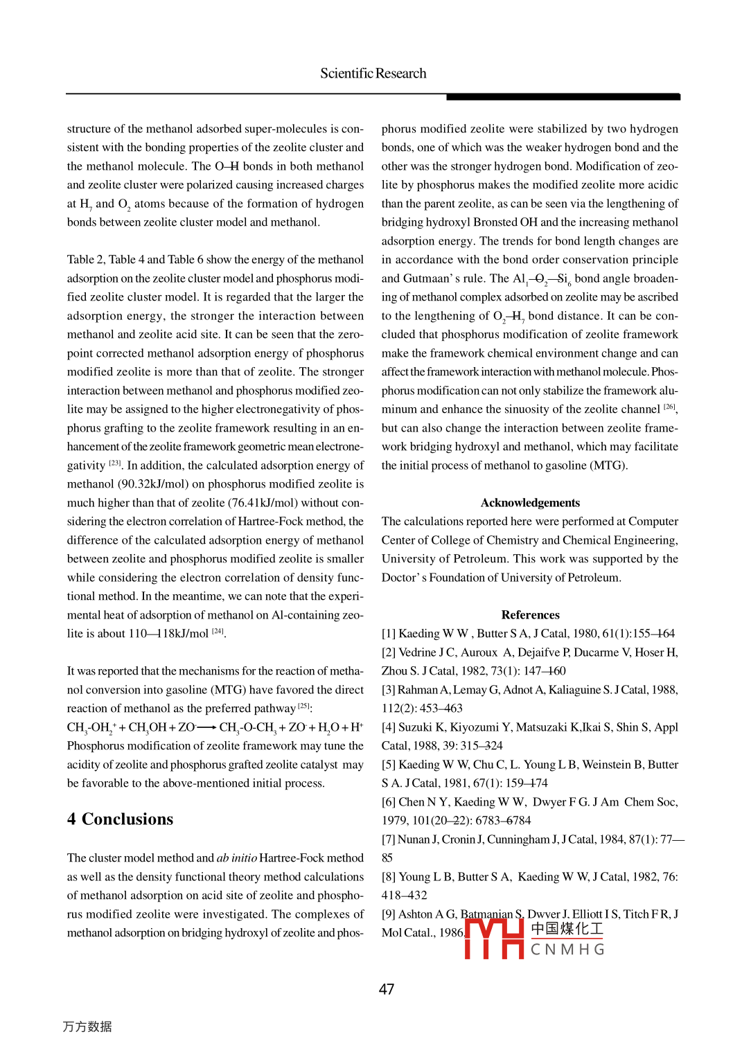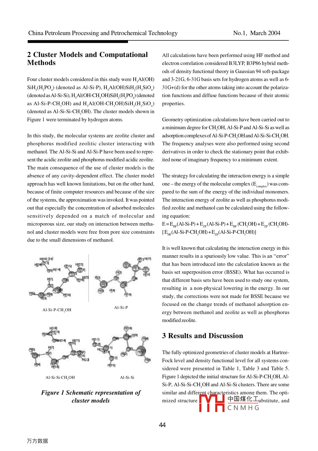 Scientific ResearchTheoretical Study on A dsorption of Methanolon Zeolite and Phosphorus Modified ZeoliteLi Renqing'; Li Ting'; Gu Jun'; Liu Chenguang'(1 University of Petroleum, Dongying 257061; 2 Dongxin Oil Production Factory)Abstract: Methanol adsorption in zeolite and phosphorus modified zeolite has been investigated withinthe cluster model framework of quantum chemical calculation. Full optimization and frequency analysis ofall cluster model have been carried out using Gaussian 94 soft package with Hartree- Fock method andB3LYP, B3P86 hybrid methods of density functional theory at 3-21G, 6-31G basis set level for hydrogenatoms and 6-31G+(d) basis set level for the other atoms performed on small cluster model forCH,OH, HAI(OH)SiH(H,PO), H,Al(OH)SiH(H,SiO), H,AI(OH-CH,OH)SiH,(HPO) and HAI(OH-CH,OH)SiH,(H,SiO). The results show that phosphorus grafting in the zeolite framework has modifiedthe chemical environment in the vicinity of the zeolite bridging hydroxyl. Phosphorus modification canenhance the acid strength of zeolite bridging hydroxyl, which was suggested by the lengthening ofzeolite bridging hydroxyl O- H bond and the increasing methanol adsorption energy. This may befavorable to the initial CH OCH, formation in the methanol to gasoline (MTG) process.Key words: methanol adsorption; zeolite; Hartree Fock method; density functional theory1 Introductionmolecular dynamics simulations. Payne et alsl calculated thefree energy barrier for the reaction of methanol in a zeoliteZSM- 5, a member of the pentasil family of high silica zeolites, catalyst by first principles. Cluster models [161 and periodichas a wide application as a catalytic material due to its un- structuresl7]1 have been calculated to investigate the pos-usual properties. It is common practice that zeolite must be sible protonation of small polar molecules in zeolite. Nusterercarefully tuned to the desired catalytic process prior to its et al81 studied the adsorption of methanol in silicon richemployment. Phosphorus-containing compounds were usu- sodalite using the PAW method with periodic boundary con-ally chosen to modify ZSM-5 zeolites to be applied in many ditions including full dynamics. Shah et al19.201 usedcatalytic reactions such as conversion of methanol to gaso- pseudopotentials to calculate methanol in sodalite andline MTG)I4, selective alkylation of toluene with methanol chabazite. Hasse et all21 studied the adsorption of a singleto produce para-xylene [5 +0]. Yuan et al" investigated the methanol molecule in the series of acidic zeolite theta- 1,methanol adsorption properties in heteroatoms substituted ferrierite and ZSM-5 by ab initio molecular simulations basedZSM-5 zeolites by density functional theory. Feng et all21 on density functional theory together with a plane wave ba-employed density functional method to study methanol ad- sis set. To my knowledge, there were no reports about com-sorption in TS-1. Ab initio molecular dynamics simulations parative study on methanol adsorption in zeolite and phos-based on density functional theory together with a plane phorus modified zeolite, which was used as an important cata-wave basis set and Vanderbilt pseudopotential were used to lyst for methanol related reactions. So, the aim of our study isexplore the potential energy surface of a methanol molecule as follows: (1) comparing the changes in structure of zeoliteinteracting with the Bronsted site of chabazitel131. Schwarz et model cluster and phosphorus modified zeolite model cluster;al. [141 took the infinite zeolite structure into full account and (2) investigating the changes of methanol adsorbed complex;presented the adsorption of methanol and water in zeolite by and (3) determining the reaction energy of methanolfirst principle (based on electronic structure calculations) adsorption.中國煤化工MHCNMH G.China Petroleum Processing and Petrochemical TechnologyNo.1, March 20042 Cluster Models and ComputationalAll calculations have been performed using HP method andMethodselectron correlation considered B3LYP, B3P86 hybrid meth-ods of density functional theory in Gaussian 94 soft-packageFour cluster models considered in this study were H,Al(OH) and 3-21G, 6-31G basis sets for hydrogen atoms as well as 6-SiH,(H,PO) (denoted as AI-Si-P), HAI(OH)SiH,(H,SiO)31G+(d) for the other atoms taking into account the polariza-(denoted asAl-Si- Si), HAI(OH-CH,OH)SiH,(HPO)(denoted tion functions and diffuse functions because of their atomicas Al-Si-P-CH,OH) and HAI(OH-CH,OH)SiH,(H,SiO) properties.(denoted as Al-Si-Si-CH,OH). The cluster models shown inFigure 1 were terminated by hydrogen atoms.Geometry optimization calculations have been carried out toa minimum degree for CH,OH, Al-Si-P and Al- Si Si as well asIn this study, the molecular systems are zeolite cluster and adsorption complexesof Al-Si-P-CH,OHand Al-Si-Si-CH,OH.phosphorus modified zeolitic cluster interacting with The frequency analyses were also performed using secondmethanol. The Al-Si-Si and Al-Si-P have been used to repre- derivatives in order to check the stationary point that exhib-sent the acidic zeolite and phosphorus modified acidic zeolite. ited none of imaginary frequency to a minimum extent.The main consequence of the use of cluster models is theabsence of any cavity-dependent effect. The cluster model The strategy for calculating the interaction energy is a simpleapproach has well known limitations, but on the other hand,one - the energy of the molecular complex (Emole ) was com-because of finite computer resources and because of the size pared to the sum of the energy of the individual monomers.of the systerms, the approximation was invoked. It was pointed The interaction energy of zeolite as well as phosphorus modi-out that especially the concentration of adsorbed molecules fied zeolite and methanol can be calculated using the followsensitively depended on a match of molecular and ing equation:microporous size, our study on interaction betwe
