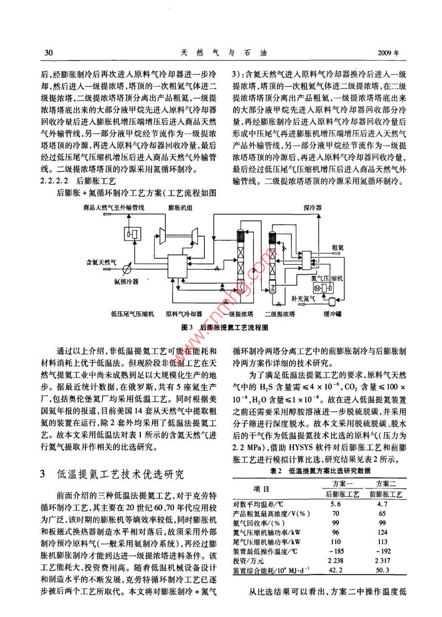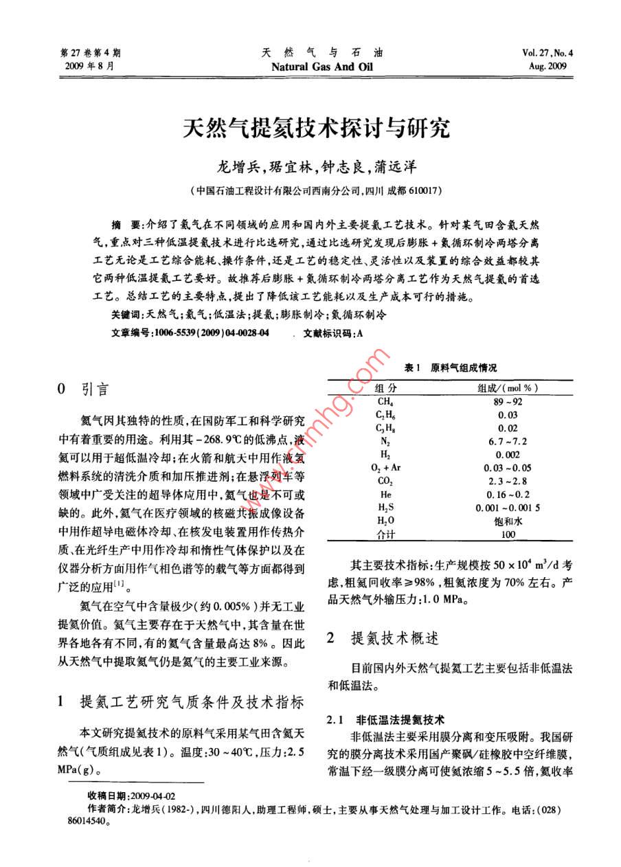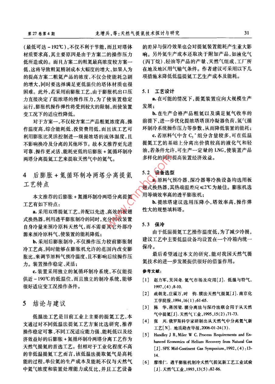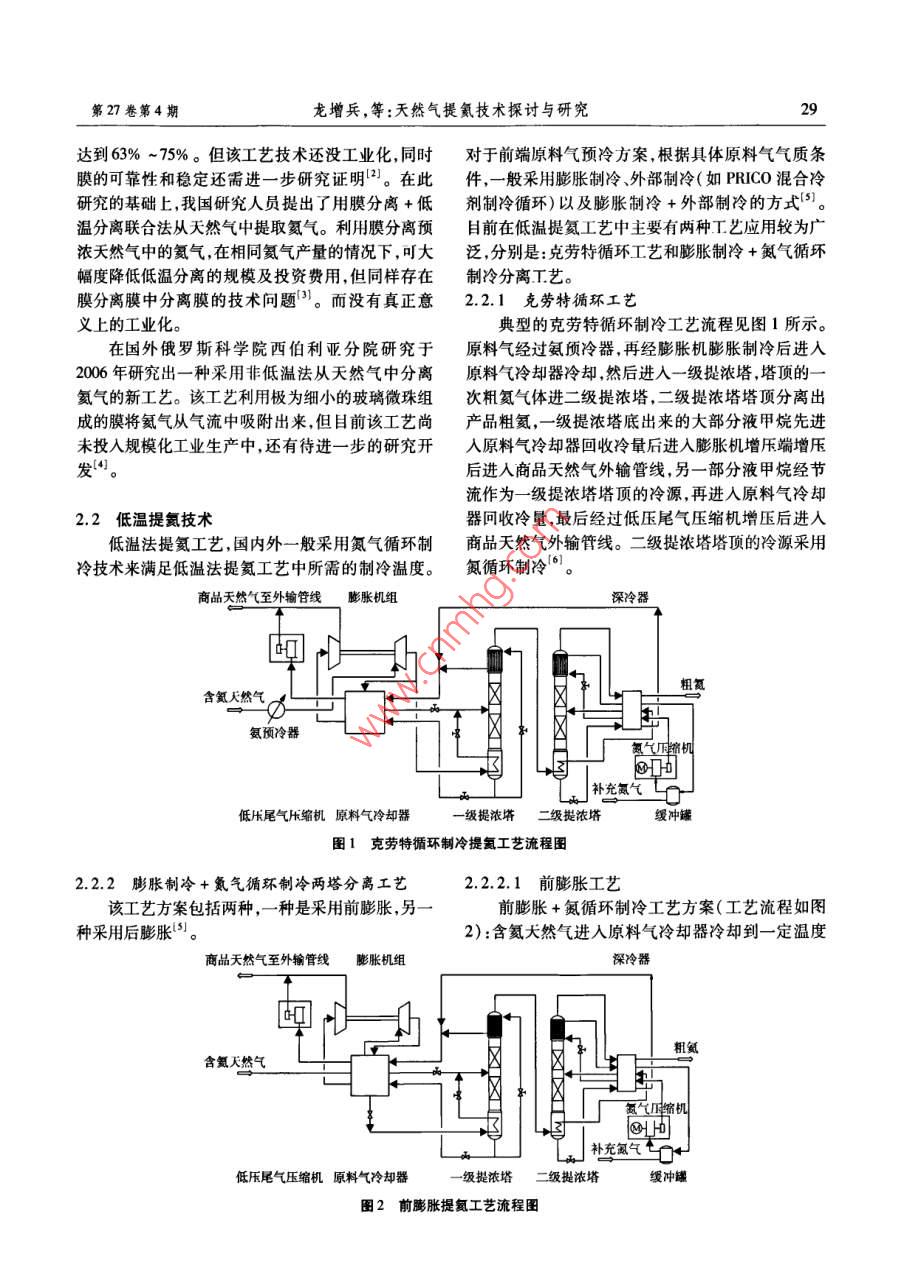 第27卷第4期天然氣與石油vol.27,N.42009年8月Natural Gas And OilAug. 2009天然氣提氦技術(shù)探討與研究龍增兵,琚宜林,鐘志良,蒲遠(yuǎn)洋(中國石油工程設(shè)計有限公司西南分公司,四川成都610017)摘要:介紹了氦氣在不同領(lǐng)域的應(yīng)用和國內(nèi)外主要提氦工藝技術(shù)。針對某氣田含氦天然氣,重點對三種低溫提氪技術(shù)進行比選研究,通過比選研究發(fā)現(xiàn)后膨脹+氮循環(huán)制冷兩塔分離工藝無論是工藝綜合能耗、操作條件,還是工藝的穩(wěn)定性、靈活性以及裝置的綜合效益都較其它兩種低溫提氦工藝要妤。故推薦后膨脹+氮循環(huán)制冷兩塔分離工藝作為天然氣提氦的首選工藝??偨Y(jié)工藝的主要特點,提出了降低該工藝能耗以及生產(chǎn)成本可行的措施關(guān)鍵詞:天然氣;氦氣;低溫法;提氦;膨脹制冷;氪循環(huán)制冷文章編號:1006553912009)04002804文獻(xiàn)標(biāo)識碼:A表1原料氣組成情況0引言組分組成/(mol%)氦氣因其獨特的性質(zhì),在國防軍工和科學(xué)研究0.03ChS中有著重要的用途。利用其-268.9℃的低沸點,液7-72氦可以用于超低溫冷卻;在火箭和航天中用作液氫0.0020.03-0.05燃料系統(tǒng)的清洗介質(zhì)和加壓推進劑;在懸浮列車等2.3~2.8領(lǐng)域中廣受關(guān)注的超導(dǎo)體應(yīng)用中,氦氣也是不可或0.16-0.2缺的。此外,氦氣在醫(yī)療領(lǐng)域的核磁共振成像設(shè)備0.001-0.00150飽和水中用作超導(dǎo)電磁體冷卻、在核發(fā)電裝置用作傳熱介質(zhì)、在光纖生產(chǎn)中用作冷卻和情性氣體保護以及在儀器分析方面用作氣相色譜等的載氣等方面都得到其主要技術(shù)指標(biāo):生產(chǎn)規(guī)模按50×10·m3d考廣泛的應(yīng)用。慮粗氦問收率≥98%,粗氦濃度為70%左右。產(chǎn)氦氣在空氣中含量極少(約000%)并無工業(yè)品天然氣外輸壓力:1.0MPa提氦價值。氦氣主要存在于天然氣中,其含量在世界各地各有不同有的氮氣含量最高達(dá)8%。因此2提氦技術(shù)概述從天然氣中提取氦氣仍是氦氣的主要工業(yè)來源。目前國內(nèi)外天然氣提氦工藝主要包括非低溫法和低溫法。提氦工藝研究氣質(zhì)條件及技術(shù)指標(biāo)2.1非低溫法提氦技術(shù)本文研究提氦技術(shù)的原料氣采用某氣田含氦天非低溫法主要采用膜分離和變壓吸附。我國研然氣(氣質(zhì)組成見表1)。溫度:30~40℃,壓力:2.5究的膜分離技術(shù)采用國產(chǎn)聚砜/硅橡膠中空纖維膜,MPa(g)。常溫下經(jīng)一級膜分離可使氦濃縮5~5.5倍,氪收率收稿日期:20090402作者簡介:龍增兵(1982-),四川德陽人,助理工程師,碩士,主要從事天然氣處理與加工設(shè)計工作。電話:(028)86014540。第27卷第4期龍增兵,等:天然氣提氮技術(shù)探討與研究達(dá)到63%~75%。但該工藝技術(shù)還沒工業(yè)化,同時對于前端原料氣預(yù)冷方案,根據(jù)具體原料氣氣質(zhì)條膜的可靠性和穩(wěn)定還需進一步研究證明2。在此件,一般采用膨脹制冷、外部制冷(如 PRICO混合冷研究的基礎(chǔ)上,我國研究人員提出了用膜分離+低劑制冷循環(huán))以及膨脹制冷+外部制冷的方式3溫分離聯(lián)合法從天然氣中提取氦氣。利用膜分離預(yù)目前在低溫提氦工藝中主要有兩種工藝應(yīng)用較為廣濃天然氣中的氦氣,在相同氦氣產(chǎn)量的情況下,可大泛,分別是:克勞特循環(huán)工藝和膨脹制冷+氮氣循環(huán)度降低低溫分離的規(guī)模及投資費用,但同樣存在制冷分離工藝膜分離膜中分離膜的技術(shù)問題3。而沒有真正意2.2.1克勞特循環(huán)工藝義上的工業(yè)化典型的克勞特循環(huán)制冷工藝流程見圖1所示。在國外俄羅斯科學(xué)院西伯利亞分院研究于原料氣經(jīng)過氨預(yù)冷器,再經(jīng)膨脹機膨脹制冷后進入2006年研究出一種采用非低溫法從天然氣中分離原料氣冷卻器冷卻然后進入一級提濃塔,塔頂?shù)暮獾男鹿に嚒T摴に嚴(yán)脴O為細(xì)小的玻璃微珠組次粗氦氣體進二級提濃塔,二級提濃塔塔頂分離出成的膜將氦氣從氣流中吸附出來但目前該工藝尚產(chǎn)品粗氦,一級提濃塔底出來的大部分液甲烷先進未投入規(guī)?;I(yè)生產(chǎn)中,還有待進一步的研究開入原料氣冷卻器回收冷量后進入膨脹機增壓端增壓發(fā)后進入商品天然氣外輸管線,另一部分液甲烷經(jīng)節(jié)流作為一級提濃塔塔頂?shù)睦湓?再進入原料氣冷卻2.2低溫提氦技術(shù)器回收冷量,最后經(jīng)過低壓尾氣壓縮機增壓后進入低溫法提氦工藝,國內(nèi)外一般采用氮氣循環(huán)制商品天然氣外輸管線。二級提濃塔塔頂?shù)睦湓床捎美浼夹g(shù)來滿足低溫法提氮工藝中所需的制冷溫度。氮循環(huán)制冷6。商品天然氣至外輸管線膨脹機組深冷器粗氮含氦天然氣氨預(yù)冷器X■X■z補充氮氣低壓尾氣壓縮機原料氣冷卻器一級提濃塔二級提濃塔緩沖罐圖1克勞特循環(huán)制冷提氦工藝流程圖2.2.2膨脹制冷+氮氣循環(huán)制冷兩塔分離工藝2.2.2.1前膨脹工藝該工藝方案包括兩種,一種是采用前膨脹,另前膨脹+氮循環(huán)制冷工藝方案(工藝流程如圖種采用后膨脹。2):含氦天然氣進入原料氣冷卻器冷卻到一定溫度商品天然氣至外輸管線膨脹機組冷器含氦天然氣X■補充氮低壓尾氣壓縮機原料氣冷卻器級提濃塔二級提濃塔緩沖罐圖2前膨脹提氦工藝流程圖天然氣與石油2009年后,經(jīng)膨脹制冷后再次進入原料氣冷卻