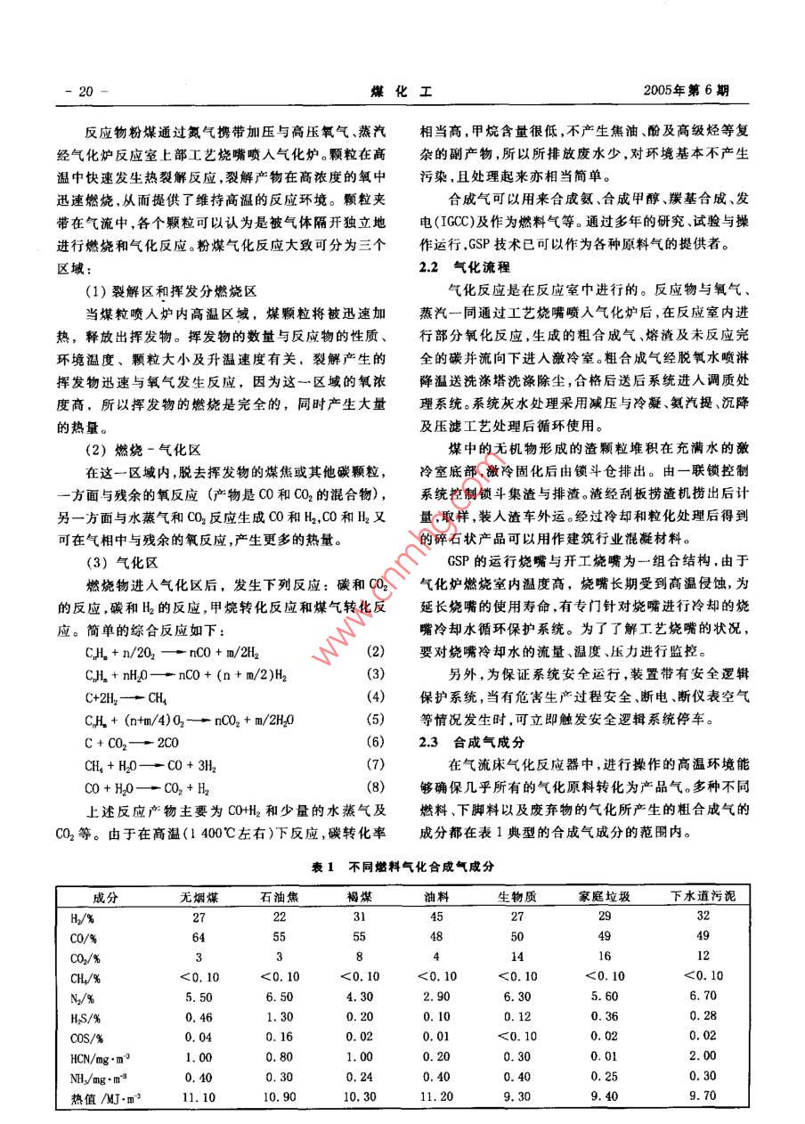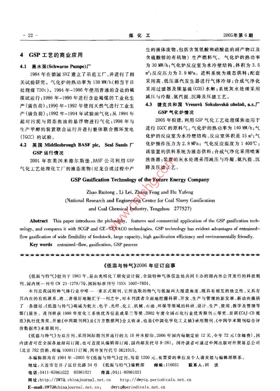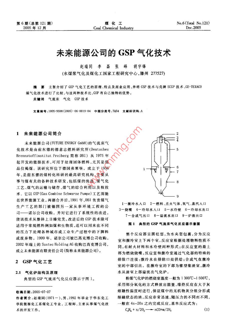 第6期(總第121期)煤化工No.6(Total No.121)2005年12月Coal Chemical IndustryDec.2005未來能源公司的GSP氣化技術(shù)趙瑞同李磊張峰胡宇鋒(水煤漿氣化及煤化工國家工程研究中心,滕州277527)摘要主要介紹了GSP氣化工藝的原理、特點及商業(yè)應(yīng)用,并將GSP技術(shù)與殼牌SOGP技術(shù)、GE-TEXAC0煤氣化技術(shù)進行了比較,與這兩種技術(shù)比,CSP有自己獨特的優(yōu)勢。關(guān)鍵詞氣流床 氣化GSP技術(shù)文章編號:1005-9598 (2005) -06 0019-04中團分類號 :TQ54文獻標(biāo)識碼 :A1未來能源公司簡 介未來能源公司(FUTUREENERGYGmbH)的氣流床氣化技術(shù)是由前東德的德意志燃料研究所(Deulsches5Brennstoffinstitut Freiberg簡稱DBI)從1975年起開發(fā)的能源技術(shù),可用于處理固體燃料,尤其是低品位褐煤。該研究所位于德國弗菜倦,成立于19561-7|實6年,是前東德的煤轉(zhuǎn)化科研的最高研究機構(gòu),主要從事與煤有關(guān)的各種技術(shù)研發(fā),包括煤的洗選、煤氣化8工藝、煤氣的運輸與儲存、煤氣的綜合利用以及核技術(shù)。它以GSP (Gas Combine Schwarze Pumpe)工藝而馳名世界能源工業(yè)。兩德合并后,1991年,DBI負(fù)責(zé)煤氣1一激冷水人口2- 燃料、點火氣體、氧氣、蒸汽入口生產(chǎn)工藝的部門被德國另一家從事環(huán)境工程的公3-燒嘴4一冷卻水入口5一水冷壁 6- 冷卻水出口司一- 諾爾公司收購,并對它進行了系統(tǒng)性的改進,7-合成氣出口8- 溢流水出口9-爐渣 出口使該技術(shù)從整體上日臻完美。改進后的GSP技術(shù)除可適用于常規(guī)燃料例如煤和生物質(zhì),還可以用來在不同圍1典型的GSP氣流床氣化反應(yīng)器示意圖的壓力下處理各種城市或工業(yè)生產(chǎn)過程中的下腳料整個反應(yīng)器呈圓柱型,為水夾套包裹,分為反應(yīng)或廢弁物。1999 年,諾爾公司被巴高克博公司收購。室和激冷室上下兩個室。反應(yīng)室根據(jù)處理物料性質(zhì)不2002年瑞上的SustecHoldingAG收購巴高克博公司,同,有耐火材料和水冷壁兩種形式;在反應(yīng)室的最上成立未來能源有限責(zé)任公司(簡稱未來能源公司)。,部為燃燒燒嘴。反應(yīng)室和激冷室通過氣化器的特殊的排除口連接:激冷水在排除口處供給;合成氣在激冷2 GSP氣化工藝室的中部引出。在激冷室的下部為錐型集渣室,激冷2.1氣化爐結(jié)構(gòu)及原理水從渣室上部溢流出氣化爐。典型的GSP氣流床氣化反應(yīng)器示于圖1。粉煤氣化爐的燃燒室溫度- - 般為1 300C~1 500C,采用部分氧化的方式釋放出能量,維持反應(yīng)在大于灰收稿日期:2005-07-07熔融性溫度時進行,保證煤中的無機物灰分組分形成作者簡介:趙瑞同(1971-).男.1992年畢業(yè)于華東化工熔融狀態(tài)的濟。反應(yīng)非常迅速,隨壓力的不同而不同,學(xué)院能源化工系煤化工專業(yè),工程師,主要從事煤氣化技-般在4s-20s之內(nèi)完成反應(yīng),基本反應(yīng)式為:術(shù)的開發(fā)工作。CH.+ n/202一- - nC0+m/2H21)煤化工2005年第6期反應(yīng)物粉煤通過氮氣攜帶加壓與高壓氧氣、蒸汽相當(dāng)高,甲烷含量很低,不產(chǎn)生焦油、酚及高級烴等復(fù)經(jīng)氣化爐反應(yīng)室上部工藝燒嘴噴人氣化爐。顆粒在高雜的副產(chǎn)物,所以所排放廢水少,對環(huán)境基本不產(chǎn)生溫中快速發(fā)生熱裂解反應(yīng),裂解產(chǎn)物在高濃度的氧中污染,且處理起來亦相當(dāng)簡單。迅速燃燒,從而提供了維持高溫的反應(yīng)環(huán)境。顆粒夾合成氣可以用來合成氨、合成甲醇、羰基合成、發(fā)帶在氣流中,各個顆粒可以認(rèn)為是被氣體隔開獨立地電(IGCC)及作為燃料氣等。通過多年的研究、試驗與操進行燃燒和氣化反應(yīng)。粉煤氣化反應(yīng)大致可分為三個作運行,GSP技術(shù)已可以作為各種原料氣的提供者。區(qū)域:2.2氣化流程(1)裂解區(qū)和揮發(fā)分燃燒區(qū)氣化反應(yīng)是在反應(yīng)室中進行的。反應(yīng)物與氧氣、當(dāng)煤粒噴人爐內(nèi)高溫區(qū)域,煤顆粒將被迅速加蒸汽一同通過工藝燒嘴噴人氣化爐后,在反應(yīng)室內(nèi)進熱,釋放出揮發(fā)物。揮發(fā)物的數(shù)量與反應(yīng)物的性質(zhì)、行部分氧化反應(yīng),生成的粗合成氣、熔渣及未反應(yīng)完環(huán)境溫度、顆粒大小及升溫速度有關(guān),裂解產(chǎn)生的全的碳并流向下進人激冷室。粗合成氣經(jīng)脫筑水噴淋揮發(fā)物迅速與氧氣發(fā)生反應(yīng),因為這一區(qū)域的氧濃降溫送洗滌塔洗滌除塵,合格后送后系統(tǒng)進人調(diào)質(zhì)處度高,所以揮發(fā)物的燃燒是完全的,同時產(chǎn)生大量理系統(tǒng)。系統(tǒng)灰水處理采用減壓與冷凝、氨汽提、沉降的熱量。及壓濾工藝處理后循環(huán)使用。(2)燃燒-氣化區(qū)煤中的無機物形成的渣顆粒堆積在充滿水的敵在這一區(qū)域內(nèi),脫去揮發(fā)物的煤焦或其他碳顆粒,冷室底部,激冷固化后由鎖斗倉排出。由一聯(lián)鎖控制-方面與殘余的氧反應(yīng)(產(chǎn)物是CO和CO2的混合物),系統(tǒng)控制鎖斗集渣與排渣。渣經(jīng)刮板撈渣機撈出后計另一方面與水蒸氣和CO2反應(yīng)生成CO和H2,CO和H2又量,取樣,裝人渣車外運。經(jīng)過冷卻和?;幚砗蟮玫娇稍跉庀嘀信c殘余的氧反應(yīng),產(chǎn)生更多的熱量。的碎石狀產(chǎn)品可以用作建筑行業(yè)混凝材料。(3)氣化區(qū).GSP的運行燒嘴與開工燒嘴為一