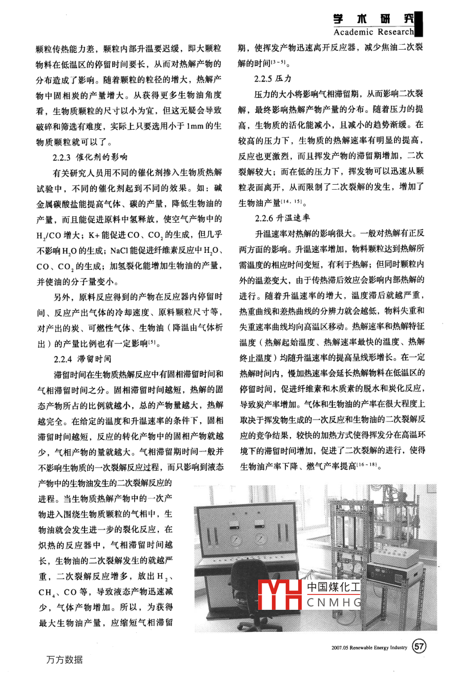 我生物質(zhì)熱解研究現(xiàn)狀與展望■趙廷林,王鵬,鄧大軍,舒?zhèn)?曹冬輝(河南農(nóng)業(yè)大學(xué)機(jī)電工程學(xué)院,農(nóng)業(yè)部可再生能源重點(diǎn)開放實(shí)驗(yàn)室,鄭州450002)摘要:主要論述了生物質(zhì)熱解技術(shù)的原理、熱解反應(yīng)過程、熱解工藝類型及影響因素。在分析國內(nèi)外發(fā)展現(xiàn)狀的基礎(chǔ)上,提出生物質(zhì)熱解技術(shù)主要存在的不足,對(duì)生物質(zhì)熱解技術(shù)的發(fā)展前景進(jìn)行了展望。關(guān)鍵詞:生物質(zhì)熱解;研究進(jìn)展;發(fā)展現(xiàn)狀;展望引言學(xué)轉(zhuǎn)化技術(shù)方法。生物質(zhì)熱解的燃料能源轉(zhuǎn)化率可通過生物質(zhì)能轉(zhuǎn)換技術(shù)可高效地利用生物質(zhì)能達(dá)955%,最大限度的將生物質(zhì)能量轉(zhuǎn)化為能源產(chǎn)源,生產(chǎn)各種清潔能源和化工產(chǎn)品,從而減少人類品,物盡其用,而熱解也是燃燒和氣化必不可少的對(duì)于化石能源的依賴,減輕化石能源消費(fèi)給環(huán)境造成初始階段1。的污染。目前,世界各國尤其是發(fā)達(dá)國家,都在致力于開發(fā)高效、無污染的生物質(zhì)能利用技術(shù),以保熱解技術(shù)原理護(hù)本國的礦物能源資源,為實(shí)現(xiàn)國家經(jīng)濟(jì)的可持續(xù)發(fā)1.1熱解原理展提供根本保障。從化學(xué)反應(yīng)的角度對(duì)其進(jìn)行分析,生物質(zhì)在熱解生物質(zhì)熱解是指生物質(zhì)在沒有氧化劑(空氣、過程中發(fā)生了復(fù)雜的熱化學(xué)反應(yīng),包括分子鍵斷裂、氧氣、水蒸氣等)存在或只提供有限氧的條件下,異構(gòu)化和小分子聚合等反應(yīng)。木材、林業(yè)廢棄物和農(nóng)加熱到逾500℃,通過熱化學(xué)反應(yīng)將生物質(zhì)大分子物作物中國煤化工、半纖維素和木質(zhì)質(zhì)(木質(zhì)素、纖維素和半纖維素)分解成較小分子素。CNMHG52℃時(shí)開始熱解,的燃料物質(zhì)(固態(tài)炭、可燃?xì)?、生物?的熱化隨著溫度的升高,熱解反應(yīng)速度加快,到350~370℃64)新能源產(chǎn)業(yè)207年第5期方數(shù)據(jù)享宜研Academic Researc時(shí),分解為低分子產(chǎn)物,其熱解過程為:質(zhì)依靠外部供給的熱量進(jìn)行木炭的燃燒,使木炭中的(CH1O3n→nCH2O3揮發(fā)物質(zhì)減少,固定碳含量增加,為放熱階段。實(shí)C, O +H,0+2CH, -CO-CHO際上,上述四個(gè)階段的界限難以明確劃分,各階段CH,-CO-CHO+H,-+CH, -CO-CHOH的反應(yīng)過程會(huì)相互交叉進(jìn)56半纖維素結(jié)構(gòu)上帶有支鏈,是木材中最不穩(wěn)定的2熱解工藝及影響因素組分,在225-325℃分解,比纖維素更易熱分解,21熱解工藝類型其熱解機(jī)理與纖維素相似2。從對(duì)生物質(zhì)的加熱速率和完成反應(yīng)所用時(shí)間的角從物質(zhì)遷移、能量傳遞的角度對(duì)其進(jìn)行分析,度來看,生物質(zhì)熱解工藝基本上可以分為兩種類在生物質(zhì)熱解過程中,熱量首先傳遞到顆粒表面,型:一種是慢速熱解,一種是快速熱解。在快速熱再由表面?zhèn)鞯筋w粒內(nèi)部。熱解過程由外至內(nèi)逐層進(jìn)解中,當(dāng)完成反應(yīng)時(shí)間甚短(<0.5s)時(shí),又稱行,生物質(zhì)顆粒被加熱的成分迅速裂解成木炭和揮發(fā)為閃速熱解。根據(jù)工藝操作條件,生物質(zhì)熱解工藝分。其中,揮發(fā)分由可冷凝氣體和不可冷凝氣體組又可分為慢速、快速和反應(yīng)性熱解三種。在慢速熱成,可冷凝氣體經(jīng)過快速冷凝可以得到生物油。解工藝中又可以分為炭化和常規(guī)熱解。次裂解反應(yīng)生成生物質(zhì)炭、一次生物油和不可冷凝氣慢速熱解(又稱干餾工藝、傳統(tǒng)熱解)工藝具體。在多孔隙生物質(zhì)顆粒內(nèi)部的揮發(fā)分將進(jìn)一步裂有幾千年的歷史,是一種以生成木炭為目的的炭化過解,形成不可冷凝氣體和熱穩(wěn)定的二次生物油。同程,低溫干餾的加熱溫度為500-580℃,中溫干餾時(shí),當(dāng)揮發(fā)分氣體離開生物顆粒時(shí),還將穿越周圍溫度為60~-750℃,高溫干餾的溫度為900~1100℃。的氣相組分,在這里進(jìn)一步裂化分解,稱為二次裂將木材放在窯內(nèi),在隔絕空氣的情況下加熱,可以解反應(yīng)。生物質(zhì)熱解過程最終形成生物油、不可冷得到占原料質(zhì)量30%~35%的木炭產(chǎn)量。凝氣體和生物質(zhì)3.4??焖贌峤馐菍⒛ゼ?xì)的生物質(zhì)原料放在快速熱解裝12熱解反應(yīng)基本過程置中,嚴(yán)格控制加熱速率(一般大致為10~200℃/s)根據(jù)熱解過程的溫度變化和生成產(chǎn)物的情況等可以分為干燥階段、預(yù)熱解階段、固體分解階段和煅燒階段。1.2.1千燥階段(溫度為120~150℃),生物質(zhì)中的水分進(jìn)行蒸發(fā),物料的化學(xué)組成幾乎不變。1.2.2預(yù)熱解階段(溫度為150~275℃),物料的熱反應(yīng)比較明顯,化學(xué)組成開始變化,生物質(zhì)中的不穩(wěn)定成分如半纖維素分解成二氧化碳、一氧化碳和少量醋酸等物質(zhì)。上述兩個(gè)階段均為吸熱反應(yīng)階段。1.2.3固體分解階段(溫度為275~475℃),熱解的主要階段,物料發(fā)生了各種復(fù)雜的物理、化學(xué)反應(yīng),產(chǎn)生大量的分解產(chǎn)物。生成的液體產(chǎn)物中含有醋酸、木焦油和甲醇(冷卻時(shí)析出來);氣體產(chǎn)物中有CO2、CO、CH4、H2等,可燃成分含量增中國煤化工加。這個(g