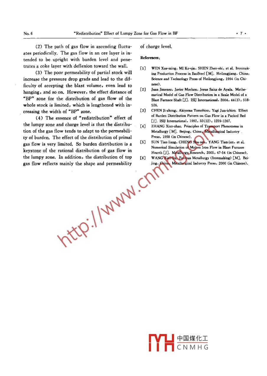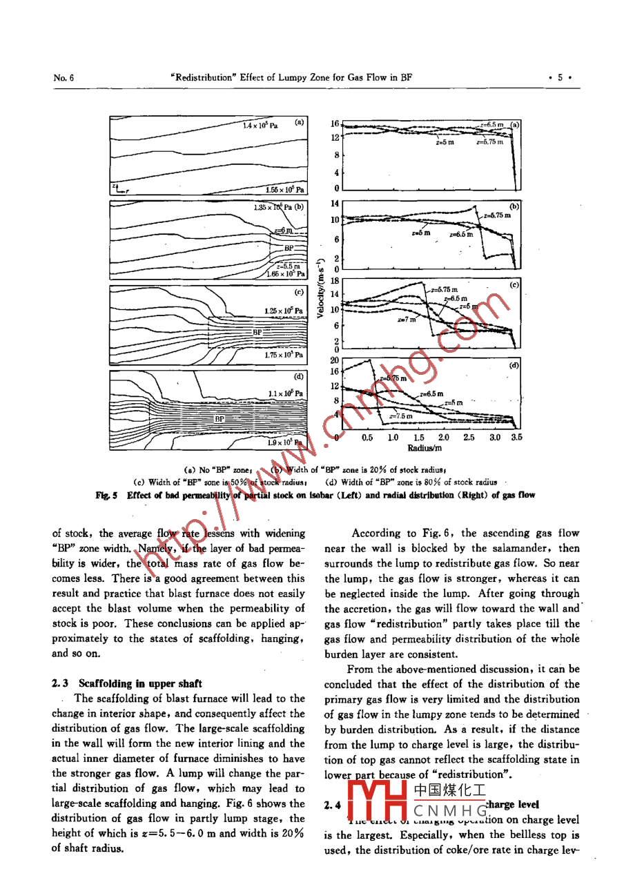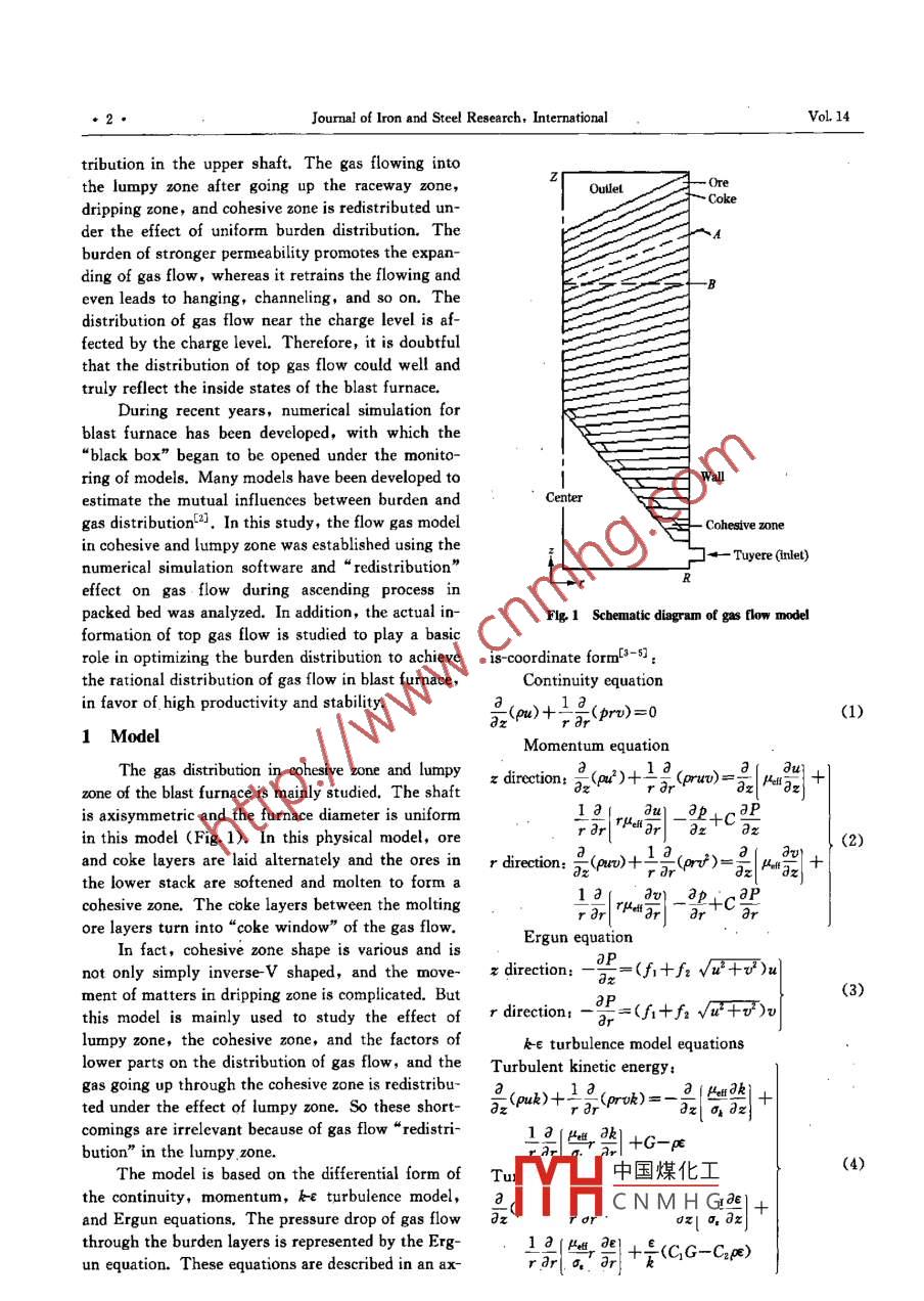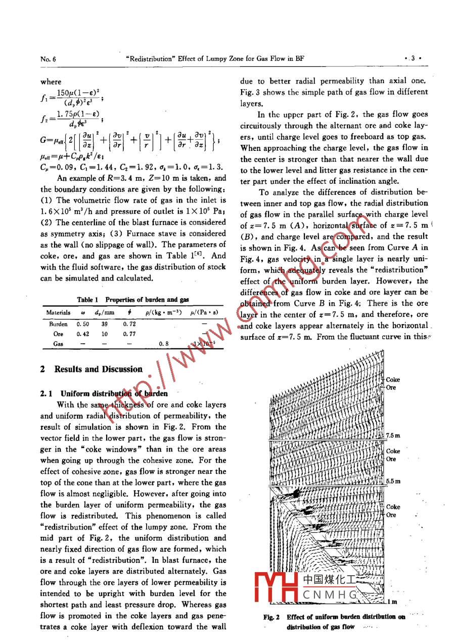Availableonlineatwww.sciencedirect.comScienceDirectJOURNAL OF IRON AND STEEL RESEARCH, INTERNATIONAL. 2007, 14(6): 01-07Redistribution"Effect of Lumpy Zone for Gas Flow in BFZHU Qing-tian, CHENG Shu-sen(School of Metallurgical and Ecological Engineering, University of Science and Technology beijing, Beijing 100083, China)Abstract, The gas flow from tuyere to raceway zone by blasting involves three distributional zones, such as drippingcohesive, and lumpy zone. The gas flow distribution in lumpy zone directly affects the gas utilization ration andsmooth operation in the blast furnace. However, the furnace closeness brings about great difficulty in the study ofhigh-temperature gas flow. The charging and blasting system affecting the gas flow and whether the top gas flowdistribution could reflect its inner condition as well as the furnace state, such as hanging or scaffolding, which havebecome the main problems for the research on gas flow. Recently, several researches overseas studied gas flow dis-ribution using the numerical simulation method, however, such a research was rare amongst the natives. In thisstudy, the flow model of gas in cohesive and lumpy zone was established using the numerical simulation software anthe gas flow distributions with uniform distribution of burden permeability, scaffolding of wall, and nonuniformcharge level were analyzed. As a result, the effects of cohesive zone and lower parts on the gas flow are very limitedand the charge level largely affects the distribution of top gas flow. Therefore, it was found that the distribution oftop gas flow could hardly reflect the inner gas flow. The process is called"redistribution"effect, which means thatthe gas flow after passing through the raceway, dripping, and cohesive zone is distributed when it flows into theKey words, blast furnace; gas flow: lumpy zone: numerical simulationboILCConstant, C=0 in freeboard, and C=l in packe-Turbulence dissipation raterbed;ped factor of particled.-Effective diameter of particlea, o. Effective Prandtl number for k, t, respective-ic energy, m/s-Pressure of gas, Pa-Static pressure drop of gas in packed bed, PaViscosity coefficient of gas, Pa.8:u,velocity in z, r direction, m/s-Void fraction of charge layer.The rational distribution of radial gas flow in a tem as top operation pf the blast furnace is impor-blast fumace is of great importance to stable smooth op- tant in the distribution of gas flow.eration and improving gas utilization. It is one of theThe furnace closeness and reaction complexity bringbasic methods for blast furnace operation that adopts about great difficulty in the study of distribution of gasappropriate blasting and charging systems to control flow. In this study, the inner furnace state, distributionand adjust the distribution of gas flown. The sound of gas flow, and cohesive zone shape are estimated bydistribution of gas flow is to achieve the highest gas monitoring the distribution of top gas. However, theutilization efficiency and the lowest fuel consumption distribution of gas flow from bottom to top containson the basis of the smooth operation of the furnace. thend raceway zone,According to long-term practice, the charging sys- mid di中國煤某化二ck, and upper dis-CNMHGFoundation Item: Item Sponsored by National Natural Science Foundation of ChinBiography,ZHUQing-tian(1981-),Male,Master:Bmall,bluersky1@yahoo.com.cr,RevisedDate:September15,2006Journal of Iron and Steel Research, Internationaol,14tribution in the upper shaft. The gas flowing intothe lumpy zone after going up the raceway zone,Outletdripping zone, and cohesive zone is redistributed un-der the effect of uniform burden distribution, Theburden of stronger permeability promotes the expan-ding of gas flow, whereas it retrains the flowing andeven leads to hanging, channeling, and so on. Thedistribution of gas flow near the charge level is af-fected by the charge level. Therefore, it is doubtfulthat the distribution of top gas flow could well andtruly reflect the inside states of the blast furnace.During recent years, numerical simulation forblast furnace has been developed, with which the“ black box” began to be opened under the monitoring of models. Many models have been developed toestimate the mutual influences between burden andCentergas distribution 2J, In this study, the flow gas modelin cohesive and lumpy zone was established using thenumerical simulation software and "redistributioneffect on gas flow during ascending procespacked bed was analyzed. In addition, the actual in-Flg. 1 Schematic diagram of gas flow modelformation of top gas flow is studied to play a basicrole in optimizing the burden distribution to achieve is-coordinate form[3-5:he rational distribution of gas flow in blast furnaceContinuity equationin favor of high productivity and stability.a()+:(prv)=0(1)1 Modelam equationThe gas distribution in cohesive zone and lumpy t direction, azone of the blast furnace is mainly studied. The shaft02(a)+13(m)=az|"az+is axisymmetric and the furnace diameter is uniformI aPin this model (Fig. 1). In this physical model, oreand coke layers are laid alternately and the ores in r direction: a(puo)+13the lower stack are softened and molten to form acohesive zone. The coke layers between the moltingencop i/*ore layers turn into" coke window"of the gas flow.Ergun equationIn fact, cohesive zone shape is various and isnot only simply invvs, and the move- z dir(+√+u)ment of matters in dripping zone is complicated. But(3)this model is mainly used to study the effect of r direction=(1+f2√a2+)lumpy zone, the cohesive zone, and the factors ofk-e turbulence model equationslower parts on the distribution of gas flow, and the Turbulent kinetic energygas going up through the cohesive zone is redistribu- ated under the effect of lumpy zone. So these short- az(puk)+10,(prok)=a fa akiz032comings are irrelevant because of gas flow redistri-13{bution"in the lumpy zone.,+G-cThe model is based on the diff