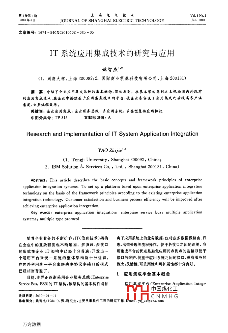 第3卷第2期上海電氣技術(shù)Vol 3 No. 22010年6月JOURNAL OF SHANGHAI ELECTRIC TECHNOLOGYJun.2010文章編號(hào):1674-540X(2010)02-035-05IT系統(tǒng)應(yīng)用集成技術(shù)的研究與應(yīng)用姚智杰,2(1.同濟(jì)大學(xué),上海200092;2.國(guó)際商業(yè)機(jī)器科技有限公司,上海200131)摘要:介紹了企業(yè)應(yīng)用集成系統(tǒng)的基本概念、架構(gòu)原則。在基本架構(gòu)原則之上根據(jù)國(guó)內(nèi)外現(xiàn)有的應(yīng)用集成技術(shù),在企業(yè)中搭建基于應(yīng)用集成技術(shù)的平臺(tái)使企業(yè)在實(shí)現(xiàn)了應(yīng)用集成之后提高客戶(hù)滿(mǎn)意度、業(yè)務(wù)流程效率。關(guān)鍵詞:企業(yè)應(yīng)用集成;企業(yè)服務(wù)總線(xiàn);多應(yīng)用系統(tǒng);多類(lèi)型復(fù)雜應(yīng)用協(xié)議中圖分類(lèi)號(hào):TP315文獻(xiàn)標(biāo)識(shí)碼:AResearch and Implementation of IT System Application IntegrationAO Zhijie,2(1. Tongji University, Shanghai 200092, China;2. IBM Solution &Services Co, Ltd, Shanghai 200131, ChinaAbstract: This article describes the basic concepts and framework principles of enterpriseapplication integration systems. To set up a platform based upon enterprise application integrationtechnology on the basis of the framework principles according to the existing enterprise applicationintegration technology Customer satisfaction and business process efficiency will be improved afterachieving enterprise application integration.Key words: enterprise application integration; enterprise service bus; multiple applicationsystems; multiple type protocol隨著企業(yè)業(yè)務(wù)的不斷擴(kuò)容,IT(信息技術(shù))架構(gòu)離于應(yīng)用系統(tǒng)上的業(yè)務(wù)數(shù)據(jù),僅對(duì)業(yè)務(wù)數(shù)據(jù)做路由、日在企業(yè)中的復(fù)雜程度也不斷增加。多協(xié)議、多接口志、出錯(cuò)處理等流程操作。便于各接口之間的調(diào)用,應(yīng)的形式在企業(yè)IT架構(gòu)中已經(jīng)十分普遍,開(kāi)發(fā)出一用集成平臺(tái)的優(yōu)點(diǎn)是避免應(yīng)用間點(diǎn)到點(diǎn)的連接以便于個(gè)通用平臺(tái)來(lái)統(tǒng)一系統(tǒng)的整體架構(gòu)就十分迫切。接口的維護(hù)側(cè)重于應(yīng)用系統(tǒng)之間的接口,沒(méi)有服務(wù)的在國(guó)外利用統(tǒng)一平臺(tái)來(lái)解決多協(xié)議多接口的模式概念,靈活性可重用性和可擴(kuò)展性都十分良好已經(jīng)相當(dāng)普遍了。目前業(yè)界正逐漸采用企業(yè)服務(wù)總線(xiàn)( Enterprise1應(yīng)用集成平臺(tái)基本概念ervice Bus,ESB)的IT架構(gòu),該架構(gòu)的基本構(gòu)件是抽平臺(tái)( EnterPrise Application Integr中國(guó)煤化工收稿日期:2010-04-01CNMHG作者簡(jiǎn)介:姚智杰(1984-),男,研究生,主要從事軟件工程的研究工作上海電氣技術(shù)2010年第2ation,EAI)的主要目的是整合企業(yè)應(yīng)用,基于ESB(3)系統(tǒng)的出錯(cuò)處理分為松藕合的兩部分。第體系架構(gòu),便于各接口之間的調(diào)用,避免應(yīng)用間點(diǎn)1部分為截獲出錯(cuò)信息和準(zhǔn)備出錯(cuò)信息輸出格式。到點(diǎn)的連接。應(yīng)用集成側(cè)重于應(yīng)用系統(tǒng)之間的接該部分可使用 TryCatch節(jié)點(diǎn)來(lái)截獲所有的出錯(cuò)信口,不需要對(duì)業(yè)務(wù)數(shù)據(jù)執(zhí)行復(fù)雜的操作。息,在準(zhǔn)備好出錯(cuò)消息后將其放入出錯(cuò)信息隊(duì)列,1.1應(yīng)用集成平臺(tái)系統(tǒng)功能定位并返回錯(cuò)誤代碼給請(qǐng)求系統(tǒng)。第2部分將出錯(cuò)消息根據(jù)應(yīng)用集成平臺(tái)所提供的服務(wù),應(yīng)用集成平從出錯(cuò)隊(duì)列中讀出,并寫(xiě)入數(shù)據(jù)庫(kù)的出錯(cuò)表。使用臺(tái)在商業(yè)應(yīng)用中可以定位為以下幾個(gè)層面,如圖1。松藕合的兩部分的目的是為了提高應(yīng)用集成平臺(tái)的回復(fù)效率。第5層:跨企業(yè)系統(tǒng)整合(B2B)(4)統(tǒng)一錯(cuò)誤信息格式。在出錯(cuò)信息中,應(yīng)包含請(qǐng)求方系統(tǒng)、目標(biāo)系統(tǒng)、消息ID、出錯(cuò)代碼、出錯(cuò)第4層:工作流管理( Workflow)信息、出錯(cuò)時(shí)間戳等信息。統(tǒng)一的出錯(cuò)格式便于使第3層:自動(dòng)化流程管理( Process Choreography)用統(tǒng)一的出錯(cuò)管理程序進(jìn)行統(tǒng)一的出錯(cuò)監(jiān)控、查錯(cuò)及糾錯(cuò)處理。第2層:數(shù)據(jù)整合層 Format and Transform)(5)應(yīng)用集成平臺(tái)上的消息流必須能提供進(jìn)入應(yīng)用集成平臺(tái),離開(kāi)應(yīng)用集成平臺(tái)的日志。具體說(shuō)來(lái)第1層:信息傳輸( Mediation, Queuing, Routing, Pub/Sub)是在4個(gè)點(diǎn)上記錄日志:第1點(diǎn)是從源請(qǐng)求系統(tǒng)進(jìn)田1應(yīng)用集成平臺(tái)定位示意圖人消息流;第2點(diǎn)是當(dāng)消息遞交紿目標(biāo)系統(tǒng)之前;第3信息傳輸層基本上是一個(gè)在技術(shù)層面上通過(guò)點(diǎn)是在接收到目標(biāo)系統(tǒng)回復(fù)的時(shí)候;第4點(diǎn)是在回復(fù)標(biāo)準(zhǔn)協(xié)議和不同的中間件技術(shù)(同步交互、異步交源請(qǐng)求系統(tǒng)之前。日志的格式必須統(tǒng)一,應(yīng)包括時(shí)間戳、原消息及節(jié)點(diǎn)類(lèi)型。日志應(yīng)記錄在數(shù)據(jù)庫(kù)中的日互、隊(duì)列、路由、可靠傳輸、發(fā)布/定閱等)來(lái)整合不同的