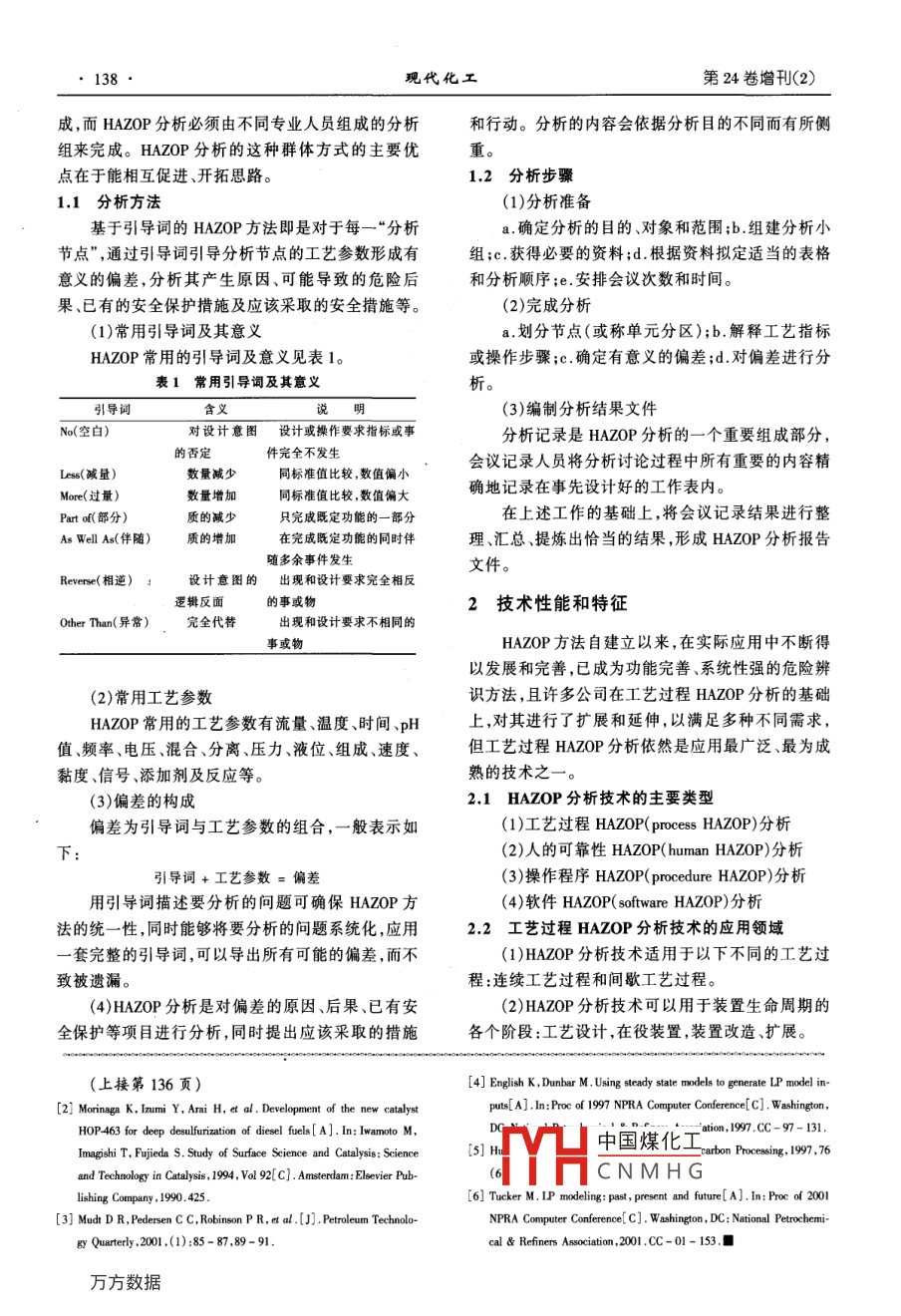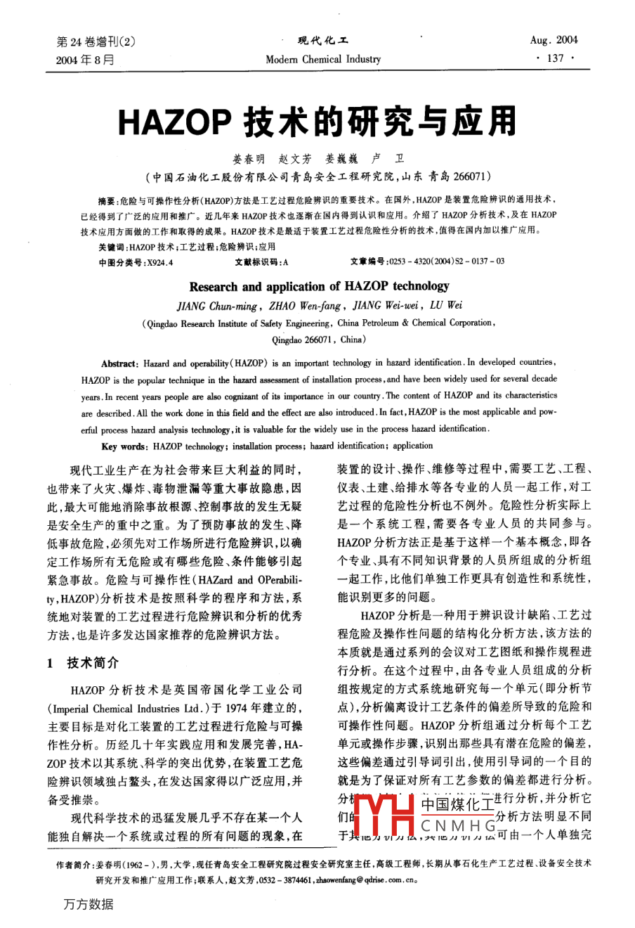 第24卷增刊(2)現(xiàn)代化工Aug.20042004年8月Modern Chemical Industry137HAZOP技術(shù)的研究與應(yīng)用姜春明趙文芳姜巍巍盧衛(wèi)(中國石油化工股份有限公司青島安全工程研究院,山東青島26071)摘要:危險(xiǎn)與可操作性分析( HAZOP)方法是工藝過程危險(xiǎn)辨識(shí)的重要技術(shù)。在國外, HAZOP是裝置危險(xiǎn)辨識(shí)的通用技術(shù)已經(jīng)得到了廣泛的應(yīng)用和推廣。近幾年來HAZP技術(shù)也逐漸在國內(nèi)得到認(rèn)識(shí)和應(yīng)用。介紹了 HAZOP分析技術(shù),及在HAOP技術(shù)應(yīng)用方面做的工作和取得的成果。HAZO技術(shù)是最適于裝置工藝過程危險(xiǎn)性分析的技術(shù)值得在國內(nèi)加以推廣應(yīng)用。關(guān)鍵詞: HAZOP技術(shù);工藝過程;危險(xiǎn)辨識(shí);應(yīng)用中圖分類號(hào):X924.4文獻(xiàn)標(biāo)識(shí)碼:A文章編號(hào):0253-4320(2004)s2-0137-03Research and application of HAZOP technologyJIANG Chun-ming, ZHAO Wen-fang, JIANG Wei-tcei, LU WeQingdao Research Institute of Safety Engineering, China Petroleum Chemical CorporationAbstract: Hazard and operability(HAZOP)is an important technology in hazard identification. In developed countriesHAZOP is the popular technique in the hazard assessment of installation process, and have been widely used for several decadeyears. In recent years people are also cognizant of its importance in our country. The content of HAZOP and its characteristicsare described. All the work done in this field and the effect are also introduced. In fact, HAZOP is the most applicable and powit is valuable for the widely use in the process hazard identificationKey words: HAZOP technology installation process: hazard identification; application現(xiàn)代工業(yè)生產(chǎn)在為社會(huì)帶來巨大利益的同時(shí)裝置的設(shè)計(jì)、操作、維修等過程中,需要工藝、工程、也帶來了火災(zāi)爆炸、毒物泄漏等重大事故隱患,因儀表、土建給排水等各專業(yè)的人員一起工作,對(duì)工此,最大可能地消除事故根源控制事故的發(fā)生無疑藝過程的危險(xiǎn)性分析也不例外。危險(xiǎn)性分析實(shí)際上是安全生產(chǎn)的重中之重。為了預(yù)防事故的發(fā)生、降是一個(gè)系統(tǒng)工程,需要各專業(yè)人員的共同參與。低事故危險(xiǎn),必須先對(duì)工作場所進(jìn)行危險(xiǎn)辨識(shí)以確 HAZOP分析方法正是基于這樣一個(gè)基本概念,即各定工作場所有無危險(xiǎn)或有哪些危險(xiǎn)、條件能夠引起個(gè)專業(yè)、具有不同知識(shí)背景的人員所組成的分析組緊急事故。危險(xiǎn)與可操作性( HAZard and OPerabil一起工作,比他們單獨(dú)工作更具有創(chuàng)造性和系統(tǒng)性ty, HAZOP)分析技術(shù)是按照科學(xué)的程序和方法,系能識(shí)別更多的問題。統(tǒng)地對(duì)裝置的工藝過程進(jìn)行危險(xiǎn)辨識(shí)和分析的優(yōu)秀HAZOP分析是一種用于辨識(shí)設(shè)計(jì)缺陷、工藝過方法,也是許多發(fā)達(dá)國家推薦的危險(xiǎn)辨識(shí)方法。程危險(xiǎn)及操作性問題的結(jié)構(gòu)化分析方法,該方法的本質(zhì)就是通過系列的會(huì)議對(duì)工藝圖紙和操作規(guī)程進(jìn)1技術(shù)簡介行分析。在這個(gè)過程中,由各專業(yè)人員組成的分析HAZOP分析技術(shù)是英國帝國化學(xué)工業(yè)公司組按規(guī)定的方式系統(tǒng)地研究每一個(gè)單元(即分析節(jié)( Imperial Chemical Industries Ltd.)于1974年建立的,點(diǎn)),分析偏離設(shè)計(jì)工藝條件的偏差所導(dǎo)致的危險(xiǎn)和主要目標(biāo)是對(duì)化工裝置的工藝過程進(jìn)行危險(xiǎn)與可操可操作性問題。 HAZOP分析組通過分析每個(gè)工藝作性分析。歷經(jīng)幾十年實(shí)踐應(yīng)用和發(fā)展完善,HA-單元或操作步驟,識(shí)別出那些具有潛在危險(xiǎn)的偏差ZOP技術(shù)以其系統(tǒng)、科學(xué)的突出優(yōu)勢(shì),在裝置工藝危這些偏差通過引導(dǎo)詞引出,使用引導(dǎo)詞的一個(gè)目的險(xiǎn)辨識(shí)領(lǐng)域獨(dú)占鰲頭,在發(fā)達(dá)國家得以廣泛應(yīng)用,并就是為了保證對(duì)所有工藝參數(shù)的偏差都進(jìn)行分析。備受推崇。分中國煤化工行分析,并分析它現(xiàn)代科學(xué)技術(shù)的迅猛發(fā)展幾乎不存在某一個(gè)人們能獨(dú)自解決一個(gè)系統(tǒng)或過程的所有問題的現(xiàn)象,在YHSCNMHG分析方法明顯不同,把力力云可由一個(gè)人單獨(dú)完作者簡介:姜春明(1962-),男,大學(xué),現(xiàn)任青島安全工程研究院過程安全研究室主任,高級(jí)工程師,長期從事石化生產(chǎn)工藝過程、設(shè)備安全技術(shù)研究開發(fā)和推廣應(yīng)用工作;聯(lián)系人,趙文芳,0532-3874461,zhaowenfang@qdie,com.cne138代第24卷增刊(2)成,而 HAZOP分析必須由不同專業(yè)人員組成的分析和行動(dòng)。分析的內(nèi)容會(huì)依據(jù)分析目的不同而有所側(cè)組來完成。 HAZOP分析的這種群體方式的主要優(yōu)重點(diǎn)在于能相互促進(jìn)、開拓思路。12分析步驟11分析方法(1)分析準(zhǔn)備基于引導(dǎo)詞的 HAZOP方法即是對(duì)于每一“分析a確定分析的目的、對(duì)象和范圍;b組建分析小節(jié)點(diǎn)”,通過引導(dǎo)詞引導(dǎo)分析節(jié)點(diǎn)的工藝參數(shù)形成有組;c.獲得必要的資料;d.根據(jù)資料擬定適當(dāng)?shù)谋砀褚饬x的偏差,分析其產(chǎn)生原因、可能導(dǎo)致的危險(xiǎn)后和分析
