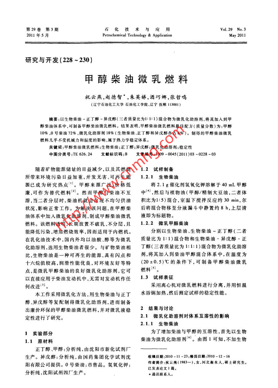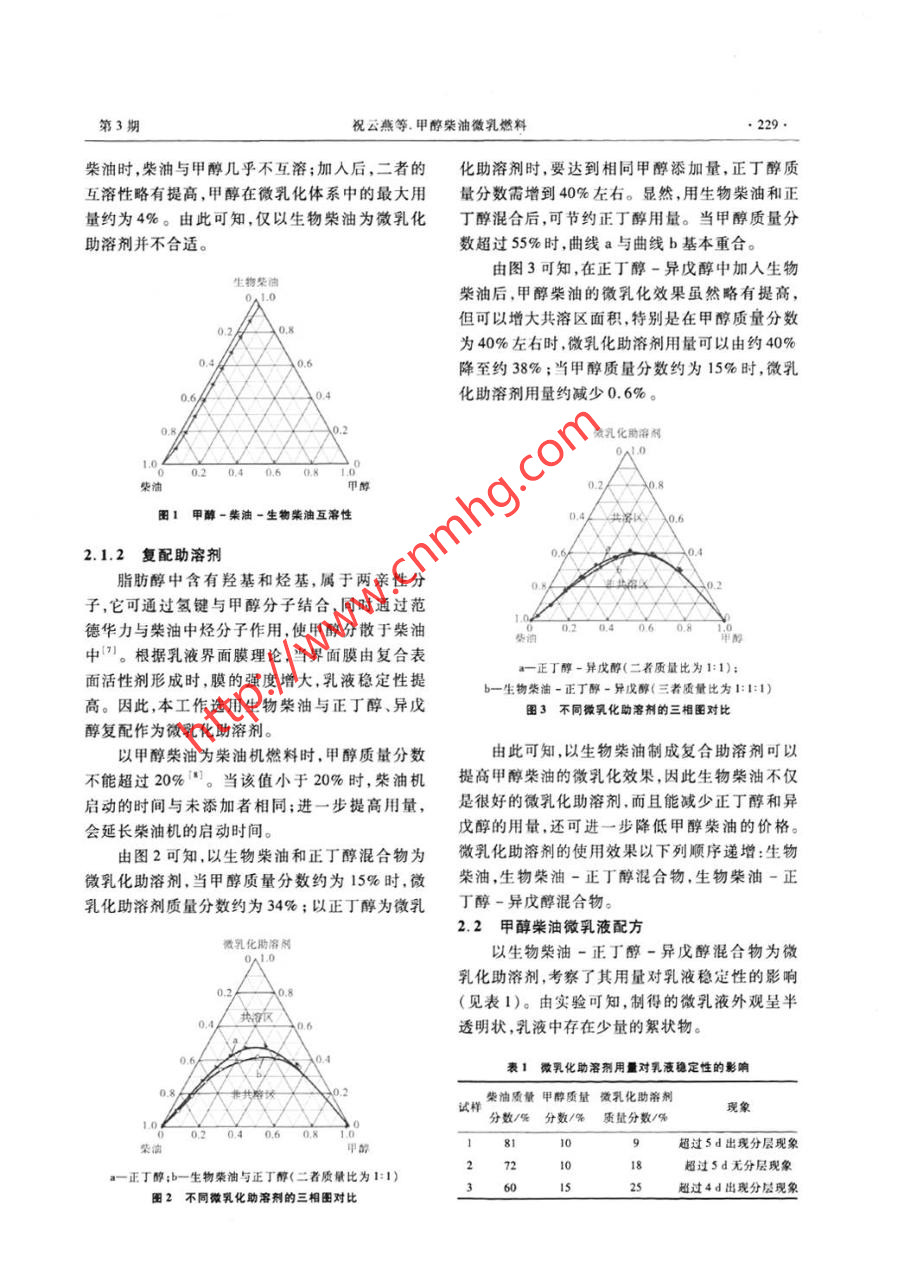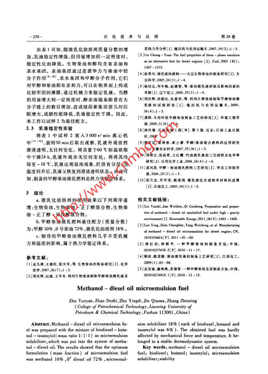 第29卷第3期石化技術與應用Vol.29 No.2011年5月Petrochemical Technology & ApplicationMay 2011研究與開發(fā)(228 ~ 230)甲醇柴油微乳燃料祝云燕,趙德智° ,朱英娣,酒巧娜,張哲嗚(遼寧石油化工大學石油化工學院,遼寧撫順113001)摘要:以生物柴油-正丁醇-異戊醇(三者質量比為1:1:1)混合物為微乳化助溶劑,將其加人到甲醇柴油體系中,可制備甲醇柴油微乳燃料。結果表明,甲醇柴油微乳燃料最佳配方(質量分數)為:甲醇10% ,0號柴油72% ,微乳化助落劑18% (生物柴油、正丁醇和異戊醇各占6%)。制得的甲醇柴油微乳燃料幾乎不受機械力和溫度的影響.屬于熱力學穩(wěn)定體系。關鍵詞:甲醇柴油微乳燃料;生物柴油;正丁醇;異戊醇;微乳化助溶劑;穩(wěn)定性中圖分類號:TE626.24文獻標識碼:B文章編號:1009 - 0045(2011)03 -0228 -03隨著礦物能源儲址的日益減少,以及其燃燒1.2 試樣制備所帶來環(huán)境污染日益加重,開發(fā)無害可再生能1.2.1生物 柴油源已成為研究熱點"。甲醇來源廣泛,價格低將2.1 g催化劑氫氧化鉀溶解于40 mL甲醇廉,可作為替代燃料[2]。然而甲醇與柴油不互中4),然后與植物油(甲醇/精制大豆油,二者體溶,當二者分層時,柴油機就會出現不均勻供油積比為1:5)混合,室溫下攪拌反應約30 min, 爾狀況,影響正常工作。為解決該問題,在甲醇柴后將混合物移至分液漏斗中靜置約8 h,上層清油體系中加人微乳化助溶劑,制成甲醇柴油微乳液即為標題物。燃料。該燃料透明,長期放置不破乳、不分層,且1.2.2微乳甲 醇柴油能降低污染,增加燃燒效率,因而適用于內燃機。分別以生物柴油、生物柴油-正丁醇(二者在乳化油技術中,國內外均以油酸、醇等為微乳質量比為1:1)混合物和生物柴油-異戊醇-正化助溶劑,選用生物柴油者很少。與礦物柴油相丁醇(三者質量比為1:1:1)混合物為微乳化助溶比,生物柴油是一種可再生的能源,具有閃點和劑,將其加人到柴油甲醇混合體系中,在溫度為十六烷值較高,潤滑性能優(yōu)良,對環(huán)境友好等特(20+0.5)C的條件下,可制備甲醇柴油微乳點,是微乳甲醇柴油的良好微乳化助溶劑,它可燃料[51。以直接應用于柴油發(fā)動機中,無需對發(fā)動機作任1.3試樣表征何改進川。采用離心機對微乳燃料進行分離,并用恒溫本工作采用微乳化方法,用生物柴油與正丁水浴鍋加熱,然后測定試樣的穩(wěn)定性能。醇、異戊醇等復配制得微乳化助溶劑,進而制備出廉價環(huán)保的甲醇柴油微乳燃料,并對微乳液穩(wěn)2結果與討論定性進行了研究。2.1 微乳化助溶劑對體系互溶性的影響2.1.1生 物柴油1實驗部分為了增加柴油與甲醇的互溶性,首先以生物1.1原材料柴油為微乳化助溶劑0]。由圖1可知,不加生物.正丁醇、甲醇:分析純,由沈陽市新化試劑廠生產。異戊醇:分析純,由國藥集團化學試劑沈收稿日期:2010 -11 -23;修回日期:2010-12 -16陽有限公司提供。0號柴油:市售品。氫氧化鉀:作者簡介:祝云燕(1983一),女,河北衡水人,碩士研究生。已發(fā)表論文1篇。分析純,沈陽試劑四廠生產?!敉ㄓ嵚撓等?。.第3期祝云燕等.甲醇柴油微乳燃料. 229.柴油時,,柴油與甲醇幾乎不互溶;加入后,二者的化助溶劑時,要達到相同甲醇添加量,正丁醇質互溶性略有提高,甲醇在微乳化體系中的最大用量分數霜增到40%左右。顯然,用生物柴油和正量約為4%。由此可知,僅以生物柴油為微乳化丁醇混合后,可節(jié)約正丁醇用量。當甲醇質量分助溶劑并不合適。數超過55%時,曲線a與曲線b基本重合。由圖3可知,在正丁醇-異戊醇中加人生物生物柴油柴油后,甲醇柴油的微乳化效果雖然略有提高,但可以增大共溶區(qū)面積,特別是在甲醇質量分數0.20.8為40%左右時,微乳化助溶劑用量可以由約40%0.6降至約38%;當甲醇質量分數約為15%時,微乳0.6/化助溶劑用量約減少0. 6%。+0.2微乳化助溶劑10柴油甲醇.2大30.8團1甲醇-柴油一生物柴油互溶性0.4-0.2.1.2復 配助溶劑.0..4脂肪醇中含有羥基和烴基,屬于兩親性分子,它可通過氫鍵與甲醇分子結合,同時通過范德華力與柴油中烴分子作用,使甲醇分散于柴油柴酒0.2 0.4 06 03中”。根據乳液界面膜理論,當界面膜由復合表a一正丁醇-異戊酶(二者質量比為1:1):面活性劑形成時,膜的強度增大,乳液穩(wěn)定性提b-生物柴油一正丁酶-異戊醇(三者質量比為1:1:1)高。因此,本工作選用生物柴油與正丁醇、異戊團3不同微乳化助溶劑的三相圖對比醇復配作為微乳化助溶劑。以甲醇柴油為柴油機燃料時,甲醇質量分數由此可知,以生物柴油制成復合助溶劑可以不能超過20%日。當該值小于20%時,柴油機提高甲醇柴油的微乳化效果,因此生物柴油不僅啟動的時間與未添加者相同;進一步提高用量,是很好的微乳化助溶劑,而且能減少正丁醇和異會延長柴油機的啟動時間。戊醇的用量,還可進一步降低甲醇柴油的價格。由圖2可知,以生物柴油和正丁醇混合物為微乳化助溶劑的使用效果以下列順序遞增:生物微乳化助溶劑,當甲醇質量分數約為15%時,微柴油,生物柴油一正丁醇混合物,生物柴油-正乳化助溶劑質量分數約為34%;以正丁醇為微乳丁醇-異戊醇混合物。2.2甲 醇柴油微乳液配方以生物柴油-正丁醇-異戊醇混合物為微乳化助溶劑,考察了其用量對乳液穩(wěn)定性的影響8(見表1)。由實驗可知,制得的微乳液外觀呈半共透明狀,乳液中存在少量的絮狀物。0.%大40.4表1微乳化助溶劑用量對乳液穩(wěn)定性的影響-世共希訪一大--0.2試樣柴油