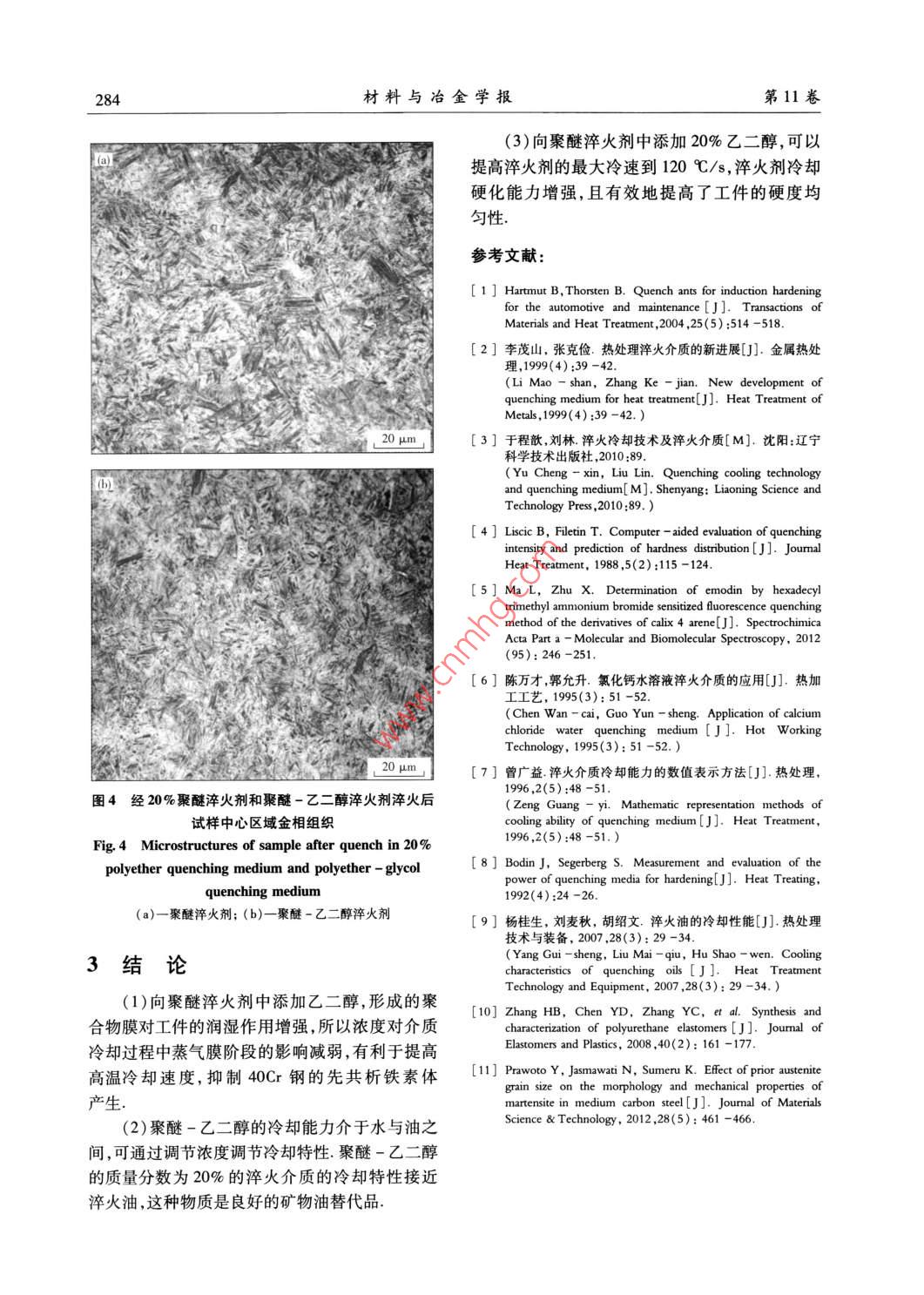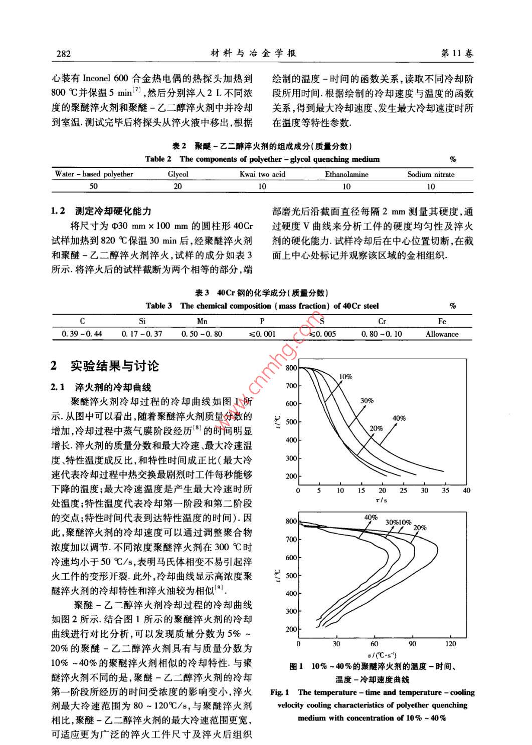 第11卷第4期材料與冶金學報 Vol. 11 No.42012年12月 Journal of Materials and MetallurgyDec.2012添加乙二醇對聚醚淬火劑冷卻特性的影響祖國胤,王漪瓊,張精華,盧日環(huán)(東北大學材料與冶金學院,沈陽110819)摘要:通過測試聚醚淬火劑和聚醚-乙二醇淬火劑的冷卻曲線、冷卻硬化能力來評價乙二醇的加入對聚醚淬火劑冷卻性能的影響,研究結果表明:乙二醇質量分數為2%的聚醚乙二醇淬火劑具有良好的冷卻特性,聚醚-乙二醇淬火劑的質量分數為5%時的最大冷卻速度可達120℃/s,且可有效抑制40Cr鋼的先共析鐵素體產生.向聚醚淬火劑中添加乙二醇可使淬火劑的冷卻硬化能力增強,并有效提高了工件的硬度均勻性關鍵詞:乙二醇;聚醚淬火劑;冷卻特性;冷卻硬化能力中圖分類號:TG154.4文獻標識碼:A文章編號:1671-6620(2012)04-0281-04 Effect of adding glycol on cooling characteristics of polyether quenching medium ZU Guo-yin, WANG Yi-qiong, ZHANG Jing-hua, LU Ri-huan (School of Materials and Metallurgy, Northe y, Shenyang 1108i9, China Abstract: The effect of adding glycol on cooling characteristics of polyether quenching medium was measured in this paper based on the cooling curves and cooling hardening ability of polyether quenching medium and polyether -glyco ol quenching medium. It's found that the quenching medium with 20 percent glycol has a good cooling characteristics. The polyether- glycol quenching medium with concentration of 5 percent reaches maximum cooling velocity of 120/s, and effectively restrains the formation of proeutectoid ferrite in 40Cr steel. The addition of glycol into polye ter asuenching medieum imerove ther coling barde inga oifrmrdrning abilirf workpiece. Key words: glycol; polyether quenching medium; cooling characteristics; cooling h ing abilit聚醚型水溶性淬火劑是一類具有逆溶性、冷的變化淬火后工件的硬度均勻性和淬火劑老化卻速度可調、熱穩(wěn)定性好、防淬裂效果明顯、無毒規(guī)律的影響,為實際生產工藝提供參考依據研究不污染金屬零件表面、便于清洗、節(jié)約能耗等特點中開發(fā)的聚醚淬火劑的成分如表1所示的新型淬火劑4,在熱處理生產中有廣泛的應表1聚醚淬火劑的組成成分(質量分數)用前景.已報道的聚醚型水溶性淬火劑通常由環(huán) Table1 The components mass fraction) of polyether氧乙烷和環(huán)氧丙烷通過無規(guī)則共聚反應制 quenching medium%得56,但其成本價格較高,且存在易老化、淬火 Water-based后工件硬度均勻性不足等缺點 polyether Kwai two acid Ethanolanine Sodium nitrate在系統(tǒng)分析淬火劑主要成分對材料組織與性70101010能影響規(guī)律的基礎上,本研究嘗試采用將性能穩(wěn)定、黏度較小、相對分子質量較低的乙二醇添加到為了改善聚醚淬火劑的性能,向其中加入乙聚醚淬火劑中,以期顯著改善淬火劑的冷卻性能二醇配制聚醚乙二醇淬火劑,其成分如表2所示1實驗材料及方法1.1測定冷卻曲線本文主要研究乙二醇對聚醚淬火劑冷卻特性根據GB/T7951標準的規(guī)定,將一個幾何中收稿日期:201209-13.基金項目:國家自然學基金資,北大學,高校基本科研業(yè)務費0作者簡介:祖國胤(1977),男,東北大學副教授,-mail: zugy smm neuedu.cn282材料與冶金學報第11卷心裝有 Inconel600合金熱電偶的熱探頭加熱到繪制的溫度時間的函數關系,讀取不同冷卻階800℃并保溫5min,然后分別淬入2L不同濃段所用時間.根據繪制的冷卻速度與溫度的函數度的聚醚淬火劑和聚醚-乙二醇淬火劑中并冷卻關系得到最大冷卻速度、發(fā)生最大冷卻速度時所到室溫測試完畢后將探頭從淬火液中移出,根據在溫度等特性參數表2聚醚-乙二醇淬火劑的組成成分(質量分數) Table The components of polyether-glycol quenching medium% Water-based polyether Glycol Kwai two acid Ethanolamine Sodium nitrate50201010101.2測定冷卻硬化能力部磨光后沿截面直徑每隔2mm測量其硬度,通將尺寸為30mm×100mm的圓柱形40Cr過硬度V曲線來分析工件的硬度均勻性及淬火試樣加熱到820℃保溫30min后,經聚醚淬火劑劑的硬化能力試樣冷卻后在中心位置切斷,在截和聚醚-乙二醇淬火劑淬火,試樣的成分如表3面上中心處標記并觀察該區(qū)域的金相組織所示將淬火后的試樣截斷為兩個相等的部分,端表340Cr鋼的化學成分(質量分數) Table3 The chemical composition( mass fraction)of40 0Cr steel%C Si MnPS Cr Fe0.39~0.440.17~0.370.50~0.80≤0.001≤0.0050.80~0.10 Allowance2實驗結果與討論80010%2.1淬火劑的冷卻曲線700聚醚淬火劑冷卻過程的冷卻曲線如圖1所60030%示.從圖中可以看出,隨著聚醚淬火劑質量分數的50040%增加,冷卻過程中蒸氣膜階段經歷的時間明顯20%增長.淬火劑的質量分數和最大冷速、最大冷速溫400度、特性溫度成反比,和特性時間成正比(最大冷300速代表冷卻過程中熱交換最劇烈時工件每秒能夠200下降的溫度;最大冷速溫度是產生最大冷速時所0510152025303540處溫度;特性溫度代表冷卻第一階段和第二階段/s的交點;特性時間代表到達特性溫度的時間)因80040%30%10%此,聚醚淬火劑的冷卻速度可以通過調整聚合物20%700濃度加以調節(jié)不同濃度聚醚淬火劑在300℃時冷速均小于50℃/s,表明馬氏體相變不易引起淬600火工件的變形開裂此外,冷卻曲線顯示高濃度聚500醚淬火劑的冷卻特性和淬火油較為相似400聚醚-乙二醇淬火劑冷卻過程的冷卻曲線300如圖2所示.結合圖1所示的聚醚淬火劑的冷卻曲線進行對比分析,可以發(fā)現質量分數為5%~20020%的聚醚-乙二醇淬火劑具有與質量分數為0306090120v/(℃.s)10%~40%的聚