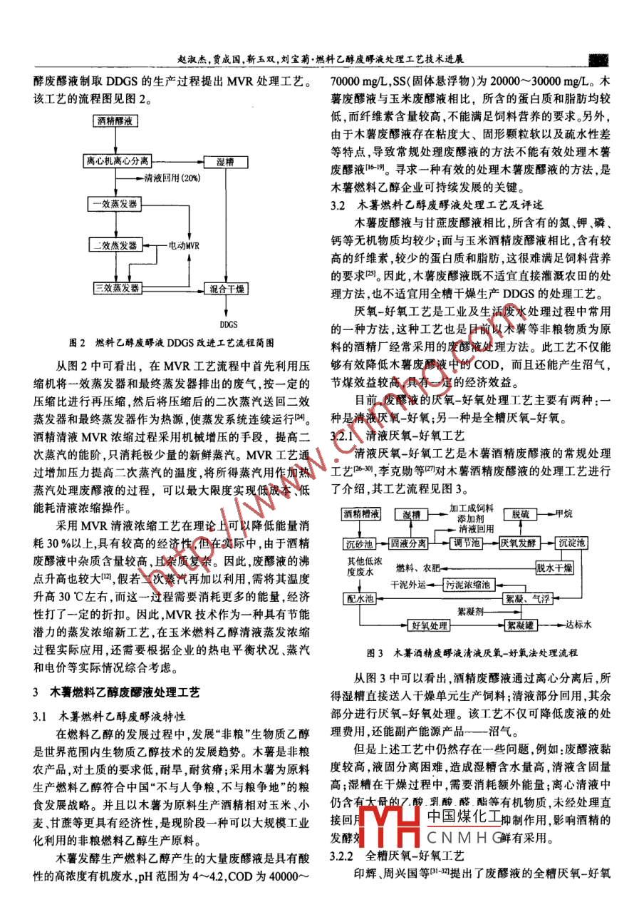 釀酒科技2010年第9期(總第195期)· LIQUOR- MAKING SCIENCE& TECHNOLOGY2010No.9Tol195)燃料乙醇廢醪液處理工藝技術(shù)進(jìn)展趙淑杰',賈成國(guó)2,靳玉雙3,劉寶菊4(1天津大學(xué)石油化工技術(shù)開(kāi)發(fā)中心,天津300072;2廣西中糧生物質(zhì)能源有限公司,廣西北海530028;3中糧生物質(zhì)能源(肇東)有限公司,黑龍江肇東151100;4天津天大天久科技股份有限公司,天津300072)摘要:燃料乙醇廢嘐液是一種高濃度有機(jī)廢水處理量大,過(guò)程復(fù)雜,節(jié)能潛力大。分別對(duì)甘蔗、玉米和木薯生產(chǎn)燃料乙醇過(guò)程中所產(chǎn)生的廢醪液的特性進(jìn)行了概述,并對(duì)3種廢醪液的處理工藝進(jìn)行了分析評(píng)述。長(zhǎng)期采用農(nóng)灌法處理甘蔗廢醪液易使土壤板結(jié);DDGS及MVR燕發(fā)濃縮技術(shù)處理玉米廢醪液能夠充分回收其中的營(yíng)養(yǎng)物質(zhì),經(jīng)濟(jì)性妤;木薯廢醪液含有較高的纖維素,較少蛋白質(zhì)和脂肪,適于采用厭氧-好氧工藝進(jìn)行處理。燃料乙醇廢醪液處理方案需根據(jù)生產(chǎn)原料及產(chǎn)品方案的變化進(jìn)行調(diào)整,以實(shí)現(xiàn)燃料乙醇生產(chǎn)全過(guò)程的高效、低碳及清潔。關(guān)鍵詞:燃料乙醇;廢醪液;DDGS;MvR;厭氧-好氧技術(shù)中圖分類號(hào):TS2622;TS2614文獻(xiàn)標(biāo)識(shí)碼:A文章編號(hào):1001-9286(2010)09-0081-05Technical Progress in the Treatment of waste mash in Fuel Ethanol productionZHAO Shu-jie, JIA Cheng-guo?, JIN Yu-shuang and LIU Bao-ju'(l. Petrochemical Technology R& D Center of Tianjin University, Tianjin 300072; 2. Guangxi COFCO Biomass EnergyCo. Ltd, Beihai, Guangxi 530028; 3. COFCO Biomass Energy(Zhaodong) Co. Ltd, Zhaodong, Heilongjiang 151100;4. Tianjin Tianjiu Science& Technology Co Ltd, Tianjin 300072, China)Abstract: Waste mash produced in fuel ethanol production is a kind of high-concentration organic wastewater. There is a great potential for ener-gy saving in the treatment of such wastewater for its large amount and its complex processing procedures. The properties of waste mash in fuelethanol production produced by sugar cane, corm and cassava respectively were analyzed. In addition, the treatment techniques of the three kindsof waste mash were reviewed. Long-term agricultural irrigation treatment of waste mash from sugarcane would easily result in soil hardeningDDGS and MVR treatment of waste mash from com could fully reclaim its nutrients and such treatment has high economical efficieny. Anaero-bic-aerobic technology is suitable for the treatment of waste mash from cassava because it contains higonclusion, the selection of proper treatment of waste mash should depend on raw materials in fuelroduction so that high-efficiency,low-carbon and clean fuel ethanol production could be achievedKey words: fuel ethanol; waste mash; DDGS; MVR; anaerobic-aerobic technology隨著石油、天然氣等不可再生能源的日趨緊張以及液的處理工藝復(fù)雜而且能耗高,在一定程度上影響著燃全球溫室效應(yīng)等環(huán)境問(wèn)題的日益嚴(yán)重能源安全以及環(huán)料乙醇生產(chǎn)工業(yè)的發(fā)展。境污染已經(jīng)成為每一個(gè)國(guó)家經(jīng)濟(jì)發(fā)展中不可忽視的問(wèn)本文將對(duì)甘蔗、玉米和木薯生產(chǎn)燃料乙醇產(chǎn)生的廢題。燃料乙醇作為一種綠色的可再生燃料,由于其具有醪液特性進(jìn)行分析,并在此基礎(chǔ)上對(duì)這些原料產(chǎn)生的廢辛烷值較髙、抗爆性能好、容易完全燃燒、尾氣排放量少醪液的處理工藝過(guò)程進(jìn)行歸納和闡述,可為燃料乙醇企和環(huán)境污染少等優(yōu)點(diǎn),被認(rèn)為是未來(lái)化石能源的理想替業(yè)廢醪液處理工藝的選擇提供一定的借鑒。代品,受到世界各國(guó)的重視,具有很大的發(fā)展?jié)摿褪?甘蔗燃料乙醇廢醪液處理工藝場(chǎng)空間。目前,燃料乙醇生產(chǎn)的主要原料是甘蔗、玉米和木薯1.1甘蔗燃料乙醇廢醪液特性等原料,在生產(chǎn)過(guò)程中會(huì)產(chǎn)生大量的廢醪液。這些廢醪甘蔗是生產(chǎn)燃料乙醇的主要原料。生產(chǎn)燃料乙醇過(guò)液如果處理得當(dāng),不但能夠解決對(duì)環(huán)境造成的污染問(wèn)程中,通常將甘蔗經(jīng)壓榨等一系列處理得到的蔗汁直接題,還能獲得較高經(jīng)濟(jì)價(jià)值的副產(chǎn)品。然而,由于廢醪發(fā)酵YH中國(guó)煤化工量的廢醪液。據(jù)統(tǒng)計(jì),CNMHG收稿日期:201007-21作者簡(jiǎn)介:趙淑杰(1987-),女,碩士。通訊作者:劉寶菊(1966-),女,天津人,工學(xué)碩士,高級(jí)工程師,主要研究方向?yàn)榛み^(guò)程新工藝及工程化研究。釀酒科技2010年第9期(總第195期) LIQUOR-MAKING SCIENCE& TECHNOLOGY2009g09每生產(chǎn)1t燃料乙醇將排放13~18t廢醪液。甘蔗廢醪工藝最早出現(xiàn)在20世紀(jì)40年代的美國(guó)燃料乙醇生產(chǎn)企液呈酸性pH值在40~48范圍內(nèi);廢液的化學(xué)需氧量業(yè)我國(guó)直到20世紀(jì)80年代才開(kāi)始出現(xiàn)。目前DDGs(COD)和生物耗氧量(BOD)很高。處理工藝是我國(guó)大多數(shù)酒精廠經(jīng)常采用的處理酒精廢醪甘蔗廢醪液所含主要成分的組成見(jiàn)表1。從表1中液的一種工藝路線。此處理工藝在利用玉米原料生產(chǎn)燃可以看出,甘蔗燃料乙醇廢醪液中含有大量的有機(jī)物質(zhì)料乙醇時(shí)還能得到DDGS產(chǎn)品,不但充分利用了資源,和可供植物利用的氮、磷、鉀等無(wú)機(jī)物質(zhì),除此以外,廢還降低了燃料乙醇的生產