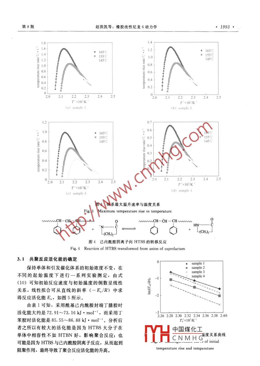 第58卷第8期化工學(xué)Vol 58 No 82007年8月Journal of Chemical Industry and Engineering (China)August 2007研究論文橡膠改性尼龍6動力學(xué)趙洪凱',錢春香12,喬淑媛(東南大學(xué)材料科學(xué)與工程學(xué)院;2東南大學(xué)綠色建材技術(shù)研究所,江蘇南京210096)摘要:采用?;簝?nèi)酰胺封端的丁腈橡膠( CHTBN)或丁苯橡膠( CHTBS)與NaOH作為引發(fā)催化體系,反應(yīng)溫度在145~160℃之間,通過絕熱法測定反應(yīng)過程的溫升曲線,計算得到了動力學(xué)參數(shù)。采用 CHTEN/NaOH時反應(yīng)級數(shù)為一級,活化能在72.91~73.16kJ·mol-之間,指前因子在3.22×101~3.38×10mol范圍內(nèi);采用 CHTES/NaOH時反應(yīng)級數(shù)在1.23~1.34之間,偏離了1級反應(yīng),活化能在85.55~86.88kJ·mol之間,指前因子在4.52×101~5.09×101moP·s范圍內(nèi)。在前人工作的基礎(chǔ)上建立了陰離子聚合絕熱反應(yīng)動力學(xué)模型并對反應(yīng)過程進行了模擬,結(jié)果與實驗溫升曲線具有很好相關(guān)性,從而證明了模型的關(guān)鍵詞:己內(nèi)酰胺;橡膠;尼龍6;絕熱反應(yīng);陰離子;動力學(xué)中圖分類號:TQ316.32+4文獻標識碼:A文章編號:0438-1157(2007)08-1989-07Kinetics of rubber-modified nylon 6ZHAO Hongkai, QIAN Chunxiang. QIAO ShuyuanSchool of Materials Science and Engineering: 'Research Institute ofGreen Construction Materials, Southeast University, Nanjing 210096, Jiangsu, China)Abstract: Kinetic parameters were calculated based on the curve of reactive temperature rise measured withthe adiabatic approach in the temperature range of 145C to 160C for the catalytic system of NaOH andacyl caprolactam end-capped butadiene-acrylonitrile rubber( CHTBN) or styrene-butadiene rubber(CHTBS). The reaction was first order, the activation energy was between 72 91-73. 16 kJ. mol andthe pre-exponential factor was between 3 22 10-3. 38 X 10 moll-".s-I in the system of CHTBN/NaOH. While in CHTBS/NaOH, the reaction order was between 1. 23-1. 34, the activation energy wasbetween 85 55-86. 88 kJ. mol and the pre-exponential factor was between 4. X 10 1-5. 09x 101s. The adiabatic reaction kinetic model of caprolactam anion was established based on priorresearch findings, and the polymerization reaction was simulated with the kinetic model The agreementbetween simulation results and experimental data showed that the model was reasonable and correctKey words: caprolactam; rubber; nylon 6; adiabatic reaction; anion; kinetics引言學(xué)可以更好地預(yù)測聚合反應(yīng),對實際生產(chǎn)有指導(dǎo)意義。已內(nèi)酰胺陰離子聚合反應(yīng)速度極快,單體的全已內(nèi)酰胺陰離子聚合制得的尼龍6性能優(yōu)于普部轉(zhuǎn)化只需幾分鐘,甚至幾秒鐘。應(yīng)用絕熱法研究通合成路線制品,工業(yè)上應(yīng)用廣泛,研究反應(yīng)動力反應(yīng)動力學(xué)顯得特別有效,它是一種快速、簡便而2006-08-14收到初稿,2006-11-30收到修改稿聯(lián)系人:錢春香。第一作者:趙洪凱(1974-),男,博土研化第58卷又可靠地獲得放熱反應(yīng)動力學(xué)數(shù)據(jù)的方法。己內(nèi)酰J·g-1·K-1,c為1.4103~1.5564J·g1胺陰離子開環(huán)聚合是通過活性單體(即己內(nèi)酰胺鈉K,一△H1為138.6J·g-,-△H為207.9或者己內(nèi)酰胺溴化鎂等內(nèi)酰胺陰離子)進攻鏈端·g-1,X可取0.4N酰胺基上的羰基碳原子,連續(xù)引發(fā)聚合。已內(nèi)由于己內(nèi)酰胺單體陰離子聚合過程中,體系為酰胺陰離子在高溫下(210℃以上)可以進攻單體聚合體與單體混合物,單體對尼龍6結(jié)晶的影響上的羰基碳原子,生成二聚體引發(fā)聚合,此反應(yīng)活反應(yīng)溫度的強烈變化、橡膠相的存在等,使尼龍結(jié)化能高達215kJ·mol,難以實際應(yīng)用。通常晶行為變得非常復(fù)雜,所以很難用常規(guī)方法將結(jié)晶另外加入N?;瘍?nèi)酰胺物質(zhì)與己內(nèi)酰胺陰離子組放熱準確計量出來,故式(1)很難應(yīng)用。 Magill成引發(fā)劑催化劑體系,使反應(yīng)活化能大大降低。等1研究發(fā)現(xiàn),在140~145℃時,尼龍6的結(jié)對己內(nèi)酰胺離子均聚動力學(xué)體系, Malkin等2以晶速度最快,在145℃以下聚合反應(yīng)與結(jié)晶同時存及Dave等進行了深入研究,提出了動力學(xué)模在,體系為非勻相反應(yīng),而高于145℃時成核速率型,大多數(shù)學(xué)者研究發(fā)現(xiàn)反應(yīng)活化能在30~70kJ很慢。Kim等研究發(fā)現(xiàn),絕熱聚合起始溫度在mol-l范圍內(nèi)。Raj等應(yīng)用該模型,研究了117145℃以上時,結(jié)晶對聚合反應(yīng)影響很小,尤其在~157℃之間的反應(yīng)動力學(xué),并用該模型模擬計算160℃時結(jié)晶行為在反應(yīng)過程中難以發(fā)生。鑒于實反應(yīng)溫升曲線,與實驗數(shù)據(jù)吻合較好。 Limtasiri際己內(nèi)酰胺反應(yīng)溫度均較高,本研究暫不考慮結(jié)晶等研究了通過MDI封端聚氧化乙烯(PEO)共問題,將式(1)變?yōu)榫奂簝?nèi)酰胺,反應(yīng)溫度為140~165℃,得到反應(yīng)[mm(1-xm)cpm +mmImcpp +mcph活化能為22kcal·mol-,反應(yīng)級數(shù)基本為2級。Kim等等又以該法研究了一系列端氨基聚乙二mn(-△H)(2)醇低聚物共聚己內(nèi)酰胺,在考慮熱損失后,在初始轉(zhuǎn)化率用式(3)表示時,可建立動力學(xué)模型溫度為130~160℃下,測量了共聚合溫度與時間求得反應(yīng)過程的表觀動力學(xué)參數(shù)的關(guān)系,反應(yīng)活化能為17.7~19.3kcal·mol-l,T-To反應(yīng)級數(shù)為1.7~2.5。 Meng-Song Yn等0采用己內(nèi)酰胺溴化鎂作為引發(fā)劑、添加端氨基ATBN低實際