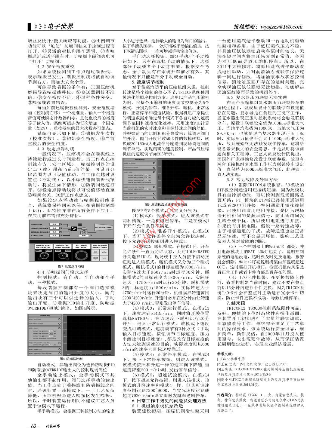 》》》電 子世界投稿郵箱: wysjzzs@ 163.com增益及快開(kāi)/慢關(guān)響應(yīng)等功能。⑤比例調(diào)節(jié)大小進(jìn)行選擇,選擇最大的輸出為閥]的輸出。一臺(tái)低壓蒸汽透平驅(qū)動(dòng)和一臺(tái)電動(dòng)機(jī)驅(qū)動(dòng)功能可以‘迫使’防喘閥獨(dú)立于控制過(guò)程而按 下單箭頭圖標(biāo),- -次可增減手動(dòng)輸出值1%。按油泵相和備用, 由于低壓蒸汽壓力不穩(wěn),打開(kāi)。⑥靈活的起機(jī)和跳車(chē)邏輯。⑦當(dāng)喘下雙箭頭圖標(biāo),一 -次可增減 手動(dòng)輸出值5%。并且油壓低低聯(lián)鎖啟動(dòng)備泵時(shí)間較長(zhǎng),無(wú)振逼近或透平跳車(chē)時(shí),防喘振電磁閥失電可手自動(dòng)選擇按鈕、部分手動(dòng)/全手動(dòng)按法在短時(shí)間內(nèi)將油壓恢復(fù)到正常值,會(huì)因“打開(kāi)”防喘閥。鈕如下,只有在選擇手動(dòng)的情況下,選擇為油壓低而導(dǎo)致壓縮機(jī)停車(chē)。所以,在.4.2安全裕度重校部分手動(dòng)或者全手動(dòng)才有效。根據(jù)安全考2011年大檢修時(shí),將低壓蒸汽透平驅(qū)動(dòng)改如果系統(tǒng)檢測(cè)到工作點(diǎn)越過(guò)喘振線,慮,全手動(dòng)只有在系統(tǒng)開(kāi)車(chē)前才有效。其成電機(jī)驅(qū)動(dòng),并對(duì)潤(rùn)滑油系統(tǒng)聯(lián)鎖保護(hù)邏表示喘振已發(fā)生,喘振控制線將被自動(dòng)調(diào)他情況 下只能是部分手動(dòng)或全自動(dòng)。輯一同進(jìn)行修改,增加油泵事故狀態(tài)控制節(jié)到右方,而加大安5.速度調(diào)節(jié)控制信號(hào),消除油壓回升存在的延時(shí)問(wèn)題,可能導(dǎo)致喘振的條件有:①因壓縮機(jī)對(duì)于帶蒸汽透平的壓縮機(jī)組來(lái)說(shuō),控制全實(shí)現(xiàn)油壓低低聯(lián)鎖無(wú)擾切換。徹底解決磨損導(dǎo)致喘振線移位。②變送器調(diào)校不準(zhǔn)轉(zhuǎn)速是整個(gè)控制的核心環(huán)節(jié),TRICON系統(tǒng)使用因油泵故障而導(dǎo)致的機(jī)組停車(chē)。確。③安全裕度不足。④過(guò)程條件突變。模 塊化的順序控制方案。這里以產(chǎn)品氣壓縮機(jī)6.2復(fù)水器壓力聯(lián)鎖無(wú)法實(shí)現(xiàn)⑤喘振線設(shè)置錯(cuò)誤。為例,將整個(gè)壓縮機(jī)的速度調(diào)節(jié)控制分為5個(gè)在兩臺(tái)壓縮機(jī)組復(fù)水器壓力聯(lián)鎖停車(chē)的每當(dāng)如前述喘振被檢測(cè)到,安全裕度增模式, 分別為停車(chē)、準(zhǔn)備開(kāi)車(chē)、暖機(jī)、正常運(yùn)調(diào)試過(guò)程中, 發(fā)現(xiàn)原設(shè)計(jì)的聯(lián)鎖停車(chē)設(shè)定值加(控制線右移)一個(gè)校準(zhǔn)量。輸入一一個(gè)裕度行、 正常停車(chē)和超速試驗(yàn)。根據(jù)機(jī)組廠家提供存在問(wèn)題, 復(fù)水器是在負(fù)壓的工況下工作,新值可使瞬態(tài)計(jì)數(shù)器歸零,且使 重校后的裕度的調(diào)速 數(shù)據(jù)來(lái)確定每個(gè)模式下各自對(duì)應(yīng)的速度當(dāng) 復(fù)水器出現(xiàn)正壓時(shí)控制系統(tǒng)將會(huì)觸發(fā)聯(lián)鎖等于輸入值。系統(tǒng)可組態(tài)為每次增加一- 個(gè)固定調(diào)節(jié) 范圍和速度變化速率,采用速度PID計(jì)算停車(chē)。 原設(shè)計(jì)聯(lián)鎖設(shè)定值為100Kpa標(biāo)準(zhǔn)大氣量(如2%) 。重校發(fā)生的最大次數(shù)亦可組態(tài)。當(dāng) 前機(jī)組的實(shí)時(shí)速度和目標(biāo)轉(zhuǎn)速之間的差值,壓,當(dāng)?shù)仄骄0螢?000米,當(dāng)?shù)卮髿鈮簽橄到y(tǒng)可顯示如”下量:①喘振發(fā)生次數(shù)并根據(jù)適當(dāng)?shù)谋壤头e分參數(shù)來(lái)計(jì)算調(diào)速閥門(mén)89.6Kpa,也就是說(shuō)當(dāng)復(fù)水器出現(xiàn)正壓工況(校準(zhǔn)次數(shù))。②初始安全裕度。③當(dāng)前的開(kāi)度。 閥門(mén)開(kāi)度經(jīng)過(guò)AO卡件的數(shù)模轉(zhuǎn)換,轉(zhuǎn)時(shí), 實(shí)際壓力值也不會(huì)大于100Kpa標(biāo)準(zhǔn)大氣重校后的安全裕度。換成20 160mA大電流信號(hào)輸送到現(xiàn)場(chǎng)調(diào)速閥的壓, 故系統(tǒng)始終無(wú)法觸發(fā)聯(lián)鎖停車(chē),這將給二般情況下壓縮,不會(huì)在嘴振線上 機(jī)組的速度滴節(jié)娟園的系控利。 戶1氣壓箱設(shè)備帶來(lái)極大的安全隱思。于是及時(shí)將該向持續(xù)運(yùn)行或過(guò)長(zhǎng)時(shí)出工作占左控機(jī)組的速度調(diào)節(jié)如圖5所示。因國(guó)外廠家拒絕修改設(shè)計(jì)聯(lián)鎖參數(shù),故至今制線無(wú)方(安全區(qū)城)咄展控制器的設(shè)兩臺(tái)壓縮機(jī)組復(fù)水器工作壓力聯(lián)鎖停車(chē)設(shè)定定點(diǎn)(線)須在當(dāng)前h值的某一-可設(shè)百分值一直保持為100Kpa標(biāo)準(zhǔn)大氣壓,此聯(lián)鎖--比范圍內(nèi)以可設(shè)值移動(dòng)。當(dāng)工作點(diǎn)越過(guò)設(shè)直無(wú)法實(shí)現(xiàn)。置點(diǎn)(浮動(dòng)線),以小幅快速向喘振線竄6.3 常見(jiàn)故障及處理方法動(dòng)時(shí),將發(fā)生如下情形:①防喘閥迅速打(1)消除TRICON系統(tǒng)報(bào)警。A0模塊的開(kāi)。②設(shè)定點(diǎn)浮動(dòng)線將以可設(shè)值移動(dòng)直至四ETP板空閑通道用短接線短接,因?yàn)榇四K防喘閥全關(guān)。③新工作點(diǎn)建立具有自診斷功能,可以檢測(cè)到現(xiàn)場(chǎng)回路是如果設(