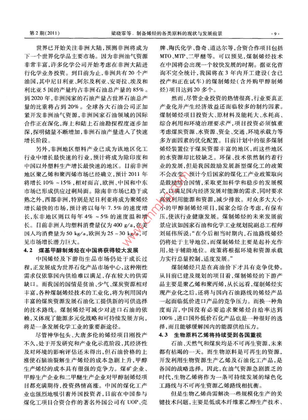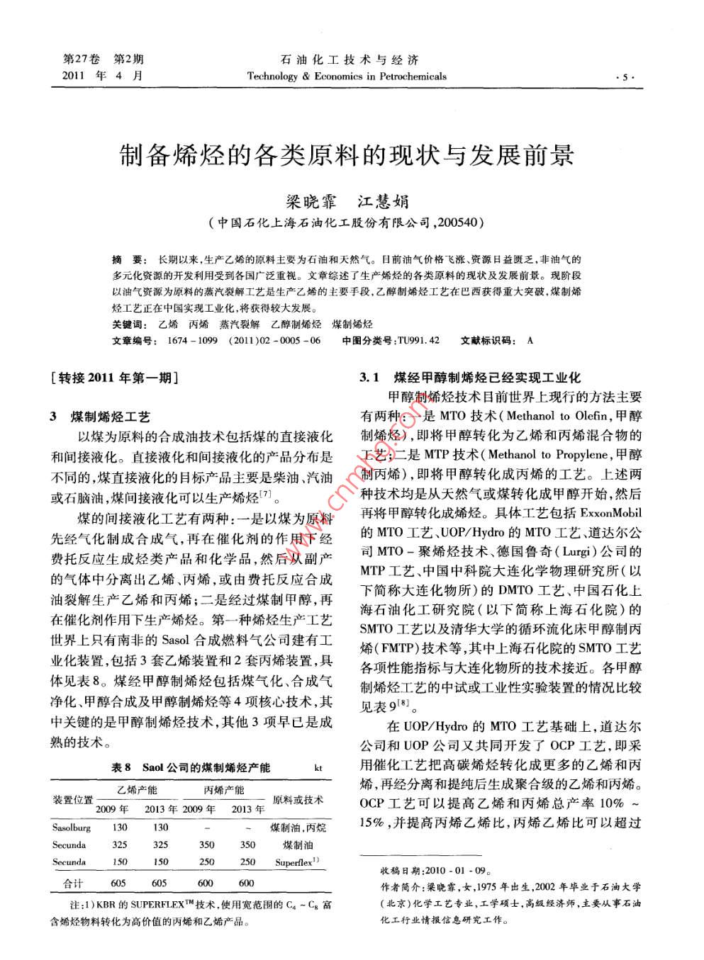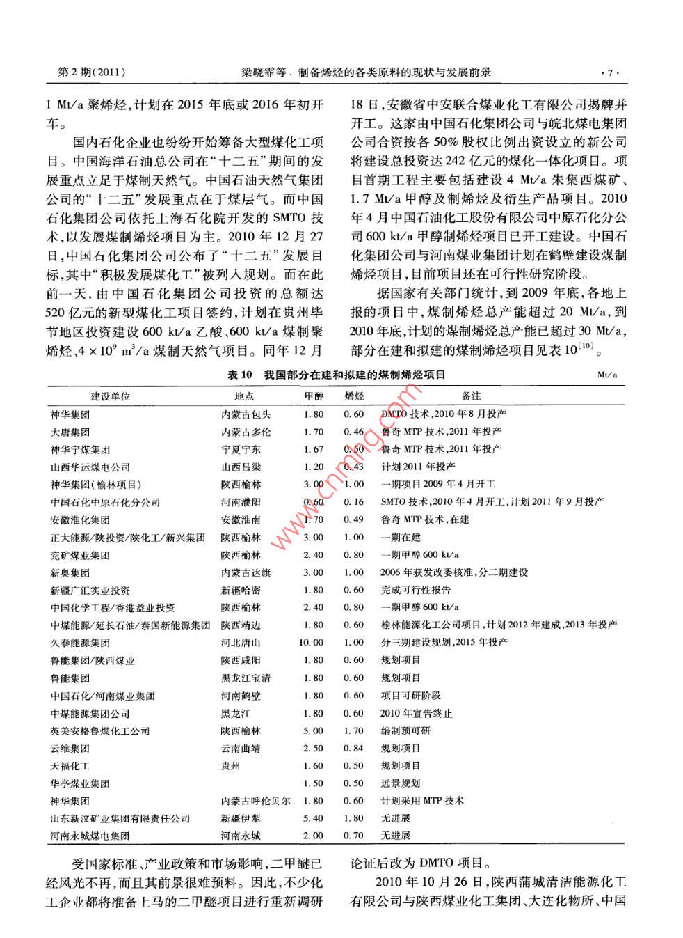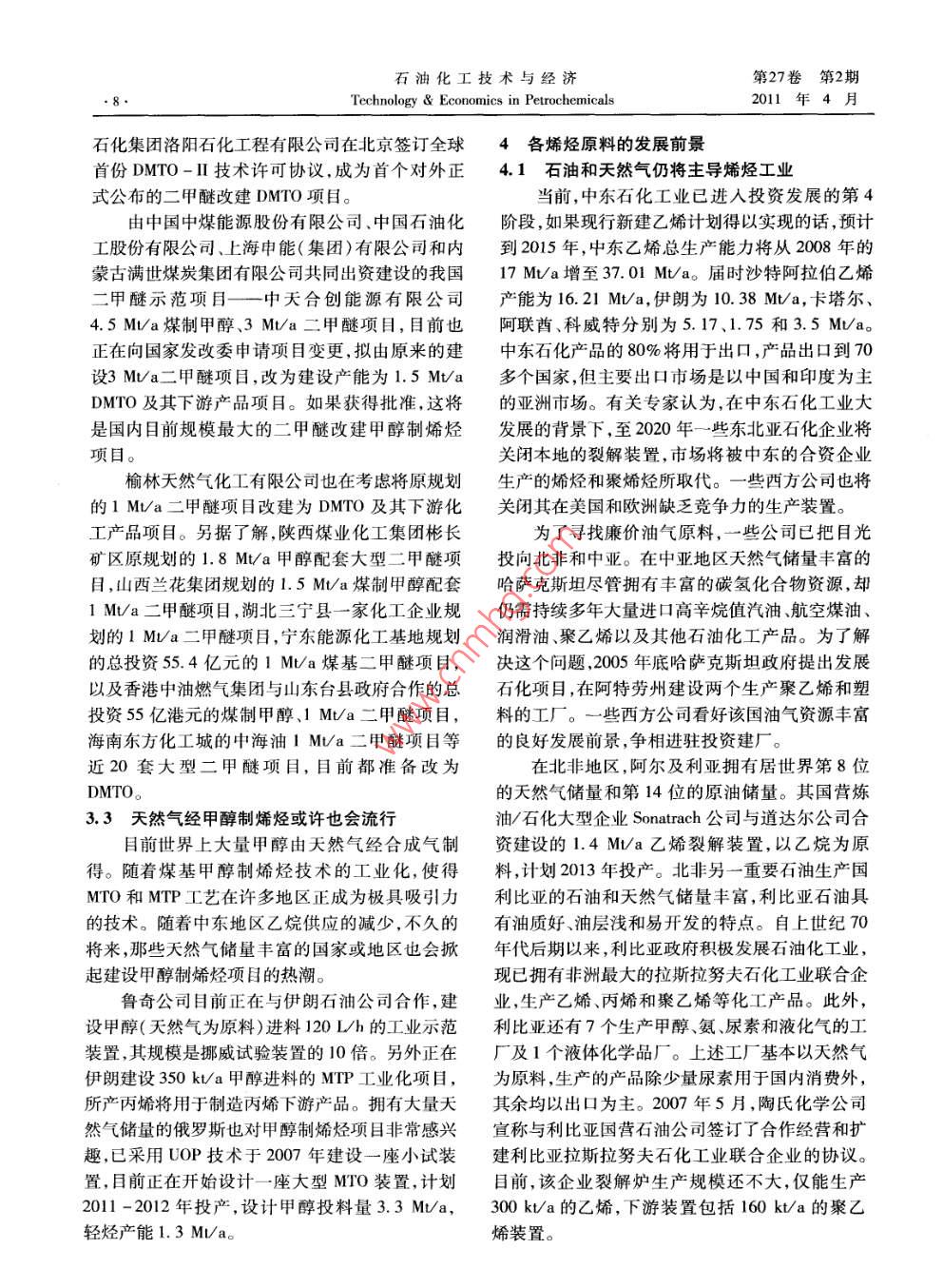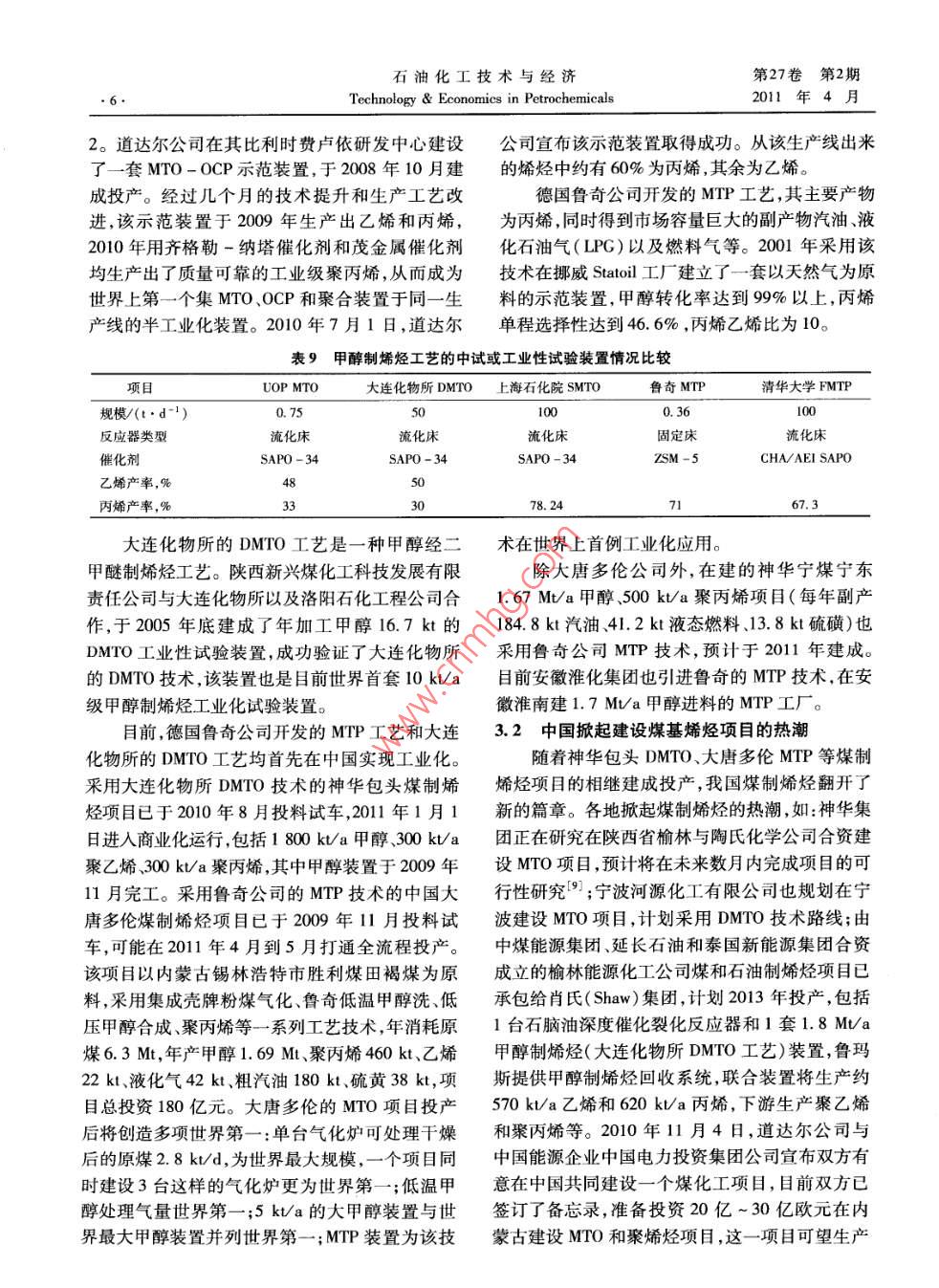 石油化工技術(shù)與經(jīng)濟(jì)第27卷第2期.6.Technology & Economics in Petrochemicals2011 年4月2。道達(dá)爾公司在其比利時(shí)費(fèi)盧依研發(fā)中心建設(shè)公司宣布該示范裝置取得成功。從該生產(chǎn)線出來了-套MTO-0CP示范裝置,于2008年10月建的烯烴中約有60%為丙烯,其余為乙烯。成投產(chǎn)。經(jīng)過幾個(gè)月的技術(shù)提升和生產(chǎn)工藝改德國魯奇公司開發(fā)的MTP工藝,其主要產(chǎn)物進(jìn),該示范裝置于2009年生產(chǎn)出乙烯和丙烯,為丙烯,同時(shí)得到市場(chǎng)容量巨大的副產(chǎn)物汽油、液2010年用齊格勒-納塔催化劑和茂金屬催化劑化石油氣(LPG)以及燃料氣等。2001年采用該均生產(chǎn)出了質(zhì)量可靠的工業(yè)級(jí)聚丙烯,從而成為技術(shù)在挪威Statoil工廠建立了- -套以天然氣為原世界.上第- -個(gè)集MTO ,0CP和聚合裝置于同一生料的示范裝置,甲醇轉(zhuǎn)化率達(dá)到99%以上,丙烯產(chǎn)線的半工業(yè)化裝置。2010年7月1日,道達(dá)爾單程選擇性達(dá)到46. 6% ,丙烯乙烯比為10。表9甲醇制烯烴工藝的 中試或工業(yè)性試驗(yàn)裝置情況比較項(xiàng)目.UOP MTO大連化物所DMTO上海石化院 SMTO魯奇MTP清華大學(xué)FMTP規(guī)模/(t.d-1)0.75100.36100反應(yīng)器類型流化床固定床催化劑SAP0 -34SAPO -34ZSM-5CHA/AEI SAPO乙烯產(chǎn)率,%50丙烯產(chǎn)率,%3330大連化物所的DMTO工藝是- .種甲醇經(jīng)二術(shù) 在世界上首例工業(yè)化應(yīng)用。甲醚制烯烴工藝。陜西新興煤化工科技發(fā)展有限除大唐多倫公司外,在建的神華寧煤寧東責(zé)任公司與大連化物所以及洛陽石化工程公司合1.67 Mt/a甲醇、500 kVa聚丙烯項(xiàng)目(每年副產(chǎn)作,于2005年底建成了年加工甲醇16.7 kt的184. 8 kt汽油、41.2 kt液態(tài)燃料.13.8 kt硫磺)也DMTO工業(yè)性試驗(yàn)裝置,成功驗(yàn)證了大連化物所采用魯奇公司MTP技術(shù),預(yù)計(jì)于2011年建成。的DMTO技術(shù),該裝置也是目前世界首套10 k/a目前安徽淮化集團(tuán)也引進(jìn)魯奇的MTP技術(shù),在安級(jí)甲醇制烯烴工業(yè)化試驗(yàn)裝置?;栈茨辖?.7 MU/a甲醇進(jìn)料的MTP工廠。目前,德國魯奇公司開發(fā)的MTP工藝和大連3.2中國掀起建 設(shè)煤基烯烴項(xiàng)目的熱潮化物所的DMTO工藝均首先在中國實(shí)現(xiàn)工業(yè)化。隨著神華包頭DMTO、大唐多倫MTP等煤制采用大連化物所DMTO技術(shù)的神華包頭煤制烯烯烴項(xiàng)目的相繼建成投產(chǎn),我國煤制烯烴翻開了烴項(xiàng)目已于2010年8月投料試車,2011年1月1新的篇章。 各地掀起煤制烯烴的熱潮,如:神華集日進(jìn)人商業(yè)化運(yùn)行,包括1800 kt/a 甲醇、300 kt/a團(tuán)正在研究在陜西省榆林與陶氏化學(xué)公司合資建聚乙烯、300 kt/a聚丙烯,其中甲醇裝置于2009年設(shè)MTO項(xiàng)目,預(yù)計(jì)將在未來數(shù)月內(nèi)完成項(xiàng)目的可11月完工。采用魯奇公司的MTP技術(shù)的中國大行性研究[9];寧波河源化工有限公司也規(guī)劃在寧唐多倫煤制烯烴項(xiàng)目已于2009年11月投料試波建設(shè)MTO項(xiàng)目,計(jì)劃采用DMTO技術(shù)路線;由車,可能在2011年4月到5月打通全流程投產(chǎn)。中煤能源集團(tuán)、延長(zhǎng)石油和泰國新能源集團(tuán)合資該項(xiàng)目以內(nèi)蒙古錫林浩特市勝利煤田褐煤為原成立的榆林能源化工公司煤和石油制烯烴項(xiàng)目已料,采用集成殼牌粉煤氣化、魯奇低溫甲醇洗、低承包給肖氏( Shaw)集團(tuán),計(jì)劃2013年投產(chǎn),包括壓甲醇合成、聚丙烯等一系列工藝技術(shù),年消耗原1臺(tái)石腦油深度催化裂化反應(yīng)器和1套1.8 MVa煤6.3 Mt,年產(chǎn)甲醇1.69 Mt、聚丙烯460 kt,乙烯甲醇制烯烴(大連化物所DMTO工藝)裝置,魯瑪22 kt、液化氣42 kt、粗汽油180 kt、硫黃38 kt,項(xiàng)斯提供甲醇制烯烴回收系統(tǒng),聯(lián)合裝置將生產(chǎn)約目總投資180億元。大唐多倫的MTO項(xiàng)目投產(chǎn)570 kt/a乙烯和620 kt/a丙烯,下游生產(chǎn)聚乙烯后將創(chuàng)造多項(xiàng)世界第--:單臺(tái)氣化爐可處理干燥和聚丙烯等。2010年11月4日,道達(dá)爾公司與后的原煤2.8 kt/d,為世界最大規(guī)模,-一個(gè)項(xiàng)目同中國能源企業(yè)中國電力投資集團(tuán)公司宣布雙方有時(shí)建設(shè)3臺(tái)這樣的氣化爐更為世界第- -;低溫甲意在中國共同建設(shè)一個(gè)煤化工項(xiàng)目,目前雙方已.醇處理氣量世界第- -;5 kt/a的大甲醇裝置與世簽訂了備忘錄,準(zhǔn)備投資20億~ 30億歐元在內(nèi)界最大甲醇裝置并列世界第--;MTP裝置為該技蒙古建設(shè)MTO和聚烯烴項(xiàng)目,這一-項(xiàng)目可望生產(chǎn)第2期(2011)梁曉罪等,制備烯烴的各類原料的現(xiàn)狀與發(fā)展前景.7.1MU/a聚烯烴,計(jì)劃在2015年底或2016年初開18日,安徽省中安聯(lián)合煤業(yè)化工有限公司揭牌并車。開工。這家由中國石化集團(tuán)公司與皖北煤電集團(tuán)國內(nèi)石化企業(yè)也紛紛開始籌備大型煤化工項(xiàng)公司合資按各50%股權(quán)比例出資設(shè)立的新公司目。中國海洋石油總公司在“十二五”期間的發(fā)將建設(shè)總投資達(dá)242億元的煤化- -體化項(xiàng)目。項(xiàng)展重點(diǎn)立足于煤制天然氣。中國石油天然氣集團(tuán)目首期工程主要包括建設(shè)4 Mt/a 朱集西煤礦、公司的“十二五”發(fā)展重點(diǎn)在于煤層氣。而中國1.7 Mt/a甲醇