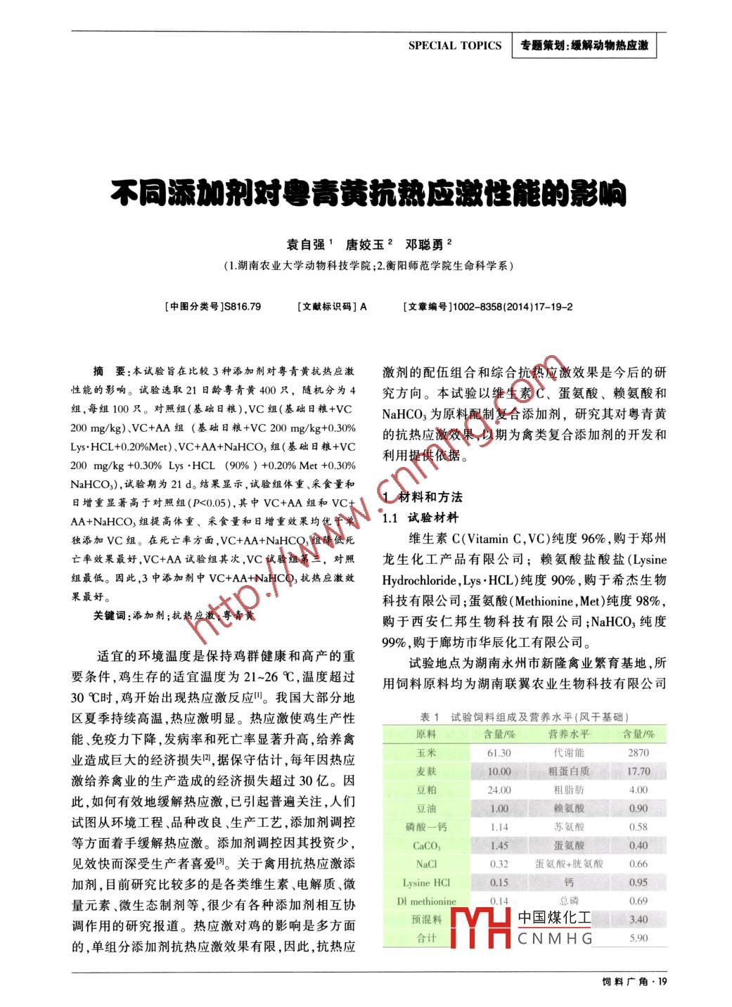SPECIAL TOPICS|專題策劃:緩解動物熱應(yīng)激不同添加劑對電青黃抗熱應(yīng)激性能的影響袁自強(qiáng)1唐姣玉2鄧聰勇2(1.湖南農(nóng)業(yè)大學(xué)動物科技學(xué)院;2.衡陽師范學(xué)院生命科學(xué)系)[中圖分類號]S816.79[文獻(xiàn)標(biāo)識碼] A[文章編號]1002 -8358(2014)17-19- -2摘要:本試驗(yàn)旨在比較 3種添加劑對粵青黃抗熱應(yīng)激激劑的配伍組合和綜合抗熱應(yīng)激效果是今后的研性能的影響。試驗(yàn)選取21日齡粵青黃400只,隨機(jī)分為4究方向。本試驗(yàn)以維生素C、蛋氨酸、賴氨酸和組,每組100只。對照組(基礎(chǔ)日糧),VC組(基礎(chǔ)日糧+VCNaHCO3為原料配制復(fù)合添加劑,研究其對粵青黃200 mg/kg) .VC+AA組(基礎(chǔ)日糧+VC 200 mg/kg+0.30%的抗熱應(yīng)激效果,以期為禽類復(fù)合添加劑的開發(fā)和Lys.HCL+0.20%Met) 、VC+AA+NaHCO,組(基礎(chǔ)日糧+VC利用提供依據(jù)。200 mg/kg +0.30% Lys .HCL (90% ) +0.20% Met +0.30%NaHCO,),試驗(yàn)期為21 d。結(jié)果顯示,試驗(yàn)組體重、采食量和1材料和方法日增重顯著高于對照組(P<0.05),其中VC+AA組和VC+AA+NaHCO,組提高體重、采食量和日增重效果均優(yōu)于單1.1試驗(yàn)材料獨(dú)添加VC組。在死亡率方面,VC+AA+NaHCO,組降低死維生素C(Vitamin C, VC)純度96% ,購于鄭州亡率效果最好,VC+AA試驗(yàn)組其次,VC試驗(yàn)組第三,對照.龍生化工產(chǎn)品有限公司;賴氨酸鹽酸鹽(lysine組最低。因此,3中添加劑中VC+AA+NaHCO,抗熱應(yīng)激效Hydrochloride , Lys.HCL)純度90% ,購于希杰生物果最好。科技有限公司;蛋氨酸(Methionine,Met)純度98%,關(guān)鍵詞:添加劑;抗熱應(yīng)激;粵青黃購于西安仁邦生物科技有限公司;NaHCO3純度99% ,購于廊坊市華辰化工有限公司。適宜的環(huán)境溫度是保持雞群健康和高產(chǎn)的重試驗(yàn)地點(diǎn)為湖南永州市新隆禽業(yè)繁育基地,所要條件,雞生存的適宜溫度為21~26C,溫度超過用飼料原料均為湖南聯(lián)翼農(nóng)業(yè)生物科技有限公司30 C時,雞開始出現(xiàn)熱應(yīng)激反應(yīng)"。我國大部分地區(qū)夏季持續(xù)高溫,熱應(yīng)激明顯。熱應(yīng)激使雞生產(chǎn)性表1試驗(yàn)飼料組成及營 養(yǎng)水平(風(fēng)干基礎(chǔ))能、免疫力下降,發(fā)病率和死亡率顯著升高,給養(yǎng)禽原料含量/9%營養(yǎng)水平含量/%玉米61.30代謝能2870業(yè)造成巨大的經(jīng)濟(jì)損失凹,據(jù)保守估計,每年因熱應(yīng)麥麩10.00粗蛋白質(zhì)17.70激給養(yǎng)禽業(yè)的生產(chǎn)造成的經(jīng)濟(jì)損失超過30億。因豆粕24.00粗脂肪4.00此,如何有效地緩解熱應(yīng)激,已引起普遍關(guān)注,人們豆油1.00賴氨酸0.90試圖從環(huán)境工程、品種改良、生產(chǎn)工藝,添加劑調(diào)控磷酸一蘇氨酸0.58等方面著手緩解熱應(yīng)激。添加劑調(diào)控因其投資少,CaCO31.45蛋氨酸見效快而深受生產(chǎn)者喜愛。關(guān)于禽用抗熱應(yīng)激添0.32蛋氨酸+胱氨酸0.66加劑,目前研究比較多的是各類維生素、電解質(zhì)、微Lysine HCI0.15鈣0.95量元素、微生態(tài)制劑等,很少有各種添加劑相互協(xié)DI methionine調(diào)作用的研究報道。熱應(yīng)激對雞的影響是多方面預(yù)混料中國煤化工3.40的,單組分添加劑抗熱應(yīng)激效果有限,因此,抗熱應(yīng)合計MYHCNMHG飼料廣角.19.專題策劃:緩解動物熱應(yīng)激SPECIAL TOPICS生產(chǎn),基礎(chǔ)飼料配方參照美國NRC(1994)肉雞營養(yǎng)酸、和電解質(zhì)配伍組合的復(fù)合抗應(yīng)激添加劑,可全需要標(biāo)準(zhǔn),其組成及營養(yǎng)水平見表1。面的調(diào)整飼料營養(yǎng)結(jié)構(gòu),補(bǔ)償高溫應(yīng)激引起的養(yǎng)分1.2試驗(yàn)設(shè)計與飼養(yǎng)管理需求增加,維持營養(yǎng)全面均衡。挑選21日齡經(jīng)過常規(guī)免疫、健康、體重相近的本研究結(jié)果發(fā)現(xiàn),VC+AA組和VC +AA +粵青黃400羽,隨機(jī)分為4組,每組100羽,每組5NaHCO3組提高采食量、日增重和降低死亡率效果個重復(fù)。其中對照組,飼喂基礎(chǔ)日糧;VC組,在基礎(chǔ)均優(yōu)于VC組,VC組顯著高于對照組。在應(yīng)激環(huán)境日糧中添加維生素C200mg/kg;VC+AA組,在基礎(chǔ)中,維生素C的生物合成不足,皮質(zhì)酮(醇)的分泌.日糧中添加維生素C 200 mg/kg、0.30% Lys.HCL使維生素 C需要量增加,單獨(dú)添加VC可以緩解(90% ) .0.20%Met;VC+AA+NaHCO3組,在基礎(chǔ)日糧熱應(yīng)激,提高雞的生產(chǎn)性能;熱應(yīng)激可能導(dǎo)致蛋氨中添加維生素C200. mgkg.0.30% Lys .HCL酸、賴氨酸等的需求增加'),額外的蛋氨酸和賴氨酸(90%) .0.20%Met、0.30%NaHCO3。試驗(yàn)在夏季高溫的添加有利于進(jìn)一步緩解熱應(yīng)激;當(dāng)環(huán)境溫度升高期進(jìn)行,平均溫度31C,平均濕度70%,試驗(yàn)期為時,雞由于熱性喘息呼出大量的CO2,血中HCO;降21d,試驗(yàn)期間自由飲水,每天記錄耗料量和死亡情低,添加NaHCO3可以補(bǔ)充血中HCO3濃度,緩解熱況。試驗(yàn)結(jié)束時稱重,計算日增重料重比和死亡率。應(yīng)激(。因此VC+AA+NaHCO3組死亡率顯著低于其1.3數(shù)據(jù)處理他兩組。采用SAS 6.12軟件進(jìn)行數(shù)據(jù)分析。4結(jié)論2結(jié)果與分析在本試驗(yàn)條件下,復(fù)方添加劑VC+AA+2.1不同添加劑對熱應(yīng)激肉仔雞生產(chǎn)性能的影響NaHCO3組抗熱應(yīng)激效果優(yōu)于VC組和VC+AA不同添加劑對熱應(yīng)激肉仔雞生產(chǎn)性能的影響組見表2。表2