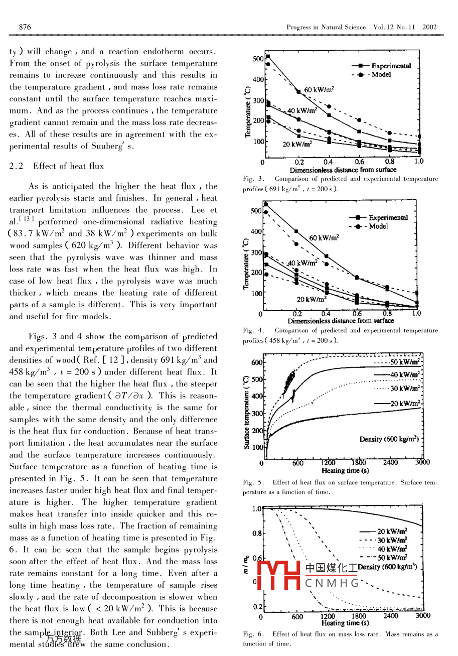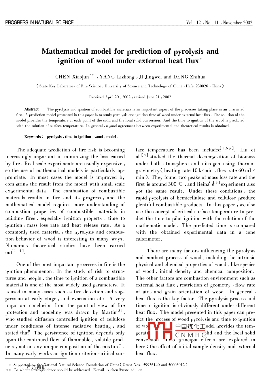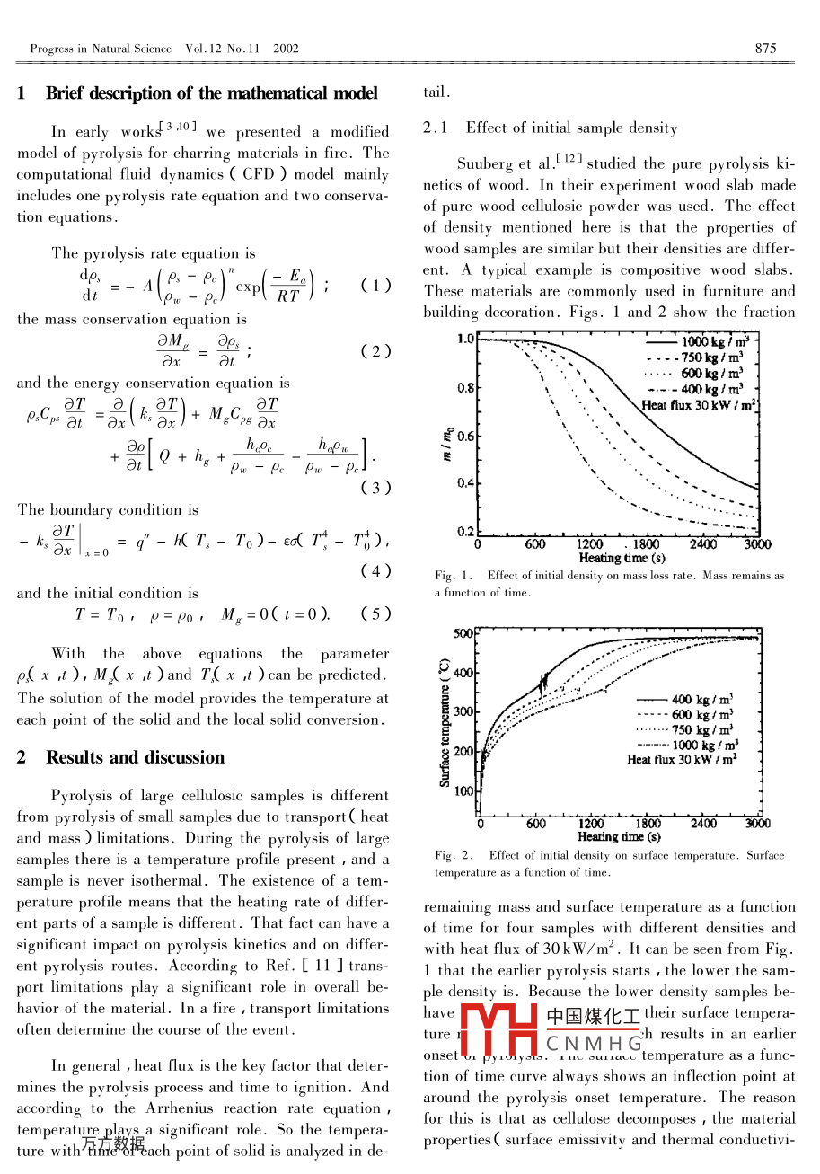 PROGRESS IN NATURAL SCIENCEVol. 12 ,No.11 , November 2002Mathematical model for prediction of pyrolysis andignition of wood under external heat flux*CHEN Xiaojun', YANG Lizhong ,JI Jingwei and DENG Zhihua( State Key Laboratory of Fire Science , University of Science and Technology of China , Hefei 230026 , China)Received April 20 , 2002 ; revised June 21 , 2002Abstract The pyrolysis and ignition of combustible materials is an important aspect of the processes taking place in an unw antedfire. A prediction model presented in this paper is to study pyrolysis and ignition time of w ood under external heat flux. The solution of themodel provides the temperature at each point of the solid and the local solid conversion. And the time to ignition of the wood is predictedwith the solution of surface temperature. In general ,a good agreement bet w een experimental and theoretical results is obtained.Keywords: pyrolysis , time to ignition , wood , model.The adequate prediction of fire risk is becomingface temperature has been included157]. Liu etinereasingly important in minimizing the loss causedal.!81 studied the thermal decomposition of biomassby fire. Real scale experiments are usually expensive ,under both atmosphere and nitrogen using thermo-so the use of mathematical models is particularly ap-gravimetry( heating rate 10 k/ min , flow rate 60 mL/propriate. In most cases the model is improved bymin ). They found two peaks of mass loss rate and thecomparing the result from the model with small scalefirst is around 300 C , and Reina' 5 91 ex periment alsoexperimental data. The combustion of combustiblegot the same result. U nder these conditions ,thematerials results in fire and its progress , and therapid pyrolysis of hemicellulose and cellulose producemathematical model requires more understanding ofplentiful combustible products. In this paper , we alsocombustion properties of combustible materials inuse the concept of critical surface temperature to pre-building fires , especially ignition property , time todict the time to pilot ignition with the solution of theignition, mass loss rate and heat release rate. As amathematic model. The predicted time is comparedcommonly used material ,the pyrolysis and combus-with the obtained experimental data in a conetion behavior of wood is interesting in many ways. .calorimeter.Numerous theoretical studies have been carriedut1~4].There are many factors influencing the pyrolysisand combust process of w ood , including the intrinsicOne of the most important processes in fire is thephysical and chemical properties of wood,like speciesignition phenomenon. In the study of risk to struc-of wood , initial density and chemical composition.tures and people , the time to ignition of a combustible .The other factors are combustion environment such asmaterial is one of the most w idely used parameters. Itexternal heat flux , restriction of geometry ,flow rateis used in many cases such as fire detection and sup-of air , and grain orientation of wood. In general ,pression at early stage ,and evacuation etc. A veryheat flux is the key factor. The py rolysis process andimportant conclusion from the point of view of firetime to ignition is obviously different under differentprotection and modeling was drawn by Martir 31 ,heat flux. The model presented in this paper can pre-w ho studied diffusion controlled ignition of cellulosedict the process of w ood pyrolysis and time to ignitionunder conditions of intense radiative heating ,andofwo中國煤化工odel provides the tem-stated that' The persistence of ignition depends onlyperatiC N M H Glid and the local solidupon the continued flow of flammable,volatile prod-conversion." 1 WO princrpa efects are explored inucts , not on any unique composition of the mixture"here : the effect of initial sample density and ex ternalIn many early works an ignition criterion-critical sur-heat flux.* Supportyt h出ational Natural Science Foundation of China( Grant Nos. 59936140 and 50006012 )** To whomd coropadence should be addressed. E-mail : xjchen @ ustc. edu. cnProgress in Natural Science Vol.12 No.11 20028751 Brief description of the mathematical modeltail.In early works3,10] we presented a modified2.1 Effect of initial sample densitymodel of py rolysis for charring materials in fire. TheSuuberg et al.t12] studied the pure pyrolysis ki-computational fluid dynamics ( CFD ) model mainlynetics of wood. In their experiment wood slab madeincludes one py rolysis rate equation and two conserva-of pure wood cellulosic powder was used. The effecttion equations.of density mentioned here is that the properties ofThe py rolysis rate equation isw ood samples are similar but their densities are differ-dp,=-A(( P3-ρc)". (- E( 1)ent. A typical example is compositive wood slabs.dtexp(RTThese materials are commonly used in furniture andbuilding decoration. Figs. 1 and 2 show the fractionthe mass conservation equation isaMg1.01000kg t m'xa(2).----750kgIm'600kg1 m'and the energy conservation equation is0.8----400kg1m3aT_旦aTHeat fux 30 kW 1 m2]psCps =我hisx)+ MgCpg xf 0.6h.0。hoPw ]+ 0ll0+hg+Pw-Pe0。~Pw-Pc(3)0.44The boundary condition isaT|。= q"-h( T,- To)-ed( T。- r),”0一600一1200.1800 24000 3000ax x=0Heating time (S)(4)Fig. 1. Effect of initial density on mass loss rate. Mass remains asand the initial condition isa function of time.T= To,ρ=po,Mg=0( t=0).. (5)500With the above equations the parameterp x it ), M[(x ,t )and T( x ,t )can be predicted.40The solution of the model provides the temperature at400 kg1 m',300----- 600 kg1 m}ach point of the solid and the local solid conversion....... 750 kg/ m'00kg1m2 Results and discussionHeat fux 30kW 1m2Pyrolysis of large cellulosic samples is different100from pyrolysis of small samples due to transport( heat廣一600120001800 2400- 3000and mass ) limitations. During the pyrolysis of largeHeating time (s)samples there is a temperature profile present ,and aFig.2. Efect of initial density on surfa