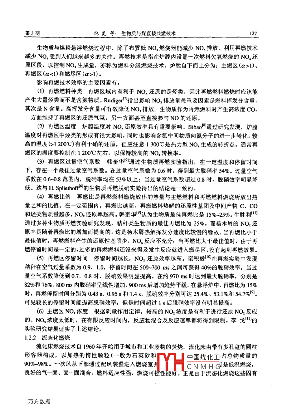能源研究與信息第25卷第3期Energy Research and Informationol.25No.32009文章編號(hào):1008-8857(2009)03-012505生物質(zhì)與煤直接共燃技術(shù)倪昊,汪軍,樊沖(上海理工大學(xué)能源與動(dòng)力工程學(xué)院,上海200093)摘要:由于化石然料的使用而帶來(lái)的能源危機(jī)和環(huán)境污染問(wèn)題,生物質(zhì)能因其特性(可再生性和環(huán)境友好性)受到廣泛關(guān)注,各種生物質(zhì)利用技術(shù)應(yīng)運(yùn)而生,主要介紹了生物質(zhì)與煤共燃技術(shù),特別是懸浮然燒技術(shù)和流化床燃燒技術(shù)。兩種燃燒技術(shù)各有特點(diǎn),在實(shí)際應(yīng)用中應(yīng)充分考慮實(shí)際條件選擇合適的燃燒方式。雖然生物質(zhì)與煤共燃的優(yōu)點(diǎn)顯而易見(jiàn),但是同時(shí)存在的缺點(diǎn)也不可忽視,我國(guó)在大規(guī)模利用生物質(zhì)領(lǐng)城的技術(shù)還不成熟,應(yīng)該總結(jié)前人的經(jīng)驗(yàn)的同時(shí)結(jié)合自身特點(diǎn)利用先進(jìn)技術(shù)更好地利用生物質(zhì)資源關(guān)鍵詞:生物質(zhì);混合燃燒;懸浮燃燒;流化床燃燒中圖分類(lèi)號(hào):TK6文獻(xiàn)標(biāo)識(shí)碼能源是人類(lèi)賴(lài)以生存和發(fā)展的基礎(chǔ),是社會(huì)經(jīng)濟(jì)可持續(xù)發(fā)展的物質(zhì)保障。但是現(xiàn)在人類(lèi)正面臨著巨大的能源和環(huán)境壓力。當(dāng)今的能源主要來(lái)自礦物燃料,包括煤、石油、天然氣等。一方面,礦物能源的應(yīng)用推進(jìn)了社會(huì)的發(fā)展,但其不可再生性使其日益耗盡;另一方面,由于礦物能源的過(guò)量使用已引起了日益嚴(yán)重的環(huán)境問(wèn)題,如全球氣候變暖、臭氧層破壞、生態(tài)圈失衡、有害物質(zhì)排放、酸雨等自然災(zāi)害。因此,開(kāi)發(fā)和尋找新的可替代能源已成為人類(lèi)社會(huì)急需解決的重大問(wèn)題之一。在各類(lèi)可再生能源中,具有廣泛使用價(jià)值的能源是生物質(zhì)能。生物質(zhì)能具有可再生和環(huán)境友好的雙重屬性,使得生物質(zhì)能源的開(kāi)發(fā)利用成為新能源技術(shù)領(lǐng)域研究的重要方向之生物質(zhì)能源轉(zhuǎn)換技術(shù)可大體上分為熱轉(zhuǎn)換、生物轉(zhuǎn)換和化學(xué)轉(zhuǎn)換三種形式。具體可分為:直接燃燒、熱解、氣化、液化、流化萃取、厭氧消化、發(fā)酵、酸化水解、酶水解和酯化等叫。1生物質(zhì)直接燃燒技術(shù)在各項(xiàng)生物質(zhì)能利用技術(shù)中,直接燃燒是最為成熟、應(yīng)用最廣泛的生物質(zhì)能轉(zhuǎn)換利用技術(shù)。燃燒是燃料和氧化劑(一般是空氣中的氧氣)之間進(jìn)行的劇烈、放熱的化學(xué)反應(yīng)過(guò)程。1.1生物質(zhì)燃料特性生物質(zhì)燃料一般具有以下特性:(1)髙揮發(fā)分著火溫度低。與煤混合燃燒能使YHe擋改的著火性能。CNMHG收稿日期:200902-10作者簡(jiǎn)介:倪昊(1984-),女(漢),碩士研究生,candy99536@hotmail.com126能源研究與信息2009年第25卷(2)低熱值單獨(dú)作為燃料燃用時(shí)效率低。例如農(nóng)村使用的木柴爐燃燒效率通常僅為10-20%,即使先進(jìn)的木柴爐效率也只有30%。生物質(zhì)燃料的熱值低,在燃燒過(guò)程中的放熱比較均勻,而煤燃燒的放熱則幾乎全部集中于燃燒過(guò)程后期。因此,在煤中加入生物質(zhì)后,可改善燃燒放熱的分布狀況,對(duì)于燃燒前期的放熱有增進(jìn)作用,可以提高生物質(zhì)的利用率(3)低硫分燃燒產(chǎn)生硫化物型的污染物少,與煤共燃時(shí)能有效減少硫氧化物排放(4)高堿金屬含量燃燒產(chǎn)生的灰渣中所含堿金屬氧化物熔點(diǎn)低,易在低溫受熱面造成積灰結(jié)渣問(wèn)題。上述特點(diǎn)決定了生物質(zhì)燃料并不適合單獨(dú)燃用。國(guó)內(nèi)外生物質(zhì)燃料燃燒技術(shù)的研究表明,生物質(zhì)與煤共燃具有顯著的優(yōu)點(diǎn),引起人們很大的興趣,相關(guān)的共燃技術(shù)也得到了大力開(kāi)發(fā)和利用。12生物質(zhì)與煤共燃技術(shù)當(dāng)生物質(zhì)作為固體燃料與煤共燃時(shí),可供選擇的燃燒方式主要有兩種,即以煤粉爐為代表的懸浮燃燒和循環(huán)流化床鍋爐為代表的流態(tài)化燃燒。兩種燃燒方式各有特點(diǎn),也各有不同的適用范圍。1.2.1懸浮燃燒在懸浮燃燒系統(tǒng)中實(shí)現(xiàn)生物質(zhì)與煤的混燒時(shí),鍋爐是先通過(guò)輔助燃燒器啟動(dòng)的。當(dāng)鍋爐達(dá)到一定的燃燒溫度時(shí),關(guān)閉輔助燃燒器,同時(shí)開(kāi)始噴入性質(zhì)均勻的生物質(zhì)燃料和煤粉。爐膛火焰中心溫度平均在1000~1200℃(可避免局部高溫、結(jié)焦和高溫型NO3的形成5)。H. Splietho和 K.R. G heir利用爐膛上部布置05MW燃燒器的柱狀懸浮爐實(shí)驗(yàn)裝置,進(jìn)行了生物質(zhì)一煤粉混燃研究,分析了生物質(zhì)顆粒尺寸及燃料在爐膛內(nèi)停留時(shí)間對(duì)燃燒效率的影響。研究表明,混燒時(shí)生物質(zhì)燃料顆粒尺寸應(yīng)在2~4mm范圍;CO生成量與燃燒效率是相關(guān)的,但是混燒過(guò)程中隨著生物質(zhì)份額的增加并沒(méi)有引起CO排放量的增加。這意味著在合適的生物質(zhì)燃料顆粒尺寸和份額范圍內(nèi),生物質(zhì)份額的增加并不影響燃燒效率懸浮爐中SO2排放與燃料的S含量是相關(guān)環(huán)形間隙噴入燃料的。燃料的S含量和SO2排