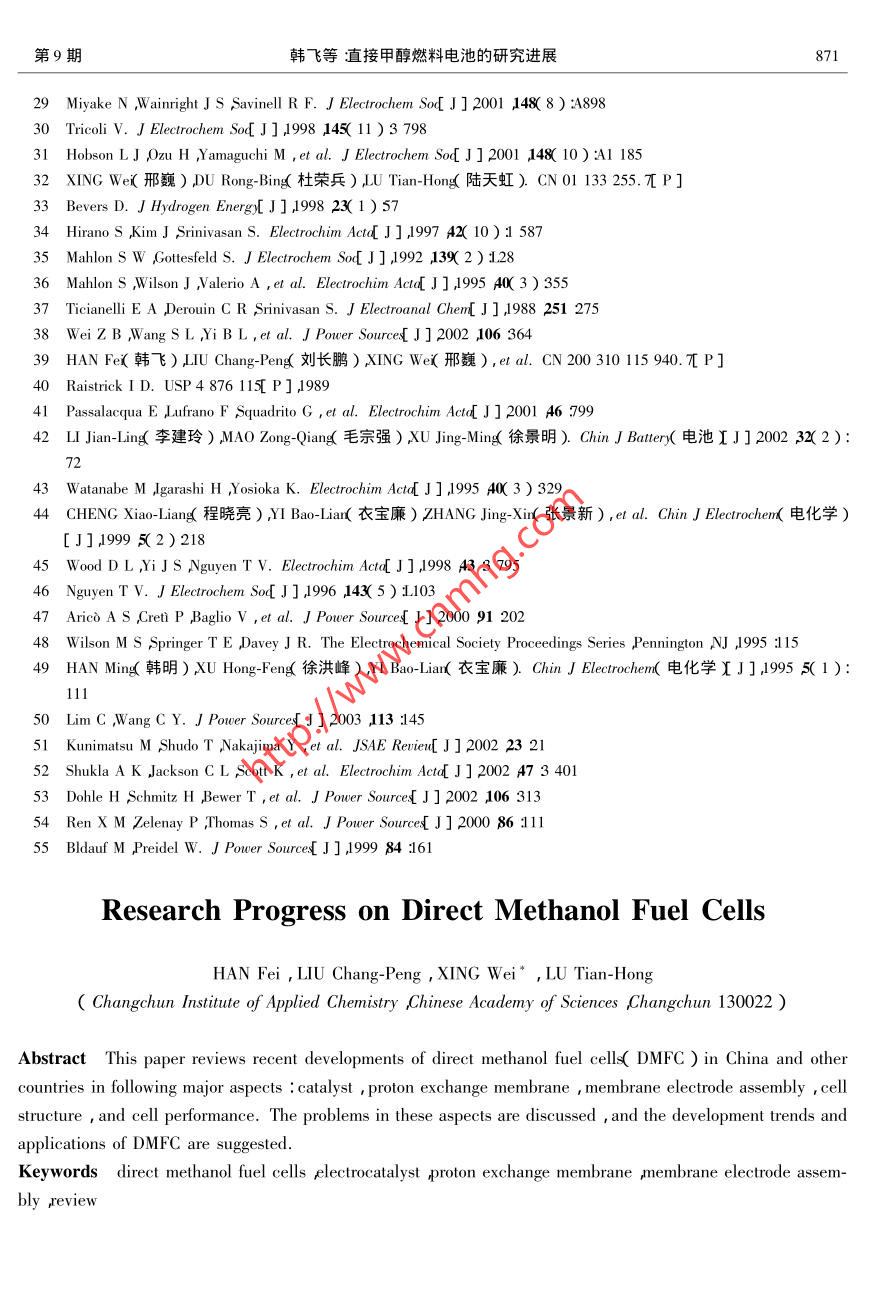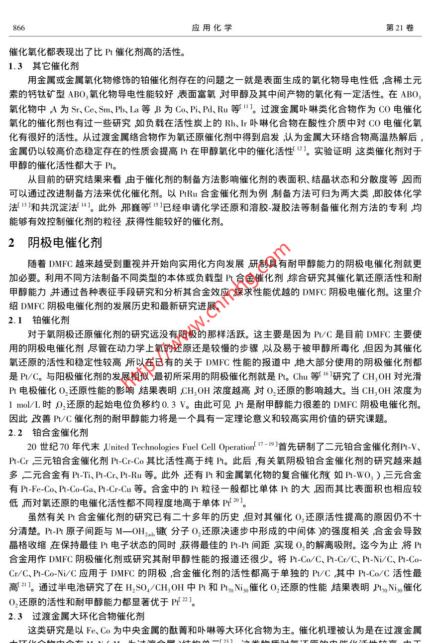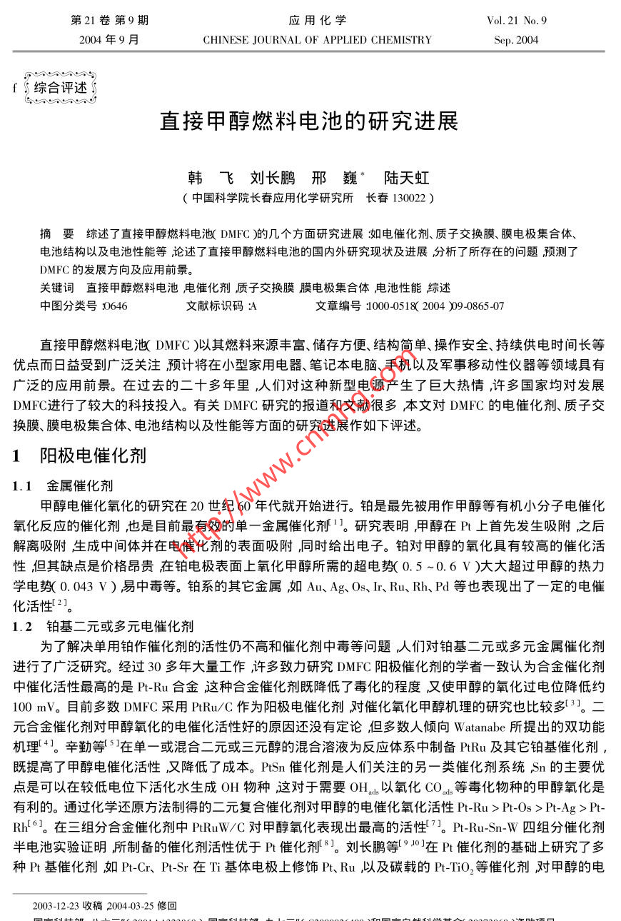 第21卷第9期應(yīng)用化學(xué)Vol.21 No. 92004年9月CHINESE JOURNAL OF APPLIED CHEMISTRYSep. 2004f$綜合評述樂5公公公公。直接甲醇燃料電池的研究進(jìn)展韓飛劉長鵬邢巍*陸天虹(中國科學(xué)院長春應(yīng)用化學(xué)研究所 長春130022 )商要綜述了直接甲醇燃料電池( DMFC )的幾個方面研究進(jìn)展:如電催化劑、質(zhì)子交換膜、膜電極集合體、電池結(jié)構(gòu)以及電池性能等論述了直接甲醇燃料電池的國內(nèi)外研究現(xiàn)狀及進(jìn)展分析了所存在的問題預(yù)測了DMFC的發(fā)展方向及應(yīng)用前景。關(guān)鍵詞直接甲醇燃料電池 電催化劑質(zhì)子交換膜膜電極集合體電池性能綜述中圖分類號:0646文獻(xiàn)標(biāo)識碼A文章編號1000-0518( 2004 )09-0865-07直接甲醇燃料電池( DMFC )以其燃料來源豐富、儲存方便、結(jié)構(gòu)簡單、操作安全、持續(xù)供電時間長等優(yōu)點(diǎn)而日益受到廣泛關(guān)注預(yù)計(jì)將在小型家用電器、筆記本電腦、手機(jī)以及軍事移動性儀器等領(lǐng)域具有廣泛的應(yīng)用前景。在過去的二十多年里人們對這種新型電源產(chǎn)生了巨大熱情,許多國家均對發(fā)展DMFC進(jìn)行了較大的科技投入。有關(guān)DMFC研究的報道和文獻(xiàn)很多本文對DMFC的電催化劑、質(zhì)子交換膜、膜電極集合體、電池結(jié)構(gòu)以及性能等方面的研究進(jìn)展作如下評述。1陽極電 催化劑1.1金屬催化劑甲醇電催化氧化的研究在20世紀(jì)60年代就開始進(jìn)行。鉑是最先被用作甲醇等有機(jī)小分子電催化氧化反應(yīng)的催化劑,也是目前最有效的單一金 屬催化劑'。研究表明甲醇在Pt上首先發(fā)生吸附,之后解離吸附生成中間體并在電催化劑的表面吸附,同時給出電子。鉑對甲醇的氧化具有較高的催化活性但其缺點(diǎn)是價格昂貴在鉑電極表面上氧化甲醇所需的超電勢( 0.5~0.6 V )大大超過甲醇的熱力學(xué)電勢( 0.043 V )易中毒等。鉑系的其它金屬如Au、Ag、Os、Ir、Ru、Rh、Pd等也表現(xiàn)出了一定的電催化活性[2。1.2鉑基二元或多元電催化劑為了解決單用鉑作催化劑的活性仍不高和催化劑中毒等問題,人們對鉑基二元或多元金屬催化劑進(jìn)行了廣泛研究。經(jīng)過30多年大量工作,許多致力研究DMFC陽極催化劑的學(xué)者一致認(rèn)為合金催化劑中催化活性:最高的是Pt-Ru合金這種合金催化劑既降低了毒化的程度,又使甲醇的氧化過電位降低約100mV。目前多數(shù)DMFC采用PtRu/C作為陽極電催化劑對催化氧化甲醇機(jī)理的研究也比較多3]。二元合金催化劑對甲醇氧化的電催化活性好的原因還沒有定論,但多數(shù)人傾向W atanabe所提出的雙功能機(jī)理4。辛勤等5在單一或混合二元或三元醇的混 合溶液為反應(yīng)體系中制備PtRu及其它鉑基催化劑,既提高了甲醇電催化活性,又降低了成本。PtSn 催化劑是人們關(guān)注的另-類催化劑系統(tǒng),Sn的主要優(yōu)點(diǎn)是可以在較低電位下活化水生成OH物種,這對于需要OHs以氧化CO .x 等毒化物種的甲醇氧化是有利的。通過化學(xué)還原方法制得的二元復(fù)合催化劑對甲醇的電催化氧化活性Pt-Ru> Pr-Os > Pt-Ag> Pt-Rht6]。在三組分合金催化劑中PtRuW/C對甲醇氧化表現(xiàn)出最高的活性7。PI-Ru-Sn-wW四組分催化劑半電池實(shí)驗(yàn)證明所制備的催化劑活性優(yōu)于Pt催化劑8]。劉長鵬等9J0]在Pt 催化劑的基礎(chǔ)上研究了多種Pt基催化劑如Pt-Cr、Pt-Sr 在Ti基體電極上修飾Pt、Ru,以及碳載的P-TiO2等催化劑對甲醇的電2003-12-23收稿2004-03-25 修回國家科技部八六三"( 2001AA323060 )國家科技部九七三"( G2000026408 )和國家自然科學(xué)基金( 20373068 )資助項(xiàng)目通訊聯(lián)氡疔鶿據(jù)男1963 年生研究員博士生導(dǎo)師; E-mail xingwei@ ciac. jl. cn ;研究方向化學(xué)電源和金屬表面電化學(xué)處理技術(shù)866應(yīng)用化學(xué)第21卷催化氧化都表現(xiàn)出了比Pt催化劑高的活性。1.3其它催化劑用金屬或金屬氧化物修飾的鉑催化劑存在的問題之-就是表面生成的氧化物導(dǎo)電性低含稀土元素的鈣鈦礦型ABO,氧化物導(dǎo)電性能較好表面富氧對甲醇及其中間產(chǎn)物的氧化有-定活性。在ABO3氧化物中A為Sr.Ce、Sm、Pb、La等,B為Co、Pi、Pd、Ru等!川。過渡金屬卟啉類化合物作為CO電催化氧化的催化劑也有過一些研究 如負(fù)載在活性炭上的Rh、Ir卟啉化合物在酸性介質(zhì)中對C0電催化氧化有很好的活性。從過渡金屬絡(luò)合物作為氧還原催化劑中得到啟發(fā),認(rèn)為金屬大環(huán)絡(luò)合物高溫?zé)峤夂?金屬仍以較高價態(tài)穩(wěn)定存在的性質(zhì)會提高Pt在甲醇氧化中的催化活性12。實(shí)驗(yàn)證明這類催化劑對于甲醇的催化活性都大于Pt。從目前的研究結(jié)果來看,由于催化劑的制備方法影響催化劑的表面積、結(jié)晶狀態(tài)和分散度等因而可以通過改進(jìn)制備方法來優(yōu)化催化劑。以PtRu合金催化劑為例制備方法可歸為兩大類,即膠體化學(xué)法13]和共沉淀法[14。此外邢巍等I51已經(jīng)申請化學(xué)還原和溶膠凝膠法等制備催化劑方法的專利均能夠有效控制催化劑的粒徑獲得性能較好的催化劑。2陰極電催化劑隨著DMFC越來越受到重視并開始向?qū)嵱没较虬l(fā)展研制具有耐甲醇能力的陰極電催化劑就更加必要。利用不同方法制備不同類型的本體或負(fù)載型Pt合金催化劑綜