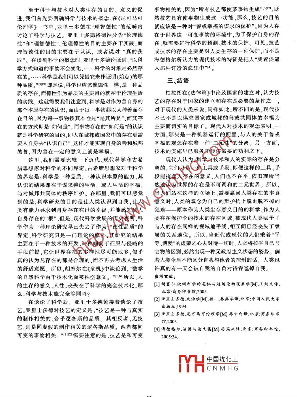 重慶科技學(xué)院學(xué)報(bào)(社會(huì)科學(xué)版) 2011年第22 期Joumal of Chongqing University of Science and Technology(Social Sciences Edition) No.22 2011論人與科學(xué)、技術(shù)劉俊摘要:伴隨近代科學(xué)對(duì)人類生活與文明的不斷改變,現(xiàn)代人對(duì)自身的地位觀念愈加自豪,因?yàn)槿祟愓嬲A取了自己,并同時(shí)贏取了世界。似乎在科學(xué)時(shí)代的以前人類是生活在虛擬上帝創(chuàng)造的世界之中因?yàn)榭茖W(xué)的精神需要證實(shí),而上帝的觀念缺乏實(shí)證。所以,世界的多祥價(jià)值應(yīng)該本源于人。但是在現(xiàn)代愈發(fā)急促的生活節(jié)奏面前,即技術(shù)的締結(jié)時(shí)代,現(xiàn)代人反思到我們?cè)陂_始失去自我,因?yàn)槿祟惉F(xiàn)在的生活處境已經(jīng)被迫拉上了這趟“科學(xué)技術(shù)時(shí)代的列車”,人在很多時(shí)候,只是無(wú)條件地順從,失去了該有的自我選擇。鑒于周圍生活的事實(shí),我們應(yīng)明確的看待胡塞爾關(guān)于現(xiàn)代科學(xué)與人的意義的危機(jī)或生存危機(jī)。關(guān)鍵詞:科學(xué);技術(shù);人;危機(jī);意義;倫理中圖分類號(hào):B80-05文獻(xiàn)標(biāo)識(shí)碼:A .文章編號(hào):1673-1999(2011)22-0024-02作者簡(jiǎn)介:劉俊(1981-),男,四川閬中人,四川外語(yǔ)學(xué)院(重慶400031)碩士研究生。收稿日期:2011-04-19-、“鑒于科學(xué)的不斷成功,真的存在著科而人類的--切成就將被看作是--場(chǎng)虛幻。學(xué)危機(jī)嗎?”二、科學(xué)與技術(shù)的概念“鑒于科學(xué)的不斷成功,真的存在著科學(xué)危機(jī)既然現(xiàn)代科學(xué)技術(shù)在開始模糊人的生存的意義,嗎?”([]13___ 這 是胡塞爾晚年關(guān)于人的存在的意義或那么科學(xué)與技術(shù)自身的意義也該是模糊的。因?yàn)榭茖W(xué)人的未來(lái)生存而對(duì)科學(xué)技術(shù)的不斷成功所提出的質(zhì)與技術(shù)的發(fā)端即在于服務(wù)人的存在和生活,所以,想.疑或挑戰(zhàn)。要明確人類存在的意義,就需要我們自己去翻閱一下如果沿循胡塞爾對(duì)科學(xué)的批判所指示的方向看歷史,去查看科學(xué)技術(shù)發(fā)展的前階段人類對(duì)“科學(xué)與去,現(xiàn)代社會(huì)似乎早已呈現(xiàn)出人的病癥。人類雖說(shuō)有技術(shù)”概念范疇的界定,去發(fā)現(xiàn)早先人們?cè)谠鯓拥姆读爽F(xiàn)代化城市,也有現(xiàn)代化的交通工具和發(fā)達(dá)的網(wǎng)絡(luò)圍或基礎(chǔ).上界定或支配科學(xué)與技術(shù)的?對(duì)此,我們可通訊技術(shù),但是鑒于人們對(duì)生活在全球化經(jīng)濟(jì)背景下以參考亞里士多德的《尼可馬可倫理學(xué)》中對(duì)科學(xué)和的切身體驗(yàn),人類對(duì)此似乎早已感到窒息。現(xiàn)代科學(xué)技術(shù)的思考與界定。技術(shù)所帶來(lái)的發(fā)展潮流在漸漸地沖刷掉我們?cè)緫?yīng)首先要思考的是,為什么亞里士多德是在“倫理有的東西。近代科學(xué)的興起,人們歡呼于自己所創(chuàng)造學(xué)"的基礎(chǔ)上來(lái)界定“科學(xué)與技術(shù)”概念的?我們知道,的科學(xué)與技術(shù),慶幸自己找到了適合自己的真正陸亞里士多德倫理學(xué)的思考在于界定倫理道德的品質(zhì)地,即人類找到了真正保護(hù)其自身的手段或武器。換區(qū)分,并以此更清晰地實(shí)施城邦的統(tǒng)治,即是說(shuō),道德言之,對(duì)于人類而言,科學(xué)與技術(shù)的存在就應(yīng)該是為品質(zhì)區(qū)分的關(guān)鍵在于與政治的聯(lián)姻。關(guān)于城邦,亞里士人類的生活服務(wù)的。但是到了現(xiàn)代,事情似乎顛倒了多德認(rèn)為,“所有城邦都....為某種善而建立的(23”,過(guò)來(lái)。即政治的目的在于幫助人們謀求到幸福?;趥惱砼c而胡塞爾早在20世紀(jì)初就對(duì)人類的生存發(fā)出了政治的聯(lián)姻謀篇,我們先來(lái)看一下亞里士多德在《尼這樣呼喊:“我們時(shí)代真正唯-有意義的斗爭(zhēng),是在已可馬可倫理學(xué)》中是怎樣討論倫理德性的。經(jīng)崩潰的人性和尚有的根基并為保持這種根基或?yàn)閬喞锸慷嗟略凇赌峥神R可倫理學(xué)》的開篇就論證尋求新的根基而奮斗的人性之間的斗爭(zhēng)。”(125 因?yàn)榈?“每種技藝與研究,同樣地,人的每種實(shí)踐和選擇,“人是理性的動(dòng)物,但是,只有當(dāng)它的整個(gè)人性是理性都以某種善為目的。"[33 這里需要澄清的一點(diǎn)是,古的人性時(shí),它才是這樣的東西?!?[126 胡塞爾的意思是,希臘的技藝中國(guó)煤化工與技術(shù)的概念。要贏取作為人的尊嚴(yán)或意義,需要我們?nèi)フJ(rèn)識(shí)人自己.鑒于此表述,:MHCN MHG目的在于輔導(dǎo)的獨(dú)特特性_理性 ,不然,“人是理性的動(dòng)物”這一人們?nèi)フJ(rèn)識(shí)事 物的本性,以利于城邦的統(tǒng)治,利于人表達(dá)式將變成為“人是動(dòng)物”。這樣,人的地位將失去,類的生存生活。.至于科學(xué)與技術(shù)對(duì)人類生存的目的、意義的促事物相關(guān)的,因?yàn)椤八屑妓嚩际鼓呈挛锷伞?1]1。既進(jìn),我們首先要明確科學(xué)與技術(shù)的概念。在(尼可馬可然技藝具有使事物生成這- -功能,那么,技藝的目的倫理學(xué)》-書中,亞里士多德在“理智德性”的范疇內(nèi)就應(yīng)該是一種對(duì)“善 或幸福的