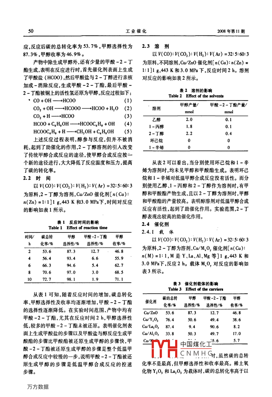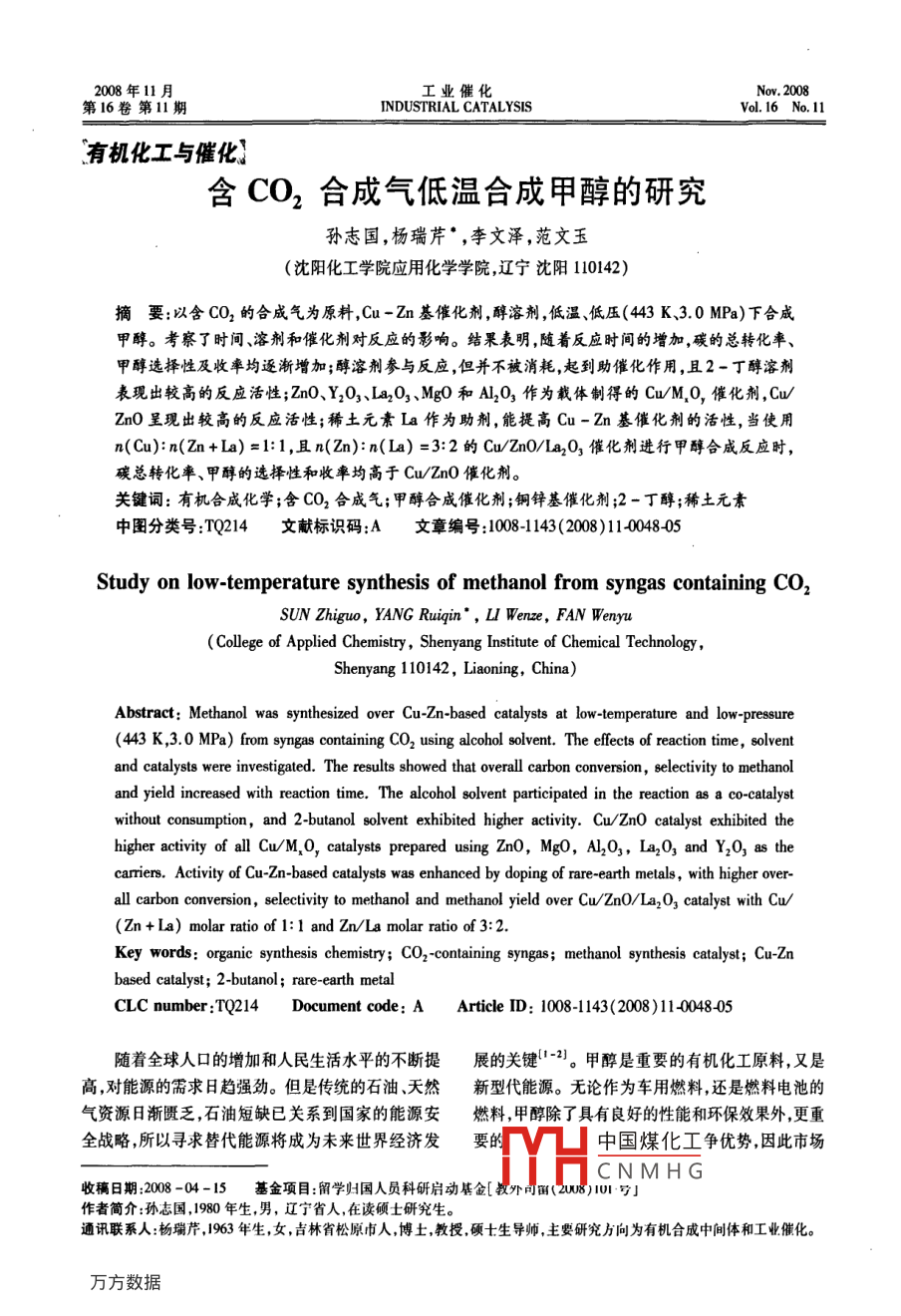 008年11月工業(yè)催化第16卷第11期INDUSTRIAL CATALYSISVol 16 No 11有機(jī)化工與催化含CO2合成氣低溫合成甲醇的研究孫志國,楊瑞芹·,李文澤,范文玉(沈陽化工學(xué)院應(yīng)用化學(xué)學(xué)院遼寧沈陽10142)摘要:以含CO2的合成氣為原料,Cu-Zn基催化劑,醇溶劑,低溫、低壓(443K、3.0MPa)下合成甲醇。考察了時(shí)間、溶劑和催化劑對反應(yīng)的影響。結(jié)果表明,隨著反應(yīng)時(shí)間的增加,碳的總轉(zhuǎn)化率、甲醇選擇性及收率均逐漸增加;醇溶劑參與反應(yīng),但并不被消耗,起到助催化作用,且2-丁醇溶劑表現(xiàn)出較高的反應(yīng)活性;ZnO、Y2O3、Ia2O3、Mg0和Al2O3作為載體制得的Cu/MO,催化劑,Cuzn0呈現(xiàn)出較高的反應(yīng)活性;稀土元素Ia作為助劑,能提高Cu-Zn基催化劑的活性,當(dāng)使用n(Cu):n(Zn+la)=l:l,且n(Zn):n(La)=3:2的Cu/ZnO/a2O3催化劑進(jìn)行甲醇合成反應(yīng)時(shí),碳總轉(zhuǎn)化率、甲醇的選擇性和收率均高于Cu/ZnO催化劑。關(guān)鍵詞:有機(jī)合成化學(xué);含CO2合成氣;甲醇合成催化劑;銅鋅基催化劑;2-丁醇;稀土元素中圖分類號(hào):TQ214文獻(xiàn)標(biāo)識(shí)碼:A文章編號(hào):1008143(2008)11004805Study on low-temperature synthesis of methanol from syngas containing COSUN Zhiguo, YANG Ruiqin, LI Wenze, FAN WenyuCollege of Applied Chemistry, Shenyang Institute of Chemical TechnologyShenyang 110142, Liaoning, China)Abstract Methanol was synthesized over Cu-Zn-based catalysts at low-temperature and low-pressure(443 K, 3.0 MPa)from syngas containing CO, using alcohol solvent. The effects of reaction time, solventand catalysts were investigated. The results showed that overall carbon conversion, selectivity to methanolnd yieldwithout consumption, and 2-butanol solvent exhibited higher activity. Cu/ Zn0 catalyst exhibitedhigher activity of all Cu/M, O, catalysts prepared using ZnO, MgO, AL,O,, La,O, and Y,0,ascariers. Activity of Cu-Zn-based catalysts was enhanced by doping of rare-earth metals, with higherall carbon conversion, selectivity to methanol and methanol yield over Cu/ZnO/La2 0, catalyst with(Zn+ La)molar ratio of 1: I and Zn/ La molar ratio of 3: 2.Key words: organic synthesis chemistry; CO2-containing syngas; methanol synthesis catalyst; Cu-Znbased catalyst; 2-butanol;CLC number: TQ214 Document code: A Article ID: 1008-1143(2008)11-0048-05隨著全球人口的增加和人民生活水平的不斷提展的關(guān)鍵2)。甲醇是重要的有機(jī)化工原料,又是高,對能源的需求日趨強(qiáng)勁。但是傳統(tǒng)的石油、天然新型代能源。無論作為車用燃料,還是燃料電池的氣資源日漸匱乏,石油短缺已關(guān)系到國家的能源安燃料,甲醇除了具有良好的性能和環(huán)保效果外,更重全戰(zhàn)略,所以尋求替代能源將成為未來世界經(jīng)濟(jì)發(fā)要中國煤化工爭優(yōu)勢因此市場CNMHG收稿日期:200804-15基金項(xiàng)目:留學(xué)歸國人員科研啟動(dòng)基金[教外句圖(28)號(hào)作者簡介:孫志國,1980年生,男,遼寧省人,在讀碩士研究通訊聯(lián)系人:楊瑞芹,1963年生,女,吉林省松原市人,博土,教授,碩士生導(dǎo)師,主要研究方向?yàn)橛袡C(jī)合成中間體和工業(yè)催化。2008年第11期孫志國等:含CO2合成氣低溫合成甲醇的研究前景看好3-。1.2催化劑的活性評(píng)價(jià)工業(yè)上幾乎所有的甲醇都是從含有體積分?jǐn)?shù)利用低溫合成甲醇新工藝,在漿態(tài)床靜態(tài)合成5%CO2含量的合成氣通過傳統(tǒng)的CI技術(shù),高溫、反應(yīng)裝置上進(jìn)行催化劑的活性評(píng)價(jià)。在外加磁力攪高壓[(523~573)K、(8~10)MPa]下氣相合成甲拌器的不銹鋼高壓反應(yīng)釜(150mL)中加入一定量醇。然而甲醇的合成反應(yīng)受熱力學(xué)控制通過的溶劑和催化劑樣品用原料氣v(co):v(CO2):ICI過程生產(chǎn)甲醇時(shí),由于反應(yīng)溫度較高,CO單程v(H2):(Ar)=32:5:60:3置換釜內(nèi)空氣3次,充轉(zhuǎn)化率只有20%。因此降低甲醇合成反應(yīng)的溫氣壓力10MPa。釜內(nèi)空氣排除后,室溫下向反應(yīng)度和壓力是提高CO轉(zhuǎn)化率和降低生產(chǎn)成本的釜內(nèi)充氣至30MPa攪拌升溫至44K,保持一定關(guān)鍵。時(shí)間,將反應(yīng)釜冷卻至室溫。用氣袋收集反應(yīng)后氣多年來低溫液相合成甲醇的研究引起國內(nèi)外體加入乙烷做內(nèi)標(biāo)用帶有甲烷轉(zhuǎn)化器的氣相色譜科研人員的廣泛關(guān)注。研究主要集中在使用(FD),在柱溫323K和檢測器溫度443K進(jìn)行氣相過渡金屬的陽離子鹽和堿金屬(堿土金屬)的醇鹽成分和含量分析。液相中加入1-丙醇為內(nèi)標(biāo)用(如 NaOMe、KOBu)催化劑在溶劑(或稀釋劑如甲帶有甲烷轉(zhuǎn)化器的氣相色譜(FID),柱溫443K和酸甲酯等)存在下,(343-423)K和(3-5)MPa顯檢測器溫度443K進(jìn)行液相成分和含量分析。進(jìn)而現(xiàn)出良好的反應(yīng)活性對甲醇選擇性也較高。計(jì)算碳的轉(zhuǎn)化率甲醇產(chǎn)量和選擇性。而此法的缺點(diǎn)是原料氣中痕量的CO2和H2O將使催化劑失活,從原料氣中完全除去CO2和H2O意味2結(jié)果與討論著增加成本,使低溫液相甲醇的合成很難實(shí)現(xiàn)大規(guī)2.1低溫合成甲醇新工藝的研究模工業(yè)化。因此,尋求一種低溫甲醇合成新技術(shù)成以W(CO):V(CO2):V(H2):v(Ar)=32:5:60:3為目前甲醇合成工業(yè)的熱點(diǎn)低溫甲醇的合成也是為原料, Cu/zno催化劑,2-丁醇為溶劑44K和甲醇工業(yè)的必然發(fā)展趨勢3.0MPa下反應(yīng)2h。反應(yīng)后氣相和液相中各組分本研究開發(fā