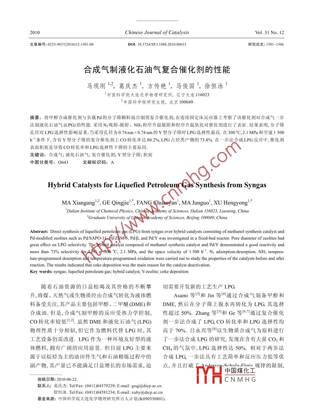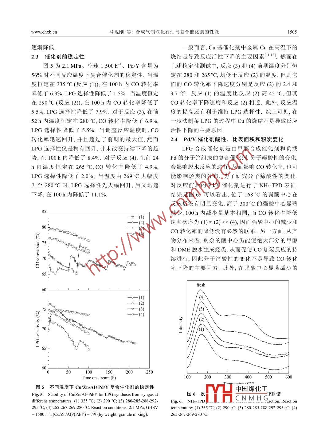 2010Chinese Journal of CatalysisVoL 31 No. 12文章編號:0253-9837(2010)12-1501-06DOI:10.3724/SPJ.10882010.00633研究論文:1501~1506合成氣制液化石油氣復合催化劑的性能馬現(xiàn)剛12,葛慶杰!,方傳艷,馬俊國!,徐恒泳中國科學院大連化學物理研究所,遼寧大連1160232中國科學院研究生院,北京100049摘要:將甲醇合成催化劑與負載Pd的分子篩顆?;旌现频脧秃洗呋瘎?在連續(xù)固定床反應器上考察了該催化劑對合成氣一步法制液化石油氣冮LPG)的性能.采用N2吸附-脫附、NH3程序升溫脫附和程序升溫氧化對催化劑進行了表征.結果表明,分子篩孔徑對LPG選擇性影響顯著,當采用孔徑為0.74mm×0.74nm的Y型分子篩時LPG選擇性最高.在300°C,21MPa和空速1500條件下,含有Y型分子篩的復合催化劑上CO轉化率達80.2%,LPG占烴類產物的738%.在一步法合成LPG反應中,催化劑表面積炭是導致CO轉化率和LPG選擇性下降的主要原因關鍵詞:合成氣;液化石油氣;復合催化劑;Y型分子篩;積炭中圖分類號:O643文獻標識碼:AHybrid Catalysts for liquefied Petroleum Gas synthesis from SyngasMA Xiangang", GE Qingjie,, FANG Chuanyan, MA Junguo, XU HengyongDalian Institute of Chemical Physics, Chinese academy of Sciences, Dalian 116023, Liaoning, China2Graduate University of Chinese Academy of Sciences, Beijing 100049, chinaAbstract: Direct synthesis of liquefied petroleum gas(LPG) from syngas over hybrid catalysts consisting of methanol synthesis catalyst andd-modified zeolites such as Pd/SAPO-11, Pd/ZSM-5, Pd/B, and Pd/Y was investigated in a fixed-bed reactor. Pore diameter of zeolites hadgreat effect on LPG selectivity. The hybrid catalyst composed of methanol synthesis catalyst and Pd/Y demonstrated a good reactivity andmore than 73% selectivity for LPG at 300C, 2.1 MPa, and the space velocity of 1 500 h". N2 adsorption-desorption, NH, tempera-ture-programmed desorption and temperature-programmed oxidation were carried out to study the properties of the catalysts before and afterreaction. The results indicated that coke deposition was the main reason for the catalyst deactivationKey words: syngas; liquefied petroleum gas; hybrid catalyst; Y-zeolite; coke deposition隨著石油資源的日益枯竭及其價格的不斷攀切需要開發(fā)新的工藝生產LPG升,將煤、天然氣或生物質經由合成氣轉化為液體燃Asami等和Jin等通過合成氣制備甲醇和料備受關注,其產品主要包括甲醇、二甲醚(DME)和DME,然后在分子篩上脫水再轉化為LPG,其選擇合成油.但是,合成氣制甲醇的反應受熱力學控制,性超過50%. Zhang等和Ge等7通過復合催化CO轉化率較低12.雖然DME和液化石油氣(LPG)劑一步法合成了 LPG, CO轉化率和LPG選擇性均物理性質十分相似,但它作為燃料代替LPG時,其高于70%.呂永興等以生物質合成氣為原料進行工藝設備仍需改進.LPG作為一種環(huán)境友好型的液了一步法合成LPG的研究,發(fā)現(xiàn)在含有大量CO2和體燃料,擁有廣闊的應用前景.但目前LPG主要來CH4的氣氛中,LPG選擇性達50%.相對于兩步法源于以烷烴為主的油田伴生氣和石油精煉過程中的合成LPG,一步法具有工藝簡單和反應壓力低等優(yōu)副產物,其產量已不能滿足日益增長的市場需求,迫點,并且打破Schulzflory規(guī)律的限制,中國煤化工收稿日期:2010-06-22CNMHG聯(lián)系人:葛慶杰.Tel/Fax:(041184379229;E-mil: geqjadicp.ac.cn徐恒泳. Tel/Fax:(0411)84581234;E-mail: xuhy adice.ac.cn基金來源:中國科學院大連化學物理研究所百人計劃(K090330801)1502催化學報Chin.J. Catal,2010,31:1501-1506使LPG的生成在熱力學上十分有利.此外,直接將化劑比表面積未改性的分子篩和甲醇合成催化劑混合,甲醇催化NH3-TPD實驗在 Micromeritics公司的Auto劑中的Cu加氫能力不足,產物中存在大量的烯烴,Chem2910型化學吸附儀上進行.催化劑裝量為容易發(fā)生鏈增長反應,產生積炭,致使催化劑失活,100mg.樣品先在He吹掃下以10°Cmin升至500因此需對分子篩改性,提高復合催化劑的加氫能力,℃C,恒溫1h,然后降至100°C.待催化劑吸附NH3使產物中的烯烴加氫變成烷烴,同時將碳鏈中碳原飽和后開始程序升溫,采用TCD檢測NH3脫附量子個數(shù)限制在3~4,以提高LPG選擇性氣體流量10m/min,升溫速率10°C/min.本文將甲醇合成催化劑分別與負載Pd的采用TPO技術對催化劑表面積炭進行了研究,SAPO-1,ZSM-5,β或Y型分子篩顆?;旌现频脧陀?Pfeiffer公司的GSD301型質譜在線分析.催化催化劑,考察了其在合成氣一步法制LPG反應的劑裝量為60mg.樣品先在Ar吹掃下以10Cmin催化性能,同時采用N2吸附-脫附、NH3程序升溫脫升溫至200°C,恒溫Ih,然后降至50°C,切換成5%附(NH3-TPD)和程序升溫氧化(TPO)等方法對催O2-95%Ar混合氣進行TPO試驗,氣體流量30化劑進行了表征,分析了催化劑失活的原因ml/min,升溫速率10°C/min實驗部分2結果與討論1.1催化劑的制備由合成氣一步制備LPG包括四個互相關聯(lián)的采用離子交換法制備Pd分子篩催化劑,分子篩反應過程,即甲醇合成、甲醇脫水、二甲醚脫水和水分別采用SAPO-1(0.8),ZSM-5(50,(25)和Y(6),汽變換反應括號中數(shù)字為SiAl比.在攪拌下將分子篩加入60CO+2H2+CH3OH-9103 kJ/mol(1)℃C的PdCl2溶液中,溶液中Pd與分子篩質量比為2CH3OH E= CH3 OCH3+H2O-2267 kJ/mol (2)1:200,離子交換8h,抽濾、洗滌、烘干,然后在550°CCH3OCH3 Hydrocarbons +H2O(3)焙燒6h,分別記為Pd/SAPO-1,Pd/ZSM-5,Pdβ和H2O+CO= CO2+H2-41 12 kJ/mol(4)PdY.按文獻[9]所述方法制備了SAPO-11分子篩,總反應式其它分子篩由南開大學催化劑廠提供.將工業(yè)甲醇2nCO+(n+1)H2+CnH2n+2+nCO2--210 kJ/mol(5)合成催化劑 Cu/zno/A12O3(Cu/Zn/A)和Pd/分子篩由于反應(1)受熱力學控制,因
