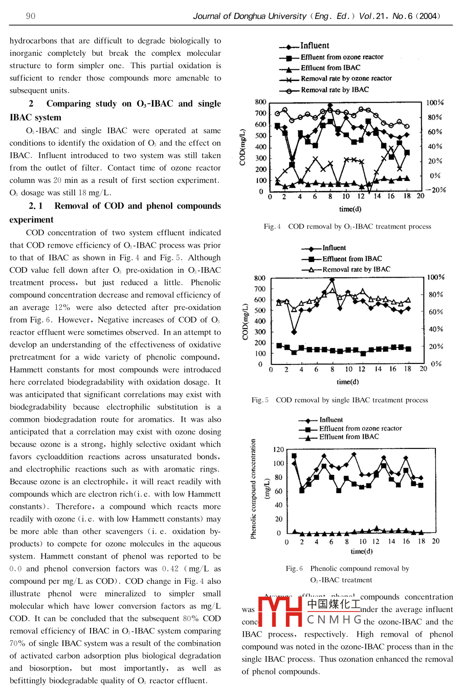 Journal of donghua University( Eng. Ed.) Vol 21, No 6(2004)Phenolic Compound Removal in Coal-gas Wastewater by O3-IBACMA Fang(馬放), YANG Hai-yan(楊海燕), YANG Ji-xian(楊基先), QIN Song-yan(秦松巖), GAO Jie(高杰), XI Xin-xin(席欣欣)School of Municipal & Environment Engineering, Harbin Institute of Technology, Harbin 150090Acclimated bacteria with high ability of phenolic compound treatment plants and have been fulfilling expectationsbiodegradation were immobilized on granular activatOzone is one of the well-known strong oxidizing gases. Itcarbon to form Immobilization Bacteria Activated Carbonreacts with organic substances directly and indirectly in(IBAC). Ozone and IBAC combined process was applied to aqueous phase, The direct reaction is caused by the additiontreat coal-gas wastewater containing phenolic compoundsof ozone molecules to double bonds of organic substancesOptimum ozone dosage and contact time were determined to and the indirect reaction is the oxidation by free radicalsbe 18 mg/L and 20 min. Although pre-oxidation contributed producedgh consecutive reactions caused by thelittle to the removal of total organic carbon ( TOC ) it hydrolysis of ozone. Therefore, ozone plus IBACchanged the characteristics and structure of organic treatment for the removal of phenol was performed tosubstance in the wastewater. By using of ozone-IBAC examine the effects 5. 3treatment. when influent contained 500 mg /L cod and95 mg/L phenol, the removal rates of COD and phenol are Materials and methodshigher than 80% and 92%. After 6 months of operationclimated bacteria abundance maintained above 6. X 101 Isolation and acclimation of phenol degradingbacteriabacteria distribute evenly on the activated carbon. The long-Thirteen phenol degrading strains were isolated fromterm steady viability and high biodegradation efficiency of aerobic activated sludge. After cultivation in the flask, Removalcclimated bacteria are discussed according to the ecological efficiency of every strain was determined. Four stains that areprinePl( Pseudomonas), P2( Brevibacterium). P3( PseudomonasKeywords: ozone, IBAC, biodegradation, acclimated and P4( Bacillus were expected to be high efficiencybacteriabiodegrading bacteria with the 99. 13%, 98. 36%, 97. 9%andrespproIntroductionquickly. Then inorganic culture was dosed at an increasingquantity to promote biomass to adapt wastewater, AfterPhenolic compounds are prevalent in many industrial acclimation with alternative enrichment medium and inorganicwastewaters,especially in coal-gas industrial, where phenol culture, the biomass can be used as a starter of IBAC. Table 1compounds are major reagent during the whole production shows the composition of two kind of cultureprocess. Since they must act without changing their ownTable 1 Composition of enrichment mediumchemical structures during the whole processare veryand inorganic culturestable and can withstand adverse situation. As a resultthey are usually bio-recalcitrancy because of their chemicalEnrichment mediumInorganic culturestability and partly because of their toxicity toPhosphatic buffer2.0g/Lmicroorganisms. Wastewater containing such substance wasAmmonium nitrate0.5g/Ldifficult to be treatedIBAC treatment, which combines physical adsorptionK2HPO: 1g/LCalcium chloride 0. 025g/Lby activated carbon and biodegradation by microorgolutiongrowing in the carbon bed, is being widely applied as oneTH中國煤化工 Ide solution0.0023g1-im sulphuretof the efficient wastewater treatment technologies. IngCNMH Gutiombined processes of ozone and IBACPhenolic wastewater05 g/Ltreatments have been applied to several municipal water*Received Nov 2, 2003Correspondence should be addressed to YANG Hai-yanJournal of donghua University( Eng Ed) Vol 21. No 6(2004) 892 Formation of IBAC5 Analysis MethodAcclimated biomass liquid culture was pumped toThe concentrations of UV254, phenol in the Ibaccirculate in the IBAC column for two hours, then pump column were determined using a UV-Vis spectrolstopped for two hours interval. Sterile water was poured to (S52, Lingguang Co., China ) the iodimetry werewash activated carbon bed and carrying layer after 4employed to determine O concentration. TOChours. Clear effluent means thosecells were concentration was determined by ToC analyzer VcpNimmobilized on the activated carbon and IBAC were SSM-5 000A, Japan). DO was measured by DO meter(YSIformed. Microbe cell attached homogeneously on the 5000, YSI Incorporate, USA). The microbial populationcarbon at an average amount of 5. 6 X 10 cfu/(g carbon) in the activated carbon was enumerated by plate countinghich keep stable at the same depth of carbon bedmethoc3 Experimental installationFig. I shows the schematic diagram of reactors used in Result and discussionthe pilot-scale experiment. Reactors were made oftransparent polyvinyl columns. O contact columnRemoval of UV254 and toc by O pre-85 mm inner diameter and 700 mm height. O3 gasproduced from the ozonizer SHJ-2, China ), then wasA static beaker experiment was operated beforeintroduced with water to the bottom of o contact columncontinuously dynamic experiment to determine the optimalnd passed through metal filament filter. Two IBO3 dosage. Result indicates 18 mg/L is economic andolumns have the same volume and parameters that are efficient. Contact time between influent and O. was150 mm for inner diameter and I 500 mm high. Carrying increasing from o to 30 min to observe removal of UV254layer with 0. 2 m thickness made up of sand were fixed on and TOC by O, oxidation. As the time increasing, UV254the supporting ply. Activatedgranularityrate reached to 20% and 25% respectively and then made0.8 m thick fixed bed. Sampling ports were installed at little change Fig. 2). TOC of effluent in Fig200 mm intervals along one side wall of the reactor tefluctuating in a small range from 680 to 710 mg/L showscollect water sample and carbon sample. Wastewatertotal amount of organic materials cantfed co