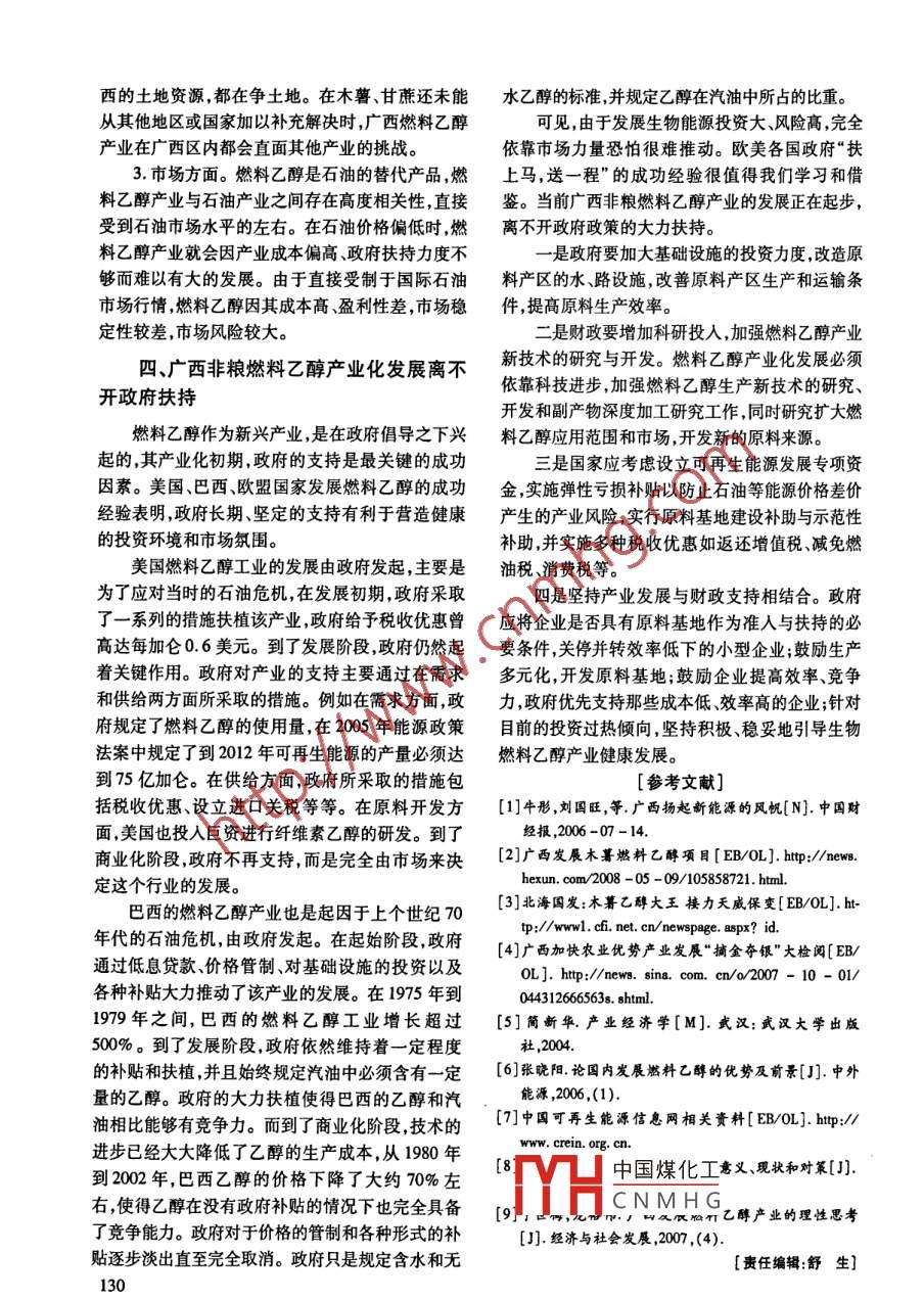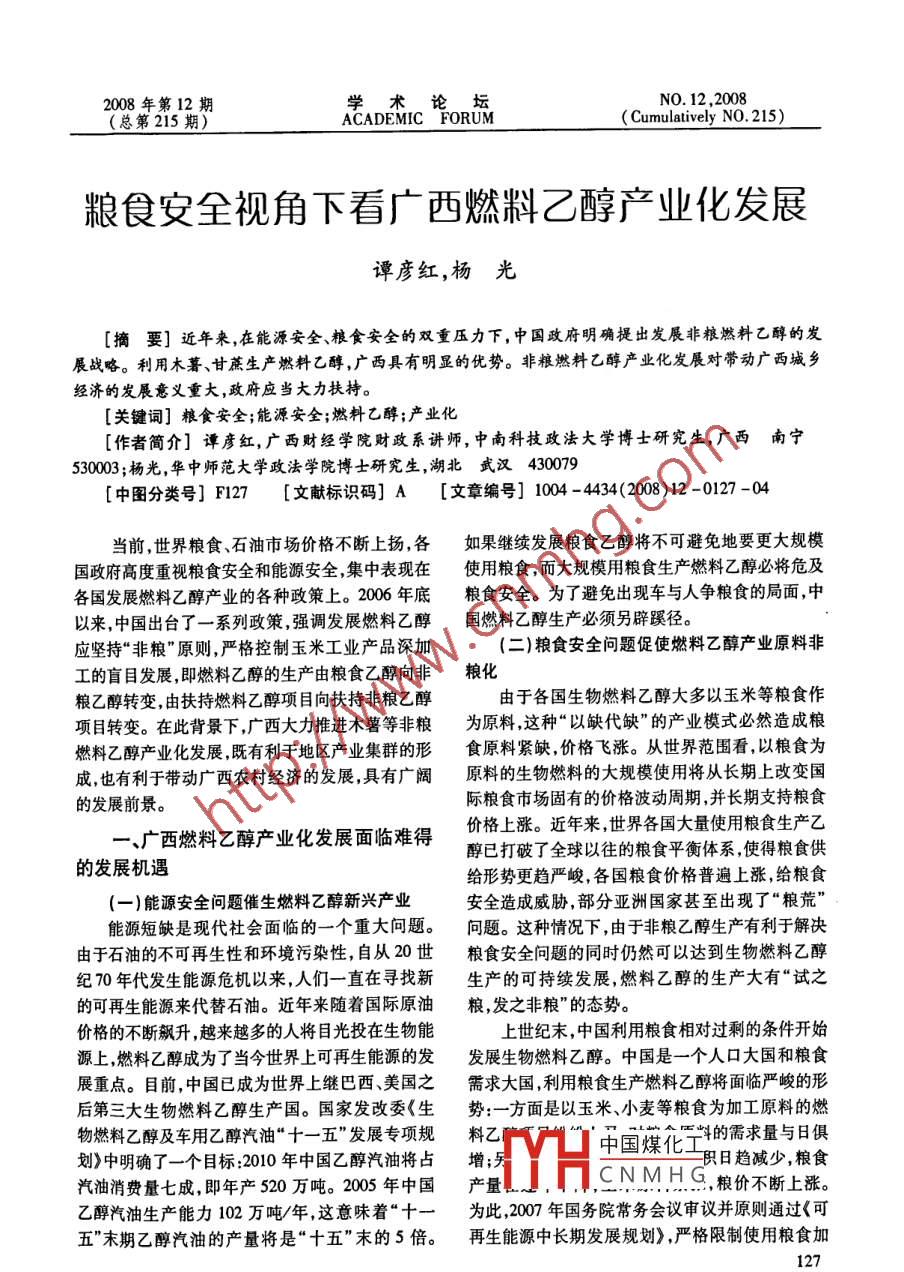 200年第12期NO.12,2008(總第215期)ACADEMIC FORUMCumulatively NO 215)踉食安全枧角下看廣西燃料乙醇產(chǎn)業(yè)化發(fā)展譚彥紅,楊光摘要]近年來,在能源安全、糧食安全的雙重壓力下,中國政府明確提出發(fā)展非糧燃料乙醇的發(fā)展戰(zhàn)略。利用木薯、甘蔗生產(chǎn)燃料乙醇,廣西具有明顯的優(yōu)勢。非糧燃料乙醇產(chǎn)業(yè)化發(fā)展對帶動廣西城鄉(xiāng)經(jīng)濟的發(fā)展意義重大,政府應當大力扶持[關鍵詞]糧食安全;能源安全;燃料乙醇;產(chǎn)業(yè)化作者簡介]譚彥紅,廣西財經(jīng)學院財政系講師,中南科技政法大學博士研究生,廣西南寧530003;楊光,華中師范大學政法學院博士研究生,湖北武漢430079[中圖分類號]F27[文獻標識碼]A[文章編號]1004-4434(2008)12-0127-04當前,世界糧食、石油市場價格不斷上揚,各如果繼續(xù)發(fā)展糧食乙醇將不可避免地要更大規(guī)模國政府高度重視糧食安全和能源安全,集中表現(xiàn)在使用糧食,而大規(guī)模用糧食生產(chǎn)燃料乙醇必將危及各國發(fā)展燃料乙醇產(chǎn)業(yè)的各種政策上。2006年底糧食安全。為了避免出現(xiàn)車與人爭糧食的局面,中以來,中國出臺了一系列政策強調(diào)發(fā)展燃料乙醇國燃料乙醇生產(chǎn)必須另辟蹊徑。應堅持“非糧”原則,嚴格控制玉米工業(yè)產(chǎn)品深加(二)糧食安全問題促使燃料乙醇產(chǎn)業(yè)原料非工的盲目發(fā)展即燃料乙醇的生產(chǎn)由糧食乙醇向非糧化糧乙醇轉變,由扶持燃料乙醇項目向扶持非糧乙醇由于各國生物燃料乙醇大多以玉米等糧食作項目轉變。在此背景下,廣西大力推進木薯等非糧為原料,這種“以缺代缺”的產(chǎn)業(yè)模式必然造成糧燃料乙醇產(chǎn)業(yè)化發(fā)展,既有利于地區(qū)產(chǎn)業(yè)集群的形食原料緊缺,價格飛漲。從世界范圍看,以糧食為成也有利于帶動廣西農(nóng)村經(jīng)濟的發(fā)展,具有廣闊原料的生物燃料的大規(guī)模使用將從長期上改變國的發(fā)展前景際糧食市場固有的價格波動周期,并長期支持糧食廣西燃料乙醇產(chǎn)業(yè)化發(fā)展面臨難得價格上漲。近年來世界各國大量使用糧食生產(chǎn)乙醇已打破了全球以往的糧食平衡體系使得糧食供的發(fā)展機遇給形勢更趨嚴峻各國糧食價格普遍上漲,給糧食(一)能源安全問題催生燃料乙醇新興產(chǎn)業(yè)安全造成威脅部分亞洲國家甚至出現(xiàn)了“糧荒能源短缺是現(xiàn)代社會面臨的一個重大問題。問題。這種情況下,由于非糧乙醇生產(chǎn)有利于解決由于石油的不可再生性和環(huán)境污染性,自從20世糧食安全問題的同時仍然可以達到生物燃料乙醇紀70年代發(fā)生能源危機以來人們一直在尋找新生產(chǎn)的可持續(xù)發(fā)展,燃料乙醇的生產(chǎn)大有“試之的可再生能源來代替石油。近年來隨著國際原油糧,發(fā)之非糧”的態(tài)勢。價格的不斷飆升,越來越多的人將目光投在生物能上世紀末,中國利用糧食相對過剩的條件開始源上燃料乙醇成為了當今世界上可再生能源的發(fā)發(fā)展生物燃料乙醇。中國是一個人口大國和糧食展重點。目前,中國已成為世界上繼巴西、美國之需求大國,利用糧食生產(chǎn)燃料乙醇將面臨嚴峻的形后第三大生物燃料乙醇生產(chǎn)國。國家發(fā)改委《生勢:一方面是以玉米、小麥等糧食為加工原料的燃物燃料乙醇及車用乙醇汽油“十一五”發(fā)展專項規(guī)料乙峰的需求量與日俱劃》中明確了一個目標2010年中國乙醇汽油將占增日趨減少,糧食汽油消費量七成即年產(chǎn)520萬噸。2005年中國產(chǎn)量CNMHG,糧價不斷上漲。乙醇汽油生產(chǎn)能力102萬噸/年,這意味著“十一為此,2000年國務院常務會議審議并原則通過《可五”末期乙醇汽油的產(chǎn)量將是“十五”末的5倍。再生能源中長期發(fā)展規(guī)劃》,嚴格限制使用糧食加工燃料乙醇停止建設糧食乙醇燃料項目,在不得植面積,木薯年產(chǎn)值的28億元中農(nóng)民只有16億元占用耕地、不得消耗糧食、不得破壞生態(tài)環(huán)境的原收入,而在廣西“十一五”規(guī)劃完成之后,木薯的總則下,要求燃料乙醇項目的原料堅持以非糧為主,產(chǎn)值將達到280億元,全區(qū)農(nóng)民的收入也會因此增重點支持木薯甜高粱以及纖維資源等非糧原料產(chǎn)加160億元。在北海市,007年由于20萬噸木業(yè)發(fā)展。薯燃料乙醇項目建成投產(chǎn),鮮木薯收購保護價為可見在能源安全與糧食安全的雙重壓力下,450元/噸最高收購價達600元/噸按照平均收大力發(fā)展非糧燃料乙醇產(chǎn)業(yè)必將成為今后生物燃購價520元/噸計,2007年可使農(nóng)民收入達78億料生產(chǎn)的主要方向。而在利用木薯糖蜜等非糧原元,僅價格因素薯農(nóng)人均增收1050元。該項目還料加工燃料乙醇方面廣西具有明顯的比較優(yōu)勢??梢杂行У卮龠M農(nóng)村就業(yè),按每個薯農(nóng)種植3畝木二、廣西非糧燃料z醇產(chǎn)業(yè)化發(fā)展的重薯計算,可以解決20萬農(nóng)村勞動力就近就業(yè)問大現(xiàn)實意義題2。另一方面如果發(fā)展混合型燃料乙醇,還可有效解決糧食的轉化問題,形成一個長期、穩(wěn)定、可發(fā)展生物質能源,直指中國三大世紀難題:控糧食消費市場,緩解因糧食階段性和結構性過剩三農(nóng)”、環(huán)保和能源問題。廣西作為中國第一個導