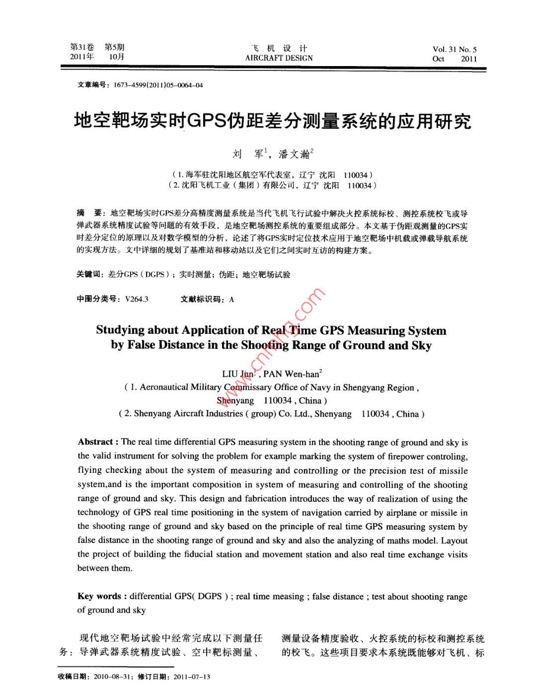 第31卷第5期飛機設(shè)計Vol 31 No 52011年10月AIRCRAFT DESIGNOct 2011文章編號:1673-4599(2011)05-006404地空靶場實時GPS偽距差分測量系統(tǒng)的應(yīng)用研究劉軍,潘文瀚2(1.海軍駐沈陽地區(qū)航空軍代表室,遼寧沈陽110034(2沈陽飛機工業(yè)(集團)有限公司,遼寧沈陽110034)摘要:地空靶場實時GPS差分高精度測量系統(tǒng)是當(dāng)代飛機飛行試驗中解決火控系統(tǒng)標(biāo)校、測控系統(tǒng)校飛或?qū)椢淦飨到y(tǒng)精度試驗等問題的有效手段,是地空靶場測控系統(tǒng)的重要組成部分。本文基于偽距觀測量的GPS實時差分定位的原理以及對數(shù)學(xué)模型的分析,論述了將GPS實時定位技術(shù)應(yīng)用于地空靶場中機載或彈載導(dǎo)航系統(tǒng)的實現(xiàn)方法。文中詳細(xì)的規(guī)劃了基準(zhǔn)站和移動站以及它們之間實時互訪的構(gòu)建方案。關(guān)鍵詞:差分GPS(DCFS);實時測量;偽距;地空靶場試驗中圖分類號:V264.3文獻(xiàn)標(biāo)識碼:AStudying about application of Real Time GPs Measuring Systemby False Distance in the Shooting Range of Ground and SkyLIU Jun Pan Wen-han(1. Aeronautical Military Commissary Office of Navy in Shengyang RegionShenyang 110034, China(2. Shenyang Aircraft Industries( group)Co. Ltd, Shenyang 110034, ChinaAbstract The real time differential GPS measuring system in the shooting range of ground and sky isthe valid instrument for solving the problem for example marking the system of firepower controling,flying checking about the system of measuring and controlling or the precision test of missilesystem, and is the important composition in system of measuring and controlling of the shootingrange of ground and sky. This design and fabrication introduces the way of realization of using thetechnology of GPs real time positioning in the system of navigation carried by airplane or missile inthe shooting range of ground and sky based on the principle of real time GPS measuring system byfalse distance in the shooting range of ground and sky and also the analyzing of maths model. Layoutthe project of building the fiducial station and movement station and also real time exchange visitsbetween themKey words: differential GPS( DGPS ) real time measing; false distance test about shooting rangeof ground and sky現(xiàn)代地空靶場試驗中經(jīng)常完成以下測量任測量設(shè)備精度驗收、火控系統(tǒng)的標(biāo)校和測控系統(tǒng)務(wù):導(dǎo)彈武器系統(tǒng)精度試驗、空中靶標(biāo)測量的校飛。這些項目要求本系統(tǒng)既能夠?qū)︼w機、標(biāo)收稿日期:201008-31;修訂日期:2011-07-13劉軍等:地空靶場實時GPS偽距差分測量系統(tǒng)的應(yīng)用研究靶等動態(tài)目標(biāo)髙精度定位,又作為髙精度位置基要求不高,可以忽略不計。忽略衛(wèi)星星歷的誤準(zhǔn)對靶場其它測量設(shè)備進(jìn)行精度檢測,同時還具差,將由廣播星歷所得的衛(wèi)星坐標(biāo)作為已知值有強大的信息實時處理、事后處理和傳輸通訊能由上述改正之后,式(1)中的未知數(shù)只有測站坐力。地空靶場實時GPS差分高精度測量系統(tǒng)是解標(biāo)x,y,z和接收機鐘差,則只需觀測4顆衛(wèi)星就決以上問題的有效手段,是地空靶場測控系統(tǒng)的可解出這4個未知數(shù)。將觀測方程繞測點近似坐標(biāo)重要組成部分。本文采用測碼偽距觀測量進(jìn)行實進(jìn)行線性化,將觀測歷元所有的觀測量寫成矩陣時GPS定位。偽距單點定位精度較低,使用P碼形式(或Y碼)的精密定位服務(wù)(PPS),只有美國軍L +V=AX(4)方及特許用戶使用。使用C/A碼的標(biāo)準(zhǔn)定位服務(wù)式中:L為觀測值向量;V為改正數(shù)向量;X為未(SPs),精度在30m左右。美國為自身的安全利知數(shù)向量(XYZ6T);A為相應(yīng)的系數(shù)矩陣。設(shè)所益,采取選擇可用性政策(SA),利用CA碼的平有的偽距觀測量為等精度,權(quán)陣設(shè)為單位陣。面定位精度降到約100m,垂直誤差約150m,使當(dāng)觀測量n<4時,無解;許多導(dǎo)航定位不能采用C/A碼偽距單點定位技術(shù)。n=4時,有唯一解X=AL為提高定位精度,必須采用差分定位技術(shù),因為m>4時,有最小二乘解X=(AA)ALSA政策對差分法可認(rèn)為沒有影響,因而基于偽距當(dāng)測站坐標(biāo)的初始值誤差較大時,可采用迭觀測值的差分法定位,近年來成為國內(nèi)外研究的代法求解。課題。22實時差分法動態(tài)定位動態(tài)相對定位是采用2臺GPS接收機。一臺接2動態(tài)定位的數(shù)學(xué)模型收機在已知點上固定,稱為參考站;一臺接收機21單點動態(tài)定位安置在運動載體上,稱為流動站。參考站和流動GPS定位的原理可敘述如下。將運動的衛(wèi)星站同步觀測視場中的衛(wèi)星,確定流動站與參考站作為已知點。設(shè)T為衛(wèi)星發(fā)射信號時的理想GPS之間的瞬時位置。具體實現(xiàn)DPS有4種方法:時刻;T為接收機收到信號的GPS時刻;ST為接①基準(zhǔn)站發(fā)播偽距校正,在流動站上處理;收機時鐘誤差;67為衛(wèi)星時鐘誤差;則考慮鐘差③基準(zhǔn)站發(fā)播位置校正,在流動站上處理的傳播時間為:③用戶粗測偽距值送基準(zhǔn)站,在基準(zhǔn)站進(jìn)行△=(768+7)-(Tms+67“)=(T-Tm)+8T6-67°差分處理再考慮電離層折射對測距的影響δ和對流層④用戶未校正的位置數(shù)據(jù)送基準(zhǔn)站,在基準(zhǔn)折射對測距的影響6,最后得衛(wèi)星至接收機的偽站進(jìn)行差分處理。距為我們選擇了第1種實現(xiàn)方式。動態(tài)相對定位P=C·(7-Tas)+C.0-C.8°+80、(1