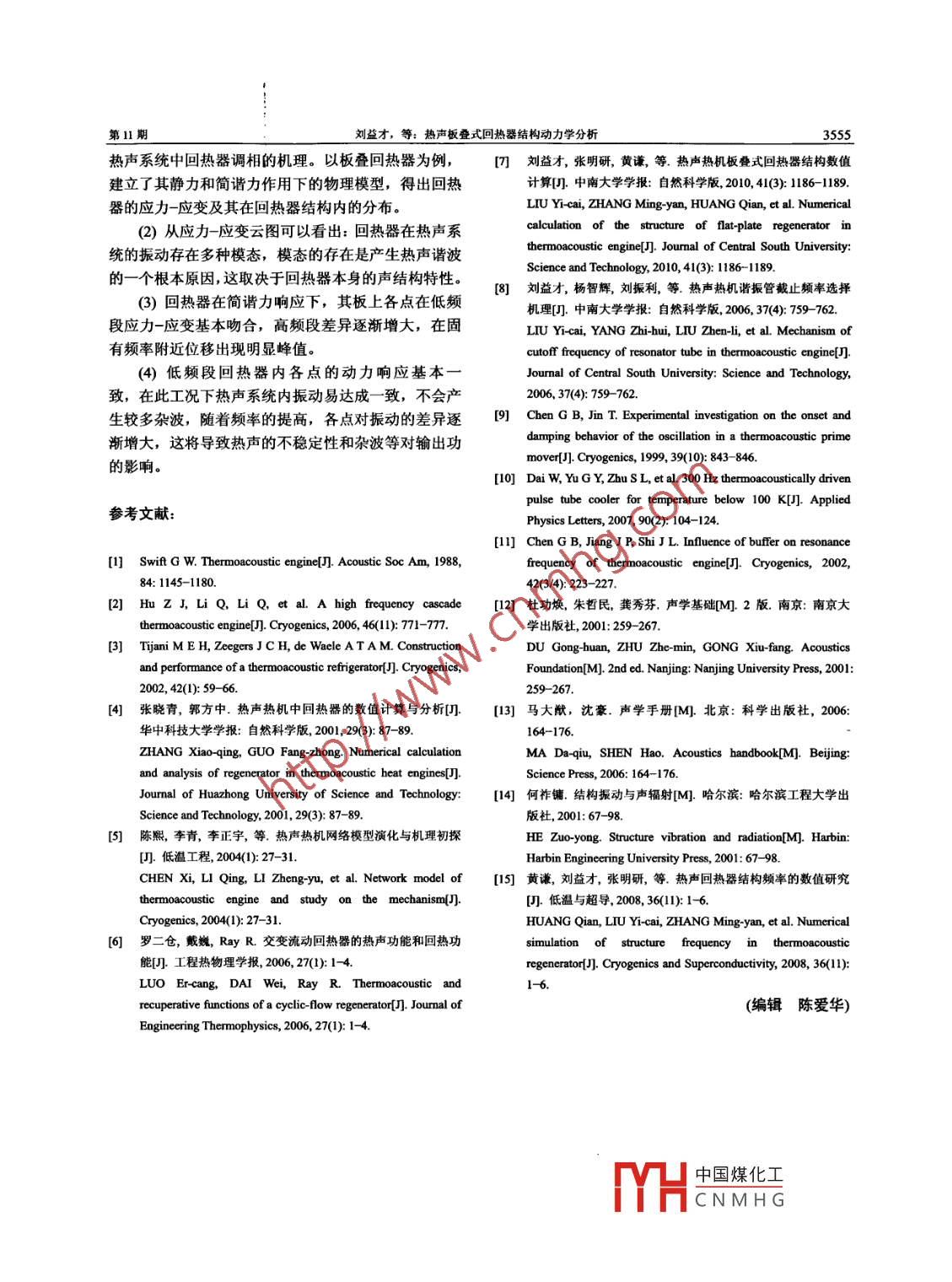 第42卷第11期中南大學(xué)學(xué)報(自然科學(xué)版)vol, 42 No 112011年11月Journal of Central South University(Science and Technology)Nov.2011熱聲板疊式回?zé)崞鹘Y(jié)構(gòu)動力學(xué)分析劉益才,辛天龍,陳思明,楊培志,馬衛(wèi)武(中南大學(xué)能源科學(xué)與工程學(xué)院,湖南長沙,410083)摘要:分別利用 Solidworks和 ANSYS軟件對熱聲系統(tǒng)中回?zé)崞鞯臒崧暀C(jī)理從結(jié)構(gòu)動力學(xué)角度進(jìn)行模擬研究。建立三維板疊式回?zé)崞鞯奈锢砟P?得到在0.5,0.6和07MPa充氣壓力作用下和在系統(tǒng)內(nèi)諧振動作用下回?zé)崞鞯母鲃恿W(xué)參數(shù)的響應(yīng)及其分布。從模擬結(jié)果得出:回?zé)崞髟跓崧曄到y(tǒng)振動中存在多種模態(tài):在低頻段各點(diǎn)應(yīng)力應(yīng)變基本吻合,高頻段各點(diǎn)差異逐漸增大;在一階固有頻率3300Hz附近,回?zé)崞鲀?nèi)各點(diǎn)的應(yīng)力和應(yīng)變達(dá)到最大值。關(guān)鍵詞:熱聲;回?zé)崞?模擬;動力學(xué)響應(yīng);模態(tài)中圖分類號:TG651文獻(xiàn)標(biāo)志碼:A文章編號:1672-7207(201)13551-05Analysis of structural dynamics inthermoacoustic flat-plate regeneratorLIU Yi-cai, XIN Tian-long, CHEN Si-ming, YANG Pei-zhi, MA Wei-wu(School of Energy Science and Engineering, Central South University, Changsha 410083, China)Abstract: Mechanism of regenerator in thermoacoustic system was studied using Solidworks and ANSYS softwareSimulation was made from the new perspective of structural dynamics. A three dimensional physical model of theflat-plate regenerator was obtained Under different inflation pressures which were 0.5, 0.6 and 0. 7 MPa respectively andthe harmonic condition, the response of various dynamics parameters and distribution on the regenerator was gained. Thesimulation results show that regenerator in the thermoacoustic system exists in a variety of vibration modes. Stress andstrain are almost coincident in the low frequency band while the difference gradually increases with the frequency is inthe high band. At 3 300 Hz of the first order natural frequency, stress and strain of the points inside the regenerator reachthe maximumKey words: thermoacoustic; regenerator; simulation; dynamic response; mode作為熱聲系統(tǒng)的關(guān)鍵部件,回?zé)崞鞯恼{(diào)相機(jī)理及處于密閉環(huán)境當(dāng)中固體介質(zhì)與氣體介質(zhì)間復(fù)雜的相互其在熱聲中的實(shí)質(zhì)作用一直被國內(nèi)外廣泛研究與。在作用必然會形成某種作用力,這一作用力對于回?zé)崞鳠崧曄到y(tǒng)回?zé)崞髦醒毓腆w壁面?zhèn)鞑サ穆暡ê妥饔糜谠撃酥琳麄€熱聲系統(tǒng)熱聲轉(zhuǎn)換效率的影響還沒有深入研方向的固體溫度梯度相耦合會造成一個橫向的熱波,究。根據(jù)結(jié)構(gòu)聲理論,當(dāng)某個力作用于結(jié)構(gòu)上時,會實(shí)際上就是利用填充材料調(diào)節(jié)熱波與速度波之間的相引起結(jié)構(gòu)自身的振動,這也是結(jié)構(gòu)聲產(chǎn)生的一個重要位差使得熱波相位滯后于速度波相位,這可以說是目原因即振動激勵214。研究表明回?zé)崞髀晫W(xué)特性與頻前公認(rèn)的回?zé)崞髡{(diào)相機(jī)理6。然而在這一過程中率存在一定關(guān)系,在某一頻率下其聲學(xué)特性最佳。而收稿日期:2010-12-17;修回日期:20I103-25基金項目:國家自然科學(xué)基金資助項目(5066110):中南大學(xué)研究生學(xué)位論文創(chuàng)新選題基金資助項目(20095x1082)通信作者:劉益才(1968-),男,湖南邵陽人,教授,從事熱聲熱機(jī)、斯特林制冷機(jī)、高效蓄冷蓄中國煤化工冷系統(tǒng)振動和噪聲抑制等研究;電話:13755052517;E-mail:lyccsu@csu.edu.cnCNMH中南大學(xué)學(xué)報(自然科學(xué)版)第42卷結(jié)構(gòu)聲是回?zé)崞鳈C(jī)構(gòu)所固有的聲學(xué)特性,值得注意的是,當(dāng)結(jié)構(gòu)發(fā)生振動時是以多個模態(tài)振動。當(dāng)某個模態(tài)的固有頻率與熱聲熱機(jī)系統(tǒng)的振蕩頻率一致時究竟會對系統(tǒng)效率造成何種影響還需要進(jìn)一步的研究。黃謙等以平面二維結(jié)構(gòu)只針對回?zé)崞髦械囊粔K板進(jìn)行過模態(tài)分析研究,本文作者從三維空間結(jié)構(gòu)針對回?zé)崞魈畛洳牧险w由于振動所激勵產(chǎn)生的一些影響結(jié)構(gòu)聲輻射的參數(shù)進(jìn)行分析。1模型建立為了更為清楚地分析回?zé)崞鲀?nèi)結(jié)構(gòu)聲輻射的產(chǎn)生圖2三維板疊的荷載分布機(jī)理,需要建立理論模型。目前所使用的回?zé)崞髦?Fig 2 Load distribution in regenerator板疊由于熱聲轉(zhuǎn)換效率高,制造較為容易,結(jié)構(gòu)簡單的優(yōu)點(diǎn)被廣泛使用,而且其仿真模型也易于建立,因12動力學(xué)模型建立此,以板疊回?zé)崞髯鳛檠芯繉ο?。以前面相同結(jié)構(gòu)參數(shù)的回?zé)崞鹘Y(jié)構(gòu)為例進(jìn)行建1.1靜力學(xué)模型建立模,利用 ANSYSII0軟件建立熱聲熱機(jī)中回?zé)崞饔邢迗D1所示為回?zé)崞魅S模型回?zé)崞魍鈭A直徑為元模型。采用關(guān)鍵點(diǎn)生成線,線生成面、網(wǎng)格劃分面44mm,長度為40mm。板疊間距相同為1mm,板厚拉伸掃掠生成體單元等方法建立有限元模型。根據(jù)結(jié)為0.8mm的回?zé)崞鹘Y(jié)構(gòu)模型的應(yīng)力分布、形變等物構(gòu)本身的受力情況,單元類型采用 PLANE82和SOLID95。模型總共包含29274個單元及153115個理量。充氣壓力為05MPa,由于回?zé)崞魇枪潭ㄔ跓峁?jié)點(diǎn),模型網(wǎng)格劃分圖見圖3。