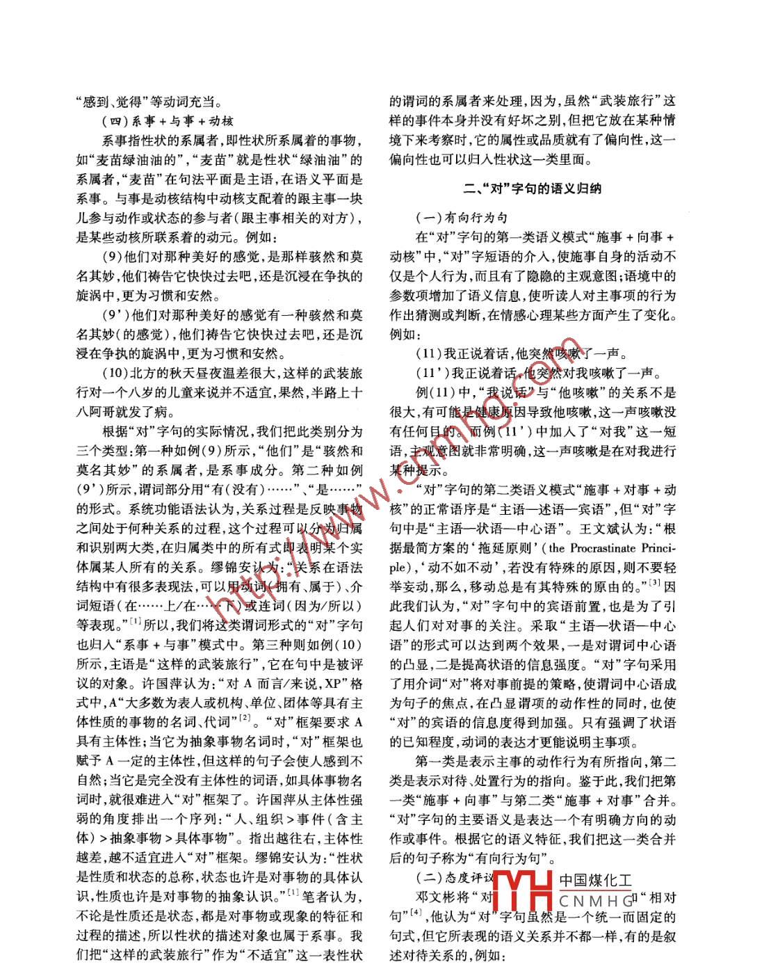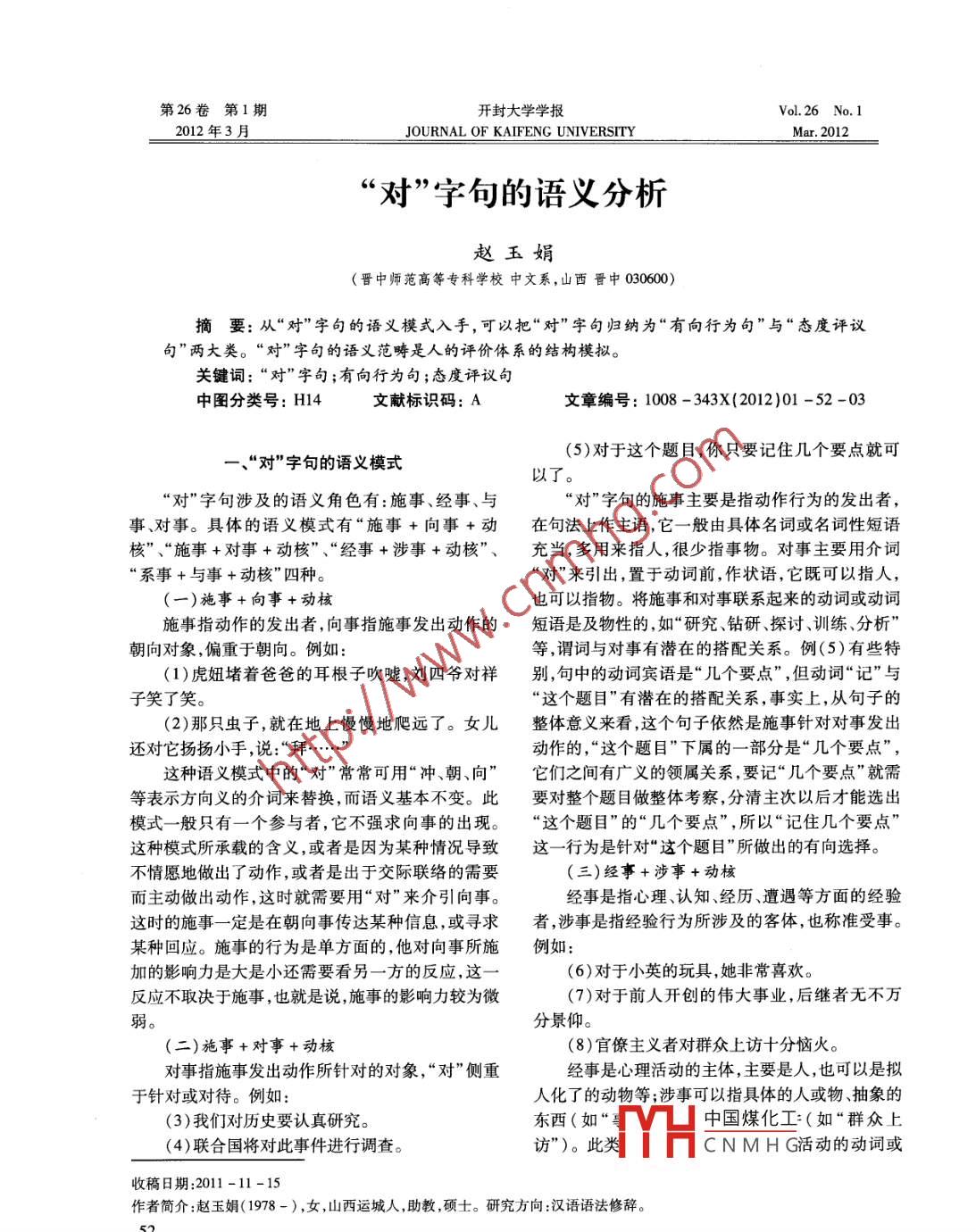 第26卷第1期開封大學(xué)學(xué)報(bào)Vol. 26 No. 12012年3月JOURNAL OF KAIFENG UNIVERSITYMar. 2012“對(duì)”字句的語(yǔ)義分析趙玉娟(晉中師范高等??茖W(xué)校中文系,山西晉中030600)摘要:從“對(duì)”字句的語(yǔ)義模式入手,可以把“對(duì)”字句歸納為“有向行為句”與“態(tài)度評(píng)議.句”兩大類?!皩?duì)”字句的語(yǔ)義范疇是人的評(píng)價(jià)體系的結(jié)構(gòu)模擬。關(guān)鍵詞:“對(duì)”字句;有向行為句;態(tài)度評(píng)議句中圖分類號(hào): H14文獻(xiàn)標(biāo)識(shí)碼: A .文章編號(hào): 1008 - 343X(2012)01 -52 -03.(5)對(duì)于這個(gè)題目,你只要記住幾個(gè)要點(diǎn)就可-、 “對(duì)"字句的語(yǔ)義模式以了?!皩?duì)”字句涉及的語(yǔ)義角色有:施事、經(jīng)事、與.“對(duì)”字句的施事主要是指動(dòng)作行為的發(fā)出者,事、對(duì)事。具體的語(yǔ)義模式有“施事+向事+動(dòng)在句法上作主語(yǔ),它一般由具體名詞或名詞性短語(yǔ)核”、“施事+對(duì)事+動(dòng)核”、“經(jīng)事+涉事+動(dòng)核”、充當(dāng),多用來(lái)指人,很少指事物。對(duì)事主要用介詞“系事+與事+動(dòng)核”四種?!皩?duì)”來(lái)引出,置于動(dòng)詞前,作狀語(yǔ),它既可以指人,(一)施事+向事+動(dòng)核也可以指物。將施事和對(duì)事聯(lián)系起來(lái)的動(dòng)詞或動(dòng)詞施事指動(dòng)作的發(fā)出者,向事指施事發(fā)出動(dòng)作的短語(yǔ)是及物性的,如“研究、鉆研、探討、訓(xùn)練、分析”朝向?qū)ο?偏重于朝向。例如:等,謂詞與對(duì)事有潛在的搭配關(guān)系。例(5)有些特(1)虎妞堵著爸爸的耳根子吹噓,劉四爺對(duì)祥別,句中的動(dòng)詞賓語(yǔ)是“幾個(gè)要點(diǎn)”,但動(dòng)詞“記”與子笑了笑。“這個(gè)題目”有潛在的搭配關(guān)系,事實(shí)上,從句子的(2)那只蟲子,就在地上慢慢地爬遠(yuǎn)了。女兒整體意義來(lái)看,這個(gè)句子依然是施事針對(duì)對(duì)事發(fā)出還對(duì)它揚(yáng)揚(yáng)小手,說(shuō):“....動(dòng)作的,“這個(gè)題目”下屬的- - 部分是“幾個(gè)要點(diǎn)”,這種語(yǔ)義模式中的“對(duì)”常??捎谩皼_、朝、向”它們之間有廣義的領(lǐng)屬關(guān)系,要記“幾個(gè)要點(diǎn)”就需等表示方向義的介詞來(lái)替換,而語(yǔ)義基本不變。此要對(duì)整個(gè)題目做整體考察,分清主次以后才能選出模式- -般只有一個(gè)參與者,它不強(qiáng)求向事的出現(xiàn)?!?這個(gè)題目”的“幾個(gè)要點(diǎn)”,所以“記住幾個(gè)要點(diǎn)"這種模式所承載的含義,或者是因?yàn)槟撤N情況導(dǎo)致這一行為是針對(duì)“這個(gè)題目”所做出的有向選擇。不情愿地做出了動(dòng)作,或者是出于交際聯(lián)絡(luò)的需要(三)經(jīng)事+涉事+動(dòng)核而主動(dòng)做出動(dòng)作,這時(shí)就需要用“對(duì)”來(lái)介引向事。經(jīng)事是指心理、認(rèn)知、經(jīng)歷、遭遇等方面的經(jīng)驗(yàn)這時(shí)的施事一定是在朝向事傳達(dá)某種信息,或?qū)で笳?涉事是指經(jīng)驗(yàn)行為所涉及的客體,也稱準(zhǔn)受事。某種回應(yīng)。施事的行為是單方面的,他對(duì)向事所施例如:加的影響力是大是小還需要看另一方的反應(yīng),這一(6)對(duì)于小英的玩具,她非常喜歡。反應(yīng)不取決于施事,也就是說(shuō),施事的影響力較為微(7)對(duì)于前人開創(chuàng)的偉大事業(yè),后繼者無(wú)不萬(wàn)弱。分景仰。(二)施事+對(duì)事+動(dòng)核(8)官僚主義者對(duì)群眾上訪十分惱火。對(duì)事指施事發(fā)出動(dòng)作所針對(duì)的對(duì)象,“對(duì)”側(cè)重經(jīng)事是心理活動(dòng)的主體,主要是人,也可以是擬于針對(duì)或?qū)Υ?。例?人化了的動(dòng)物等;涉事可以指具體的人或物、抽象的(3)我們對(duì)歷史要認(rèn)真研究。東西(如“中國(guó)煤化工:(如“群眾上(4)聯(lián)合國(guó)將對(duì)此事件進(jìn)行調(diào)查。訪”)。此類YHCNMHG活動(dòng)的動(dòng)詞或收稿日期:2011-11-15 .作者簡(jiǎn)介:趙玉娟( 1978 -),女,山西運(yùn)城人,助教,碩士。研究方向:漢語(yǔ)語(yǔ)法修辭?!案械健⒂X得”等動(dòng)詞充當(dāng)。的謂詞的系屬者來(lái)處理,因?yàn)?雖然“武裝旅行”這(四)系事+與事+動(dòng)核樣的事件本身并沒有好壞之別,但把它放在某種情系事指性狀的系屬者,即性狀所系屬著的事物,境下來(lái)考察時(shí),它的屬性或品質(zhì)就有了偏向性,這一如“麥苗綠油油的",“麥苗”就是性狀“綠油油”的偏向性也可以歸人性狀這一-類里面。系屬者,“麥苗”在句法平面是主語(yǔ),在語(yǔ)義平面是二、“對(duì)”字句的語(yǔ)義歸納系事。與事是動(dòng)核結(jié)構(gòu)中動(dòng)核支配著的跟主事一塊兒參與動(dòng)作或狀態(tài)的參與者(跟主事相關(guān)的對(duì)方),(一)有向行為句是某些動(dòng)核所聯(lián)系著的動(dòng)元。例如:在“對(duì)”字句的第-類語(yǔ)義模式“施事+向事+(9)他們對(duì)那種美好的感覺,是那樣駭然和莫?jiǎng)雍恕敝?“對(duì)”字短語(yǔ)的介人,使施事自身的活動(dòng)不名其妙,他們禱告它快快過(guò)去吧,還是沉浸在爭(zhēng)執(zhí)的僅是個(gè)人行為,而且有了隱隱的主觀意圖;語(yǔ)境中的旋渦中,更為習(xí)慣和安然。參數(shù)項(xiàng)增加了語(yǔ)