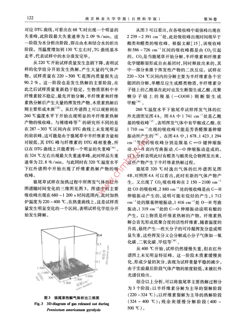 第36卷第5期南京林業(yè)大學學報(自然科學版)Vol. 36, No.52012年9月Joumal of Nanjing Forestry University (Natural Science Edition)Sept. , 2012基于熱重-紅外聯用技術的狼尾草熱解過程分析劉翔,張洋*,孫軍,丁濤,曹燕(南京林業(yè)大學木材工業(yè)學院,江蘇 南京210037)摘要:通過熱重-紅外聯用技術在線分析研究了狼尾草在慢速升溫條件下的熱裂解行為和機理。結果表明,狼尾草的熱分解主要發(fā)生在220~500 C ,500 C以后熱失重非常緩慢,在此溫度下固體殘留物的質量分數為5.33 %。在線紅外分析表明狼尾草熱解產物主要有CO、CO2、烷烴、醛類、酸類等物質。根據熱重曲線和紅外譜圖,將熱解過程分階段進行了熱解動力學的研究,狼尾草熱解3個階段的活化能分別為301.51、88. 39和330. 58 kJ/ mol。關鍵詞:狼尾草;熱裂解;動力學;熱重-傅里葉紅外聯用分析中圖分類號:S216文獻標志碼:A文章編號:1000 - 2006(2012)05 -0120 -05Analysis of Pennisetum americanum pyrolysis process based on the techniqueof thermo-gravimetric analysis coupled with infrared spectroscopyLIU Xiang, ZHANG Yang", sUN Jun, DING Tao , CAO Yan(Colle of Wood Science and Technology , Nanjing Forestry University, Nanjing 210037, China)Abstract: Peniseum americanum pyrolysis behavior and mechanism were studied at a slow heating rate by thermo-grav-imetric(TC) analysis coupled with fourier transform infared spectroscopy (FTIR). The results showed that the decom-position of P. americanum mainly ocrred at the temperature range of 220 to 500 C. The weight loss became quite slowwhen temperature further increased over 500 C and the amount of residue finally decreased to5. 33 %. FT-IR analysisshowed that there were carbon dioxide , carbon monoxide , alkane, aldehydes , acids produced during the P. americanumpyrolysis process. Based on the TG curve and infrared spectra, P. americanum pyrolysis kinetic was studied. P. ameri-canum pyrolysis process was divided into three stages , corresponding with 301.51, 88.39 and 330.58 kJ/ mol for activa-tion energy respectively.Key words: Pennisetum americanum ;pyrolysis ; kinetics ;TG-FTIR analysis狼尾草( Pennisetum americanum)又名雜種象對草木類材料的熱解過程及其產物進行研究,草,是美洲狼尾草和象草的三倍體遠緣雜交種,適可以了解熱處理后材料主要化學組分的結構與所合于熱帶和亞熱帶地區(qū)種植"。雜交狼尾草集父占比重的變化以及這些變化在何種溫度水平下發(fā)本植株高大、繁茂、高產和母本品質優(yōu)良的特點。生。為其能源化和資源化利用提供理論依據。對我國南至海南北至黑龍江的廣大地區(qū)均可種植。熱解過程中生物質試樣進行分析的主要技術是熱由于狼尾草具有優(yōu)質高產、再生能力強、可多次刈重/差熱分析,是進行熱解動力學分析的主要手段,割、無病蟲害等特點,可以作為生物質燃料或人造該技術可以跟蹤試樣在熱解過程中重量的變化及板制備原料來進行推廣應用(2-3]。趙安珍等[4]對所發(fā)生反應的放熱/吸熱情況-”。傅里葉變換紅狼尾草纖維板的原料特性進行了研究,得出了狼尾外光譜技術同樣可以用來對熱處理過程中的揮發(fā)草的主要化學成分及所占比例。傅緒峰等'5]對蘆氣體進行跟蹤檢測。Jong 等[8]采用熱重與紅外聯葦狼尾草等生物質原料的熱解過程進行了研究,但用技術對兩種生物質材料熱解過程分別進行定性未對熱解反應中揮發(fā)性產物進行定性分析。收稿日期:2011-11-14修回日期:2012 -04 -24基金項目:國家林業(yè)公益性行業(yè)科研專項項(01004006) ;江蘇高校優(yōu)勢學科建設工程資助項目(PAPD)第一作者:劉翔,實驗師,博士生。* 通信作者:張洋,教授。E-mail: yangzhang@ 126. com。引文格式:劉翔,張洋,孫軍,等基于熱重-紅外聯用技術的狼尾草熱解過程分析[J].南京林業(yè)大學學報:自然科學版2012 ,36(5) :120 - 124.第5期劉翔,等:基于熱重 -紅外聯用技術的狼尾草熱解過程分析121分析。姚燕等!91通過熱重實驗對木質素的熱解動驗儀器為德國NETZSCH STA 409PC型同步熱分析力學進行了研究。王樹榮等[ 10)采用熱紅聯用系統(tǒng)儀和Bruker TENSOR 27傅里葉紅外光譜儀。對半纖維素熱解機制進行了研究,計算了半纖維素實驗條件如下:升溫速率為20C/min,從室溫熱解階段的活化能。筆者綜合熱重法在材料熱解25 C到終止溫度1 000 C ,氮氣流量為50 mL/min。動力學研究上的優(yōu)點以及紅外光譜在解析熱解過2結果與分析程中氣體產物方面的優(yōu)點,采用熱重-紅外聯用技術對狼尾草熱解行為與機制進行了研究。2.1狼尾草元素分析狼尾草與無煙煤及楊木的元素含量比較見表1材料與方法1。從表1可以看出,狼尾草的元素成分和楊木相1.1試驗材料近,含碳量要明顯低于常規(guī)燃料,這也意味著狼尾試驗材料為狼尾草粉末,取自江蘇省農科院,草的熱值要低于煤炭。作為-種生物質材料, 含氫狼尾草經自然風干、研磨、篩選處理,粒徑在量和含氧量明顯高于無煙煤,說明在熱解燃燒過程0.2 mm以下。中揮發(fā)分也比較多,同時灰分比較少。1.2元素含量的測定表1狼尾草的元素含分析采用動態(tài)燃燒法進行C、H、N .S元素含量的分Table 1 Element analysis of Pennisetum americanum析測定。在1150C的高溫下,樣品在被通人高濃試樣元素含量/% element contentsampleCN度的氧和氦氣流的燃燒管內發(fā)生氧化分解,分解產物按- -定順序分別通過熱導池檢測器被檢測。采狼尾草46.90 6.20 0.390. 1044.50用高溫裂解法來進行0元素的分析測定。在無煙煤80.403.1035.700.286 5. 141 150 C的高溫下,