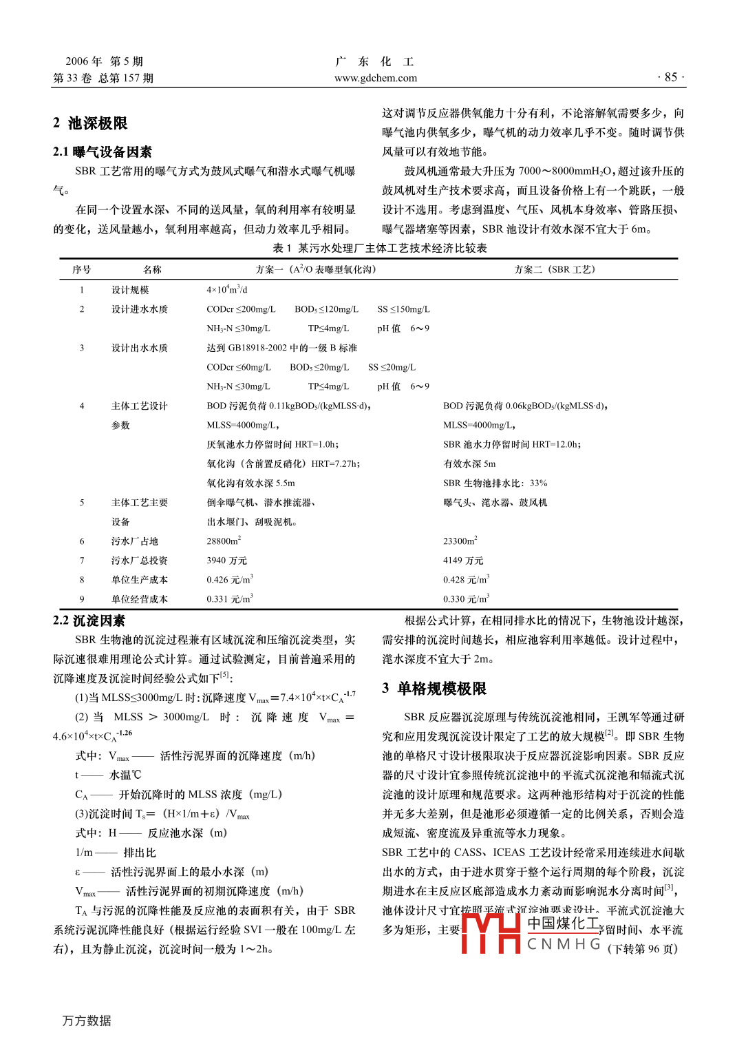 廣東化工2006年第5期...84www.gdchem.com第33卷總第157期SBR污水處理工藝設(shè)計(jì)的極限陳旭鵬',黃亮(1.廣東省水產(chǎn)學(xué)校環(huán)保與食品科,廣東廣州510320;2.廣州市金龍峰環(huán)保設(shè)備工程有限公司,廣東廣州510220) .|摘要|隨著SBR工藝技術(shù)、附屬專用設(shè)備的發(fā)展和--些SBR改進(jìn)型工藝的獨(dú)特優(yōu)點(diǎn)的體現(xiàn),SBR工藝近幾年在我國污水處理工程中大量上馬。本文對(duì)SBR工藝設(shè)計(jì)中的極限進(jìn)行了分析談?wù)?。|關(guān)鍵詞] SBR工藝;污水處理;工藝設(shè)計(jì)Limit of the SBR Sewage Treatment in Process DesignChen Xupeng , Huang Liang(1. Faculty of Environmental Protection and Food , Guangdong Aquaculture School ,Guangzhou 5 10320;2.GuangzhouJinlongfeng Environmental Protection Equipment Company Ltd ,Guangzhou 510220)Abstract: With the development of SBR process technology and groundside special facilities, some unique advantages of SBRmodifed process inform gradually. Lots of sewage treatment projects have adopted SBR process in our country in the last few years. Thepaper has anaysised and discussed the limit of the SBR sewage treatment in process design.Keywords: SBR technics; sewage treatment; process design隨著我國環(huán)境保護(hù)事業(yè)的發(fā)展,越來越多的污水處理工程每個(gè)處理周期時(shí)間不同,SBR工藝中的CASS、ICEAS 工藝一建設(shè)起來。污水處理工藝中最廣泛應(yīng)用的活性污泥法中又以氧般按每周期4h設(shè)計(jì),目前調(diào)研的SBR工藝的污水處理工程中化溝工藝和SBR工藝最為突出,成為中小型污水處理廠的優(yōu)選實(shí)際運(yùn)行最短周期為3h"。工藝。近些年,隨著國外水務(wù)公司對(duì)中國水務(wù)的介入和水處理顯然,每個(gè)周期的有效工作時(shí)間(周期時(shí)間一沉淀、潷水、技術(shù)的發(fā)展,SBR工藝以及各種SBR改進(jìn)型工藝紛紛在我國嶄閑置時(shí)間) /周期時(shí)間的比值越大,池容利用率就越高,處理工露頭角,以其工藝靈活運(yùn)行、占地相對(duì)較小等特點(diǎn)同工藝相對(duì)程越經(jīng)濟(jì)。而沉淀、潷水、閑置時(shí)間- -般是難以優(yōu)化的,因此,較成熟的氧化溝工藝取得了良好的競爭優(yōu)勢。但是SBR工藝的水質(zhì)污染指標(biāo)值越小越易處理的污水使用SBR工藝越難以體自身特點(diǎn)和目前技術(shù)的發(fā)展水平,使得SBR工藝的一- 些優(yōu)點(diǎn)的現(xiàn)其優(yōu)越性。表1是某4x10*m/d污水處理廠主體工藝技術(shù)經(jīng)體現(xiàn)應(yīng)用于工程中有一些設(shè)計(jì)極限。濟(jì)的對(duì)比表(氧化溝采用Carrousel 表曝型氧化溝,SBR采用CASS工藝),對(duì)比各項(xiàng)指標(biāo)來分析,該工程使用SBR工藝在工程造價(jià)和占地面積等指標(biāo)上相對(duì)氧化溝工藝均沒有優(yōu)勢。因此SBR工藝為間歇式運(yùn)行,每個(gè)周期- -般有以下五個(gè)過程:對(duì)于水質(zhì)相對(duì)較低的處理工程,例如,對(duì)于我國南方的一- 些市要達(dá)到除磷脫氮的目的,- 般在每個(gè)周期適當(dāng)?shù)碾A段安排若干不優(yōu)先選擇SBR工藝。當(dāng)然,考慮到SBR工藝自控水平較高,攪拌過程。對(duì)于每個(gè)運(yùn)行周期,沉淀、潷水、閑置時(shí)間一般為工藝靈活等特點(diǎn),我國南方地區(qū)應(yīng)用SBR工藝的污水處理廠還2h,目前調(diào)研的工程中最少1.5h, 對(duì)于不同水質(zhì)的污水,- -般是很多的。中國煤化工MYHCNMH G|作者簡介|陳旭鵬(1979-), 男,黑龍江人,助講,廣東省水產(chǎn)學(xué)校教師。.2006年第5期廣東化工第33卷總第157期www.gdchem.com.85.這對(duì)調(diào)節(jié)反應(yīng)器供氧能力十分有利,不論溶解氧需要多少,向2池深極限曝氣池內(nèi)供氧多少,曝氣機(jī)的動(dòng)力效率幾乎不變。隨時(shí)調(diào)節(jié)供2.1曝氣設(shè)備因素風(fēng)量可以有效地節(jié)能。SBR工藝常用的曝氣方式為鼓風(fēng)式曝氣和潛水式曝/氣機(jī)曝鼓風(fēng)機(jī)通常最大升壓為7000~8000mmH2O,超過該升壓的氣鼓風(fēng)機(jī)對(duì)生產(chǎn)技術(shù)要求高,而且設(shè)備價(jià)格上有一一個(gè)跳躍,一般在同一個(gè)設(shè)置水深、不同的送風(fēng)量,氧的利用率有較明顯設(shè)計(jì)不選用??紤]到溫度、氣壓、風(fēng)機(jī)本身效率、管路壓損、的變化,送風(fēng)量越小,氧利用率越高,但動(dòng)力效率幾乎相同。曝氣器堵塞等因素,SBR 池設(shè)計(jì)有效水深不宜大于6m。表1某污水處理廠主體工藝技術(shù)經(jīng)濟(jì)比較表序號(hào)名稱方案一(A2/O 表曝型氧化溝)方案二(SBR工藝)設(shè)計(jì)規(guī)模4x 10'm'/d設(shè)計(jì)進(jìn)水水質(zhì)CODer s200mg/L BODssl20mg/L SS sl50mgLNH-N S30mg/LTP<4m/LpH值6~9 .設(shè)計(jì)出水水質(zhì)達(dá)到GB18918-2002中的- -級(jí)B標(biāo)準(zhǔn)CODr <60mg/LBODss20mg/L ss <20mgLNH~N s30mg/LTPS4mg/LpH值6~9主體工藝設(shè)計(jì)BOD污泥負(fù)荷011kgBOD(kgMLSS-d),BOD污泥負(fù)荷0.06kgBODs/(kgMLSSd),MLSS 4000mng/L,MLSS= 4000m/L,厭氧池水力停留時(shí)間HRT=1.0h;SBR池水力停留時(shí)間HRT-=12.0h;氧化溝(含前置反硝化) HRT=7.27h;有效水深5m氧化溝有效水深5.5mSBR生物池排水比: 33%主體工藝主要倒傘曝氣機(jī)、潛水推流器、曝氣頭潷水器、鼓風(fēng)機(jī)設(shè)備出水堰門、刮吸泥機(jī)。污水廠占地28800m223300m2污水廠總投資3940萬元4149萬元單位生產(chǎn)成本0.426元/m’0.428元/m3單位經(jīng)營成本0.3