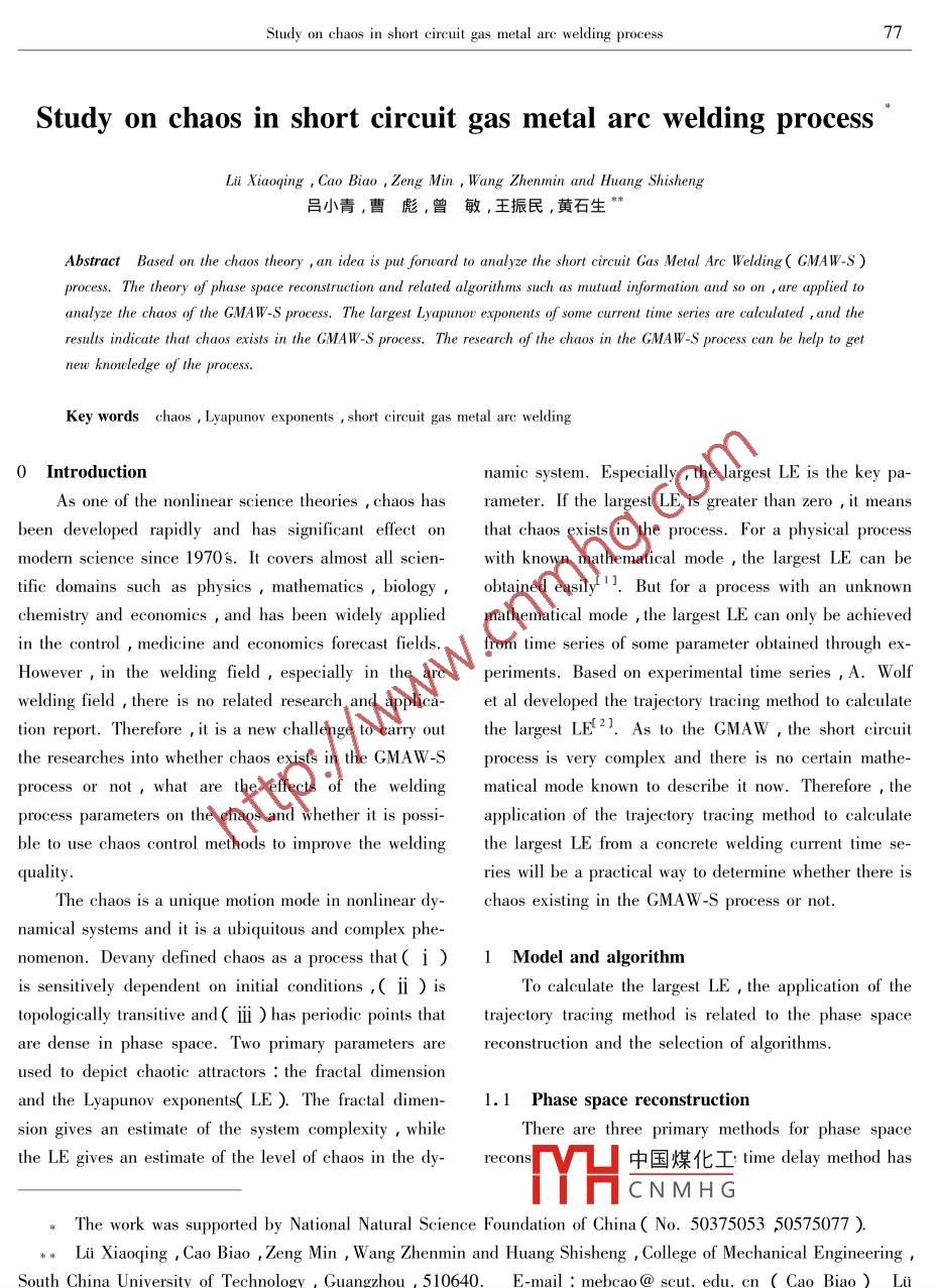 Study on chaos in short circuit gas metal are welding process77Study on chaos in short circuit gas metal arc welding processLi Xiaogang, Cao Biao, Zeng Min, Wang Zhenmin and Huang Shisheng青,曹彪,曾敏,王振民,黃石生Abstract Based on the chaos theory an idea is put forward to analyze the short circuit Gas Metal Arc Welding( GMAW-S)analyze the chaos of the GMAW-S process. The largest Lyapunoy exponents of some current time series are calculated, andresults indicate that chaos exists in the GMAW-S process. The research of the chaos in the GMAW-S process can be help to getnew knowledge of the process.Key words chaos, Lyapunov exponents short circuit gas metal arc welding0 Introductionnamic system. Especially the largest LE is the key pa-As one of the nonlinear science theories chaos has rameter. If the largest LE is greater than zero it meansen developed rapidly and has significant effect on that chaos exists in the process. For a physical processmodern science since 1970s. it covers almost all sciwith known mathematical mode, the largest le can betific domains such as physics mathematics, biology, obtained easily l]. But for a process with an unknownhemistry and economies and has been widely applied mathematical mode the largest LE can only be achievedin the control medicine and economics forecast fields. from time series of some parameter obtained through exHowever, in the welding field especially in the arc periments. Based on experimental time series, A. Wolfwelding field there is no related research and applica- et al developed the trajectory tracing method to calculatetion report. Therefore, it is a new challenge to carry out the largest LE. As to the GMAW, the short circuitthe researches into whether chaos exists in the GMAW-s process isvery complexand there is no certain matheprocess or not, what are the effects of the welding matical mode known to describe itTherefore, theprocess parameters on the chaos and whether it is possi- application of the trajectory tracing method to calculateble to use chaos control methods to improve the welding the largest LE from a concrete welding current time se-ries will be a practical way to determine whether there isThe chaos is a unique motion mode in nonlinear dy- chaos existing in the gmaw-S process or notnamical systems and it is a ubiquitous and complex phe-nomenon. Devany defined chaos as a process that( 1) 1 Model and algorithmis sensitively dependent on initial conditions.( ii ) isTo calculate the largest LE, the application of thetopologically transitive and( iii)has periodic points that trajectory tracing method is related to the phase spacereconstruction and the selection of algorithused to depict chaotic attractors the fractal dimensionand the Lyapunov exponents( LE ) The fractal dimen- 1. 1 Phase space reconstructsion gives an estimate of the system complexity whileThere are three primary methods for phase spacethe le gives an estimate of the level of chaos in the dyrecons中國煤化工 time delay method hasCNMHGThe work was supported by National Natural Science Foundation of China( no. 50375053 50575077)Li Xiaoqing Cao Biao, Zeng Min, Wang Zhenmin and Huang Shisheng College of Mechanical EnSouth China University of Technology, Guangzhou, 5106Xiaoding有落據(jù) Mechanical engineering, Tongji University, Shanghai,2001078CHINA WELDING Vol 16 No. 2 June 2007been widely applied in attractor reconstruction. It seemsthat the time series of 1-D variable can only provide limited dynamical information. But according to refe[3 ], because it implies other variables dynamical trading the chaos attractors can be re-established by using200the time delays phase space reconstruction method. TI150phase space reconstructed from a single variable pre-rves the topological properties of the original attractor100so the topological properties can be calculated. Durintion of a chaotic time series, thechoice of the time delay T and the embedding dimensionm is critical for the calculation of the largest LE01002003004005006001. 2 Parameter and algorithmTime t/msThere are many methods to select the time delay tFig 1 Wave of GMAW-S currentand the embedding dimension m. In this paper, the revised false nearest neighbors( rFnn) method and themutual information( MI method are adopted, becausethey are not sensitive to noise. The RFNN method isused to select m, while the mi method is used to select5In 1997 the rfnn method is first established byCao overcoming many shortcomings of the false nearest2neighbors( FNN method such as subjective criterion[4!. Except for its inexplicit physical mechanism,theRFNN method is proved to be very practical by lots of1.5experiments. In 1986, Fraser applied firstly the inforhase space reconstruction and puward the MI method!!. This approach is best inFig 2 Curve of S2)except for the enormous computational costsWhen T is equal to 0. 0023 s, the curve of the re-2 Analysis of welding current based on chaos algo- lation between E, m), E m)and the embedding dirithmmension m is exhibited by Fig 3. It is found that when2.1 Numerical resultsm9, the E,(m) keeps almost invariable. ThereforeFig. 1 shows an experimental current wave in the the optimum embedding dimension m is equal to 10ave controlled GMAW-S process with low heat Chop- So, as to the current wave in Fig. 1, T=0.002 3 s andArc. The sampling time is 0. 000 I s and this droplet m=10 are the best selected parameters in phase spacetransfer process is unstablereconstruction. In addition, because E, (1)and E, (2)The calculation result of mutual information /(S, are ul1( see Fig.3, it is known that theQ) is showed by Fig. 2 where n is a multiple integer of proces中國煤化工[4sampling time. When n is equal to 23, Ks gets toCNMHGce withthe first minimum. So, 0. 002 3 s is chosen as the optimeters can re-appear chaos attractor in low dimensionmum delay timecases, but in high dimension cases this does not workFig 4 shows the phase space reconstruction diagramwhen T=0. 0023 s a