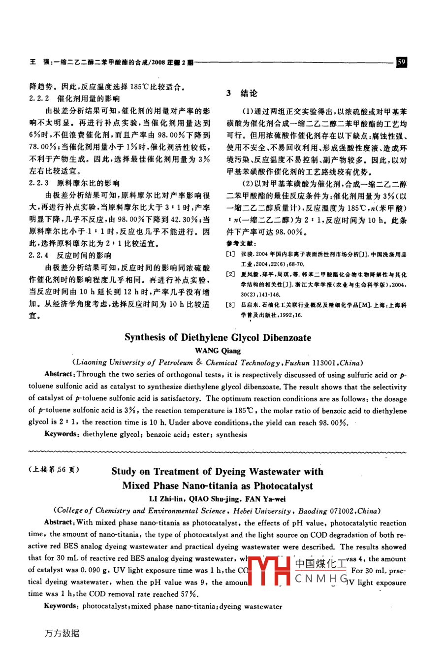 化學(xué)與生物工程200,vol.25№,2縮二乙二醇二苯甲酸酯的合成王強(qiáng)(遼寧石油化工大學(xué),遼寧撫順113001)摘要:通過兩組正交實(shí)驗(yàn),分別以濃硫酸和對甲基篆磺酸為催化劑合成一縮二乙二醇二苯甲酸酯,結(jié)果表明對甲基笨磺酸作催化劑的選擇性較好,合成一縮二乙二醇二甲酸酯的最佳反應(yīng)條件為:對甲基苯磺酸用量為3%(以一縮二乙二醇質(zhì)量計(jì))、反應(yīng)溫度為185℃、n(草甲酸):n(一縮二乙二醇)為2:1,反應(yīng)時(shí)間為10h。在此條件下,產(chǎn)奉可達(dá)%關(guān)鍵詞:一編二乙二醇;苯甲酸;酯;合威中圖分類號:TQ414文獻(xiàn)標(biāo)識碼:A文章編號:1672-5425(2008)02-0057-03二苯甲酸酯類增塑劑尤其是一縮二乙二醇二苯甲本實(shí)驗(yàn)選擇濃硫酸、對甲基苯磺酸為催化劑,通過酸酯近年來發(fā)展較快,由于其價(jià)格低、揮發(fā)性小耐文獻(xiàn)資料初步確定反應(yīng)溫度催化劑用量、原料摩爾寒性好、低毒,發(fā)展前途廣闊,除了廣泛用作聚乙烯樹脂比、反應(yīng)時(shí)間為主要影響因素,并確定其大致范圍。設(shè)和聚酯樹脂的增塑劑外,還可以替代鄰苯二甲酸酯。計(jì)正交實(shí)驗(yàn),并對結(jié)果進(jìn)行分析,必要的情況下做進(jìn)一作者在此通過兩組正交實(shí)驗(yàn),對一縮二乙二醇二苯甲酸步補(bǔ)點(diǎn)實(shí)驗(yàn),以確定最佳的反應(yīng)條件酯的合成工藝進(jìn)行了比較,得到了最佳反應(yīng)條件1.3.2步驟1實(shí)驗(yàn)稱取一定量的苯甲酸、一縮二乙二醇,按一定比例混合加入到連有溫度計(jì)冷凝器的燒瓶中加入定量的11主要試劑與儀器催化劑進(jìn)行反應(yīng),先用5%的NaOH溶液洗滌以去除苯甲酸、一縮二乙二醇、NaOH(GB209-93)無催化劑等雜質(zhì);再用無水碳酸鈉吸水,去除因堿洗殘留水碳酸鈉、濃硫酸、對甲基苯磺酸等均為分析純。的水分;然后通過減壓蒸餾,去除系統(tǒng)中的過量反應(yīng)冷凝器,油水分離器,蒸餾裝置,加熱套,2X8型物,即得最終產(chǎn)物旋片式真空泵,J-1型精密電力電動(dòng)攪拌器,JA3003型電子分析天平,WO型恒溫油水浴鍋結(jié)果與討論1.2原理2.1濃硫酸作催化劑合成一縮二乙二醇二苯甲酸酯苯甲酸與一縮二乙二醇在加熱、催化劑存在的條的正交實(shí)驗(yàn)(表1表2)件下發(fā)生酯化反應(yīng)生成一縮二乙二醇二苯甲酸酯表1正交實(shí)驗(yàn)因素水平表時(shí)有水生成,反應(yīng)式為:Tab. 1 Factors and levels of the orthogonal test因素HOCH2CH2OCH CH,OH水平A反應(yīng)溫度/℃B催化劑用量/%C原料摩爾比D反應(yīng)時(shí)閫/hCOOCH2 CH -o- HCH, cooc13方法注:催化劑用量以一縮二乙二醇質(zhì)量為標(biāo)準(zhǔn)(下同)原料摩爾比為n(1.3.1方案設(shè)計(jì)甲酸)中國煤化工收稿日期:2007-11-01CNMHG作者簡介:王強(qiáng)(1979一),男,遼寧遼中人,碩士,研究方向:石油化工添加劑的研究及化工新樹料的開發(fā)。 E-mail: blackfoxerl979@王強(qiáng):一縮二乙二醇二苯甲酸酯的含成/2008正2用L(3“)正交實(shí)驗(yàn)結(jié)果與分析由極差分析結(jié)果可知,原料摩爾比對產(chǎn)率影響很Tab. 2 The results and analysis of L,(3)orthogonal tests大。再進(jìn)行補(bǔ)點(diǎn)實(shí)驗(yàn),當(dāng)原料摩爾比大于3:1時(shí),產(chǎn)B%率明顯下降,幾乎沒有反應(yīng);當(dāng)原料摩爾比小于1:1時(shí),反應(yīng)也幾乎不能進(jìn)行。因此,選擇原料摩爾比為2286.121比較適宜23231312.1.4反應(yīng)時(shí)間的影響由極差分析得知,當(dāng)反應(yīng)時(shí)間短于6h時(shí),反應(yīng)體系中存在大量未反應(yīng)原料,且生成物中水的量達(dá)不到理論值。足夠長的反應(yīng)時(shí)間是達(dá)到最高轉(zhuǎn)化率的必76.98條件。進(jìn)行補(bǔ)點(diǎn)實(shí)驗(yàn),當(dāng)反應(yīng)時(shí)間超過10h時(shí),產(chǎn)率77.19幾乎不變。因此,選擇反應(yīng)時(shí)間為10h比較適宜。2.2對甲基苯磺酸作催化劑合成一縮二乙二醇二苯78.77380.00076.39776.617甲酸酯的正交實(shí)驗(yàn)(表3表4)bbR998778.92385.67080.280表3正交實(shí)驗(yàn)因素水平表78.767Tab 3Factors and levels of the orthogonal tes1.2201.39710.2104.013水平A反應(yīng)翻度/℃B催化刺用量/%C原料摩爾比D.反應(yīng)時(shí)閫/h由表2可知,各因素對反應(yīng)的影響大小依次為C1:1>D>B>A,即原料摩爾比>反應(yīng)時(shí)間>催化劑用量>反應(yīng)溫度。其中反應(yīng)溫度對反應(yīng)影響最小。3:12.1.1反應(yīng)溫度的影響由極差分析結(jié)果可知,反應(yīng)溫度對產(chǎn)率影響較小,注:催化劑用量以一縮二乙二醇質(zhì)量為標(biāo)準(zhǔn)(下同),原料摩爾比為n(甲酸):n(一縮二乙二醇)產(chǎn)率呈先上升后下降趨勢。因此,反應(yīng)溫度選擇195℃比較適宜L(3“)正交實(shí)驗(yàn)結(jié)果與分析2.1.2催化劑用量的影響Tab. 4 The results and analysis of L,(3)orthogonal tests由極差分析結(jié)果可知,催化劑的用量對產(chǎn)率的影產(chǎn)率/%A11167.21響較小。再進(jìn)行補(bǔ)點(diǎn)實(shí)驗(yàn),當(dāng)催化劑用量達(dá)到7%時(shí),不但浪費(fèi)催化劑、后處理復(fù)雜、對設(shè)備腐蝕嚴(yán)重,而且83.79產(chǎn)率由8876%下降到64.43%;當(dāng)催化劑用量小于1%時(shí),反應(yīng)不易進(jìn)行。因此,選擇最佳催化劑用量在1%左右比較適宜。2.1.3原料摩爾比的影響222333由于合成一縮二乙二醇二苯甲酸酯的反應(yīng)是熔融89.酯化反應(yīng),