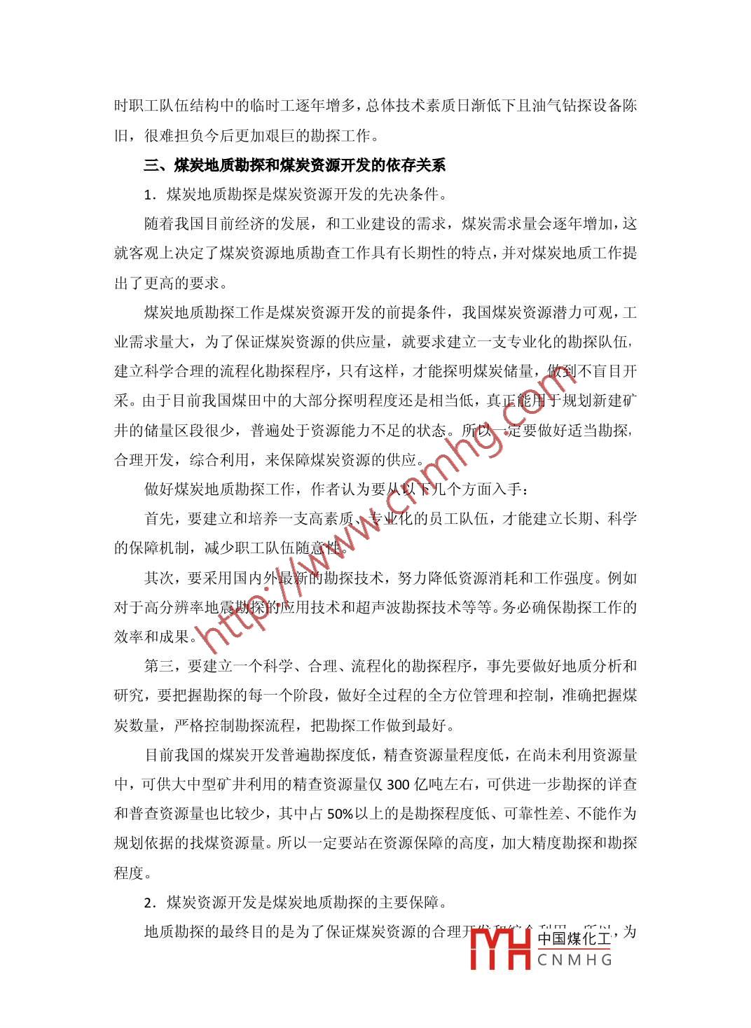 煤炭地質(zhì)勘探與煤炭開發(fā)的關(guān)系劉曉剛中國煤炭地質(zhì)總局北京100039[摘要]能源問題是一個國家的根本問題,關(guān)系到國家的長治久安和社會的穩(wěn)定。煤炭作為常規(guī)能源的一一種,在國民經(jīng)濟發(fā)展過程中起到了至關(guān)重要的作用。本文作者將對煤炭地質(zhì)勘探與煤炭開發(fā)的現(xiàn)狀進行分析,進而對煤炭地質(zhì)勘探與煤炭開發(fā)的關(guān)系進行闡述,望以此促進煤炭勘探與煤炭開發(fā)理論和實務(wù)的發(fā)展。[關(guān)鍵字]煤炭地質(zhì)勘探,煤炭開發(fā),煤炭資源中圖分類號: F407.1文獻標識碼: A文章編號:一、前言煤炭能源是我國工業(yè)賴以生存的主要能源是工業(yè)的命脈,為我國的經(jīng)濟發(fā)展提供了十足的動力,作出了極大的貢獻。從煤炭資源賦存條件看,我國煤炭資源從總體.上講比較豐富,品種齊全、分布廣泛。根據(jù)國土資源部《二00六年全國礦產(chǎn)資源儲量通報》,截至2006年底全國煤炭保有儲量為:資源儲量11597.79億噸,資源量8262.99億噸,基礎(chǔ)儲量3334.8億噸,儲量1825.39億噸。隨著我國國民經(jīng)濟的飛速發(fā)展,煤炭需求量逐年增加。2011 年,我國煤炭產(chǎn)量達35.2億噸,約占一次能源生產(chǎn)總量78.6% (表1-1,說明我國大型煤炭基地資源勘探開發(fā)程度狀況表)。據(jù)專家預(yù)測,到2020年,中國的煤炭需求量將達到38億噸左右。表1-1國家大型煤炭基地資源資源勘探開發(fā)程度狀況表基地名稱1200米以淺預(yù)測「 1200米以淺資源查明率 利用率 尚未利用資資源量(億噸)量(億噸)(%)源精查率(%)基地合計856817094.63492411神東40765544. 95_261晉北2801230. 52775晉東4601039. 985612東北3101396. 0378910云貴7001445616河南188424.661742魯西108406. 22中80O1802.725e29兩淮260549.885340黃隴120367.586721冀中175412. 5213寧東340608.7944陜北7511865. 79中國煤化工一資料來源: (煤炭工業(yè)十五規(guī)劃》YHCNMH G目前,在我國尚未利用的煤炭資源量中,詳查只有1086億噸,普查的1500多億噸,找煤3400多億噸,這些資源不能作為礦井設(shè)計和建設(shè)的依據(jù),需要進一步勘探?,F(xiàn)在正在進行的勘察項目,大多是在“九五”“十五”期間完成的普查、詳查區(qū)塊內(nèi)進行的。隨著這些老本的逐漸減少,,加強煤炭普查、詳查工作成為當務(wù)之急。據(jù)有關(guān)部門對煤炭需求的預(yù)測估算,到2020 年煤炭精查儲量的缺口將達到.1250億噸,詳查儲量缺口達2100億噸,普查儲量缺口達6600 億噸,需要投資400億元以上。因此在我國仍無法改變以煤炭為主的能源消費格局的情況下,必須站在保障國家能源安全的高度,切實加強煤炭地質(zhì)勘察工作。二、煤炭地質(zhì)勘探與煤炭開發(fā)的現(xiàn)狀研究目前我國正在開發(fā)建設(shè)的礦區(qū)基本上都是屬于邊勘探、邊建設(shè)狀態(tài),即勘探出一個井田就建設(shè)一對礦 井,管理系統(tǒng)由礦發(fā)展到局,未來得及或未能編制礦區(qū)總體建設(shè)計劃和總體發(fā)屬規(guī)劃。礦區(qū)開發(fā)的決策層對礦區(qū)資源沒有明確的認識,沒有危機感,具有盲目性,很多礦區(qū)在總體上配置不合理。這種情況在很大程度上是由于勘探工作應(yīng)付建井需要,導(dǎo)致勘探程序混亂,沒有流程化的勘探進程,沒有對煤田地質(zhì)進行普查,沒有先以煤田區(qū)為工作單位進行普查再作礦區(qū)詳查提出詳查報告,而后根據(jù)礦區(qū)整體設(shè)計規(guī)劃,按建井排列順序逐個搞井田精查,而是在小范圍內(nèi)以井田為單位,由普查找煤,連續(xù)進行詳查直至精查。造成了勘探成果不可能超前為開發(fā)決策者提供煤田普查資料和礦區(qū)詳查報告,使煤田和礦區(qū)規(guī)劃不可能超前進行。勘探和煤礦建設(shè)程序混亂,是先前煤礦建設(shè)迅速發(fā)展所致,但后來由于其他原因,特別是管理體制的原因,一直沒有擺脫這種局面,使煤田勘探與開發(fā)關(guān)系失調(diào)日趨嚴重。此外,由于煤炭地質(zhì)勘探和地質(zhì)開發(fā)的關(guān)系長期沒有理順,缺乏宏觀調(diào)控,臨時抱佛腳現(xiàn)象居多,亟待建井時,就盲目擴大勘探隊伍,建井沒那么大需要的時候,就壓縮甚至解散勘探隊伍,直接導(dǎo)致了煤炭建設(shè)的不均衡發(fā)展。在大力推進工業(yè)化時期,煤炭地質(zhì)勘探工作欣欣向榮,高速發(fā)展,勘探隊伍不斷擴大,盲目壯大。20世紀90年代末以來,隨著勘探規(guī)模的調(diào)整和壓縮,在一定程度上加劇了煤礦接替危機,同時還使勘探隊到了幾乎難以為繼的地步。職工隊伍嚴重老齡化,一線工人相對短缺,工資待遇偏低,工作條件鄧中國煤化寶;同MHCNMHG時職工隊伍結(jié)構(gòu)中的臨時工逐年增多,總體技術(shù)素質(zhì)日漸低下且油氣鉆探設(shè)備陳.舊,很難擔負今后更加艱巨的勘探工作。三、煤炭地質(zhì)勘探和煤炭資源開發(fā)的依存關(guān)系1.煤炭地質(zhì)勘探是煤炭資源開發(fā)的先決條件。隨著我國目前經(jīng)濟的發(fā)展,和工業(yè)建設(shè)的需求,煤炭需求量會逐年增加,這就客觀上決定了煤炭資源地質(zhì)勘查工作具有長期性的特點,并對煤炭地質(zhì)工作提.出了更高的要求。煤炭地質(zhì)勘探工作是煤炭資源開發(fā)的前提條件,我國煤炭資源潛力可觀,工業(yè)需求量大,為了保證煤炭資源的供應(yīng)量,就要求建立一-支專業(yè)化的勘探隊伍,
