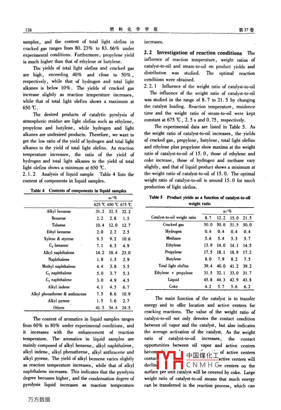 第37卷第1期燃料化學(xué)、學(xué)報Vol. 37 No. 12009年2月Jourmal of Fuel Chemistry and TechnologyFeb. 2009文章編號: 0253-2409<2009)01-0124-05Catalytic pyrolysis of atmospheric residueon a fluid catalytic cracking catalyst for the production of light olefinsYANG Lian-guo, MENG Xiang-hai, XU Chun-ming, GAO Jin-sen, LIU Zhi-chang(State Key Laboratory of Heary Oil Processing, China University of Petroleum( Beijing), Beijing 102249, China)Abstract: Catalytic pyrolysis of Chinese Daqing atmospherie residue on a commercial fluid catalytic cracking ( FCC) catalyst wasinvestigated in a confined fuidized bed reactor. The results show that the commercial FCC catalyst has good capability of crackingatmospheric residue to light olefins. The analysis of gas samples shows that the content of total light olefins in cracked gas is above80%. The analysis of liquid samples shows that the content of aromatics in liquid samples ranges from 60% to 80% , and it increaseswith the enhancement of reaction temperature. The yield of total light olefins shows a maximum with the increase of reactiontemperature, the weight ratios of catalyst to-oil and steam-to-oil, respecively. The optimal reaction temperature, the weight ratios ofcatalyst-to-oil and steam-lo-oil are about 650心, 15 and 0. 75, respectively.Key words: catalytic pyrolysis; residue; ethylene; propyleneCLC umber: TE624.4Document code: ACatalytic pyrolysis has attracted great interests inranged from 19% to 27%. The yield of total lightrecent years since it can use low value heavy oils andolefins ( ethylene + propylene + butylene ) exceededgas oils to produce such light olefins as ethylene,50% under optimal operating conditions for thepropyleneandbutylene2Compared withcatalytic pyrolysis of paraffinic atmospheric residue. Lconventional steam pyrolysis, catalytic pyrolysis canet al' 15 investigated the catalytic pyrolysis of Daqingnot only reduce reaction temperature. and energyatmospheric residue on Ag and La modified 2ZSM-5consumption, but also allow one to flexibly adjust thecatalyst using a two stage riser FCC apparatus. Theproduct distribution. Catalytic pyrolysis can alsoyields of ethylene and propylene reached 13. 0% andproduce light olefins from a wide range of feedstocks.29.9% respectively with the recycle of C4The feed for catalytic pyrolysis ranges from Chydrocarbons. Experimental research showed thathydrocarbons'3-61heptanenaphtha[81, FCCproduct yields varied greatly with catalyst properties,gasoline9.io,vacuum gas oil", and even lowfeed properties,reactor types and operating conditions.valuable heavy oils!12-14]In this research, we first analyzed the componentsMeng et al investigated the catalytic pyrolysisin gas and liquid samples from catalytic pyrolysis ofof Daqing atmospheric residue on CPP ( catalyticatmospheric residue on a commercial fluid catalyticpyrolysis process) catalyst. The yields of light olefinscracking ( FCC) catalyst, and then studied theshowed maxima with the increase of reactioninfluence of reaction temperature, weight ratios oftemperature, the mass ratios of catalyst-to-oil andcatalyst-to-oil and steam-to-oil on product yields, andsteam-to-oil,respectively. Under optimal operatingthen determined the optimal reaction conditions.conditions, the yields of ethylene and propylene were15. 9% and 20. 7% respectively. Zhang et al'3]1 Experimentalinvestigated the catalytic pyrolysis of heavy oils on CPP1.1Feedstocks and catalyst In this research,catalyst using a pilot-scale FCC apparatus. The yieldsChinese Daqing atmospheric residue ( Daqing AR) wasof ethylene and propylene were 22. 82% and 15. 96%used as the feedstock. The main properties of the feedrespectively under the following reaction conditions,are given in Table I.reaction temperature 640 C,reaction pressure 0. 07A commercial FCC equilibrium catalyst obtainedMPa,and steam content 54. 3%. Sha et al4from Huabei Petrochemical Company, PetroChina wasinvestigated the catalytic pyrolysis of heavy oils onused as the catalyst. The physical properties andHCC ( Heavy-oil contact cracking) catalyst using aparticle size distribution of the catalyst are listed inpilot-scale FCC apparatus. The yield of ethyleneTable 2.中國煤化工Received date: 2008-06-13; Received in revised form: 2008-10-09.Foundation item: National Science Fund for Distinguished Young Scholars ofMHCN M H Gan of the Ministy ofEducation of China (307008).Corresponding author:MENG Xiang-hai, Tel; 8610-8973-3775, E-mail: mengh@ cup. edu. en.Author introduction: YANG Lian-guo ( 1968-), male, doctral student, engaged in clean fuel production.第1期YANG Lian-guo et al. : Catalyic pyrolysis of atnospheric residue on a fluid catalytice cracking catalyst ..125_Table 1 Properties of Daqing atmospheric residueDensity Viscosity Hydrogen Carbon HCCarbonGroup analysis(20C) (50C) content content atomieAromaticityresiduew/%p/g*cm^Pa's w/%ratisalurales aromatics__ resins asphaltenes_ 0.92 0.21 13.08 86.921.7910.94.851.329.818.30.6二Table 2 Properties of the commercial FCC equilibrium catalystMiero -reaction Pore volume Surface area Packing density Coke contentParticle size distibuion w0/%activity index_ v/cm' °gA/m'.g"' .p/g.cm°/%0-20 μm 20-40 um 40~80 um >80 um0.2490. 88070.216.458.225.21.2 Apparatus In experiments of catalyticmeasure the volume percentage of components in thepyrolysis of heavy oils, a confined fluidized bed reactor;as sample. The equation of state for the ideal gaswas used, and the diagram is shown in Figure 1. It isconverts the data to mass percentages. The liquidcomprised of five sections, oil and steam inputsample was analyzed with a gas chromatogram-massmechanisms, a reaction zone, temperature controlspectrometer to get contents of the main components insystem and a product separation and collection system.liquid sample. Coke content on the spent catalyst wasmeasured with a coke analyzer.2 Results and discussion2.1 Analysis of catalytic pyrolysis products0118The components of cracked g